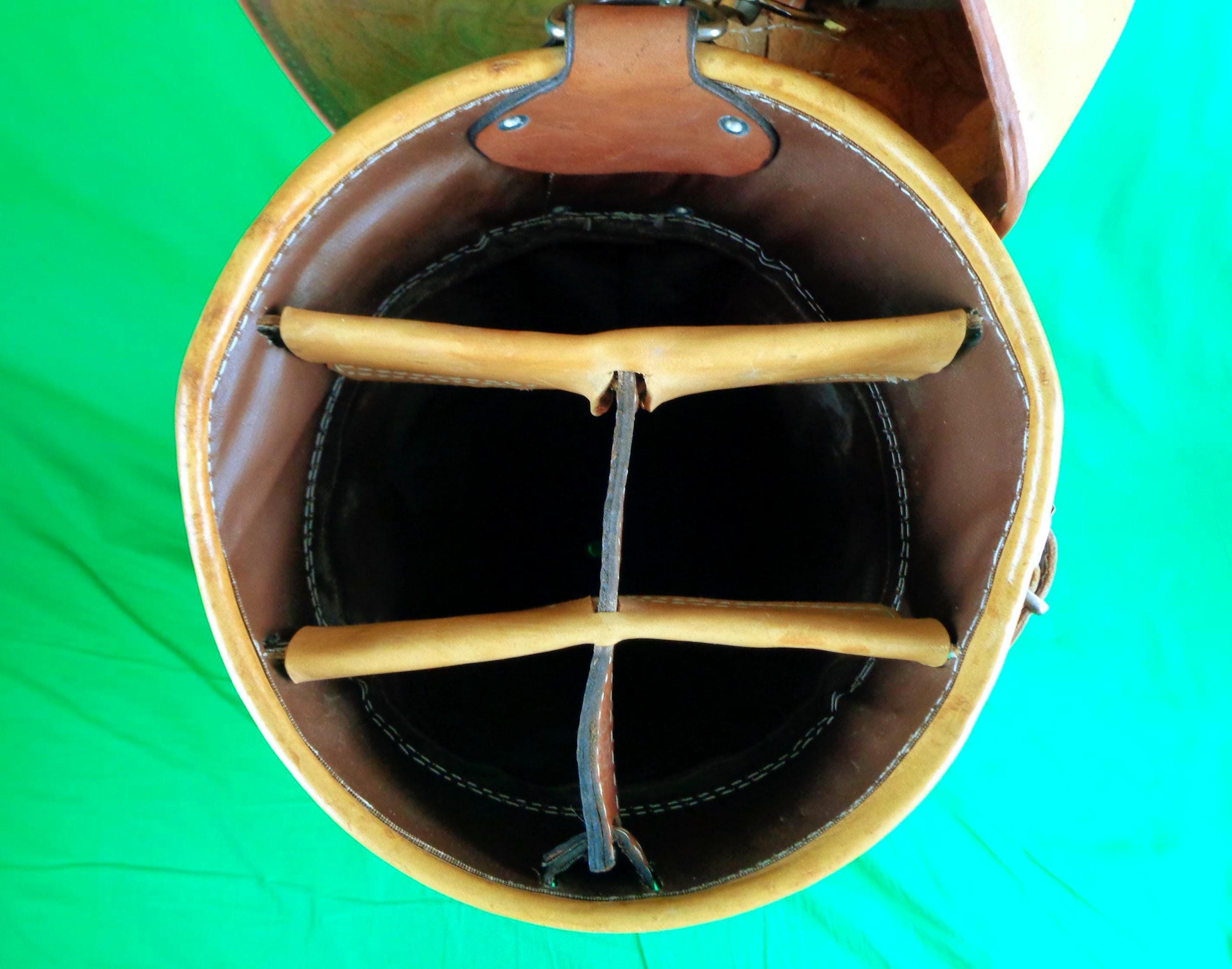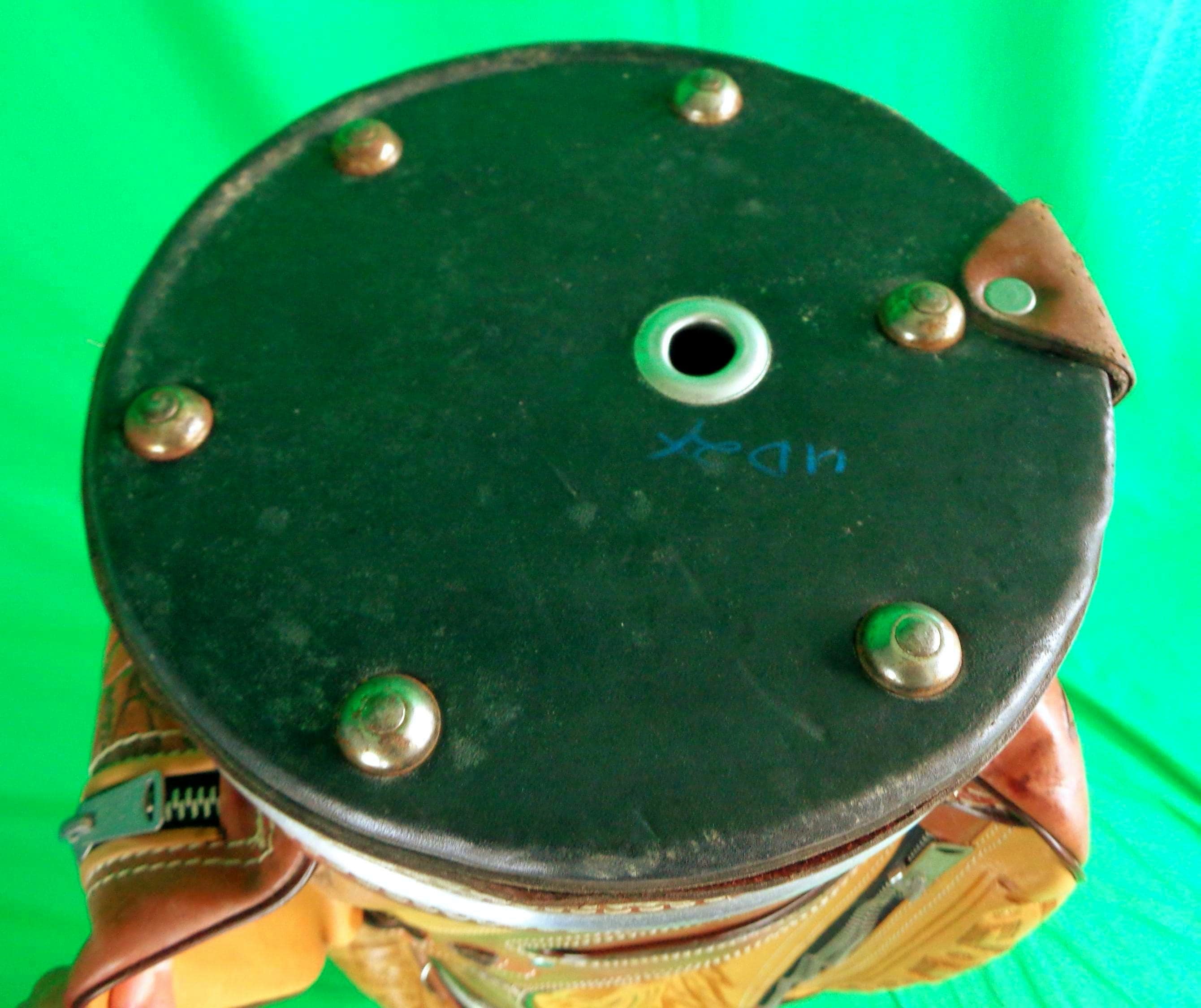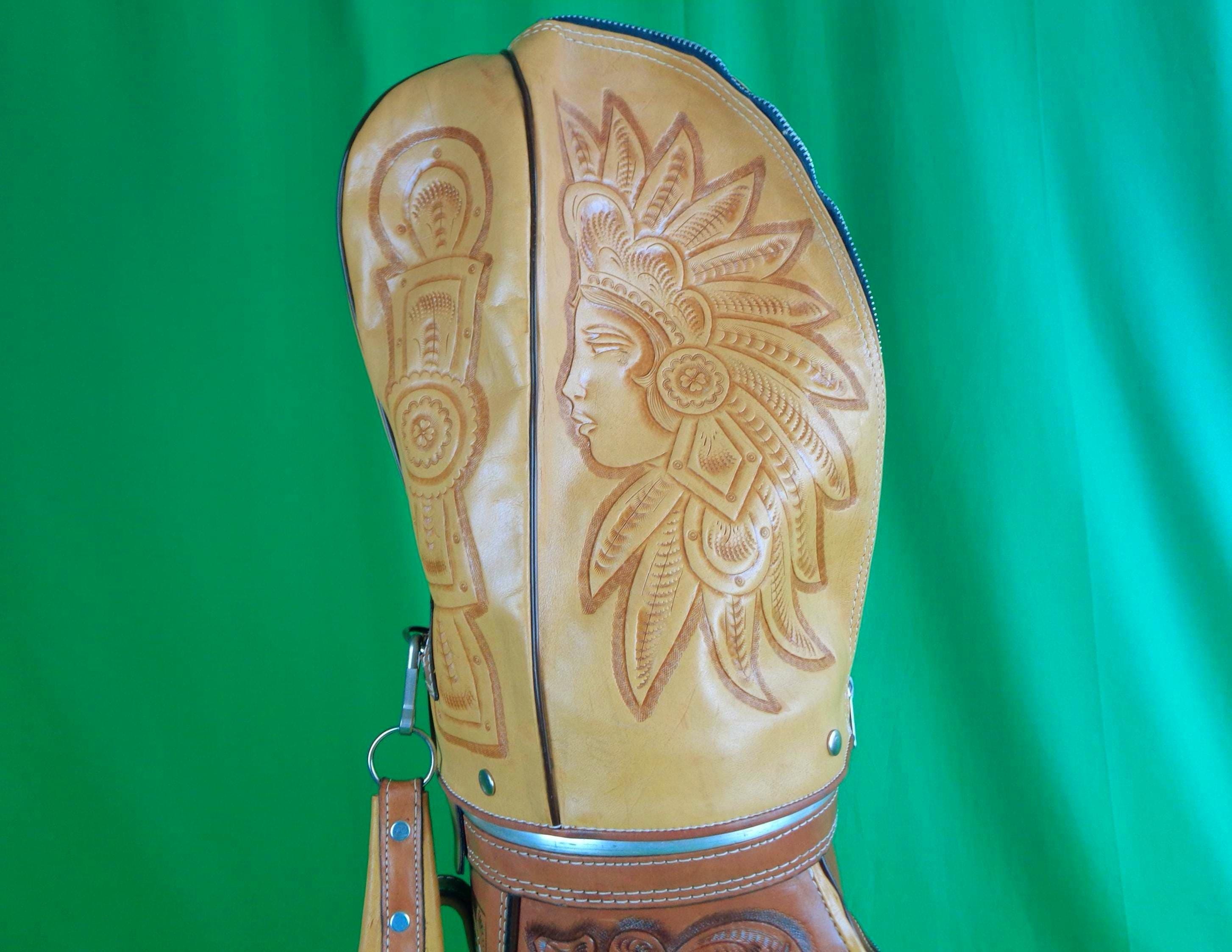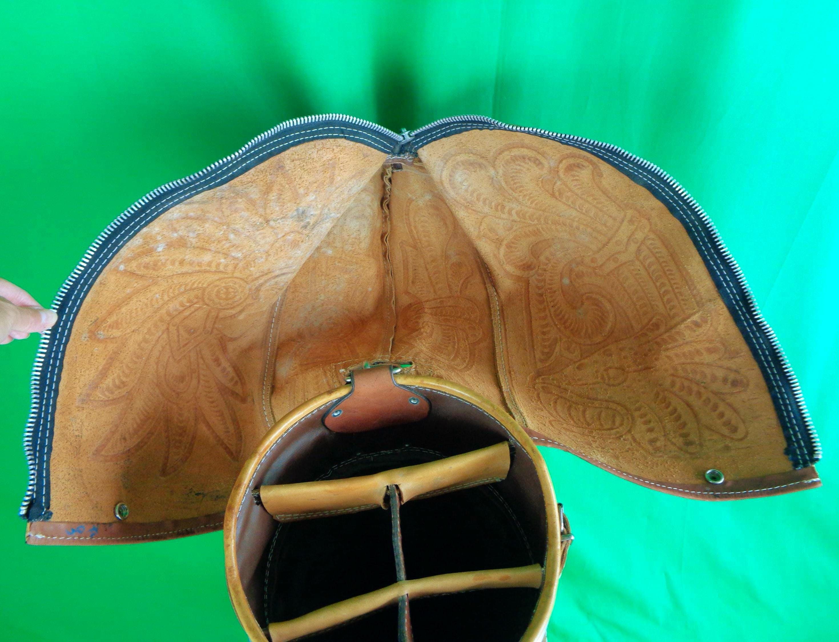 This lovely 1970s 1980s wonderfully hand crafted two-tone Figueroa leather tooled Aztec design Mexican golf bag.