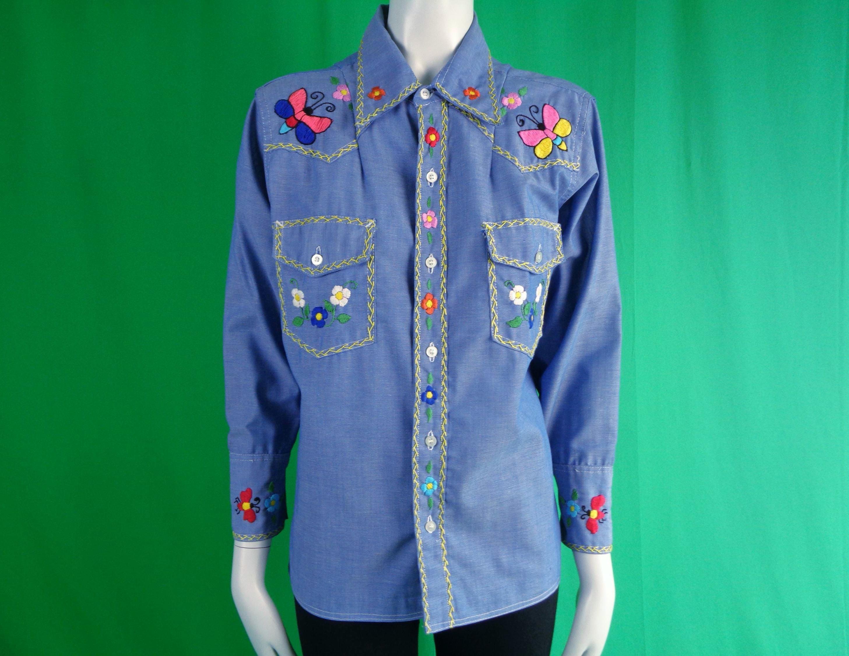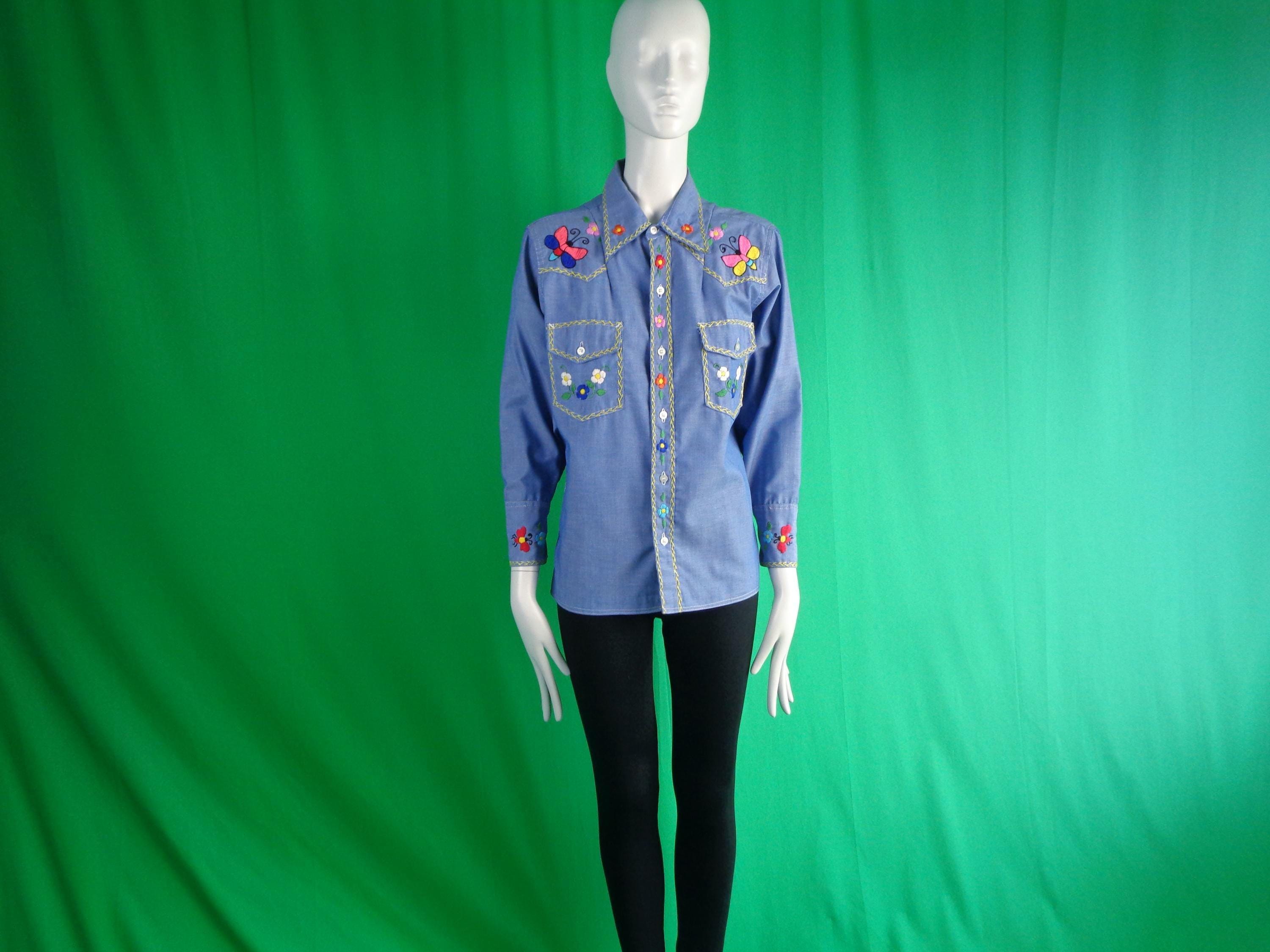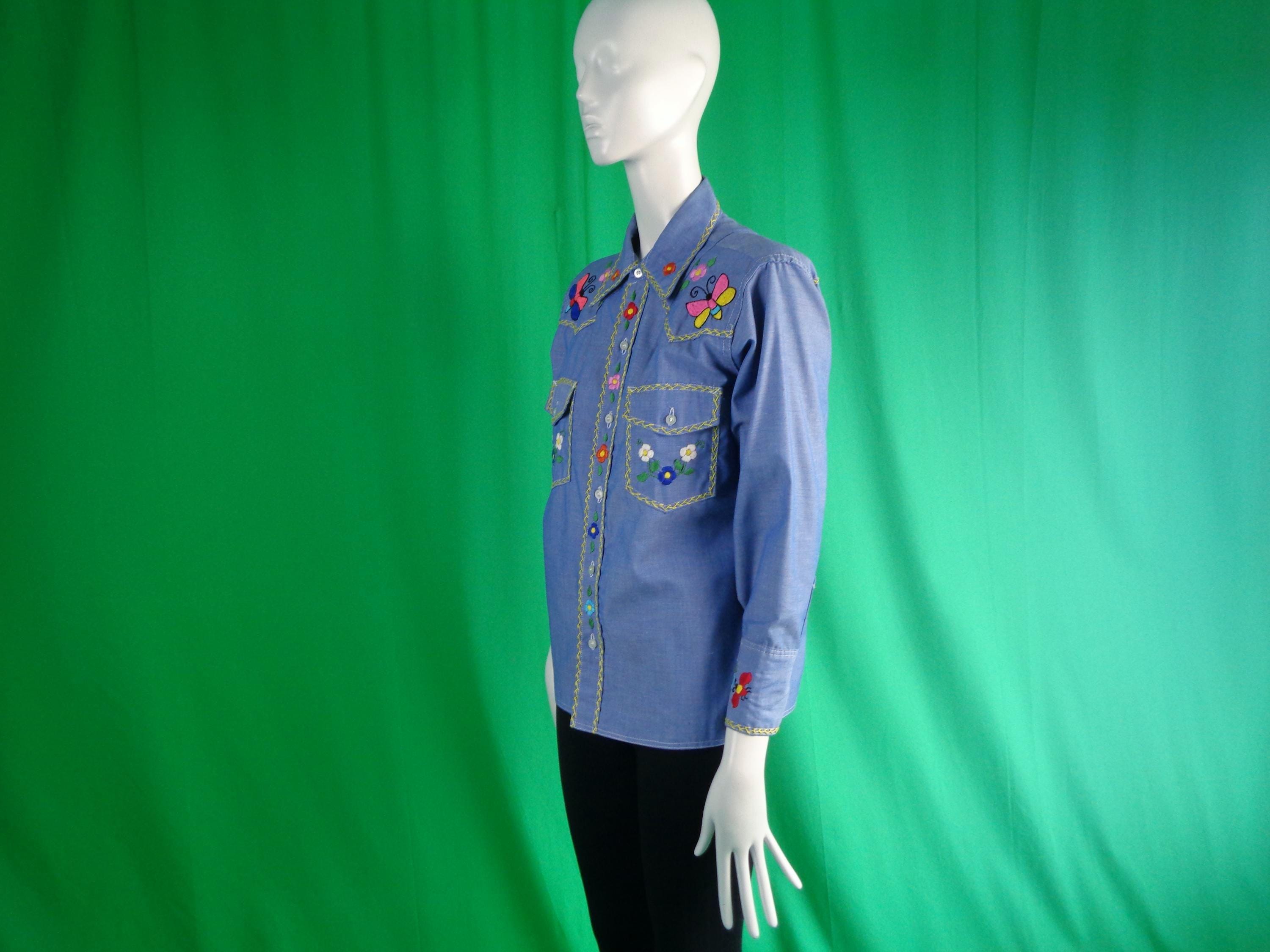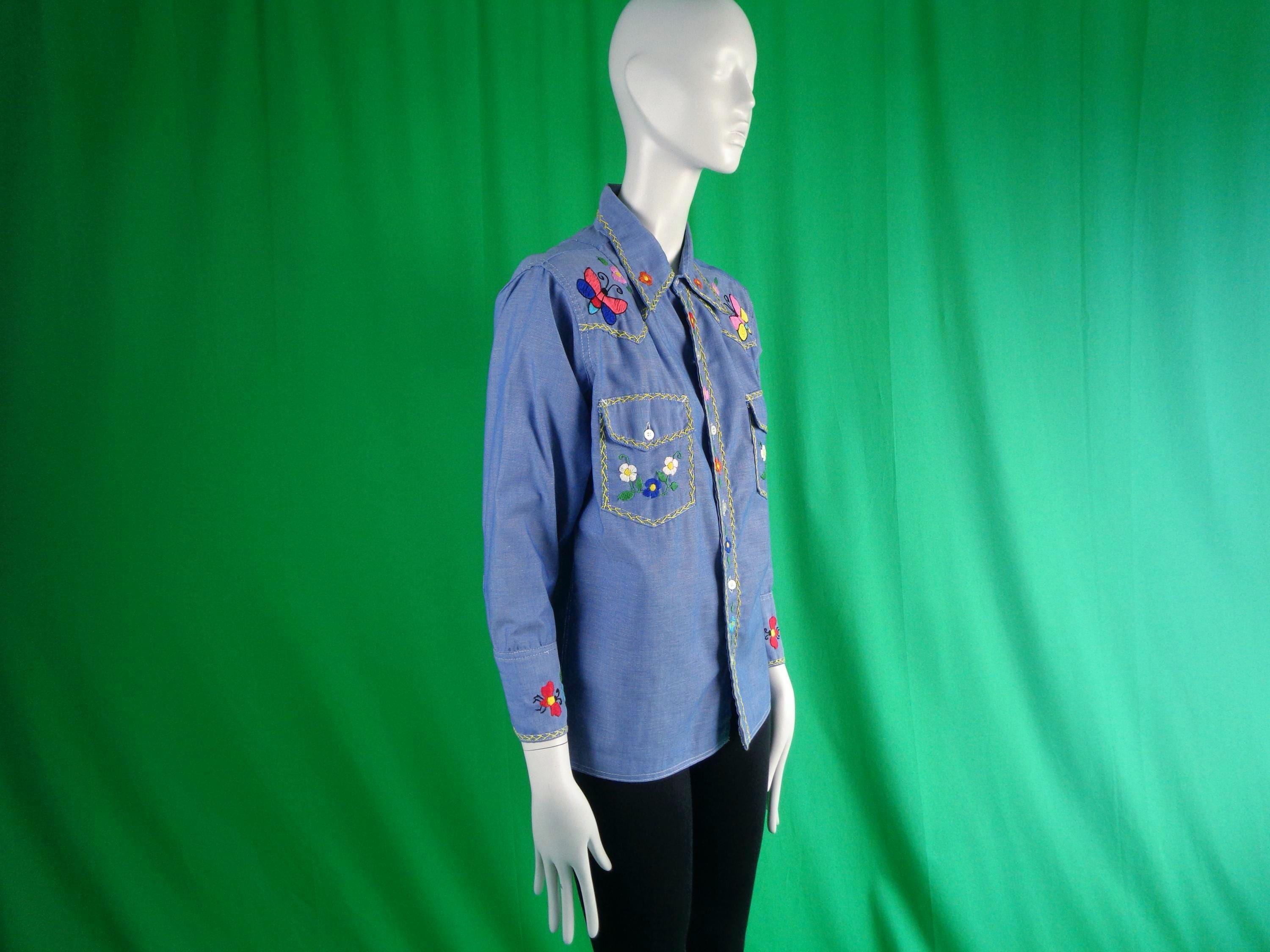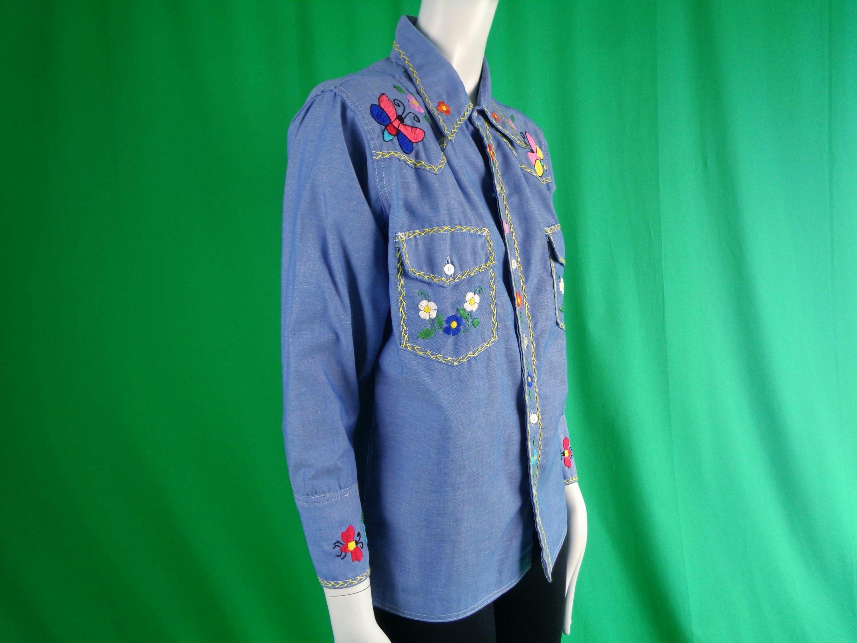This lovely unique rare 1950s retro embroidered chambray shirt button-up top, blouse shirtery shacket button denim, jean style.