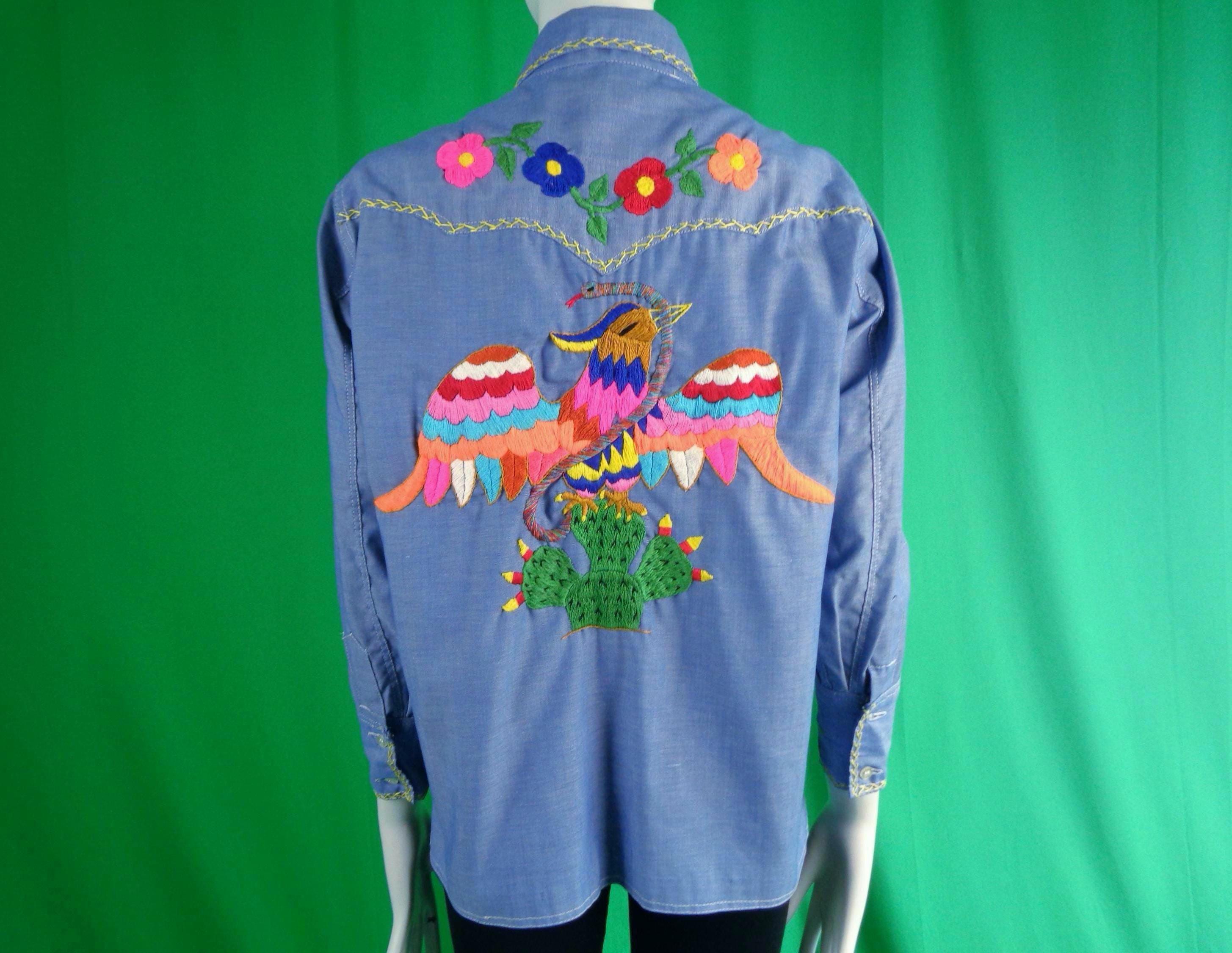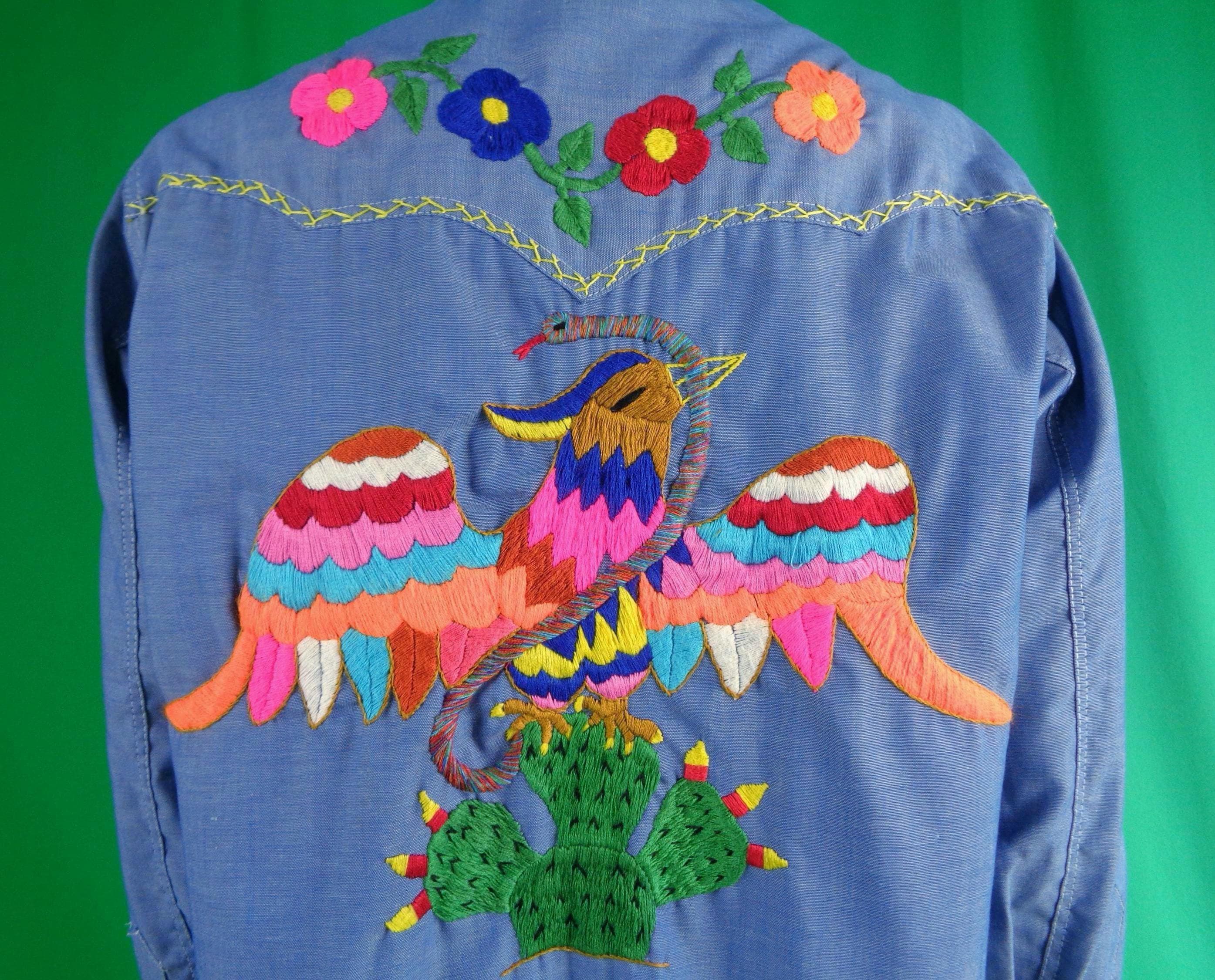 Features 5 front pearlized buttons with 1 top collar fly button, with 2 matching fly pearlized button pockets, 2 double cuff fly adjustable pearlized buttons, pointed dart stitched collar and cuffs, awesome embroidery of the eagle catching the snake, surrounded with a floral display along the bib and cuffs complimented with souring butterfly's, soft fabric, material throughout! Great compliment piece!