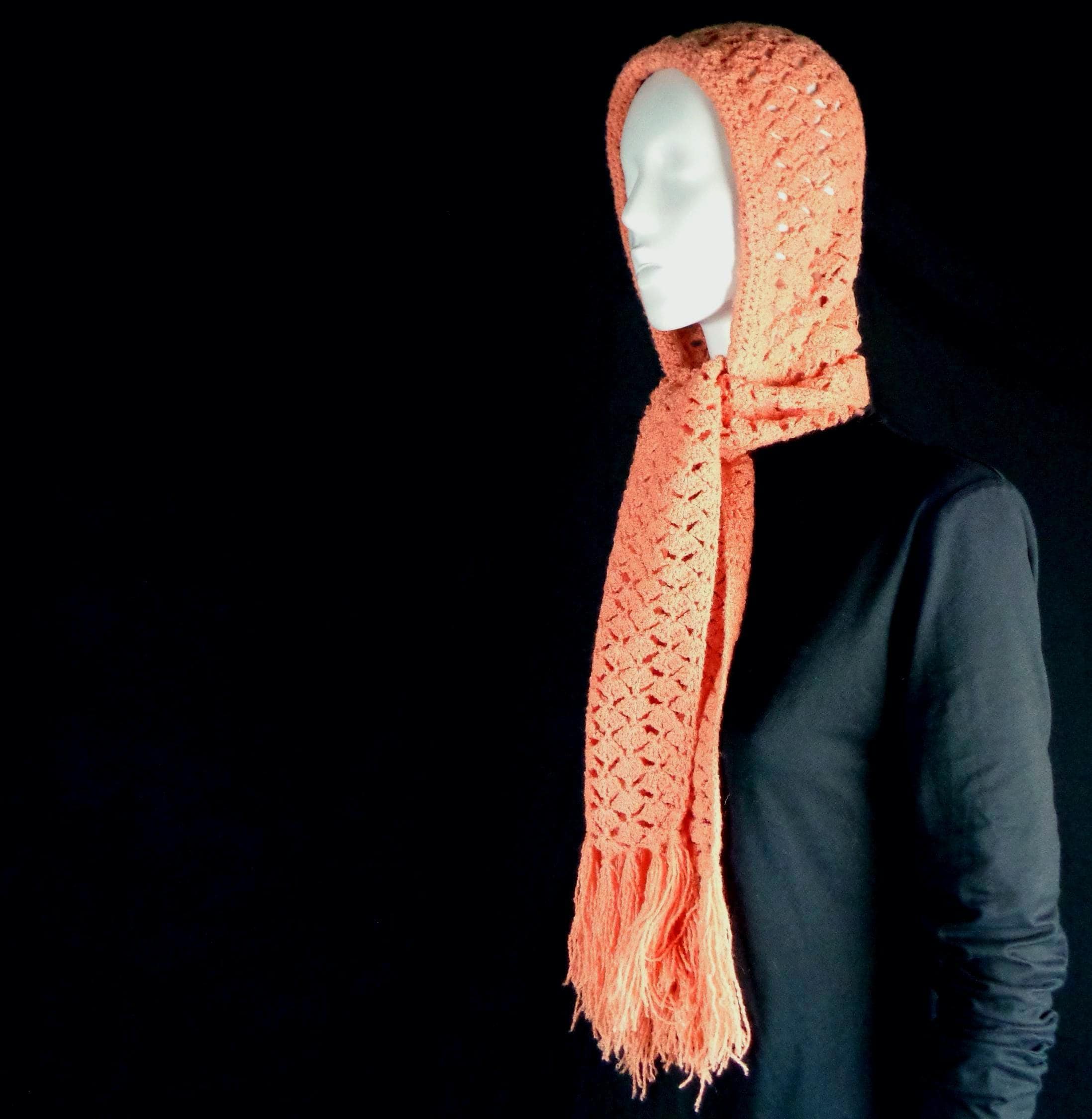 Features a scarf, hat wrap, shawl combination with tassel detailing, with 2 different loose knit design, pattern, with sift fabric, material throughout! Great compliment piece!