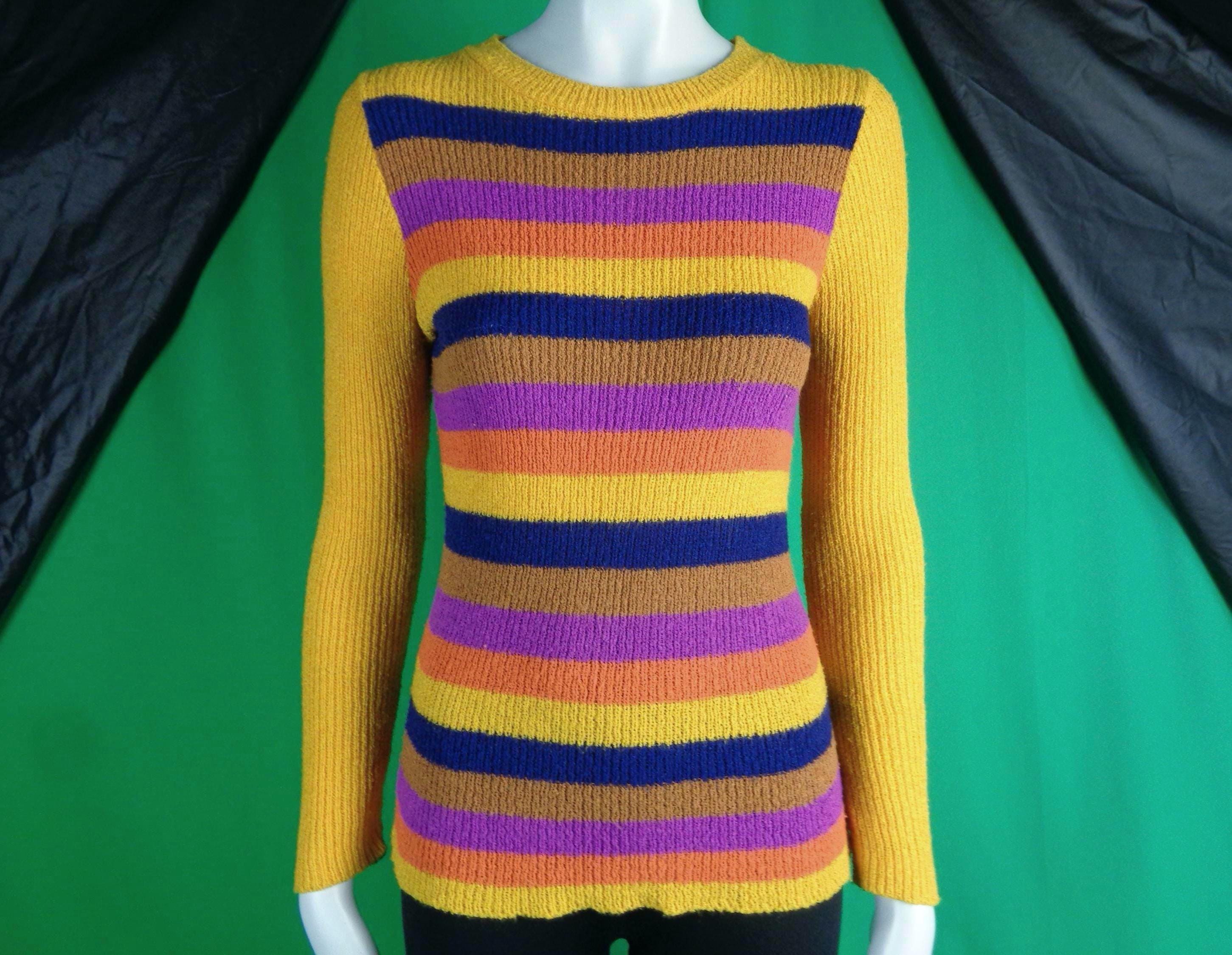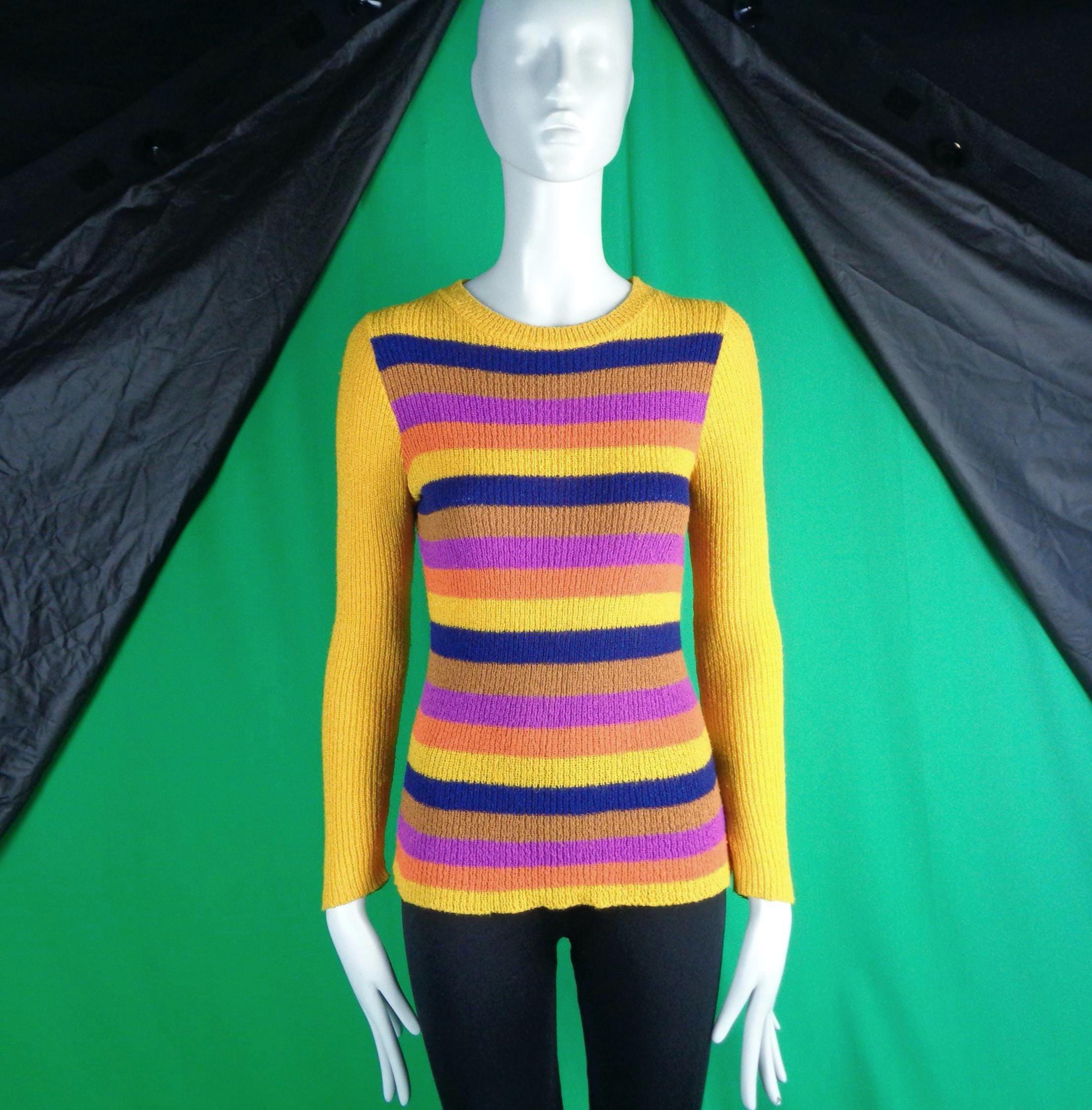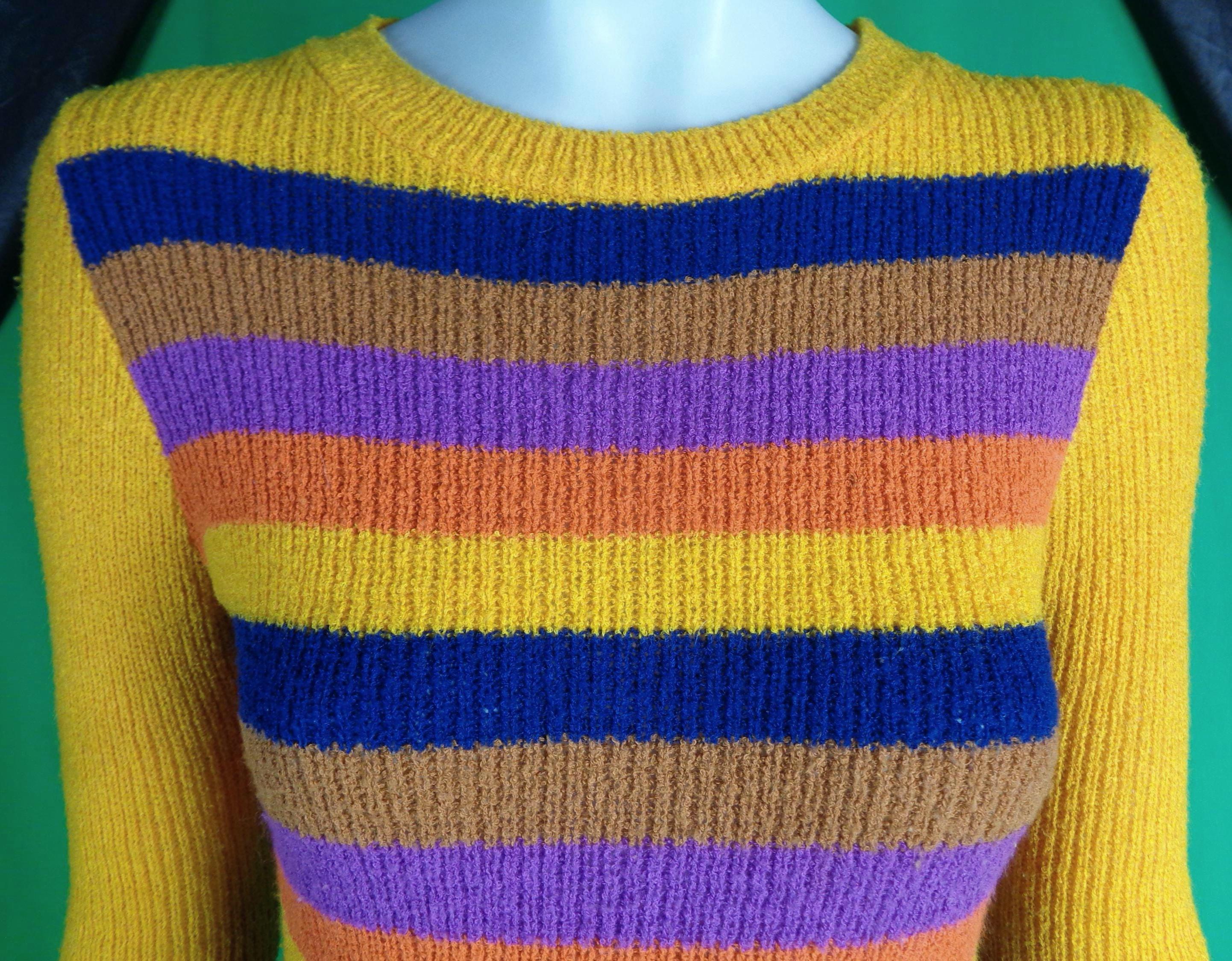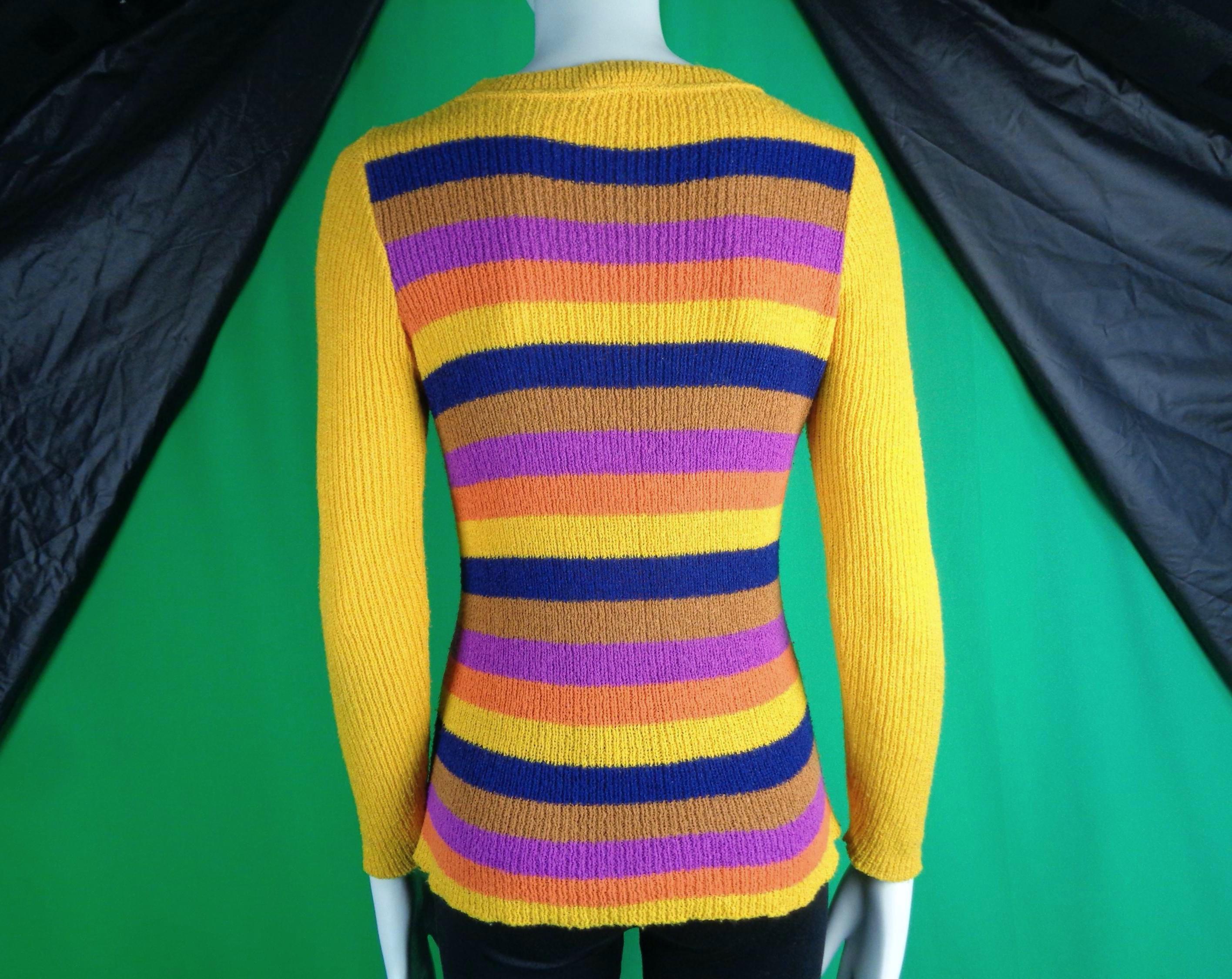 Features ribbed collar, cuffs, and bottom, with a color block of striped and solid combination, with the oringla factory tag, with a fine knit pattern, design throughout! Great compliment piece!