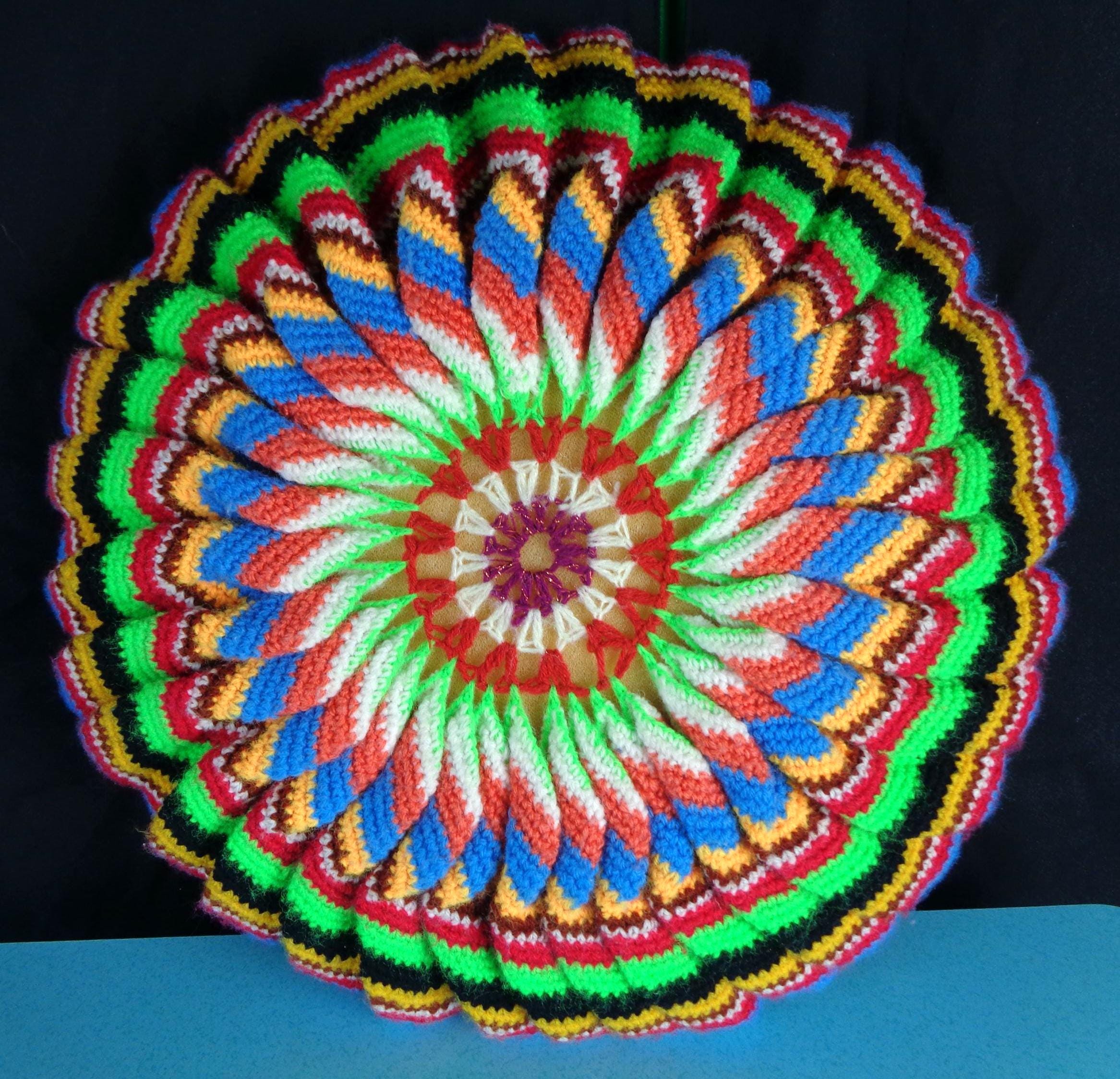 Features multi ray of colors, with a slightly over lapping layered wavy, pleat knitted pattern, design that is nicely handcrafted that's wrapped around foam puff! Great piece!