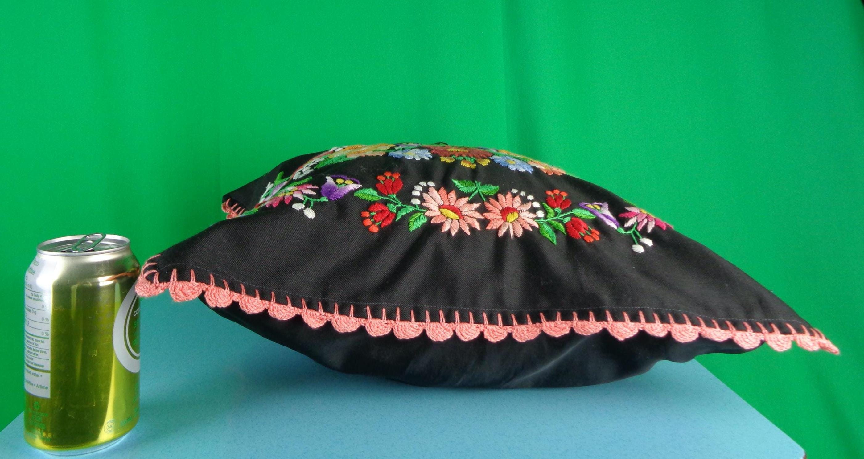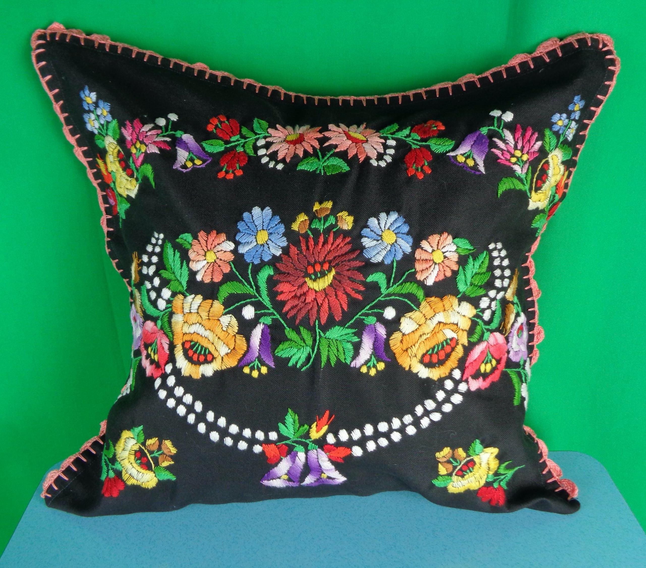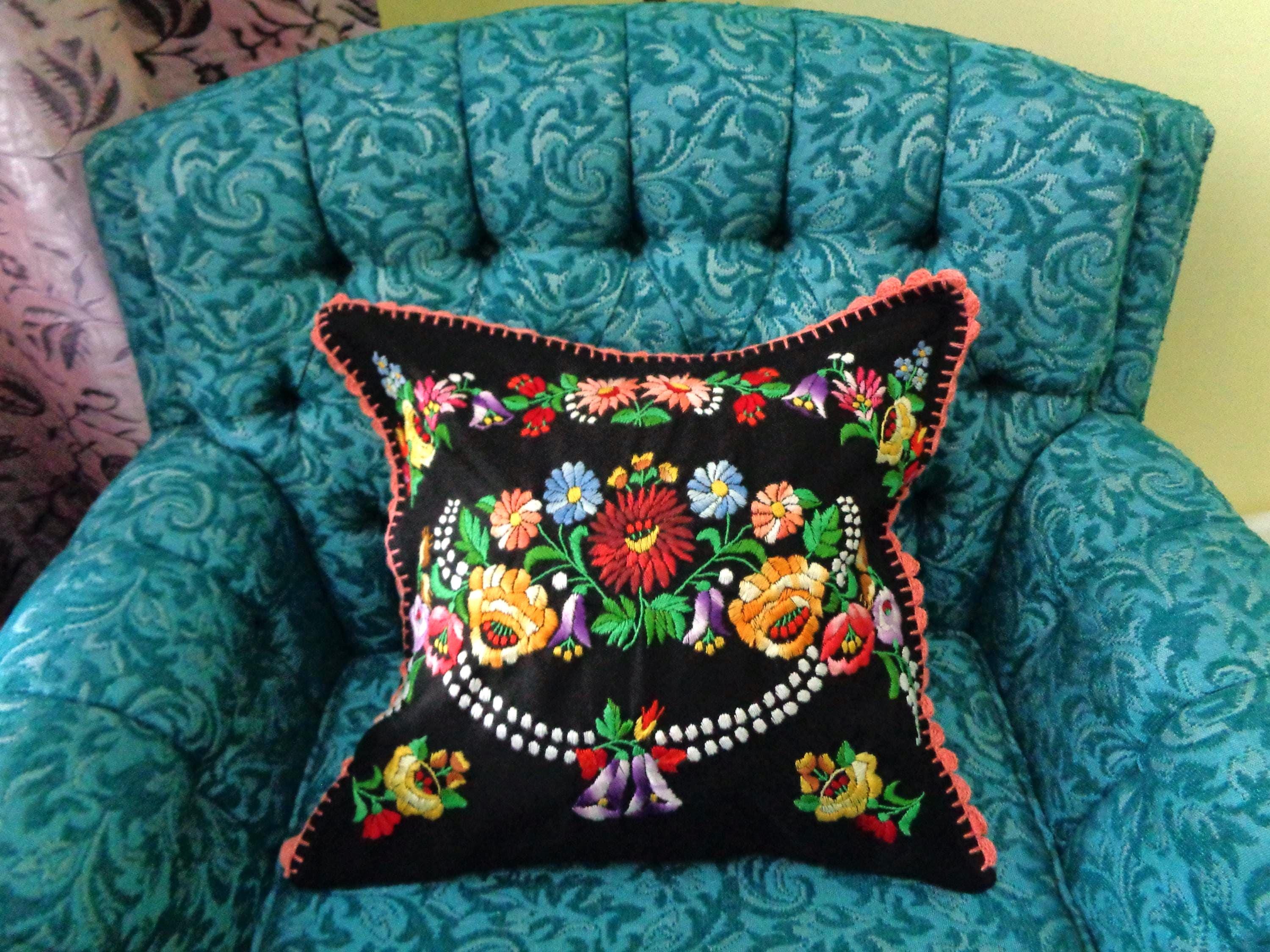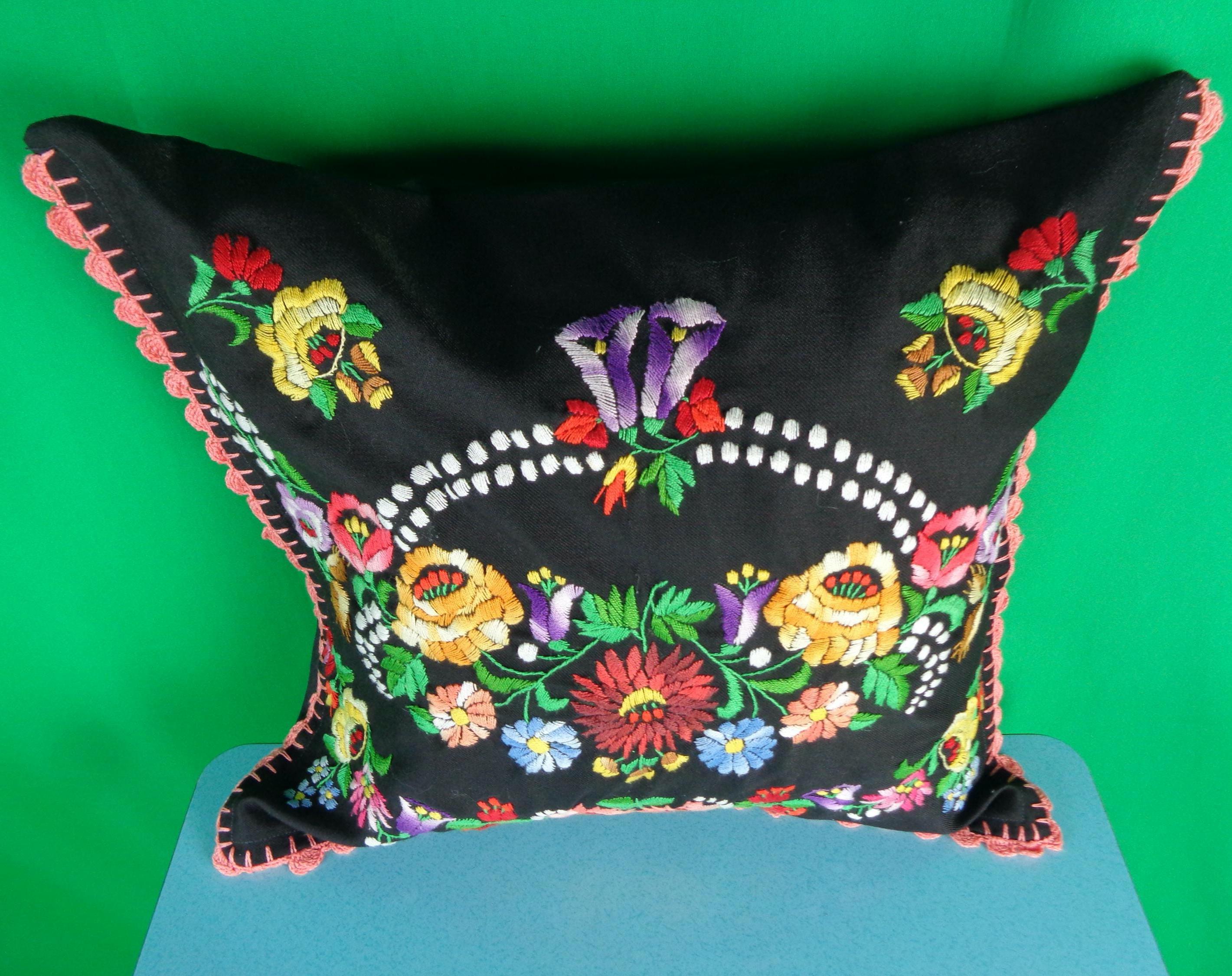 This lovely vibrant 1960s 70s embroidered pillow, cushion.