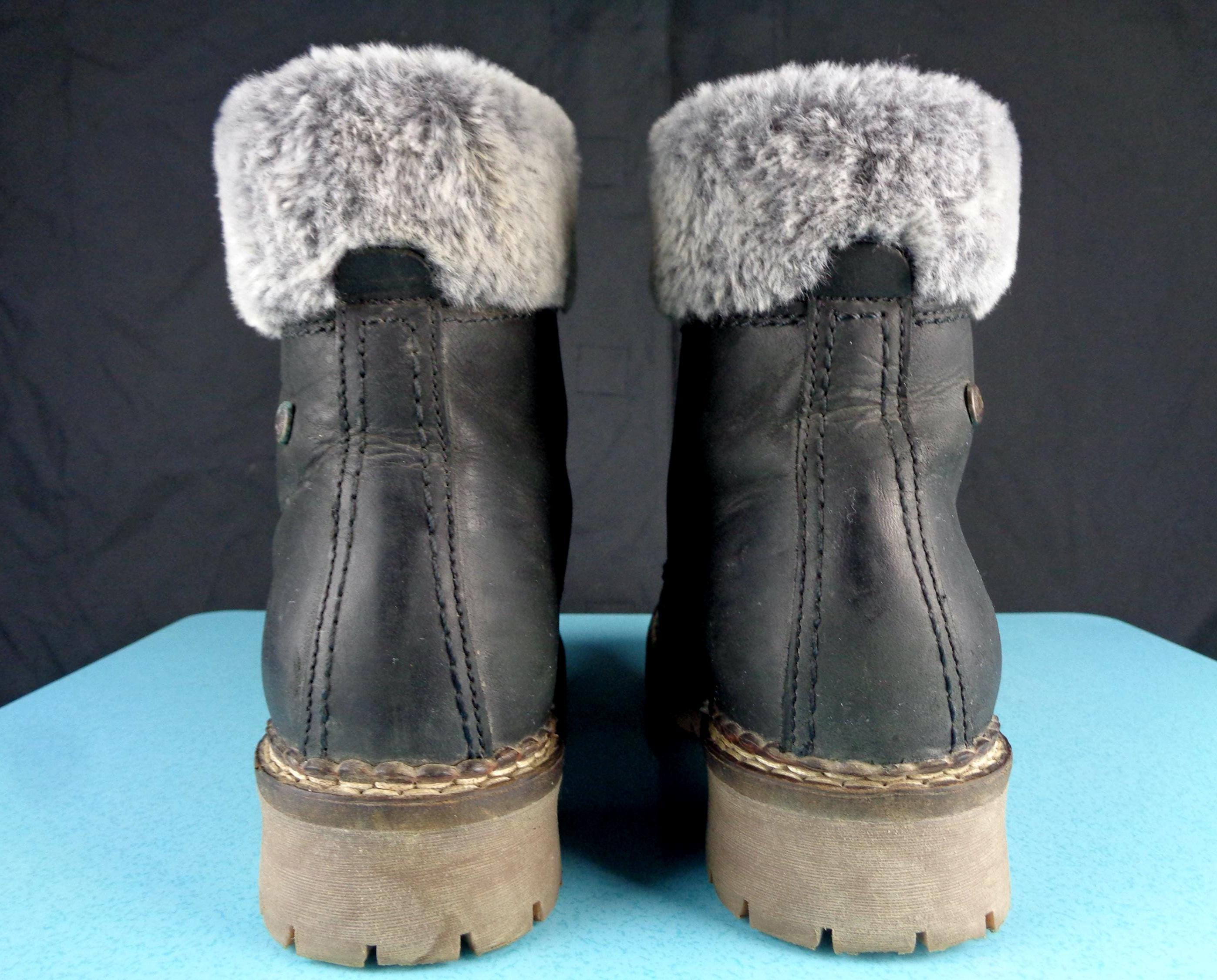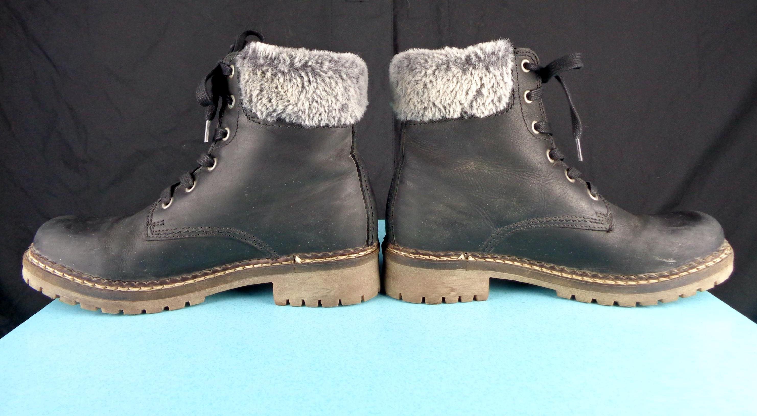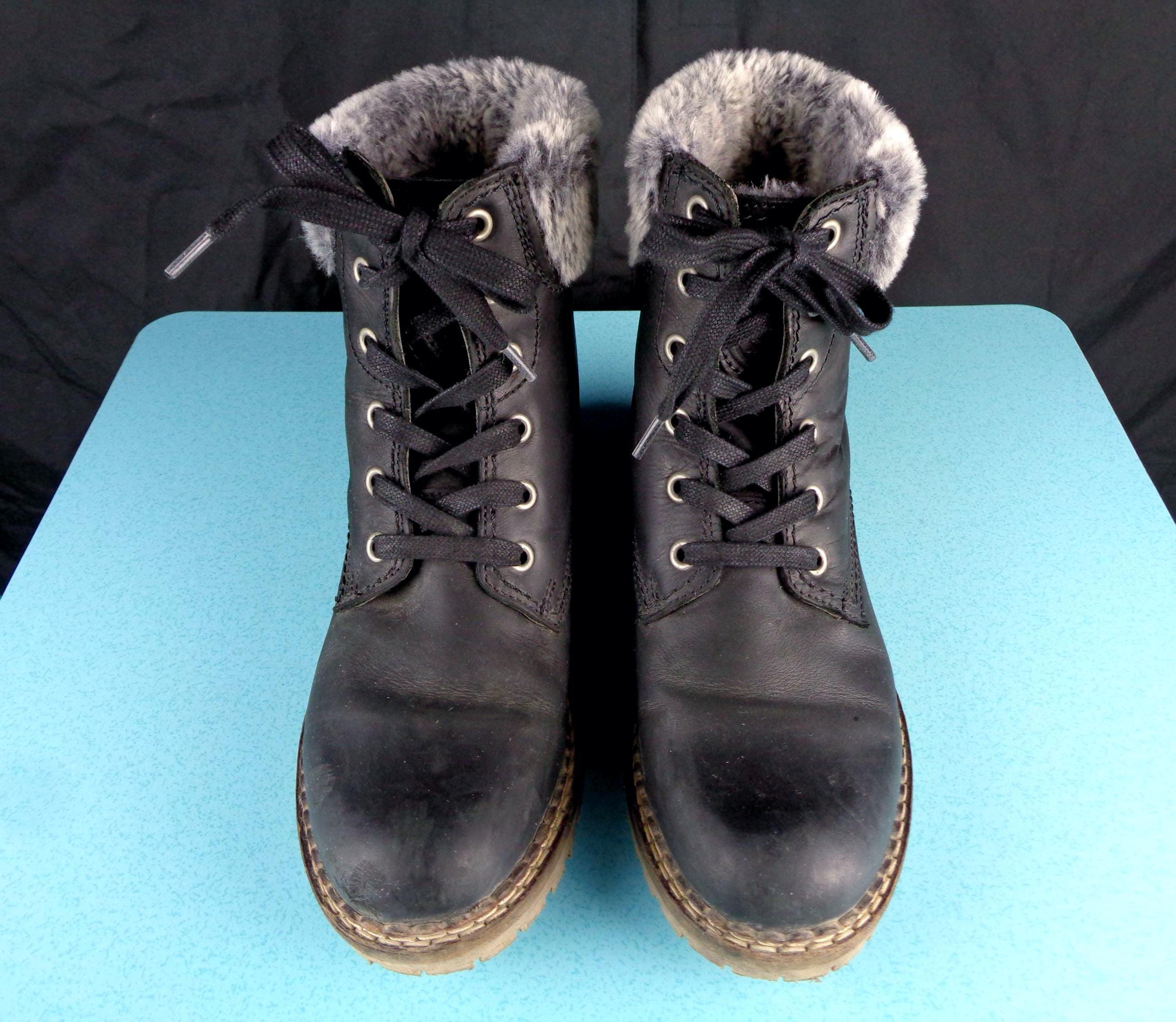 Features a fluffy top, opening, with a sturdy lace up front, all indicating labels and decals, solid, thick tread soles, smooth finished exterior throughout! Great piece!