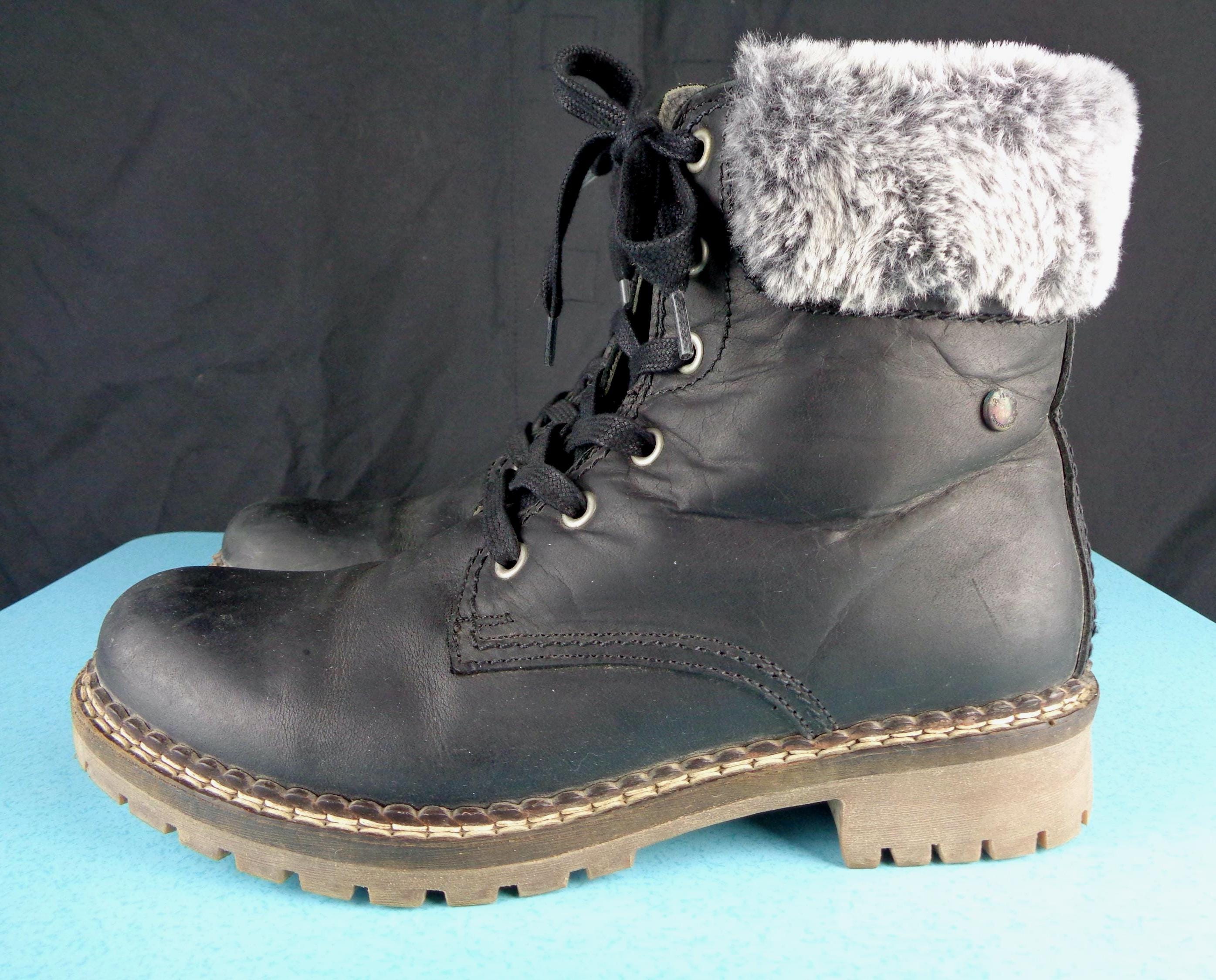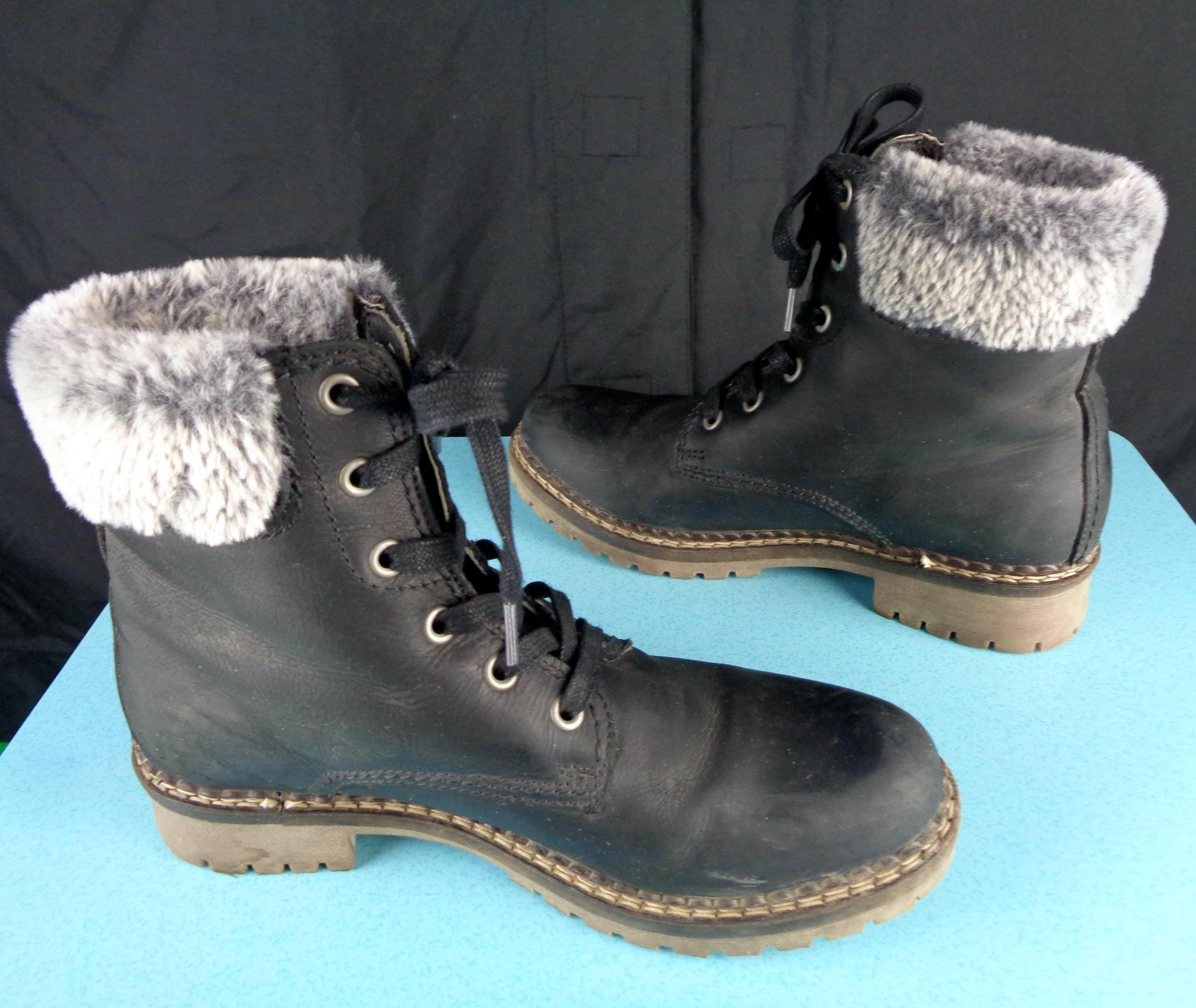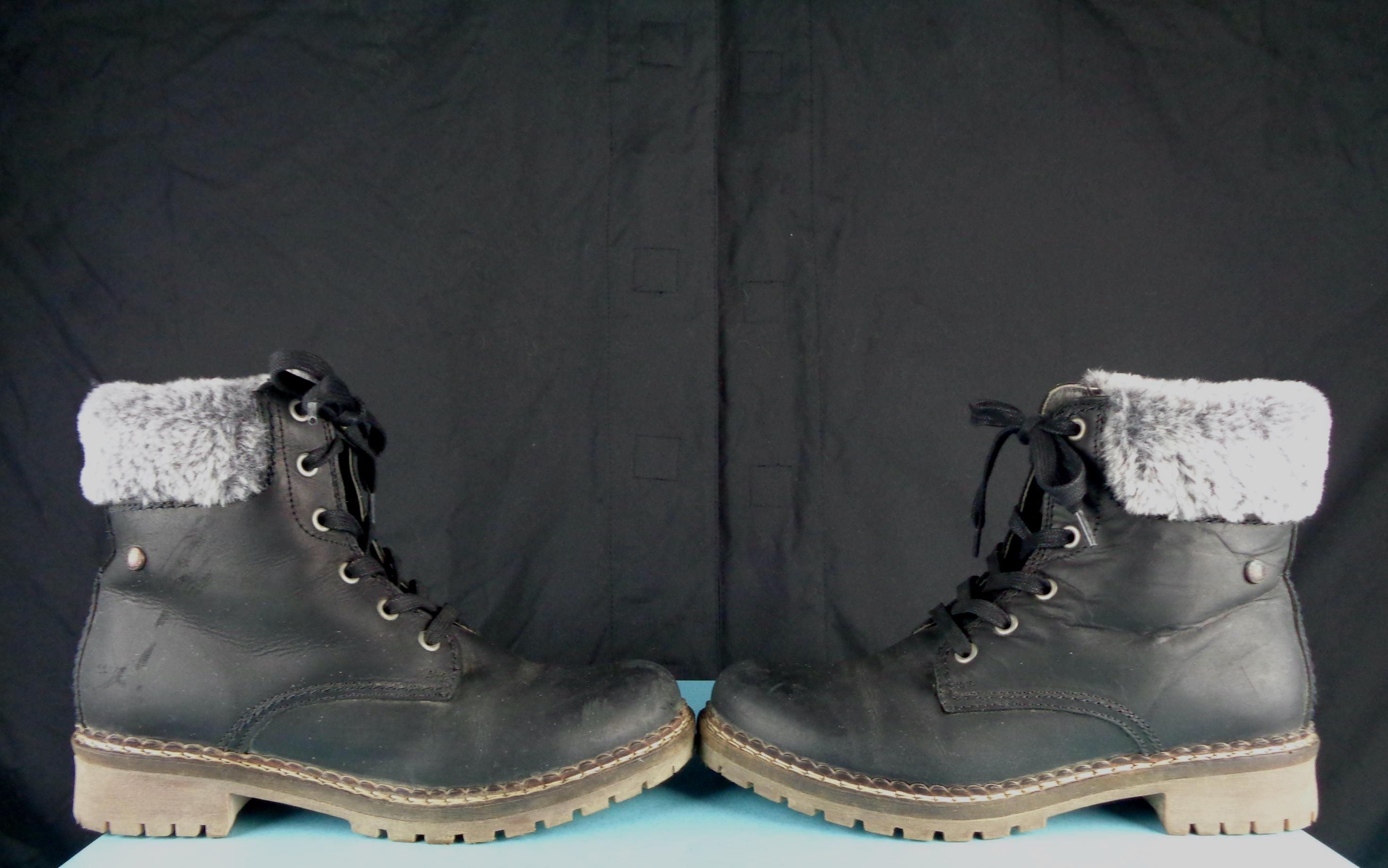 Features a fluffy top, opening, with a sturdy lace up front, all indicating labels and decals, solid, thick tread soles, smooth finished exterior throughout! Great piece!