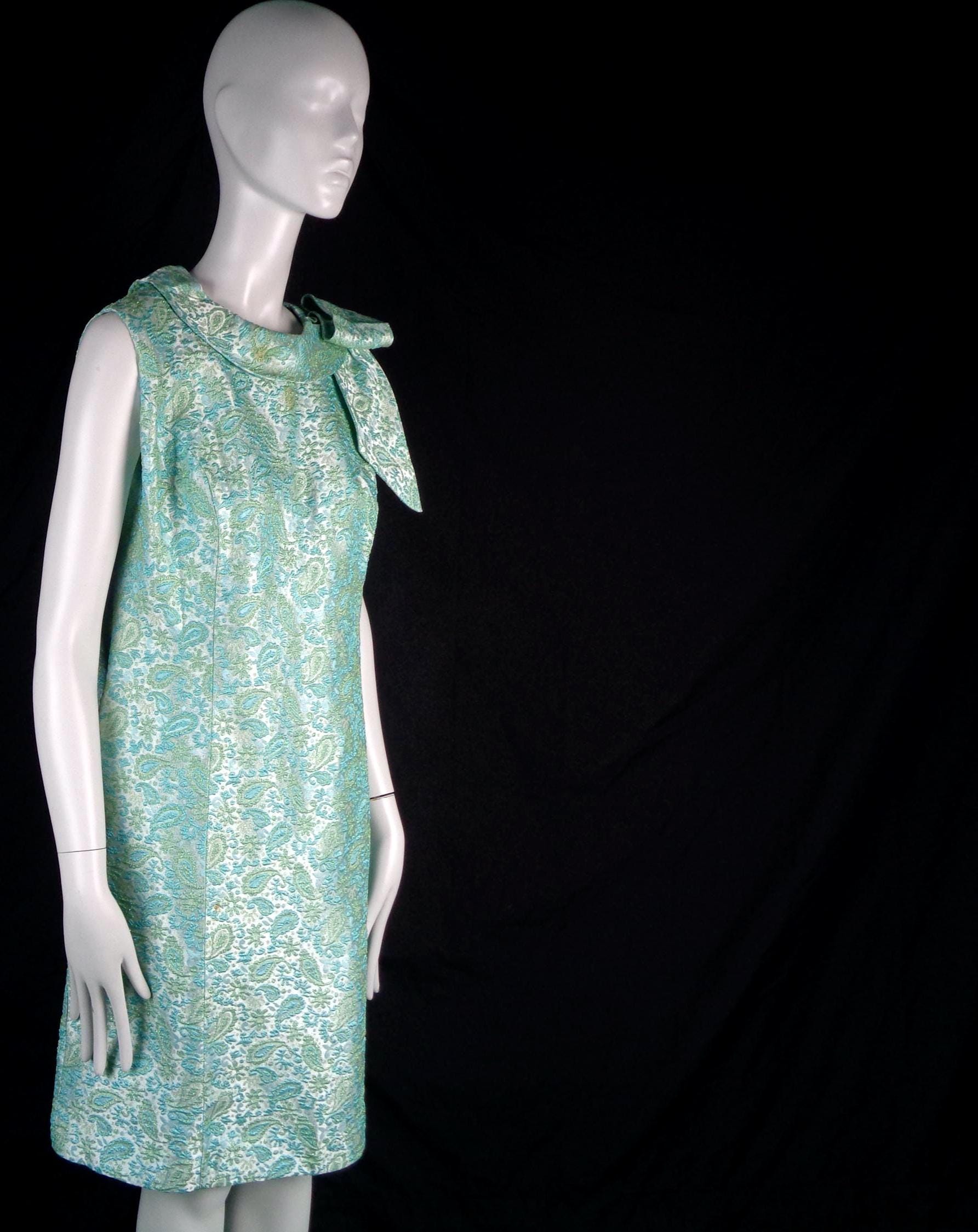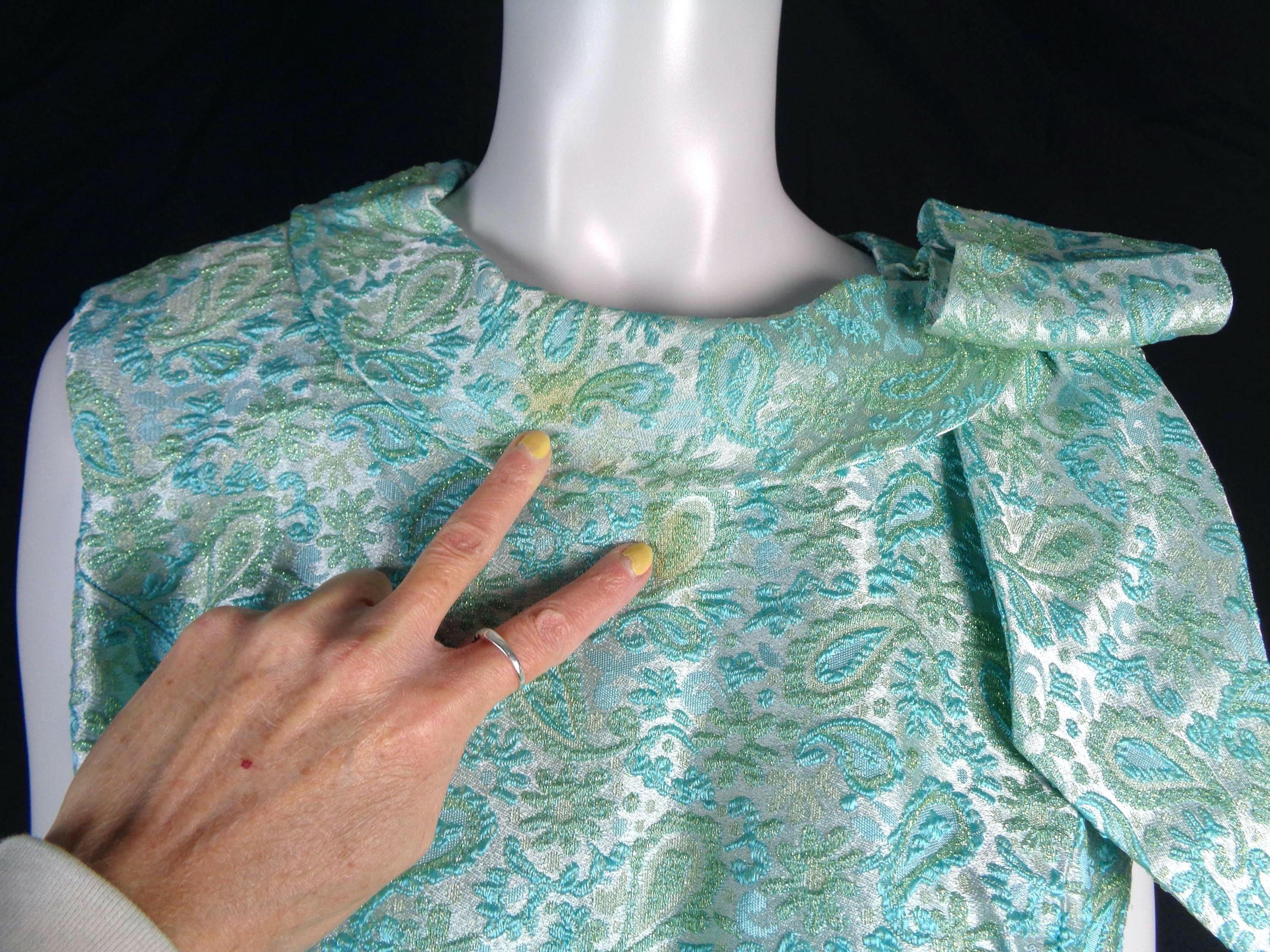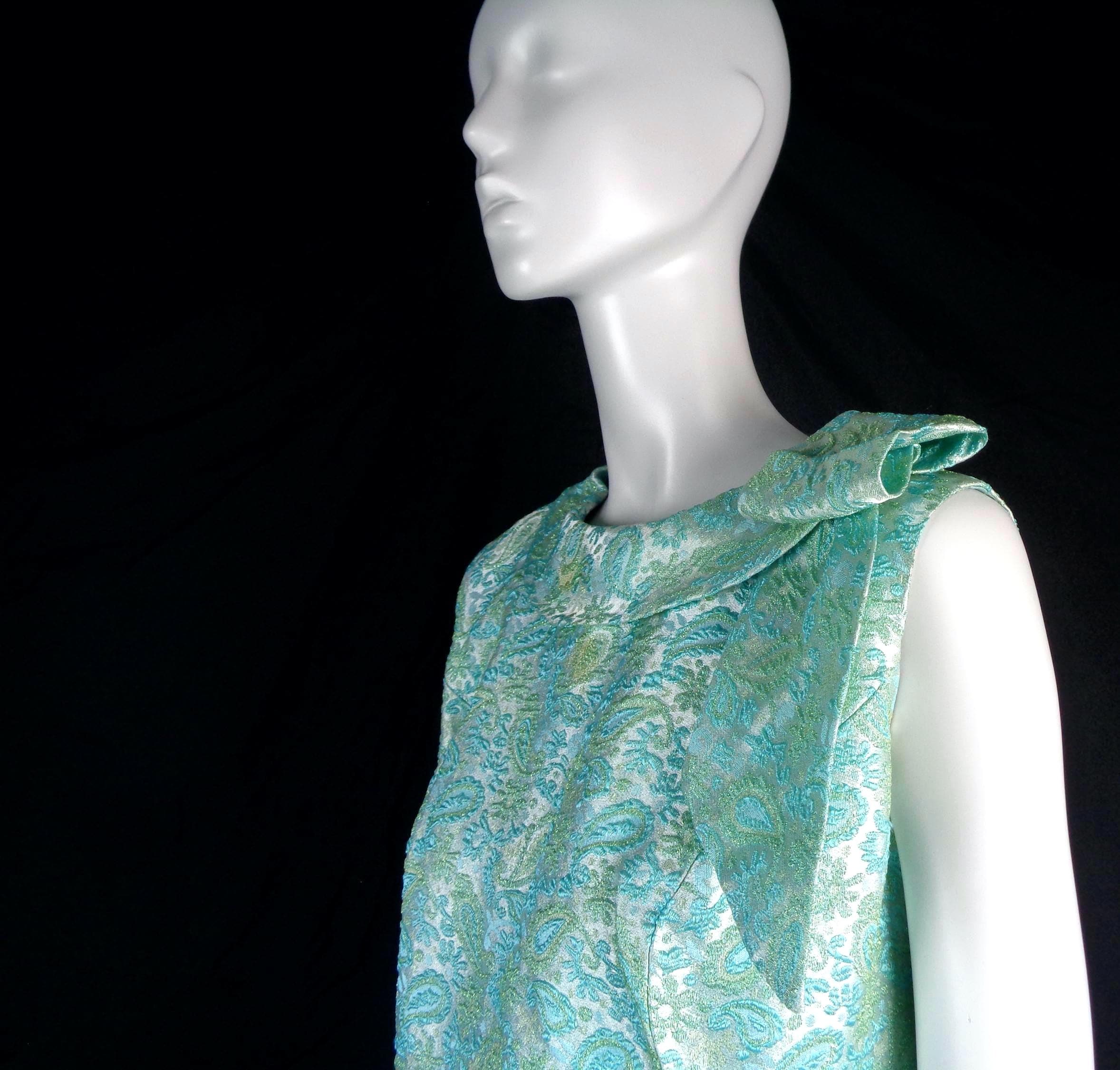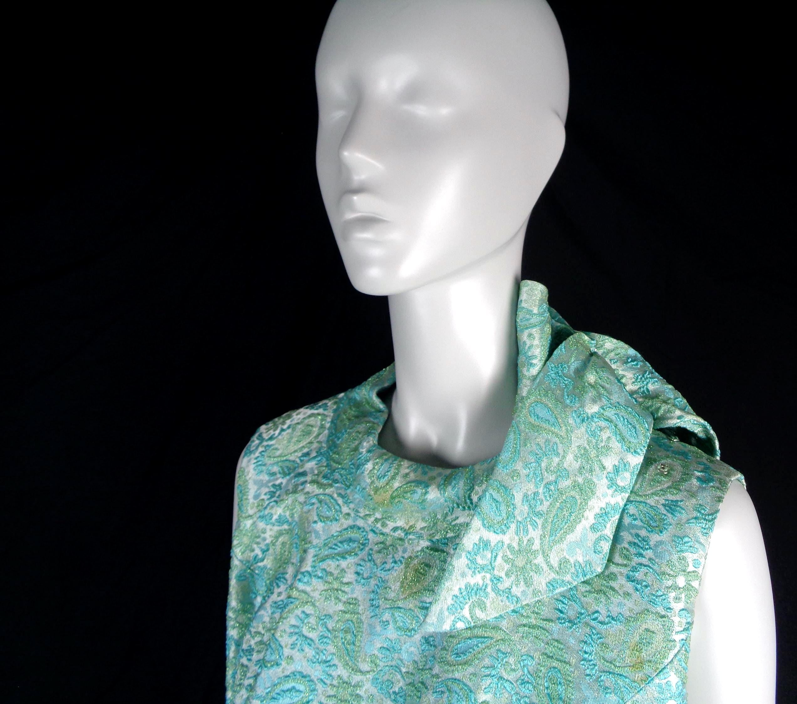 Features a built in chest scarf with snaps that can be worn more ways than one, with a back metal zipper, a brocade paisley pattern, design throughout! Great compliment piece!