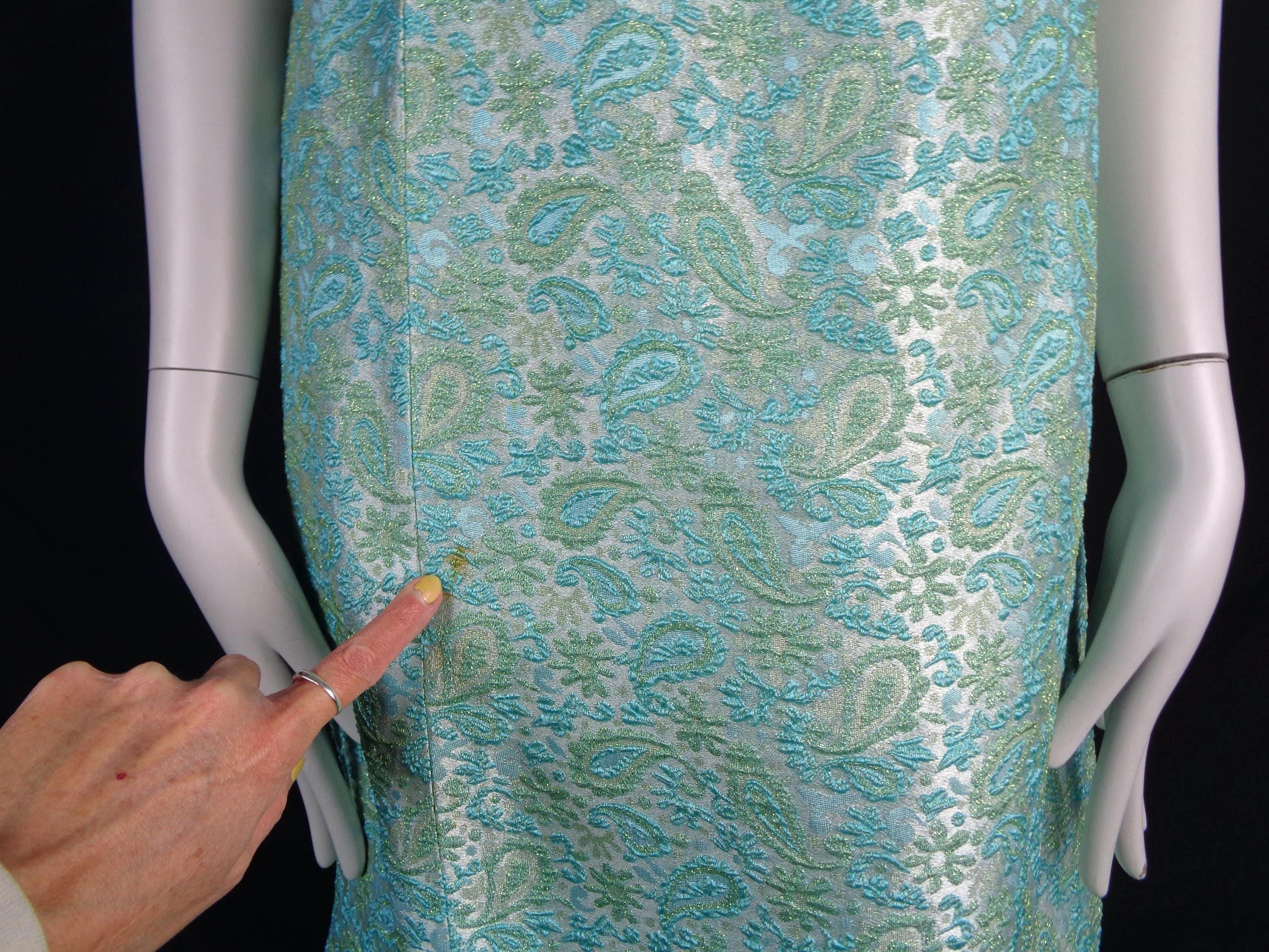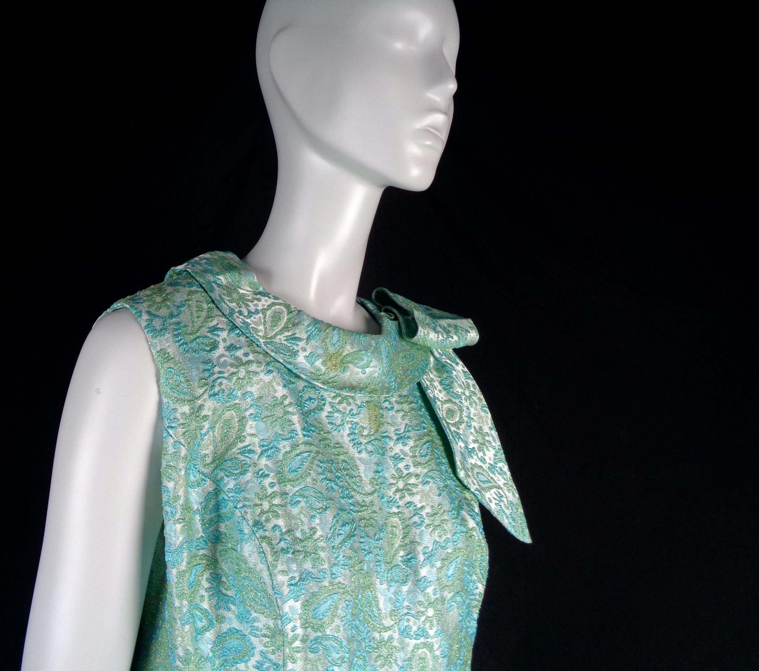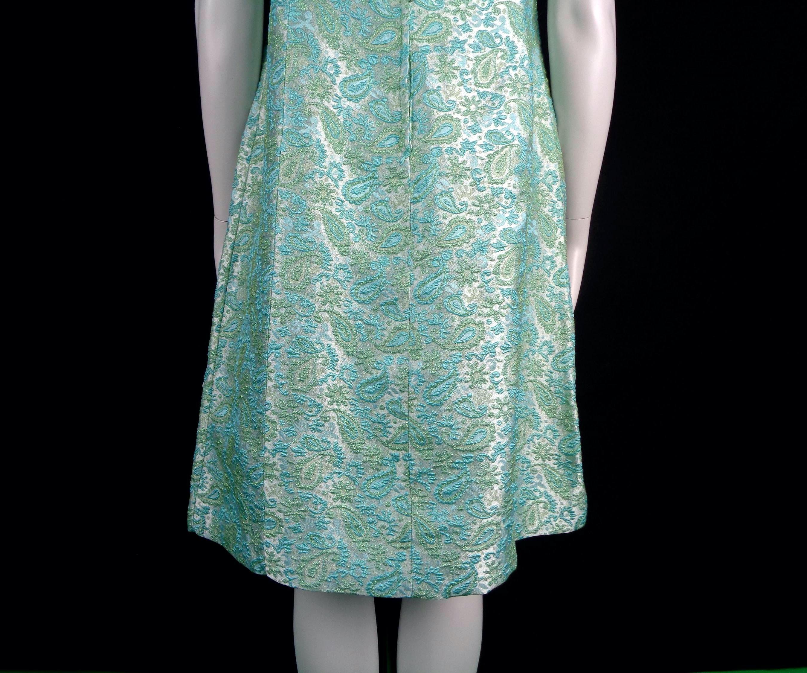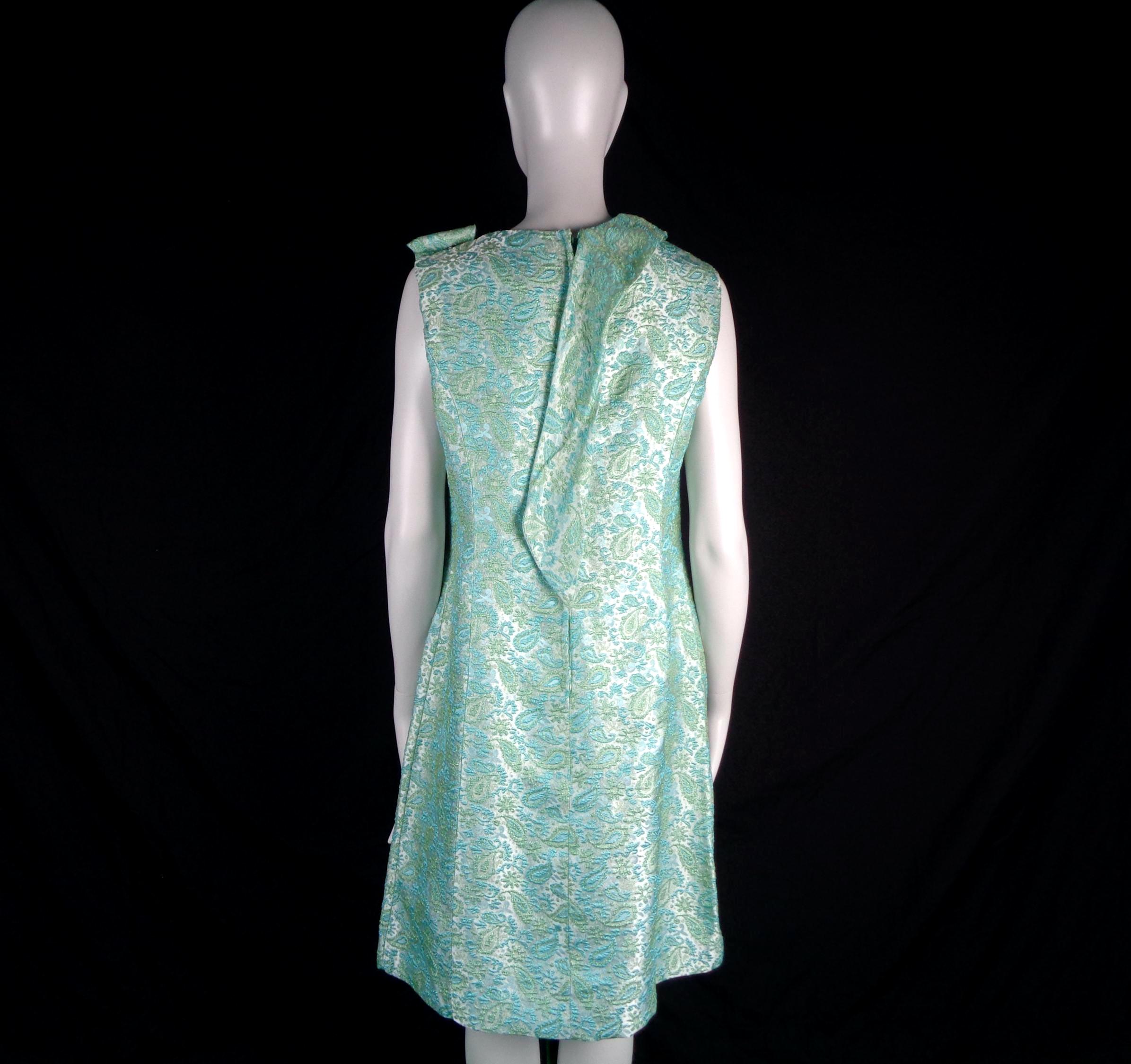 Features a built in chest scarf with snaps that can be worn more ways than one, with a back metal zipper, a brocade paisley pattern, design throughout! Great compliment piece!