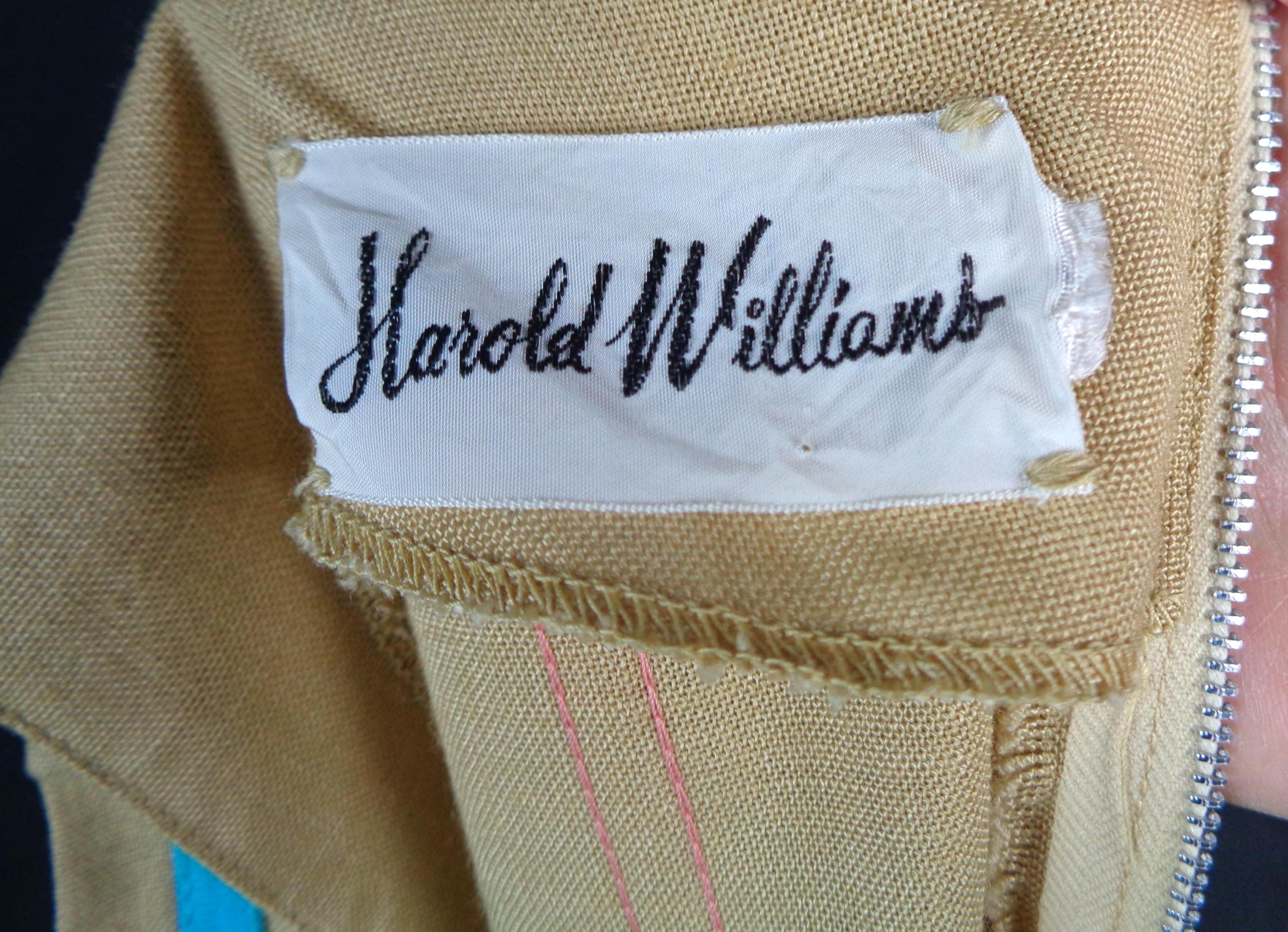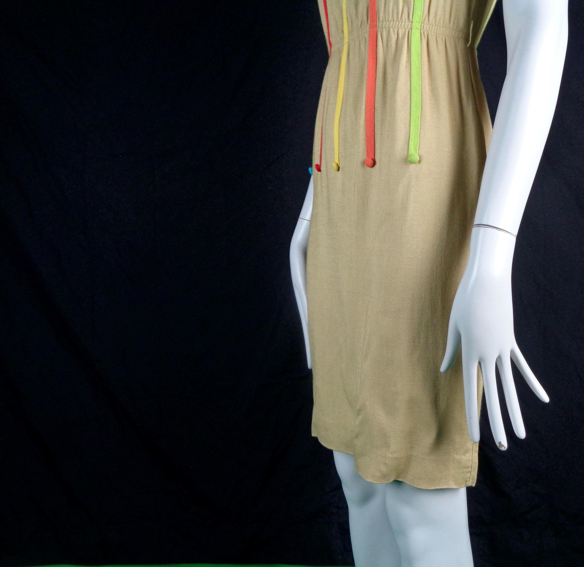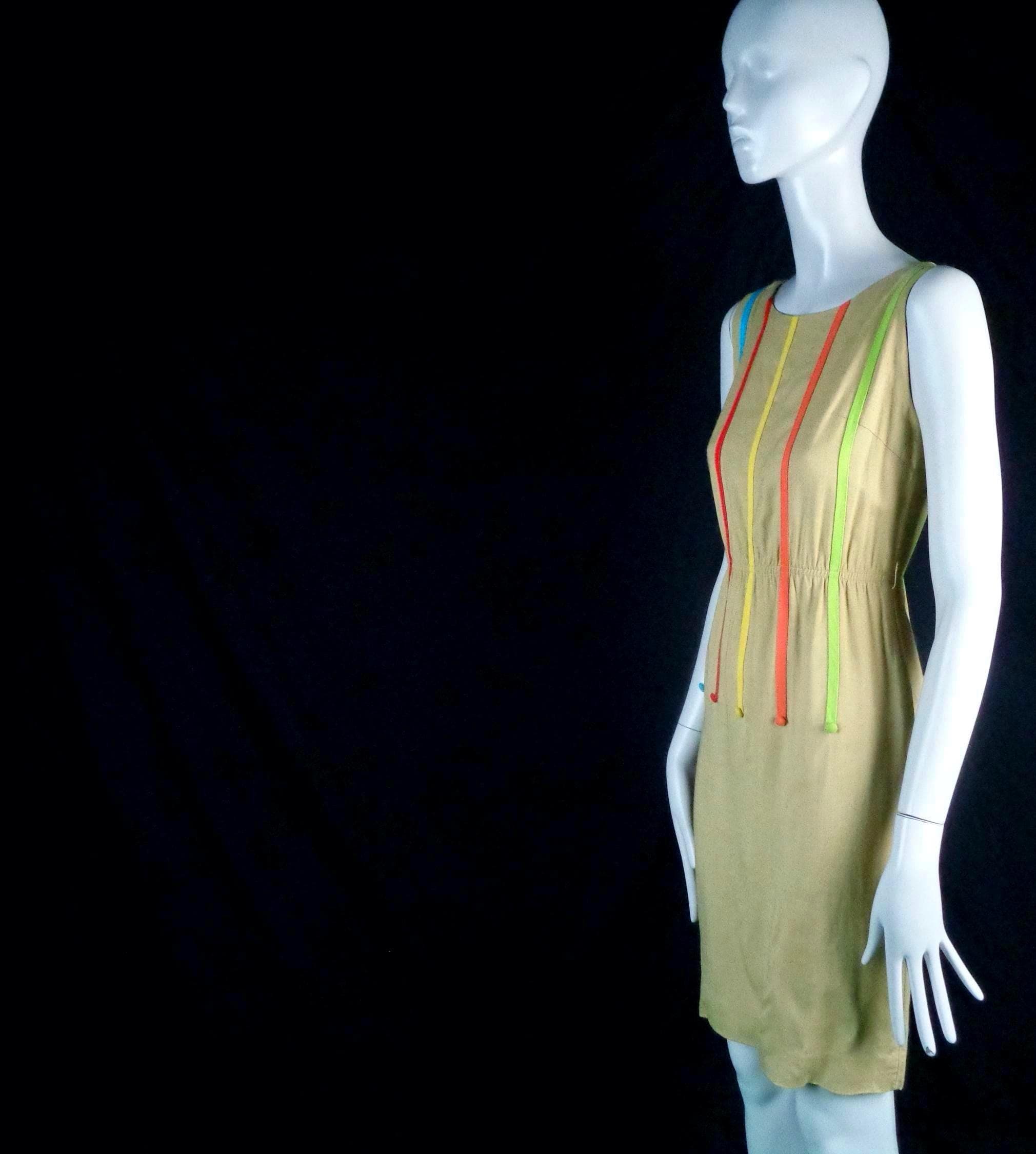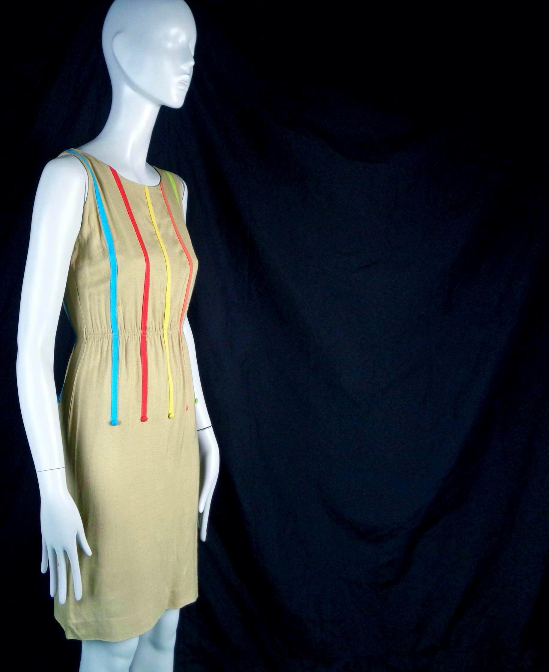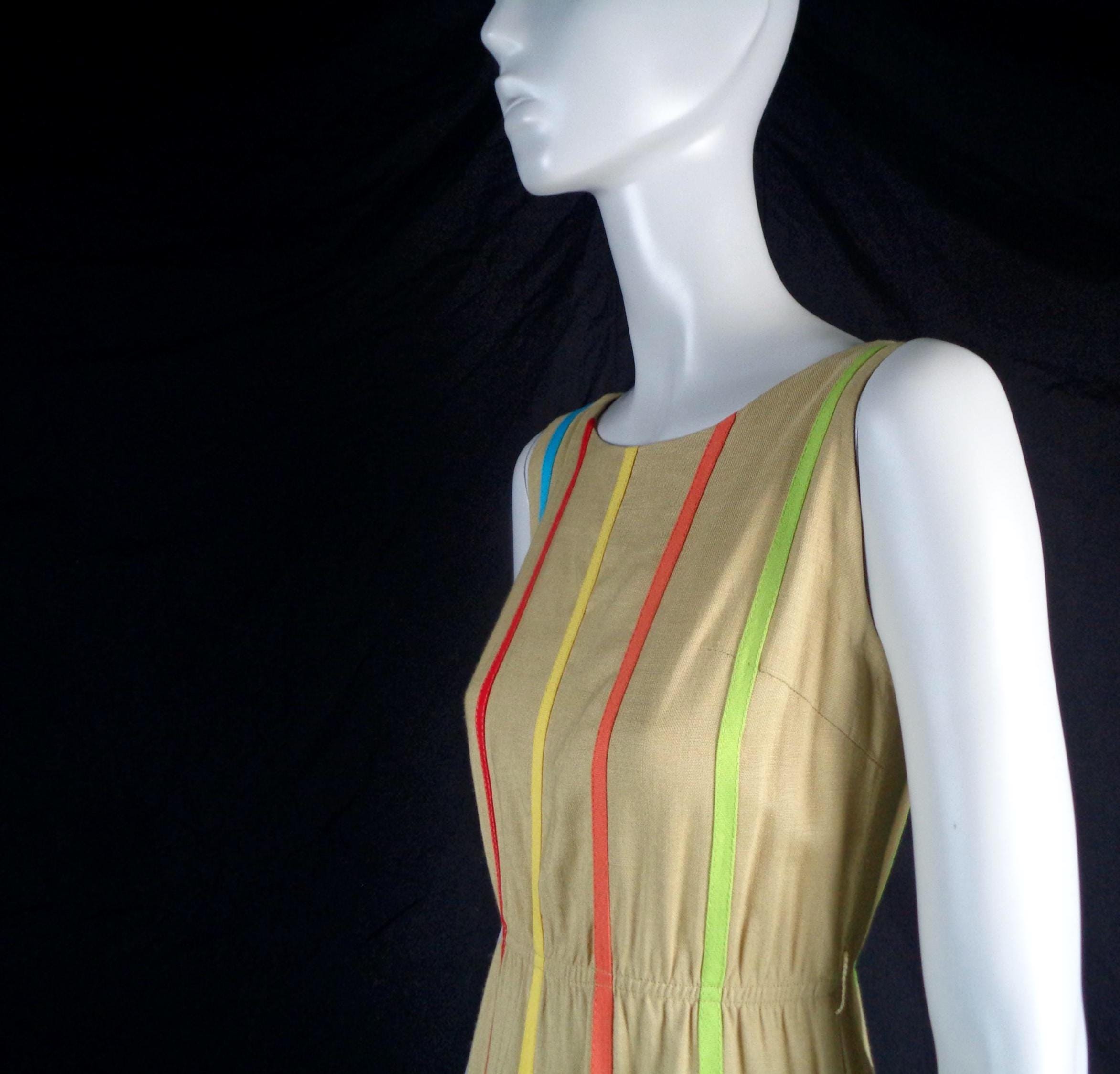 Features a back metal zipper with top hook closure, elastic nipped waist, with vertical multi color rainbow strips with button covers at the bottom of the strips, crisp light weight, breathable fabric, material throughout!