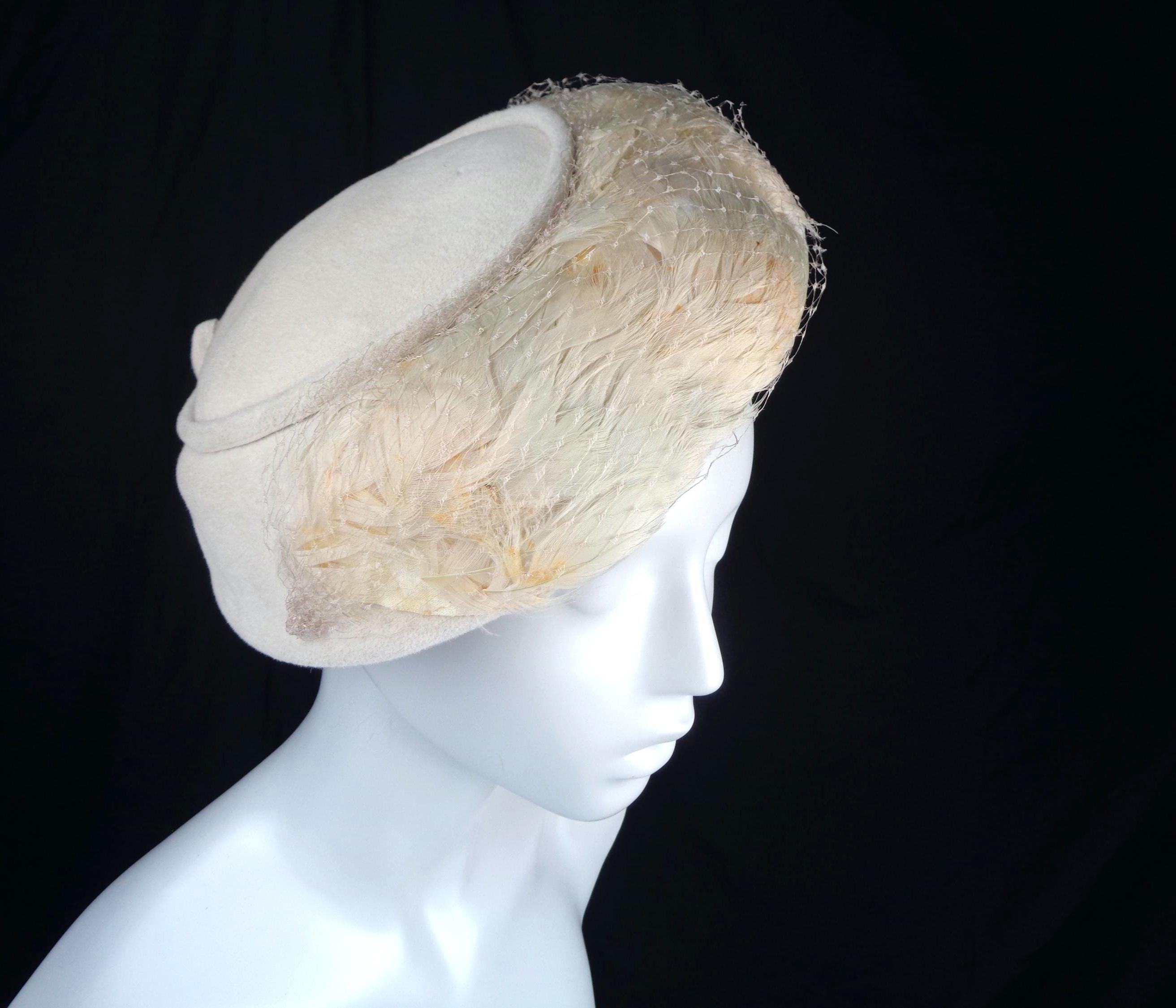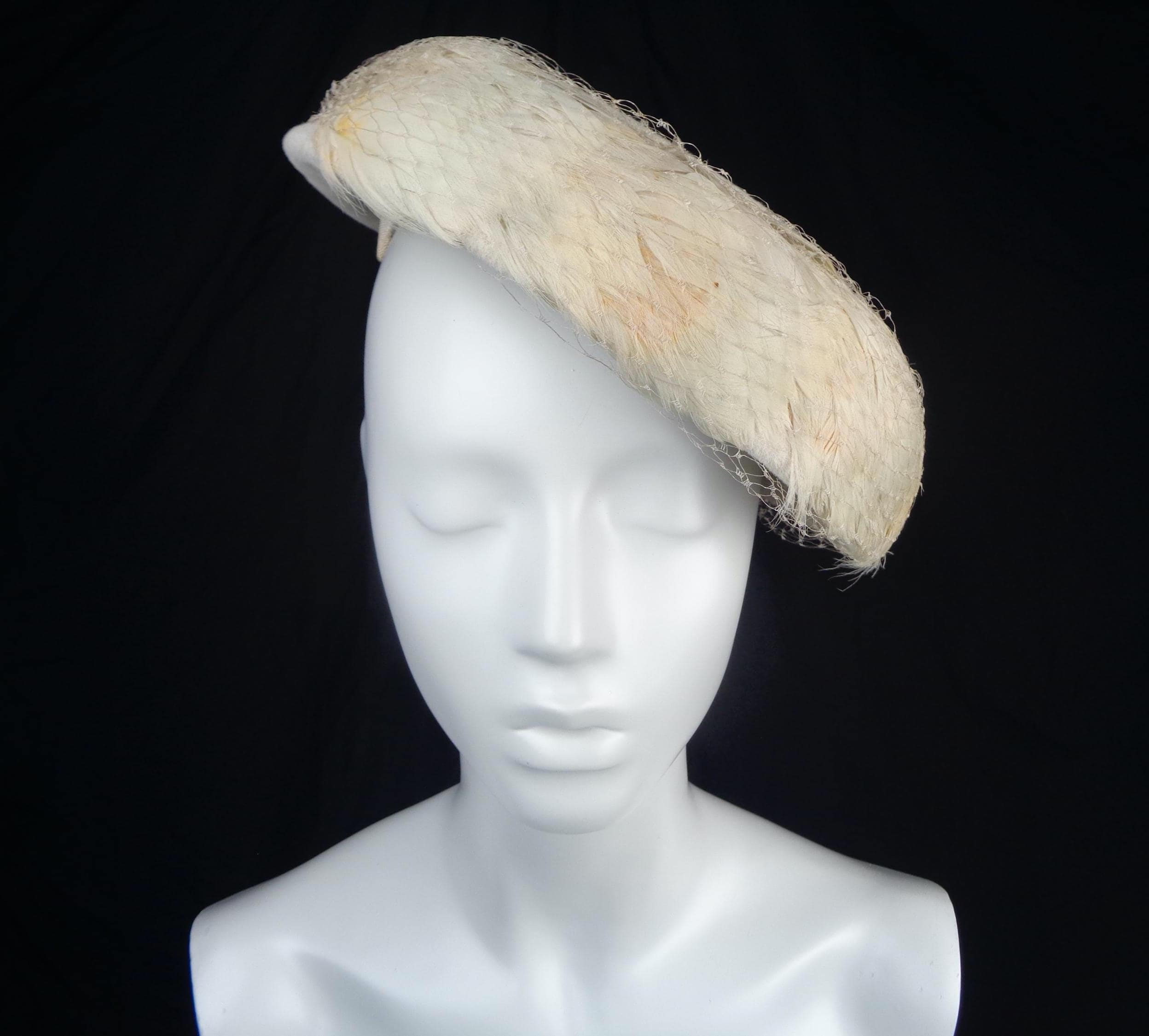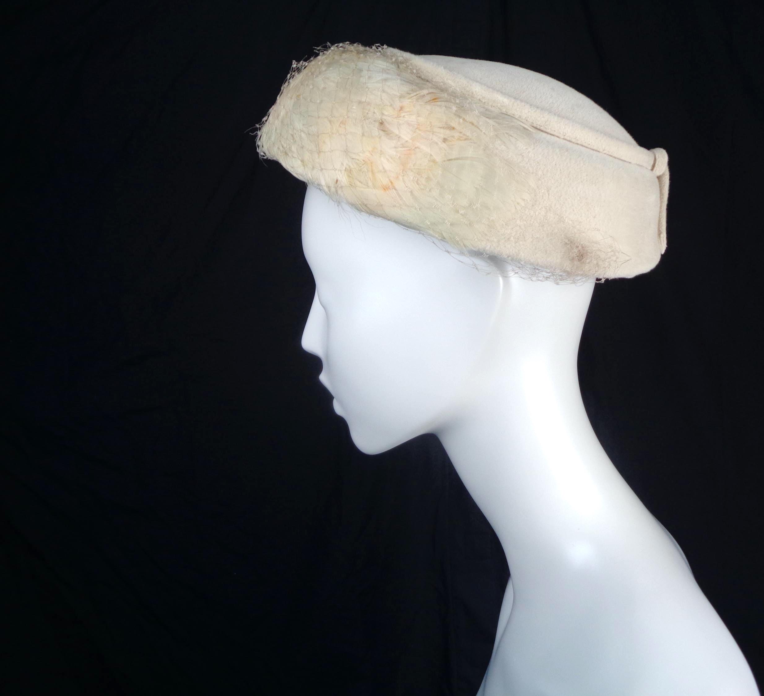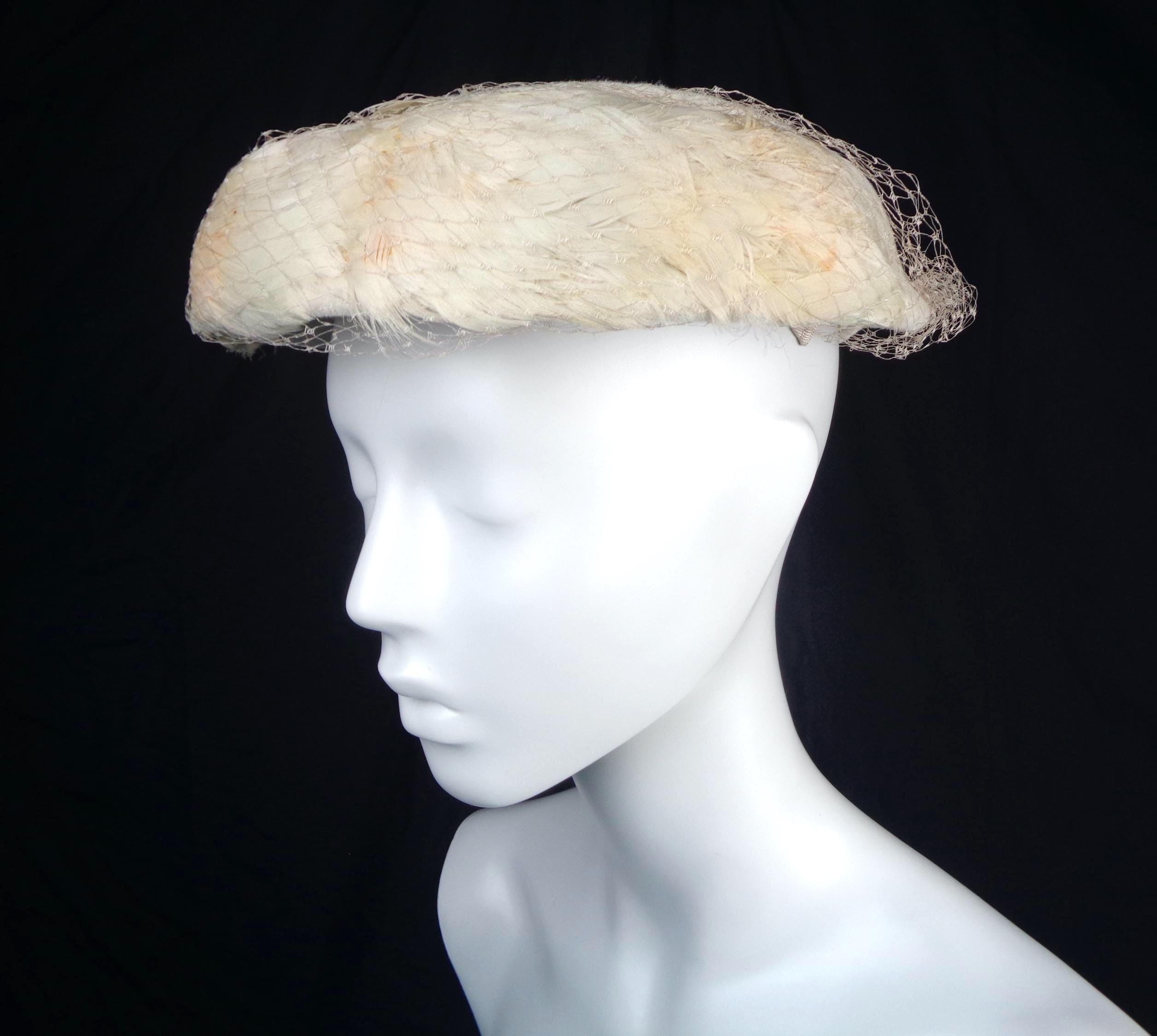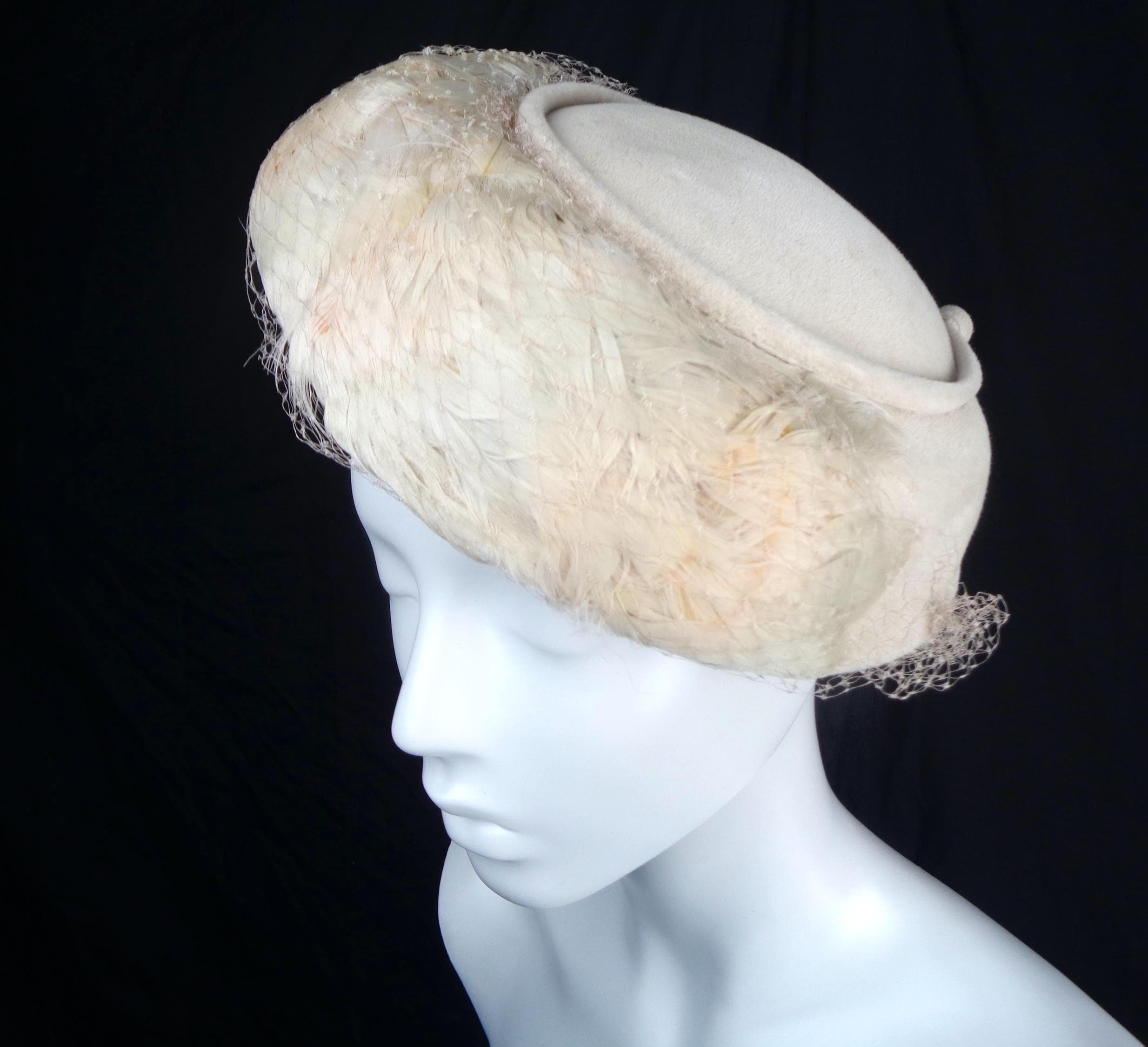 Features front feather gathered together, set in a veil secure to the hat, a piping detail on the top, a double layered back, with 2 covered adjustable wire spokes, with soft material throughout! Great compliment piece!
