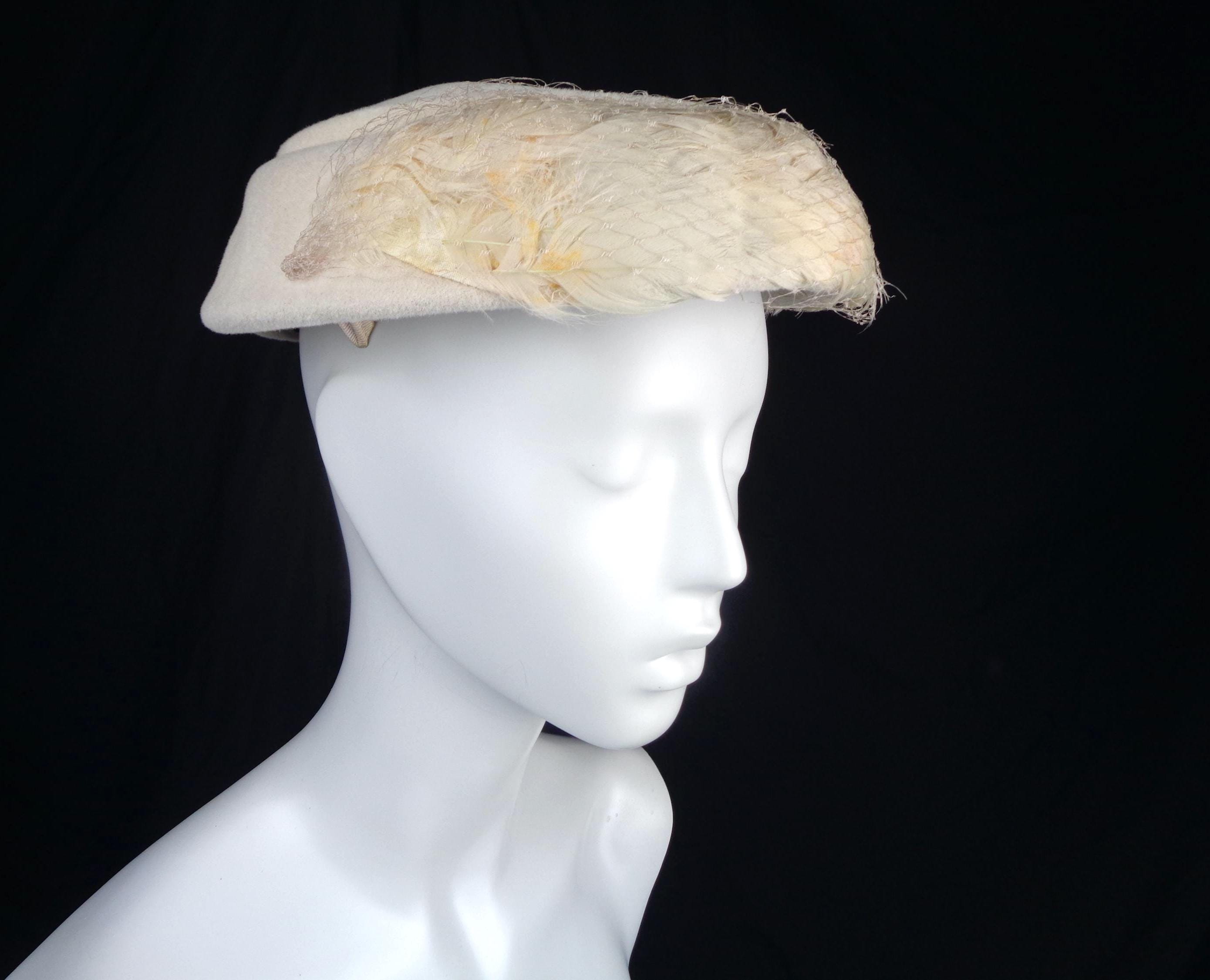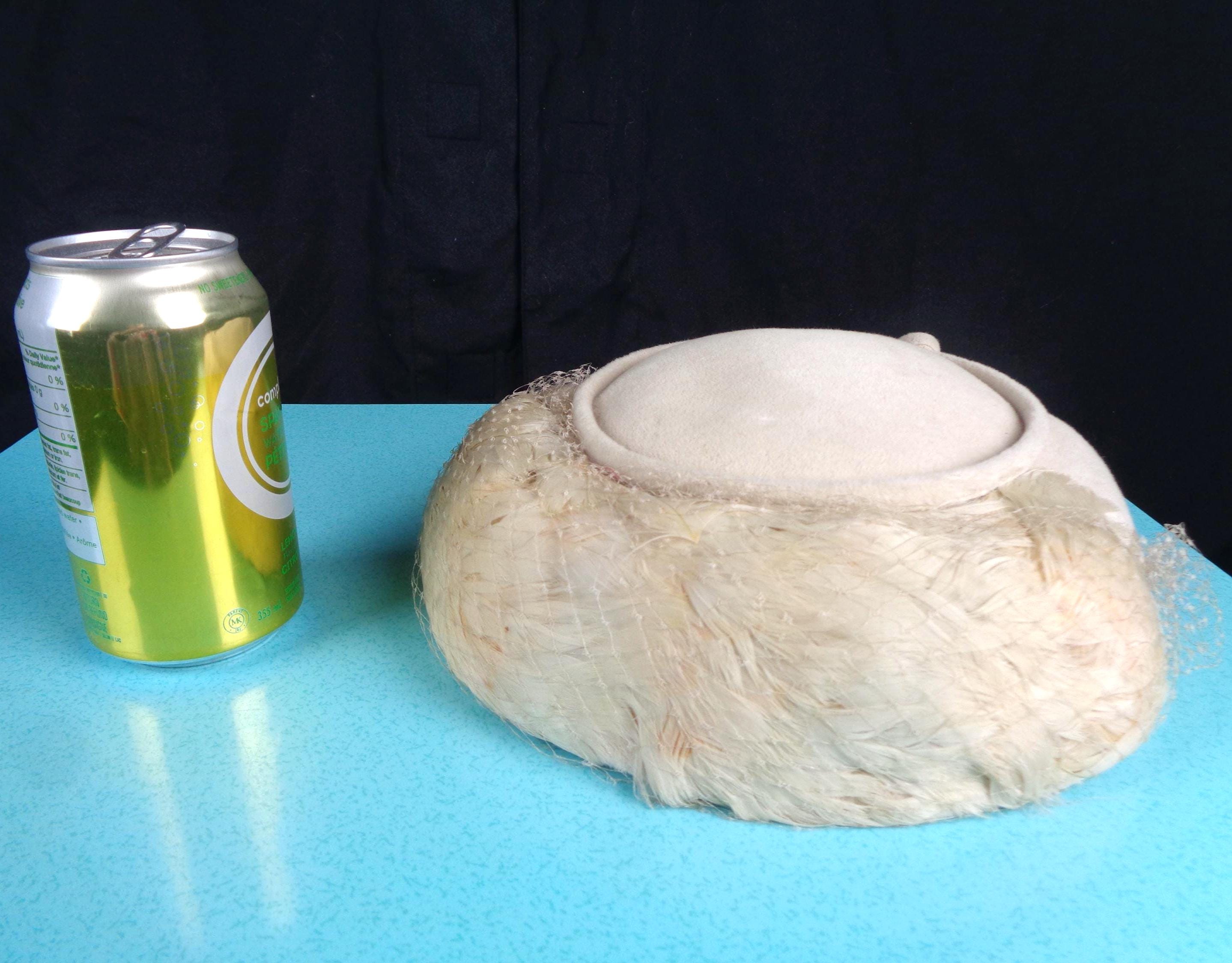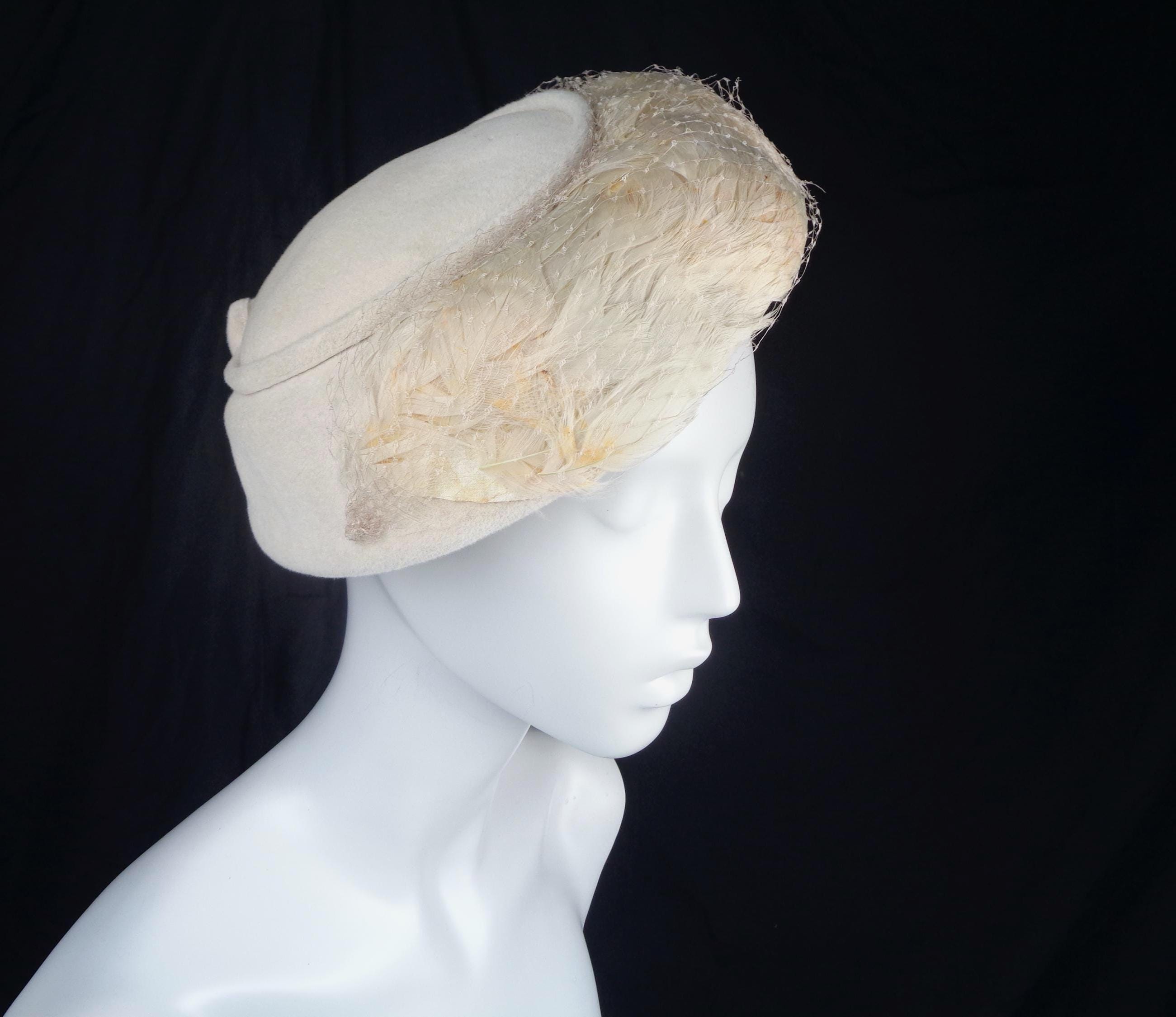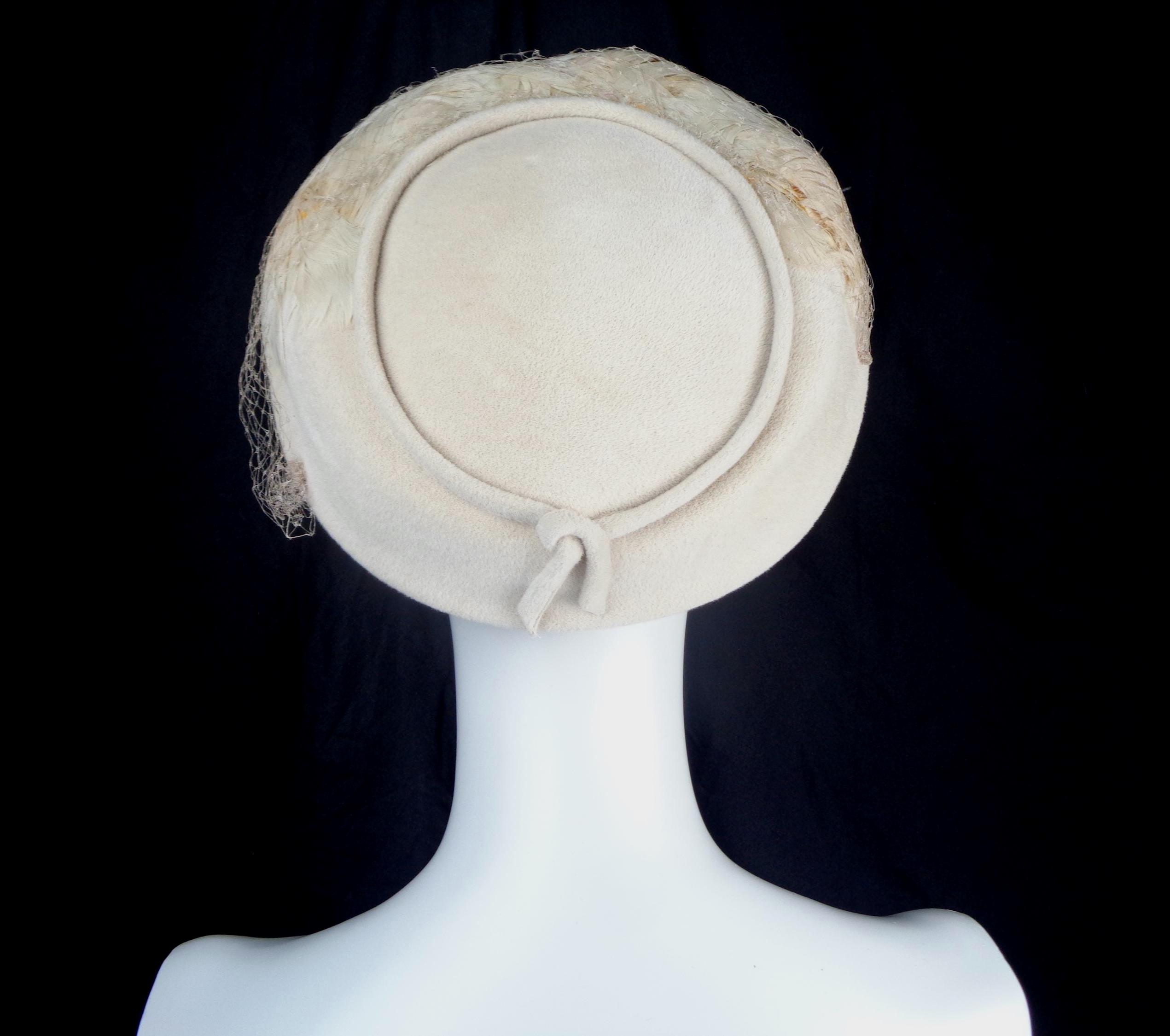 Features front feather gathered together, set in a veil secure to the hat, a piping detail on the top, a double layered back, with 2 covered adjustable wire spokes, with soft material throughout! Great compliment piece!