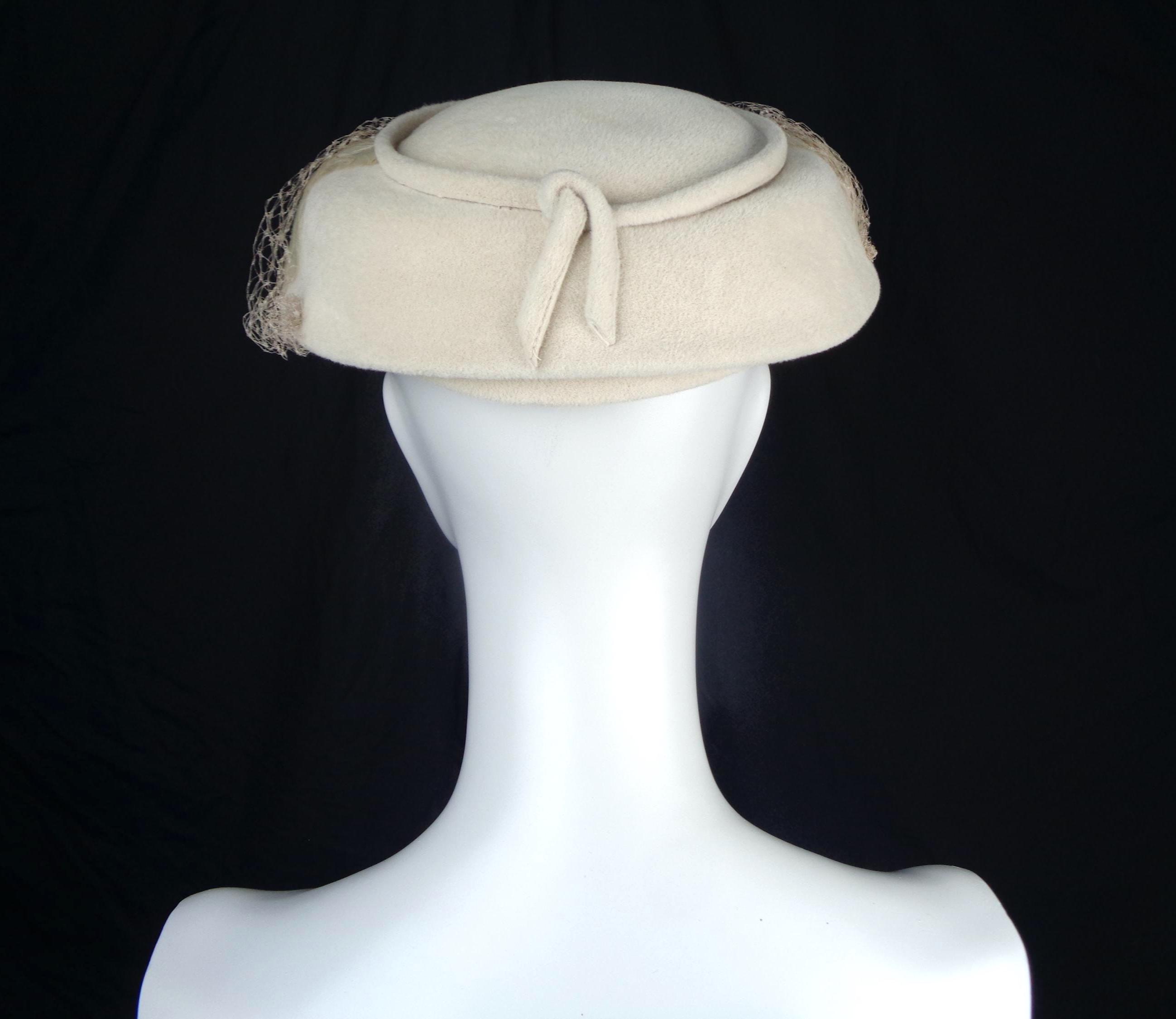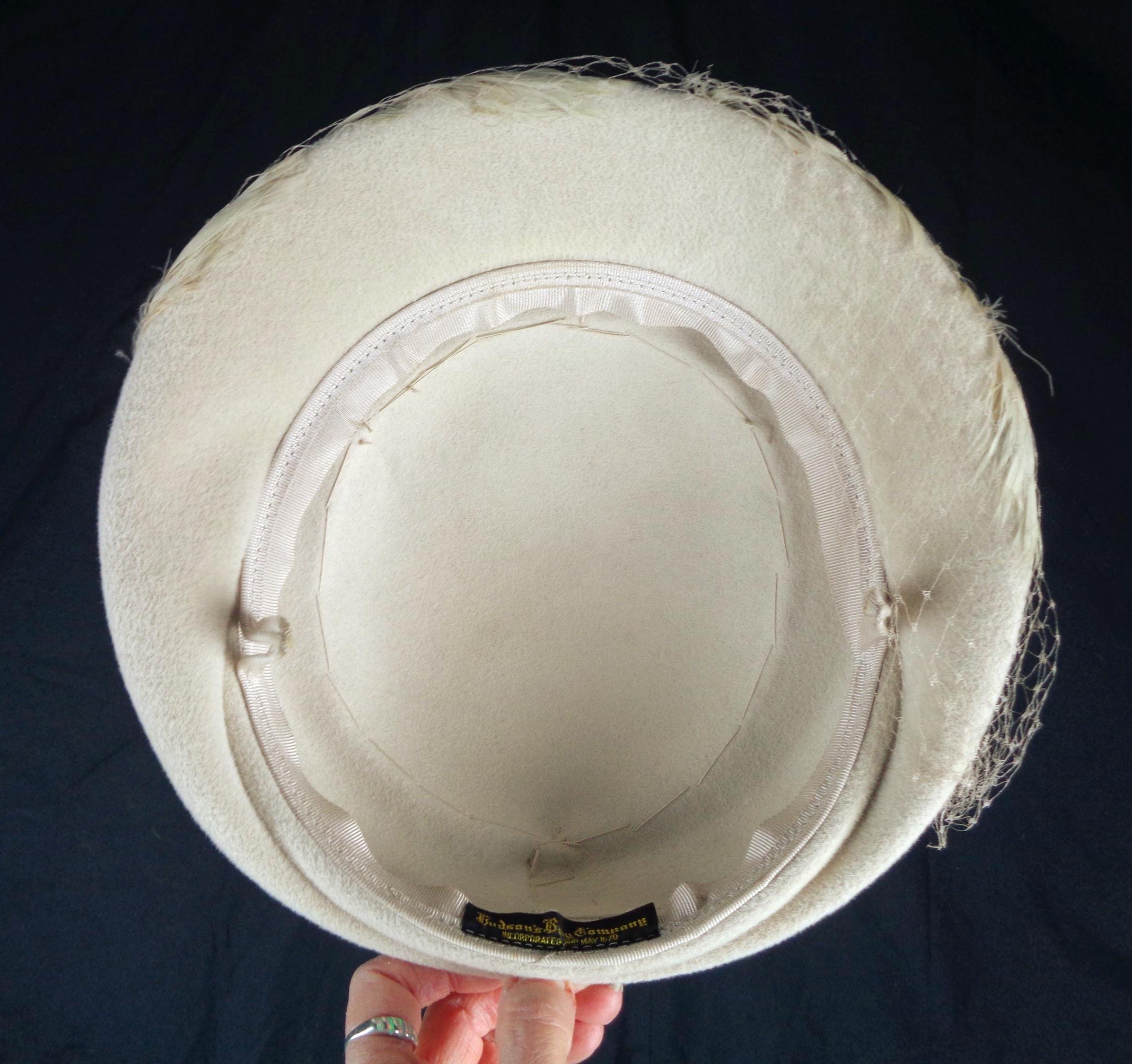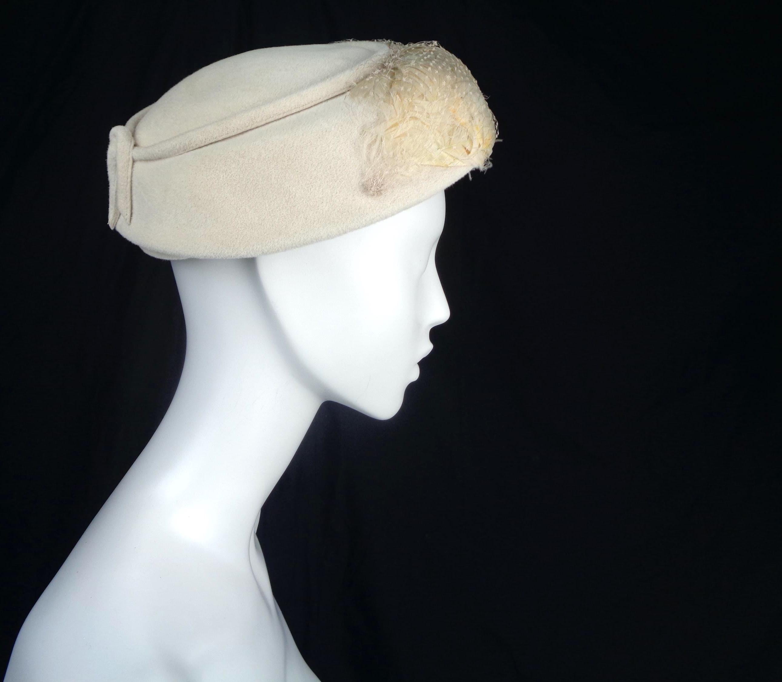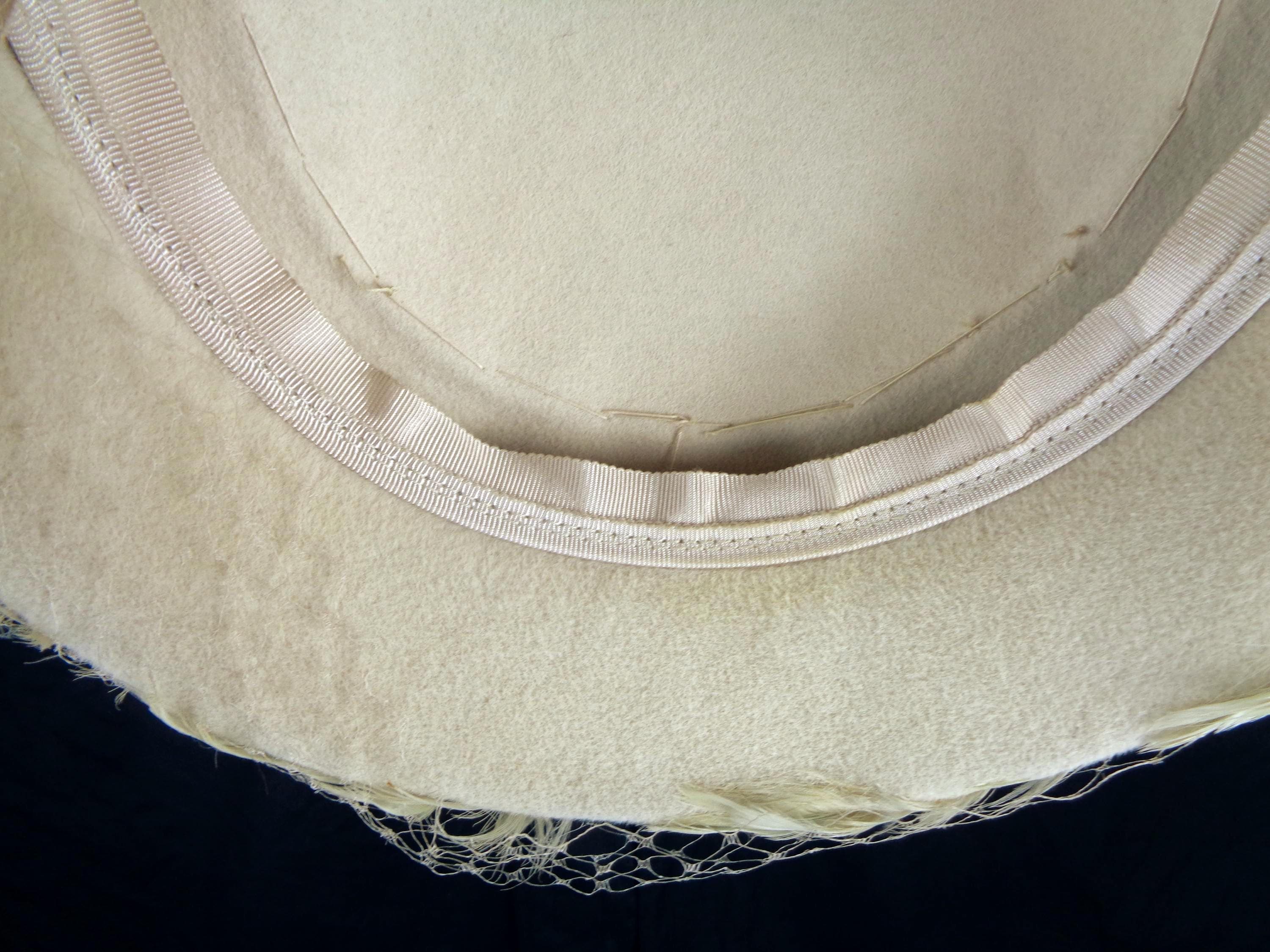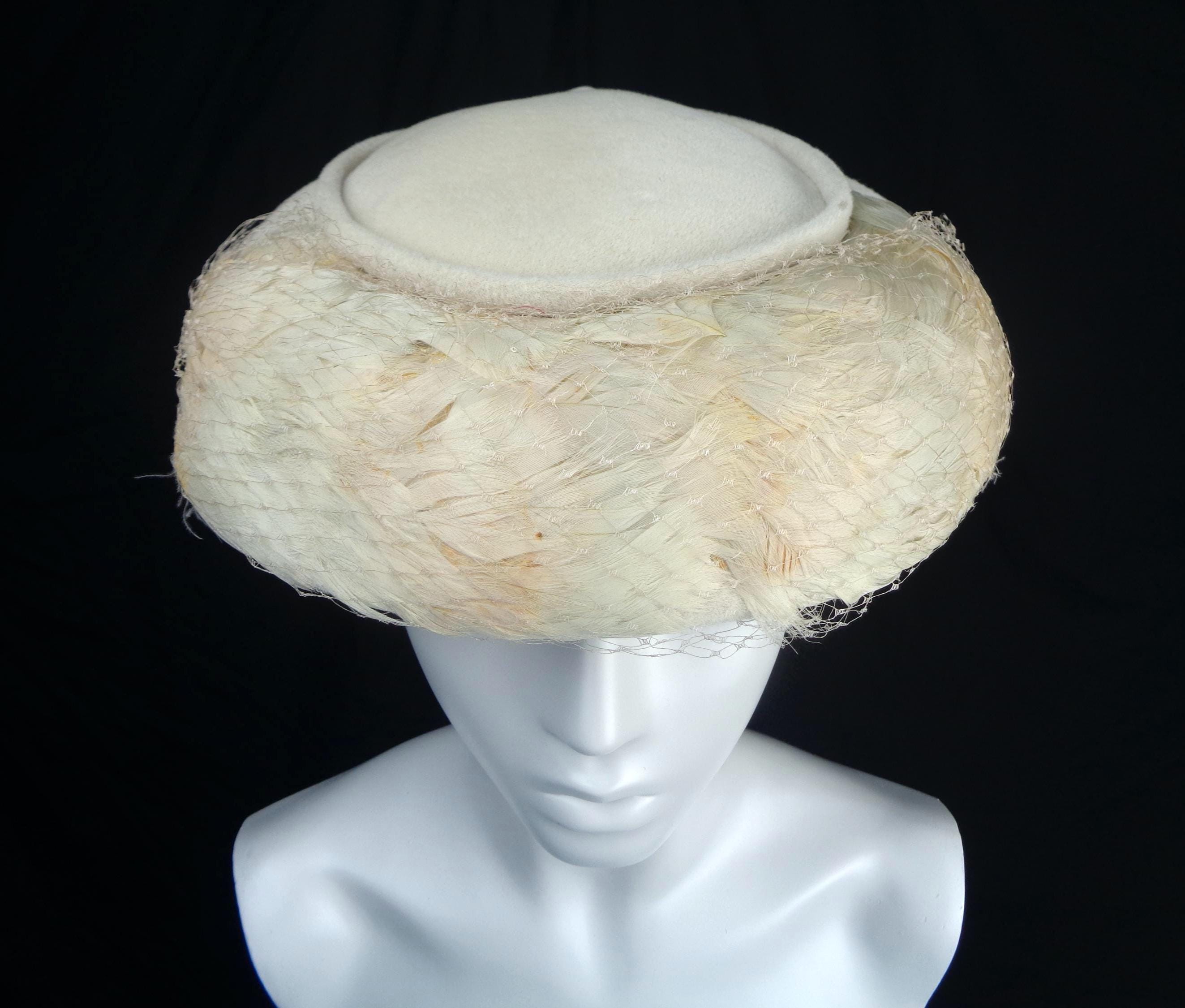 Features front feather gathered together, set in a veil secure to the hat, a piping detail on the top, a double layered back, with 2 covered adjustable wire spokes, with soft material throughout! Great compliment piece!