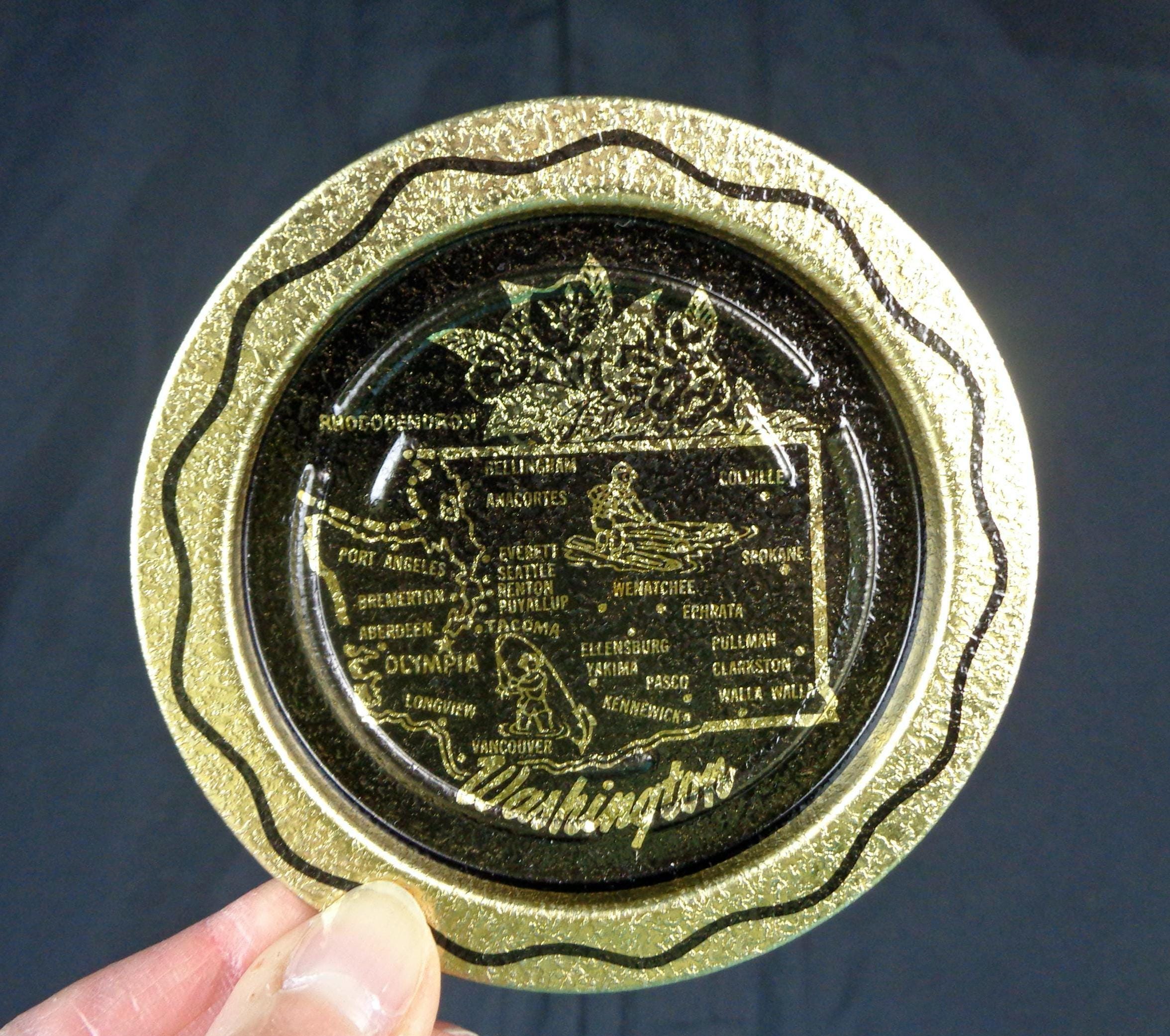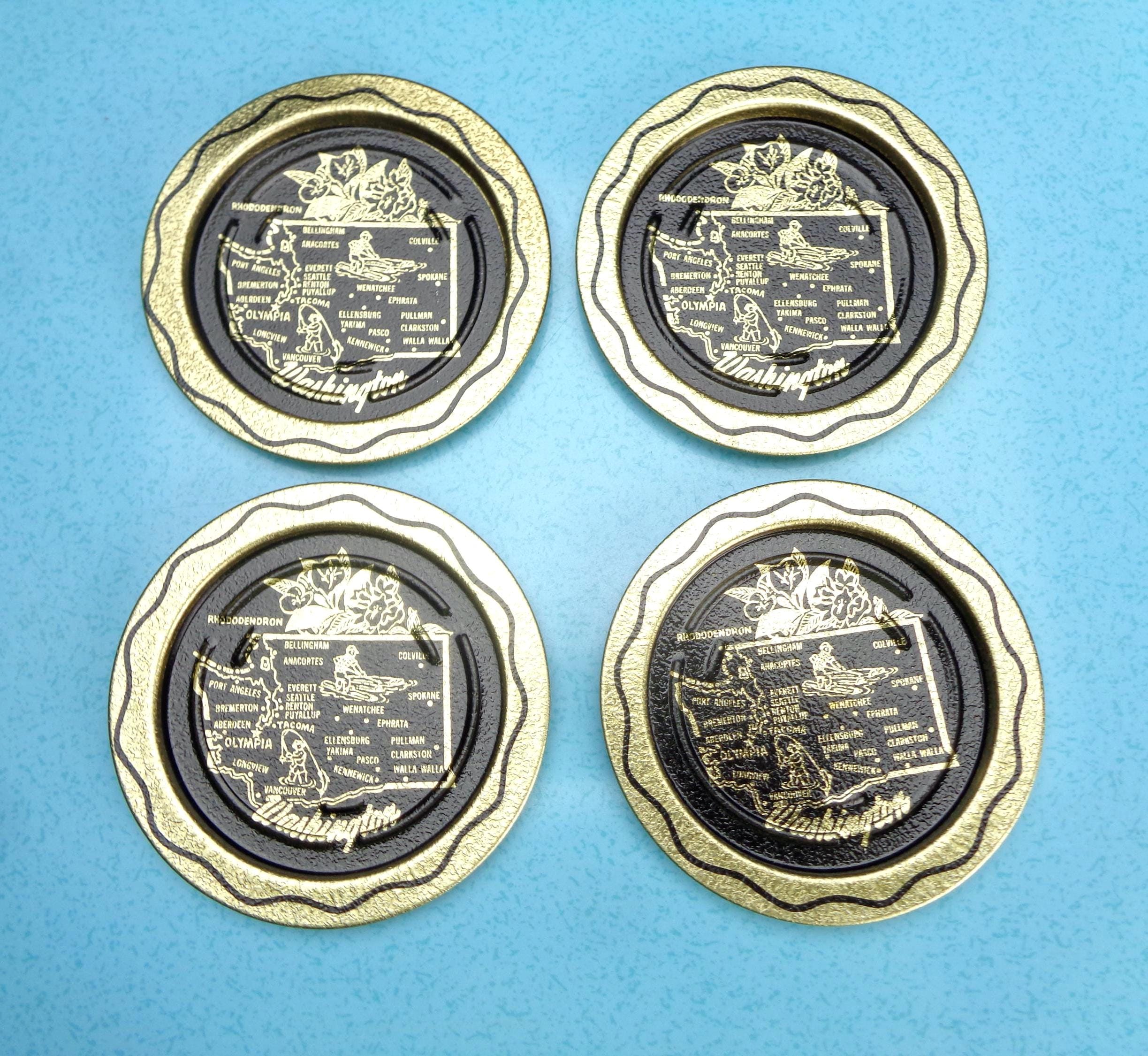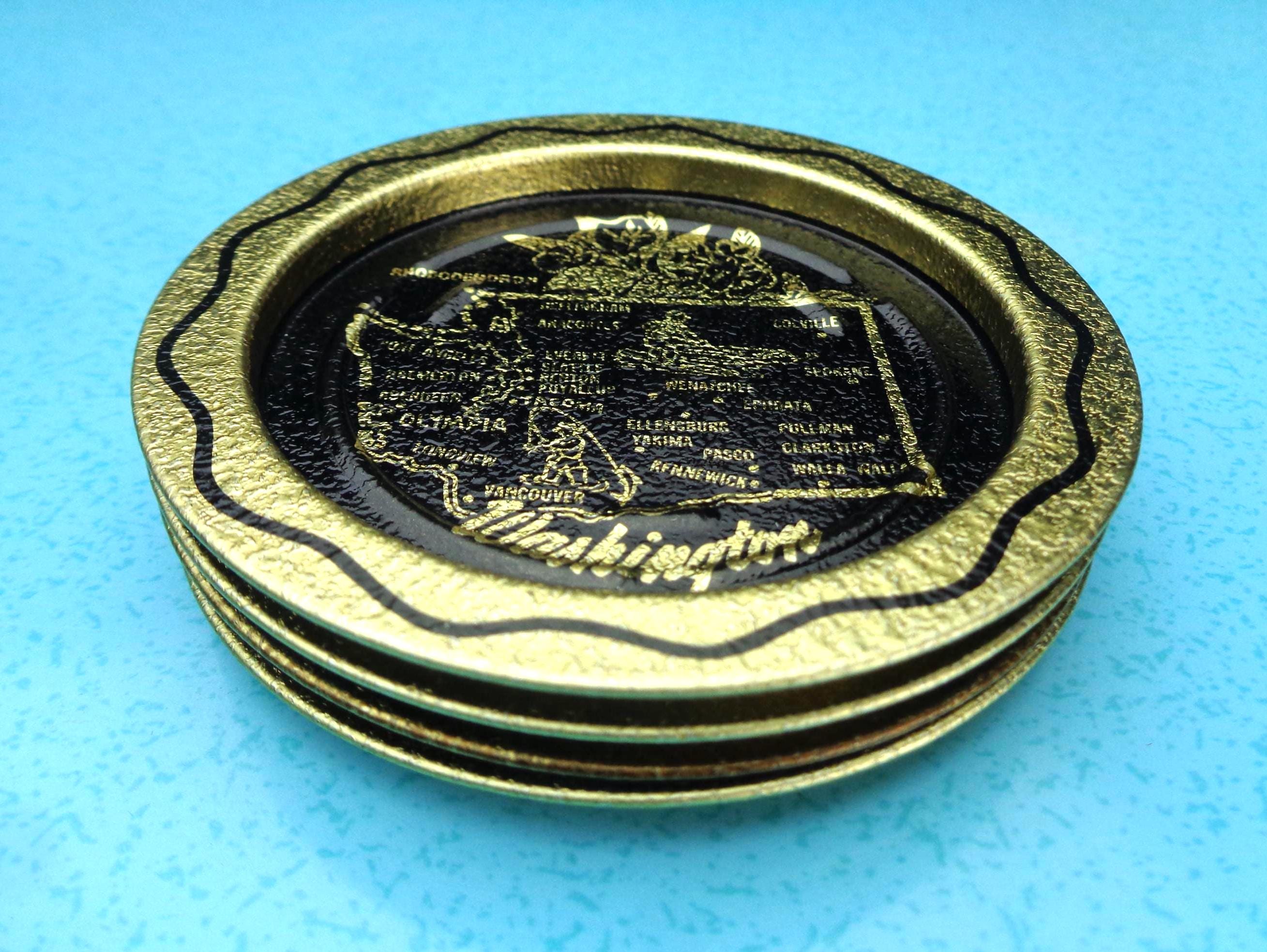 Features a set of 4 coasters that are decorated with a wavy edges, with a map shape of city's and capital of Washington, with the state flowers all on each plate coaster, with a glittery gold and enamel finish throughout!