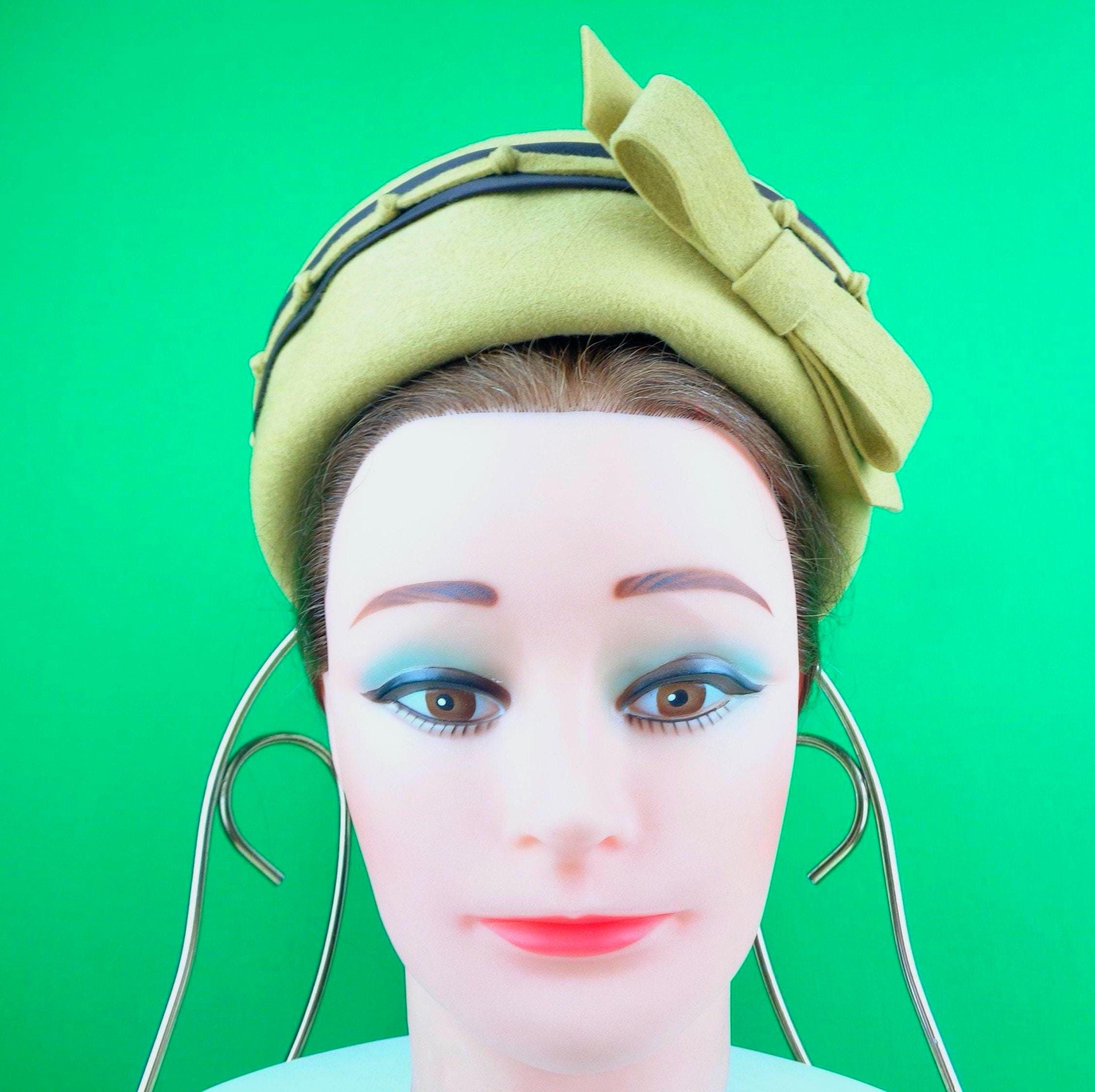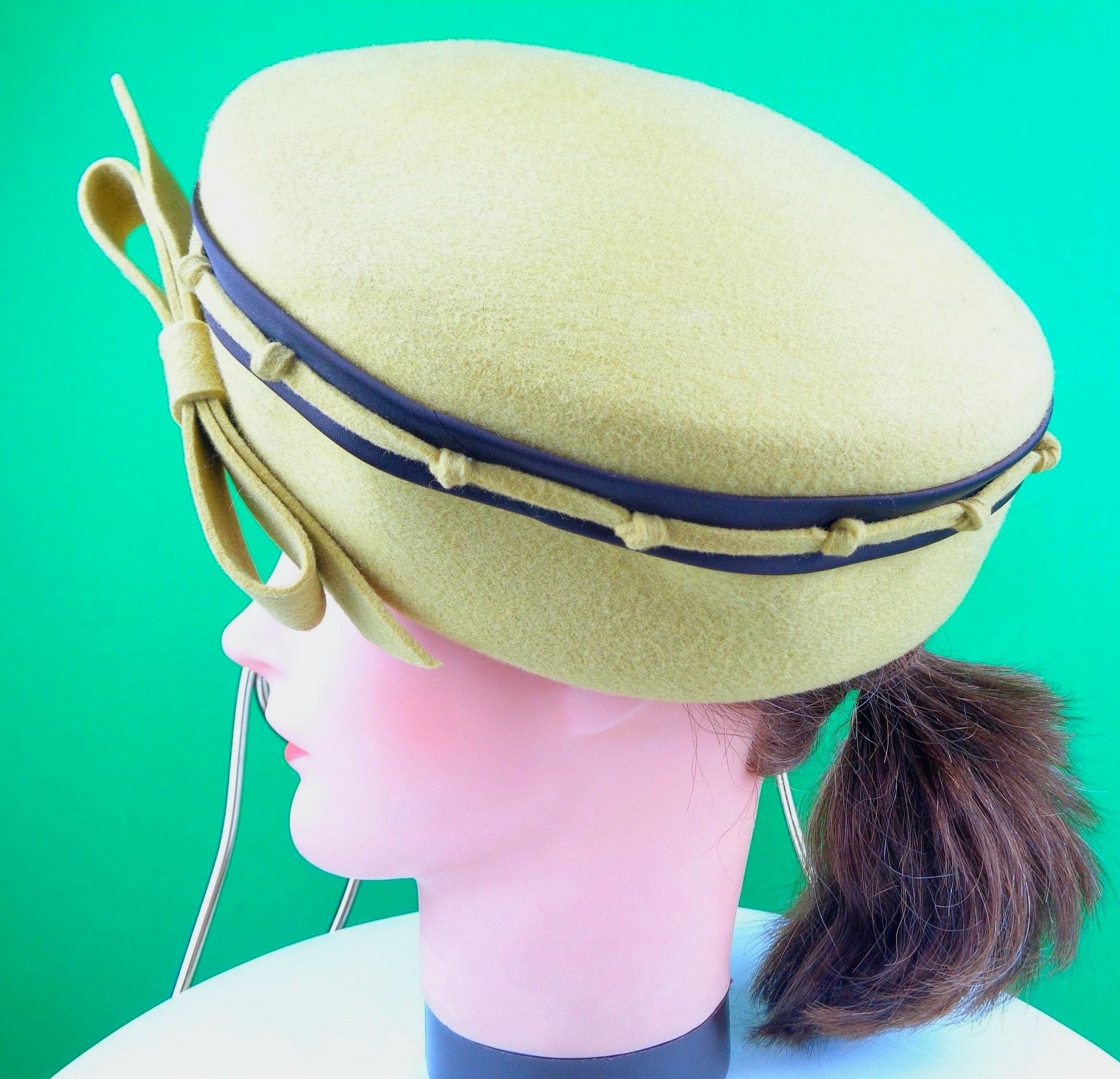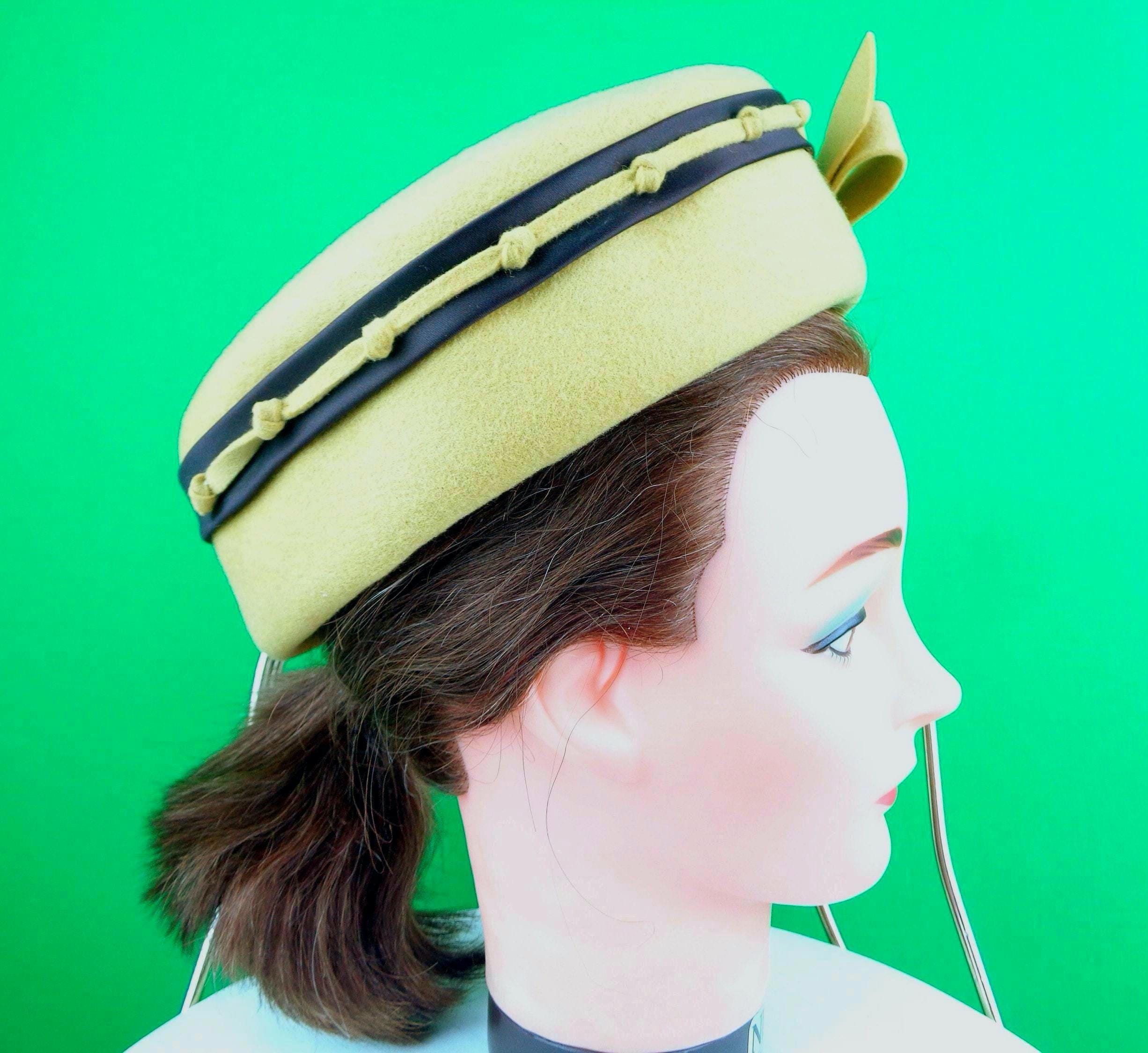 This lovely stylish 1940s 50s retro pillbox capulet cap top hat. Features a nicely crafted knotting satin band around the top edge, with a matching angle front bow, with soft material throughout! Great compliment piece!