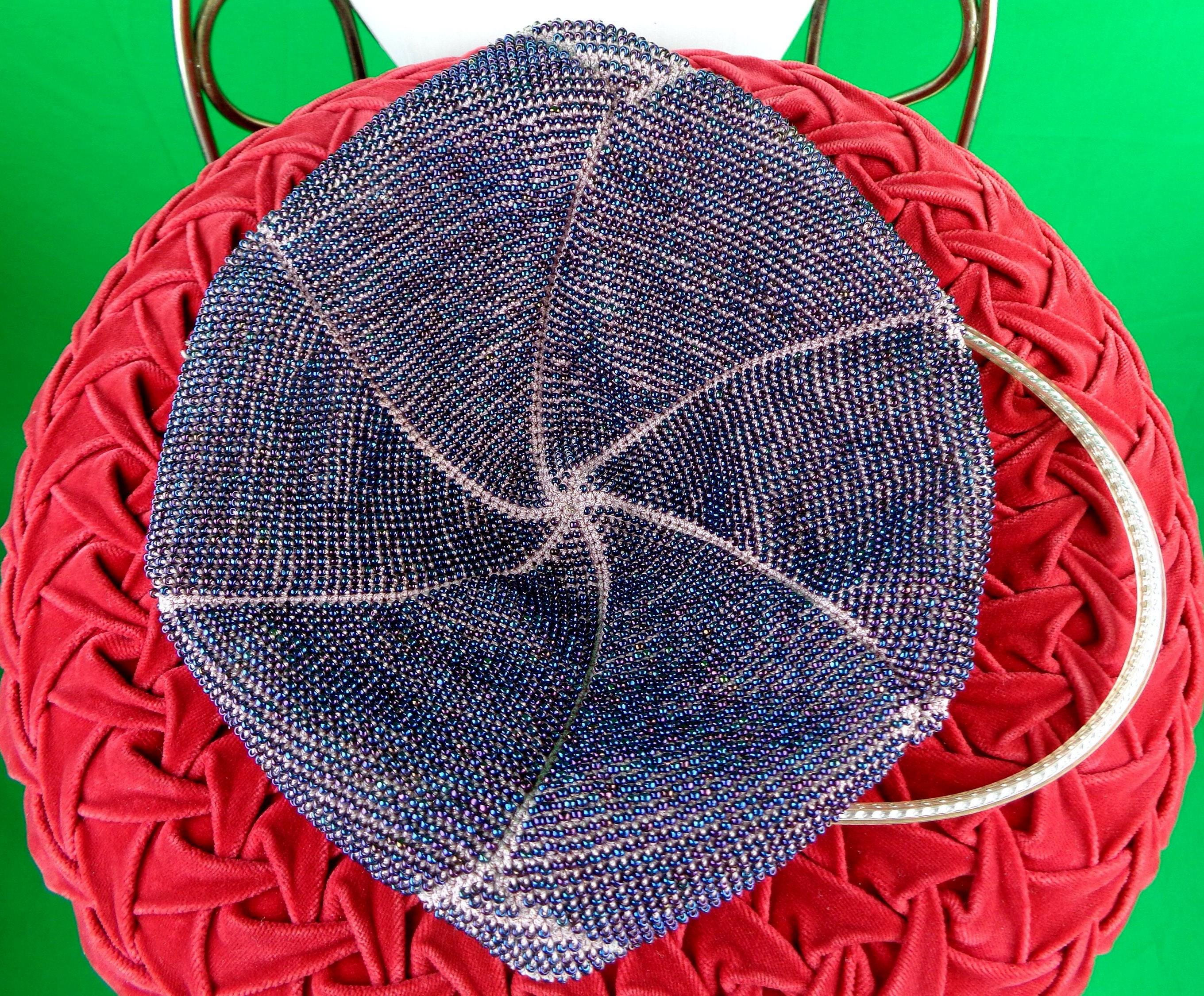 Features a top clear box handle incased chain inside, with a faux pearl clasp kiss tear drop closure, a nicely handcrafted swirl star design, pattern on the bottom, with a thick stitching layering of beading and material combined throughout! Great compliment piece!