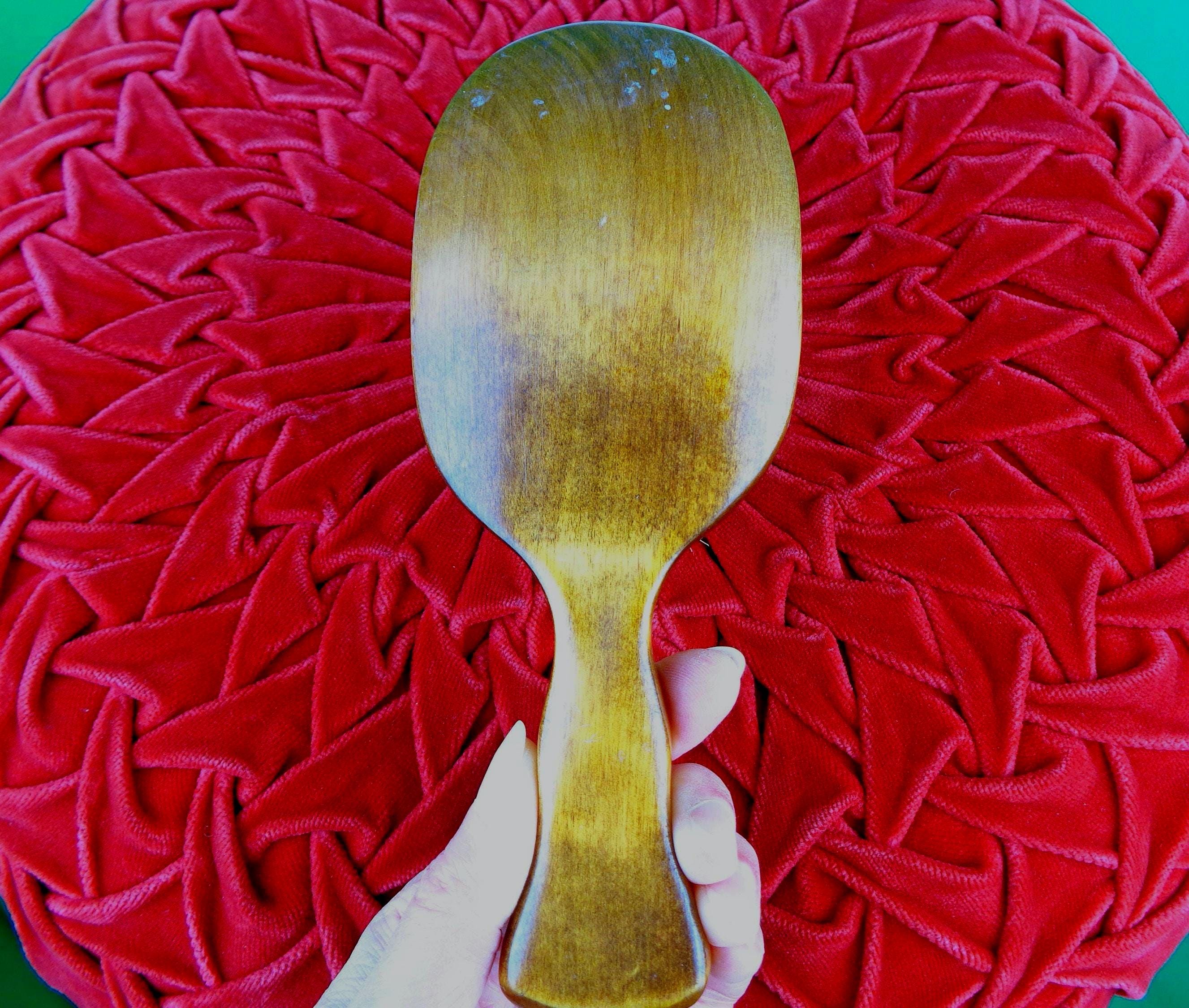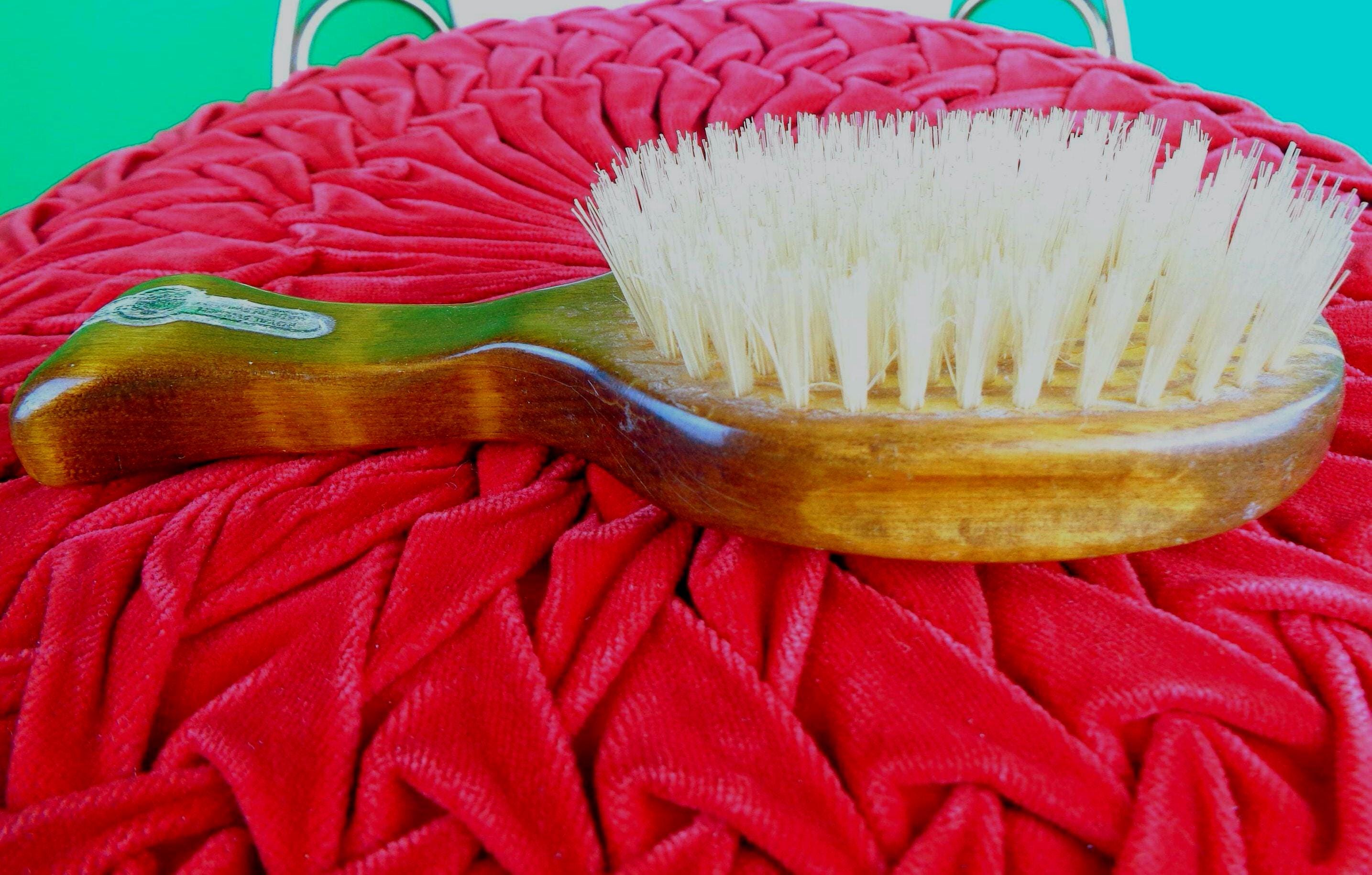Brown brush has a wavy thick wooden handle and top horse bristles, with worn factory tag.