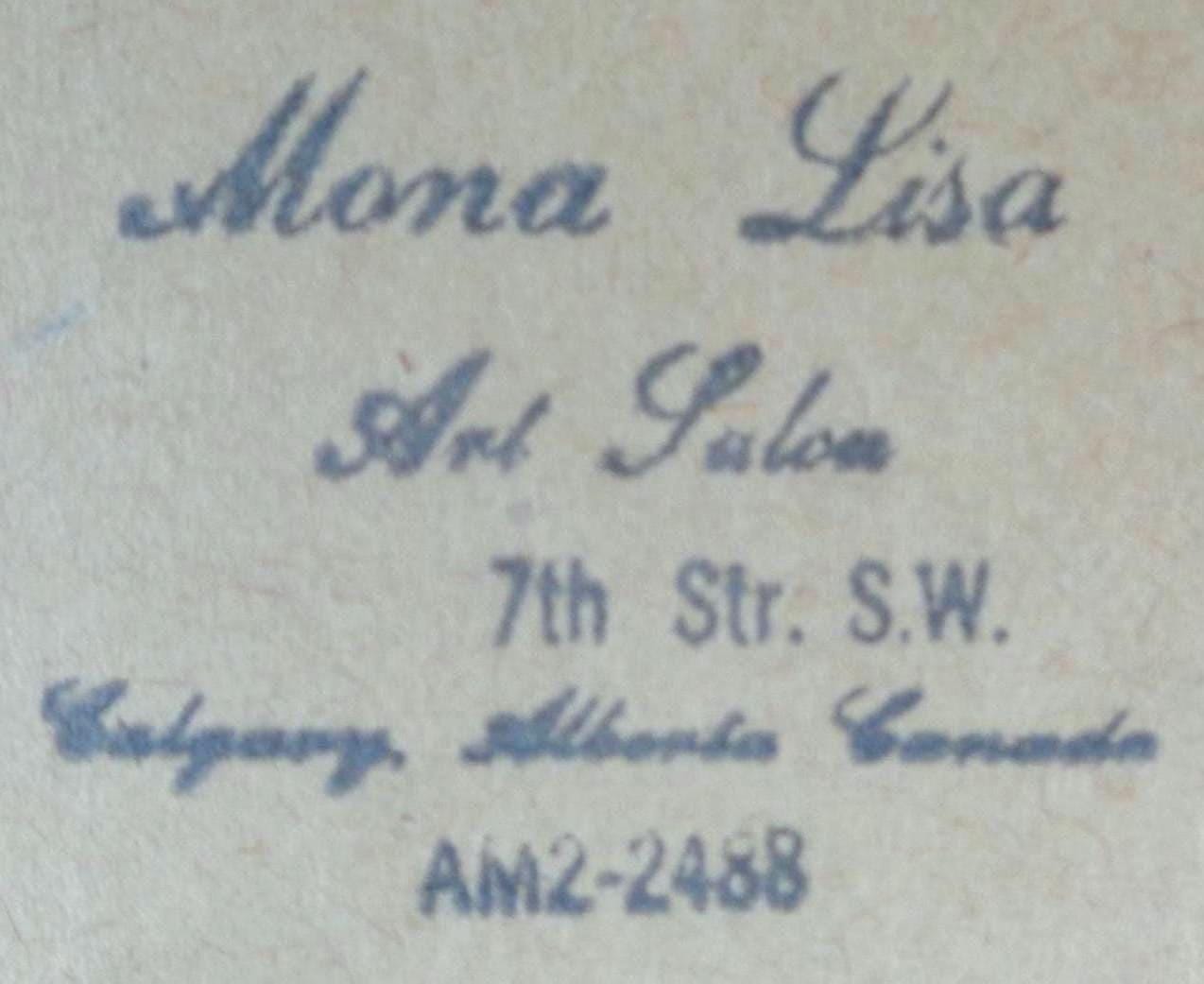 Maker, Brandname, Label, Origin, Region: Mona Lisa Art Salon Calgary Alberta Canada where this picture was framed.