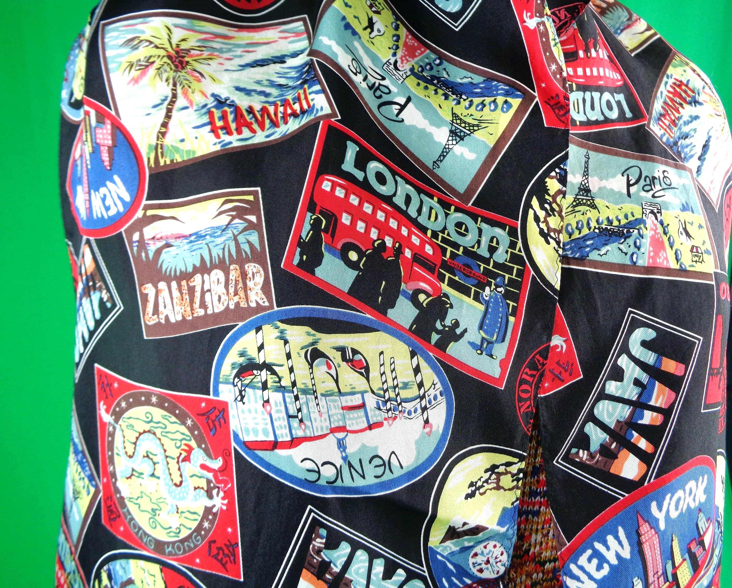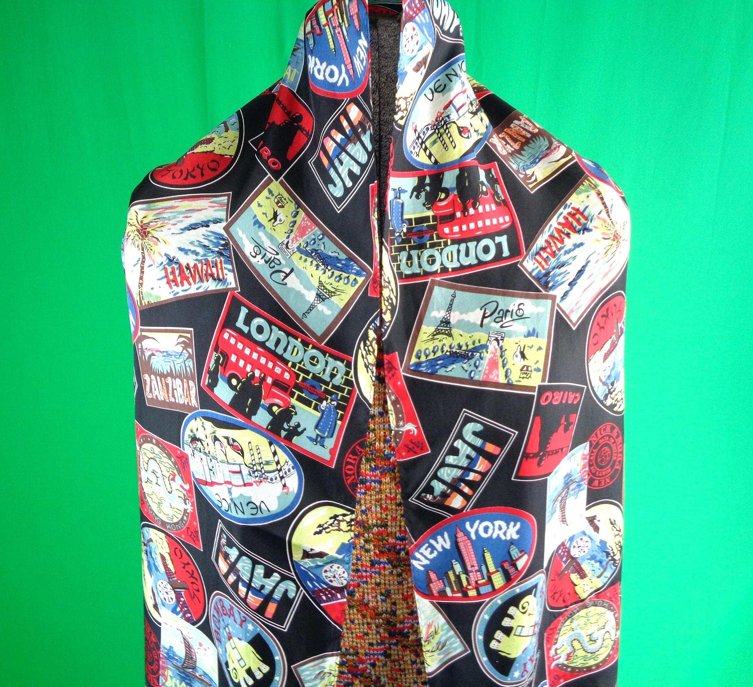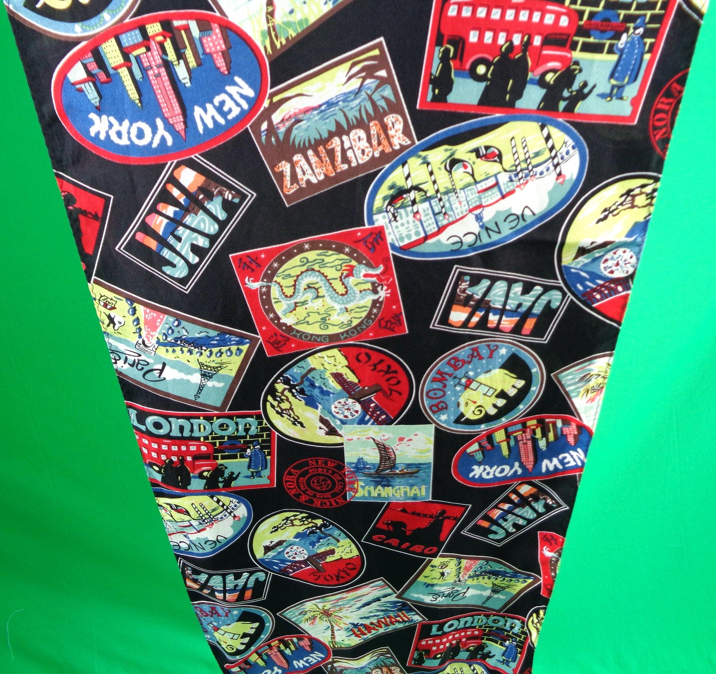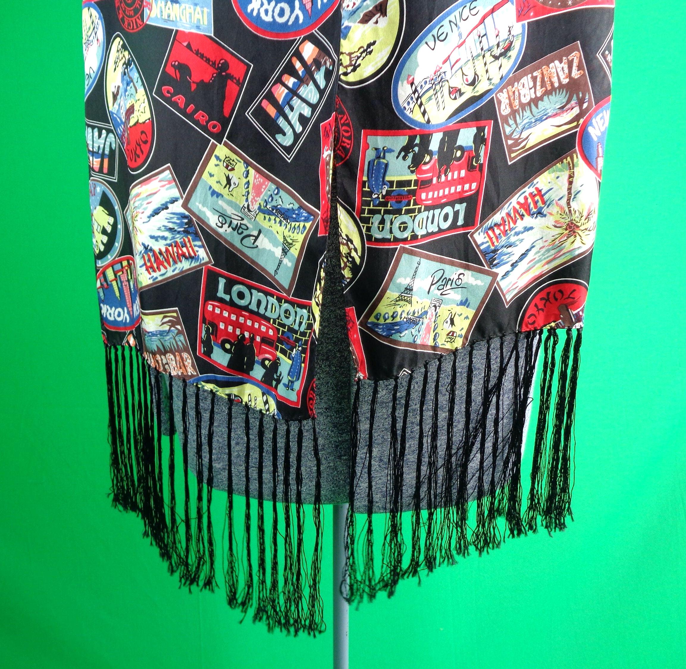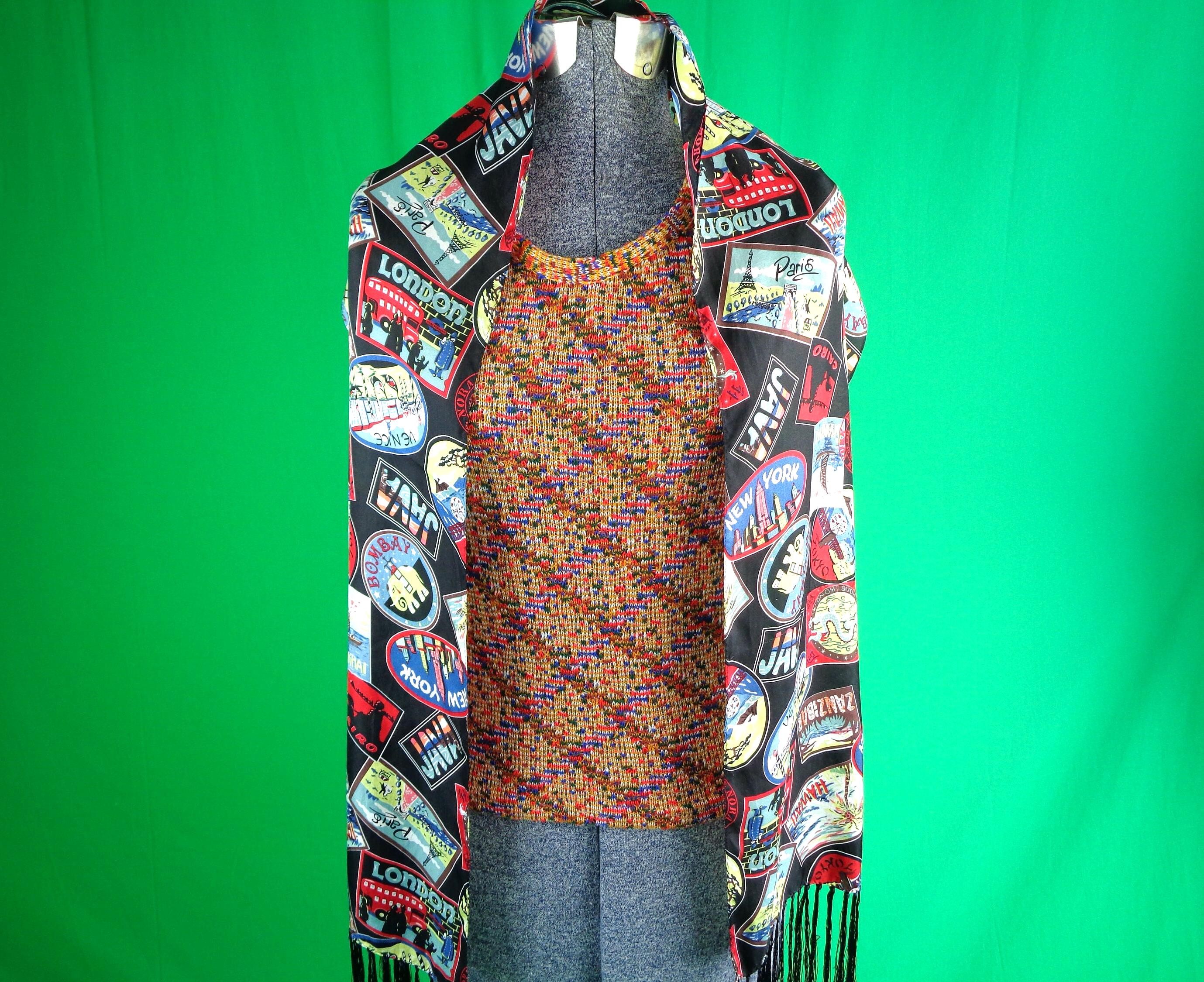 This lovely unique vibrant scarf, wrap, shawl. Features a multitude of countries around the world in a collage, print form of travel cards, with a long tassel fringed edges and ultra soft fabric, material throughout! Great compliment piece!