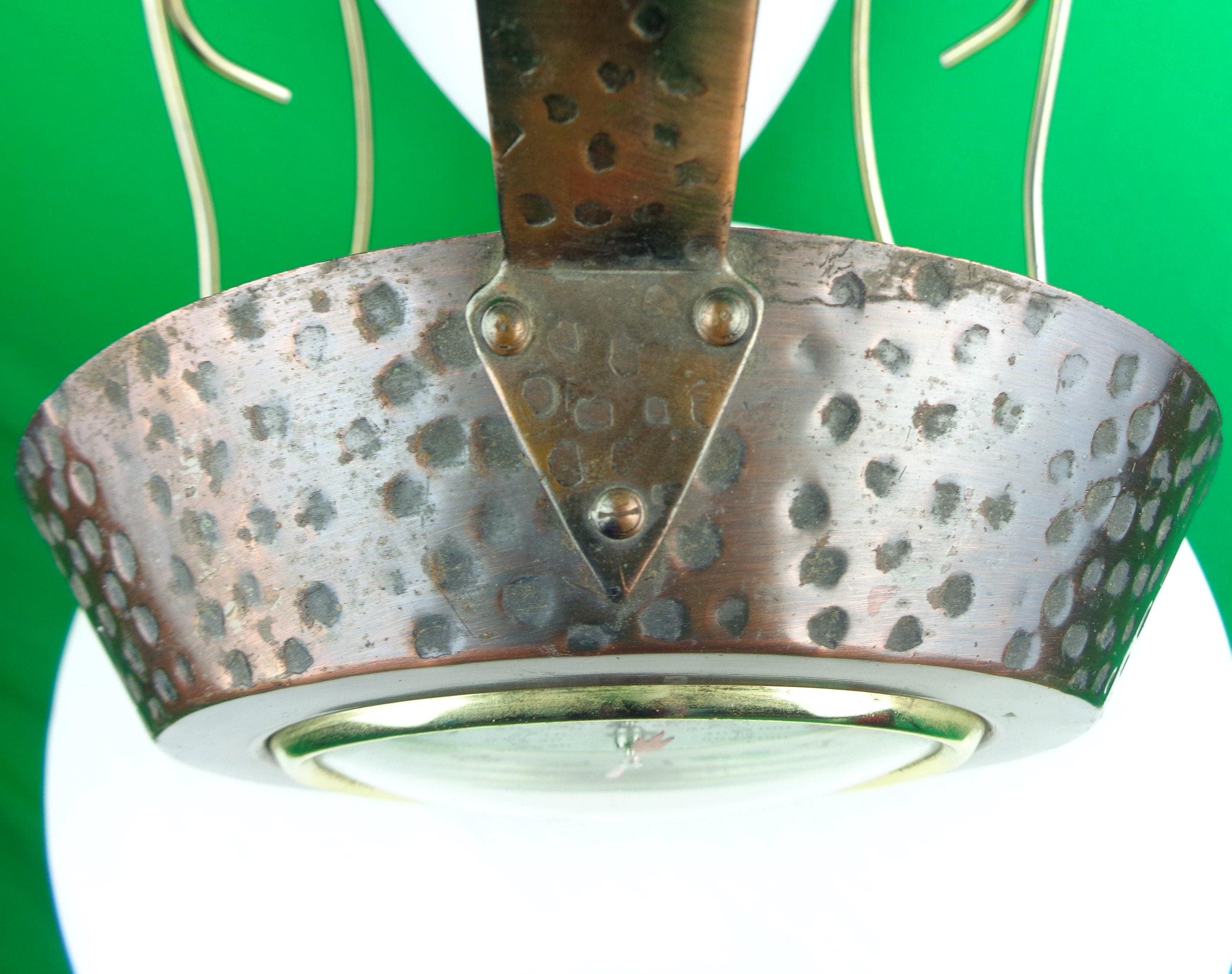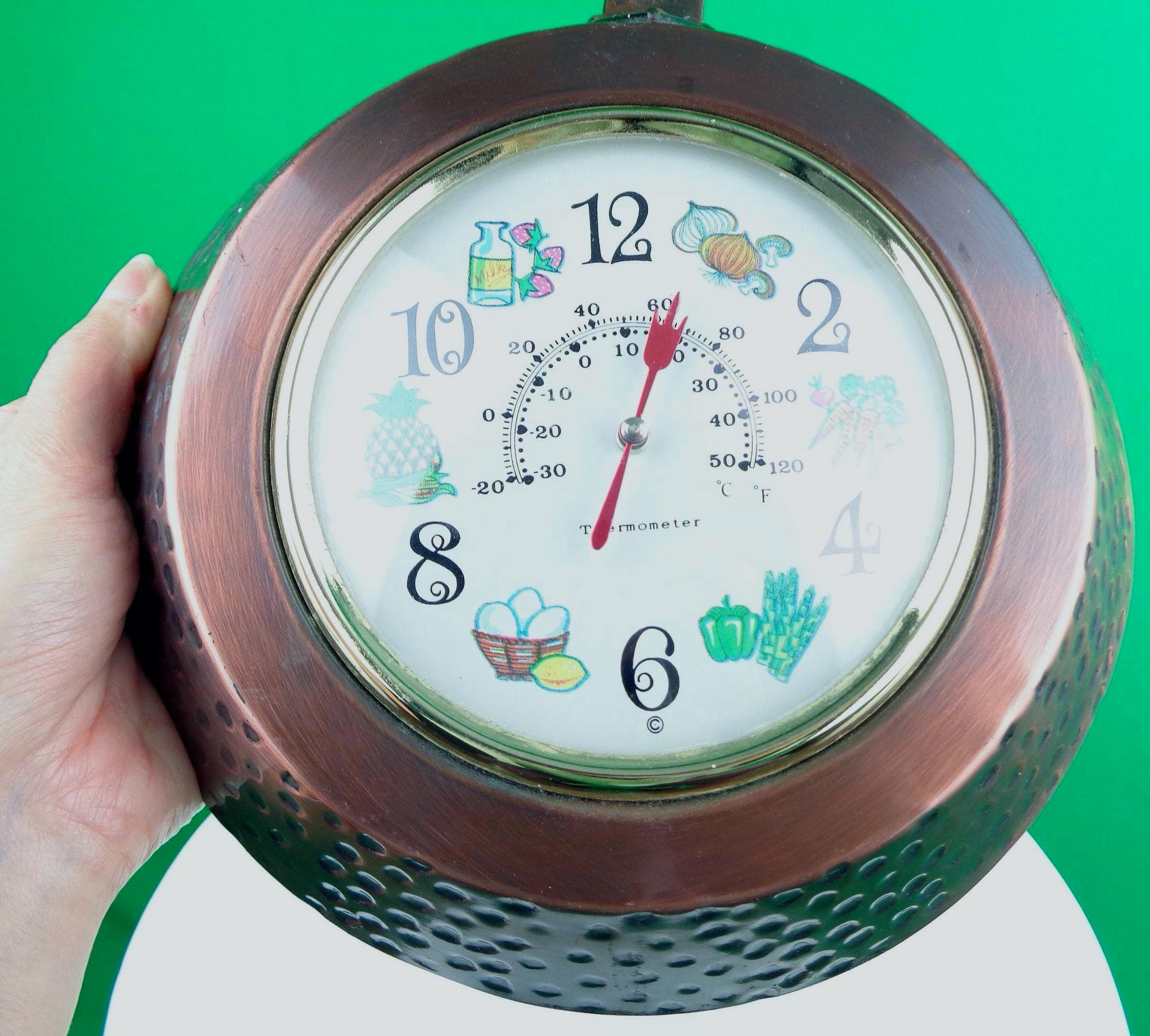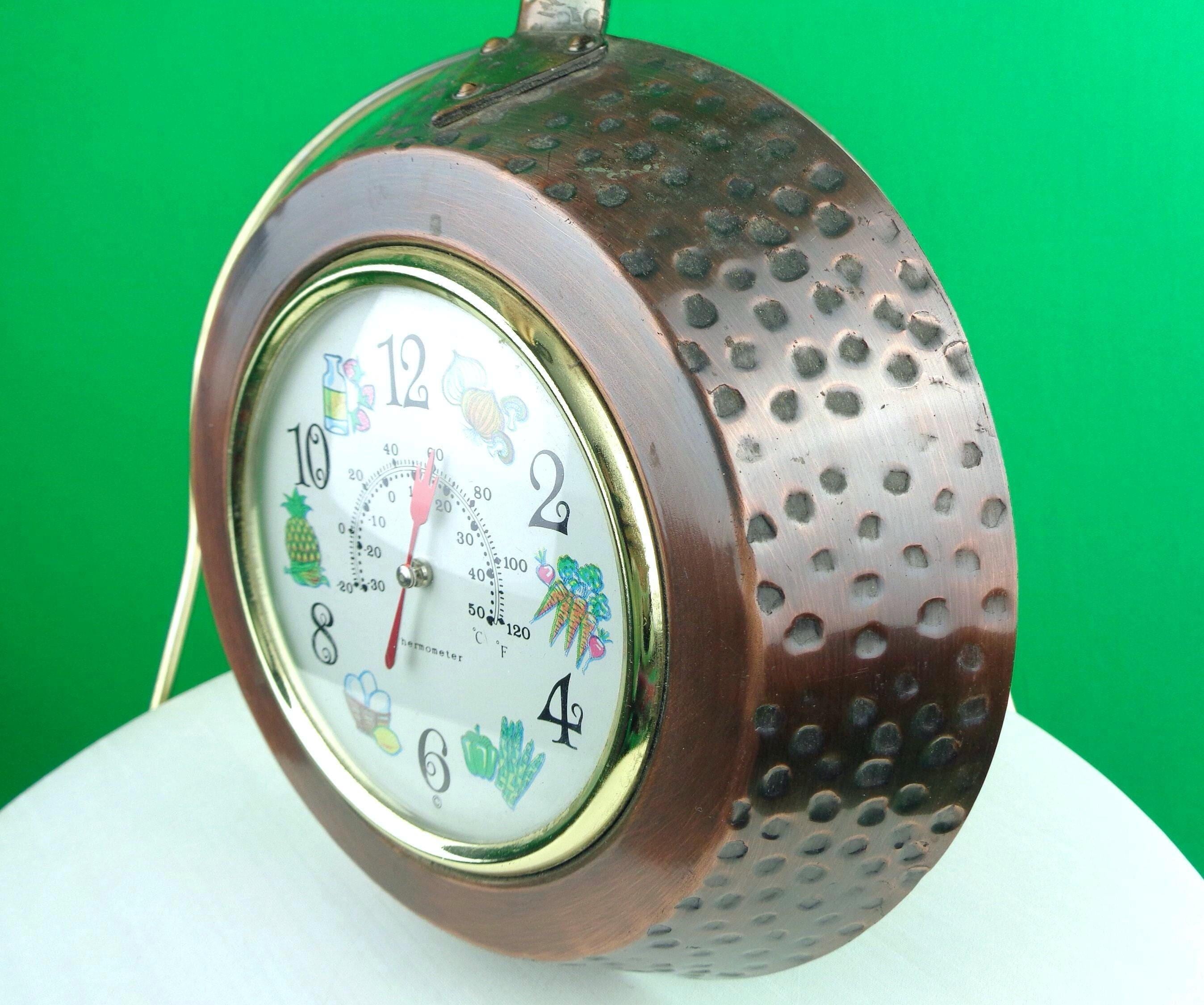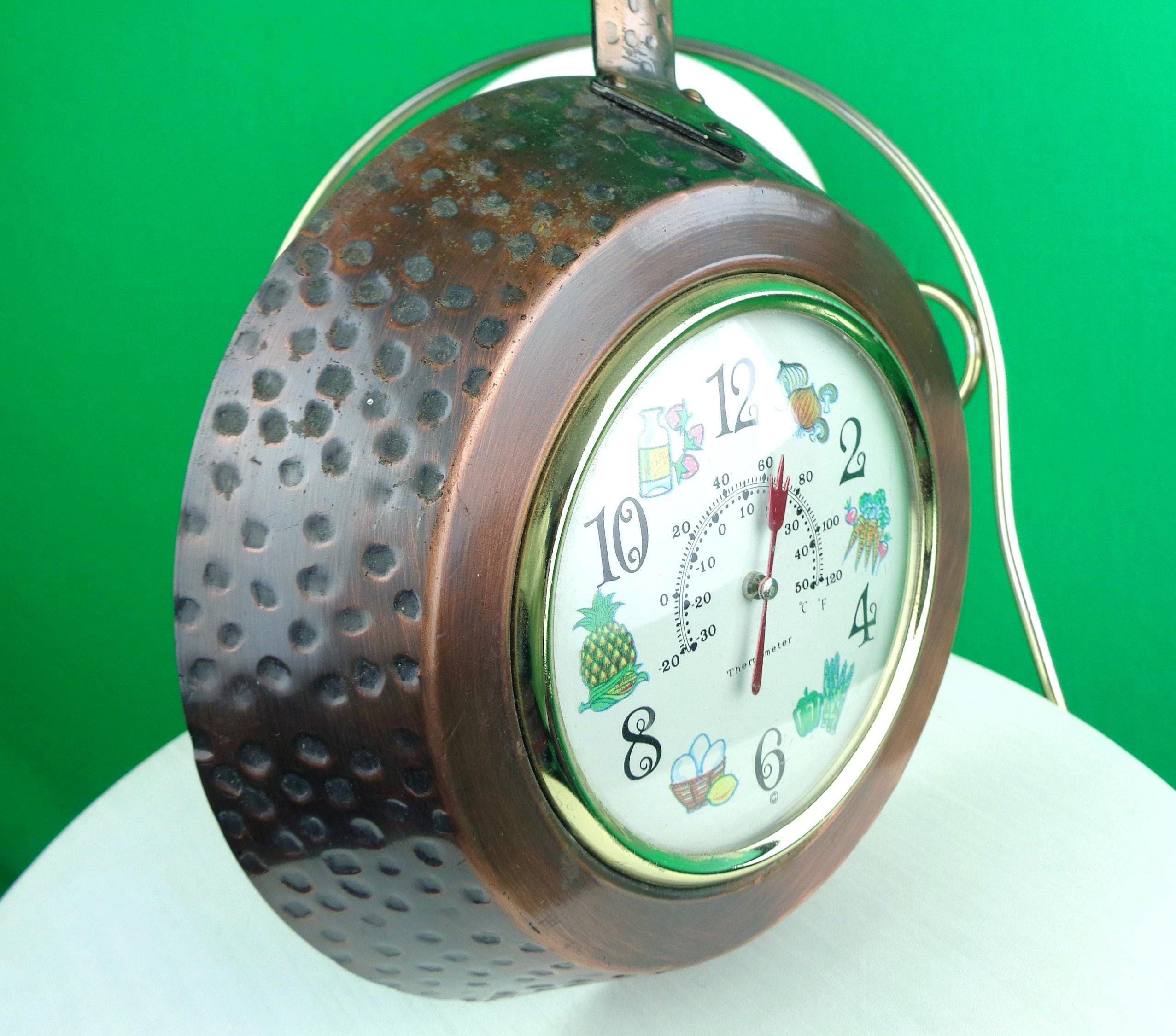 Features a rustic appeal, with a combination of a clock numbers, weather meter with colorful vegetables near and on the where a number would be on the hours, with a frying pan shape that has been artistically riveted on the sides, and carved handle! Great piece!
