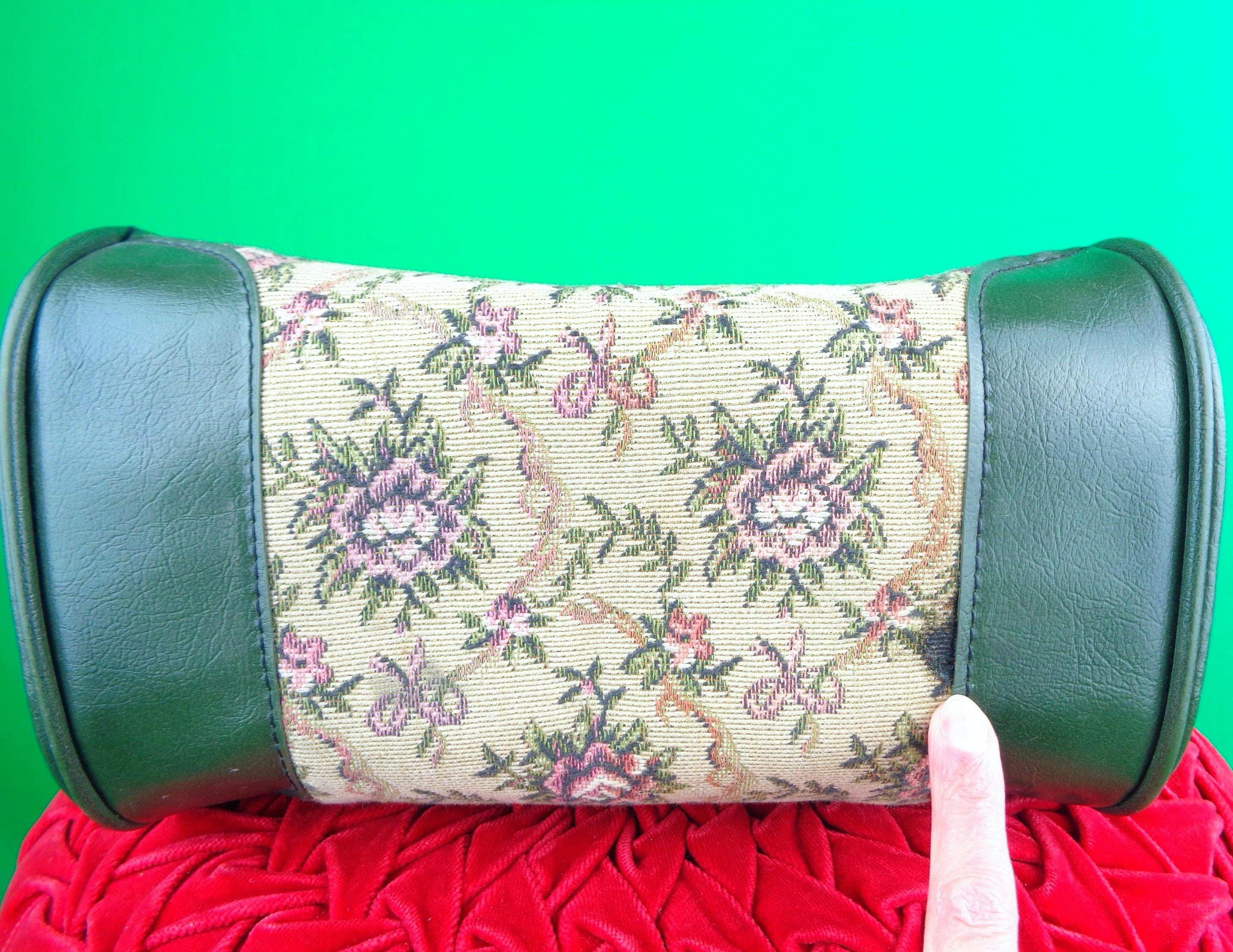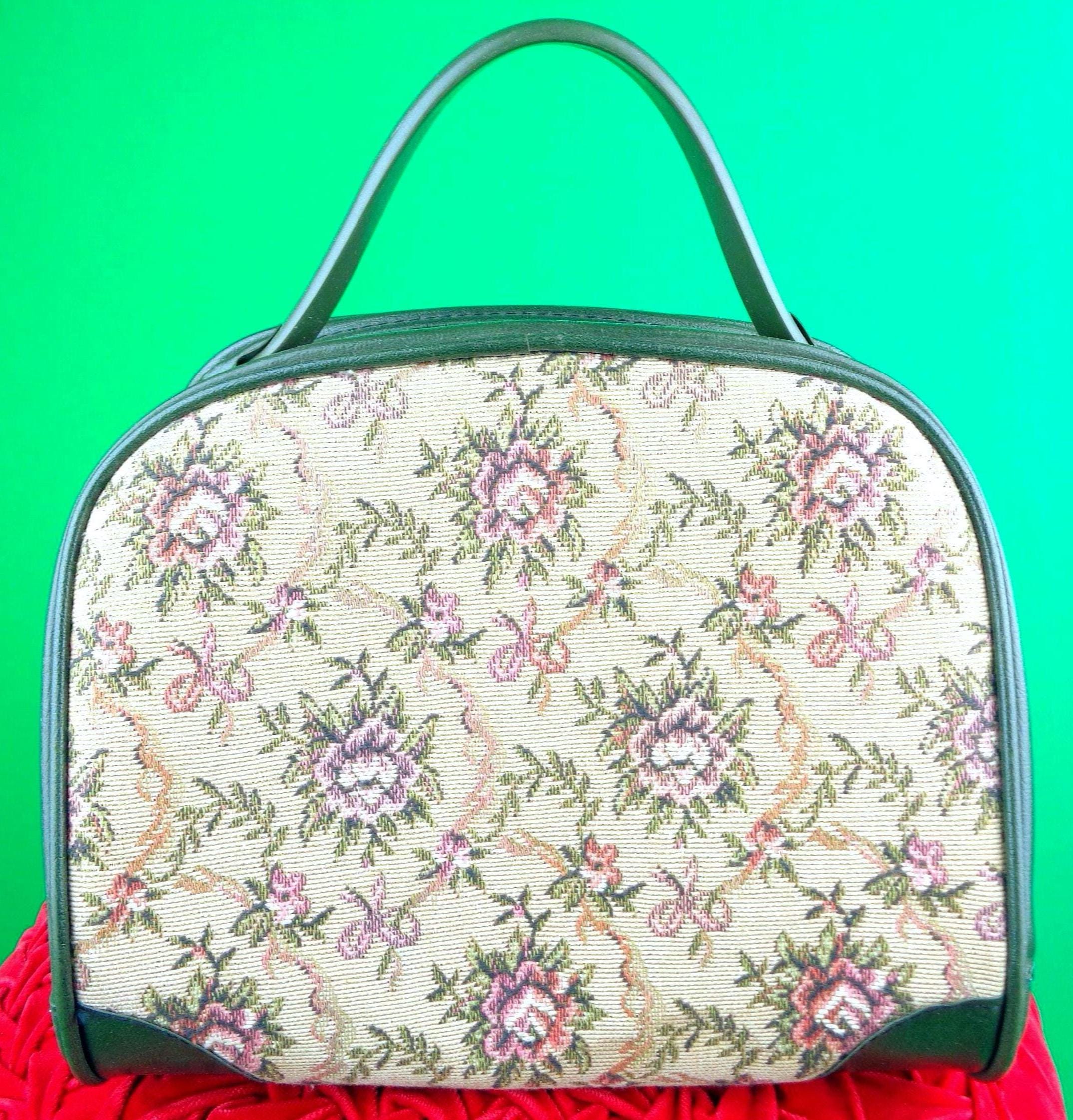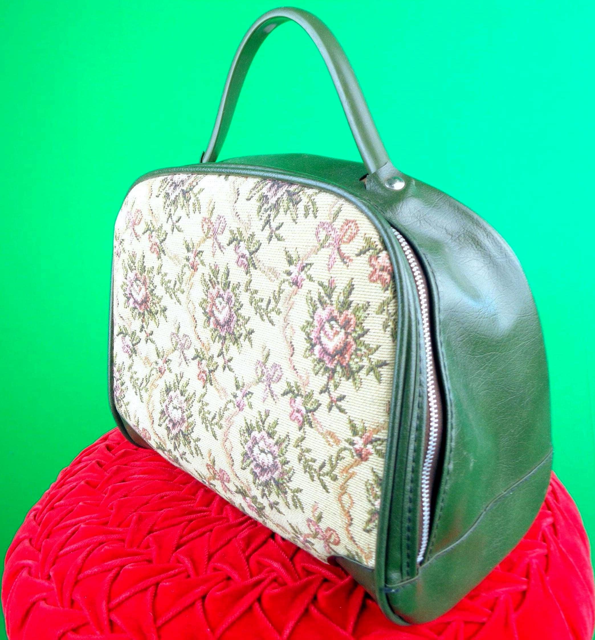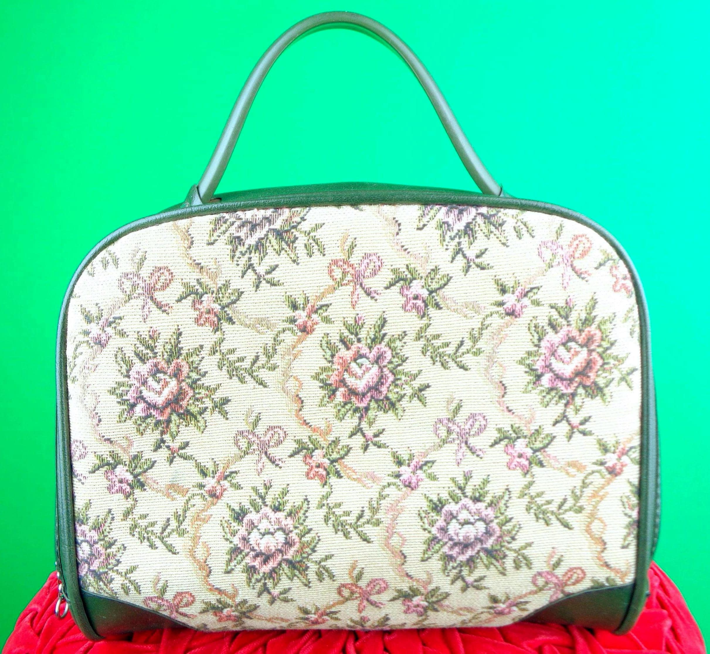 Features a top sturdy tube handle, with a side metal zip around zipper, with open storage compartment, with a combination of tapestry and vinyl throughout! Great compliment piece!