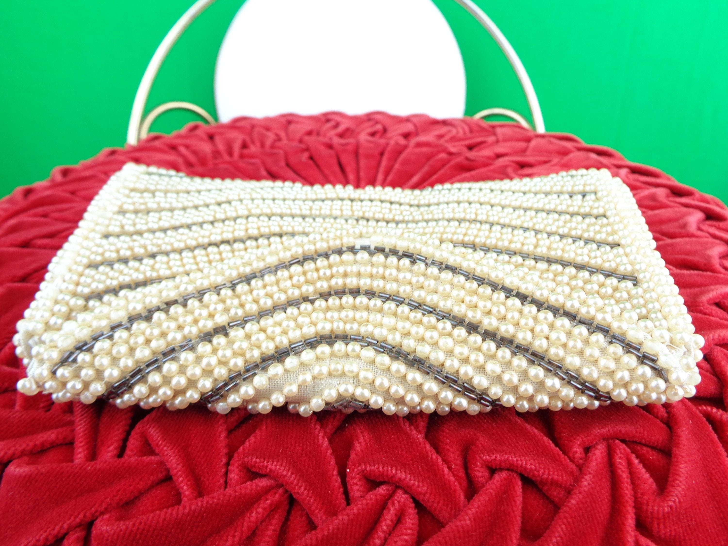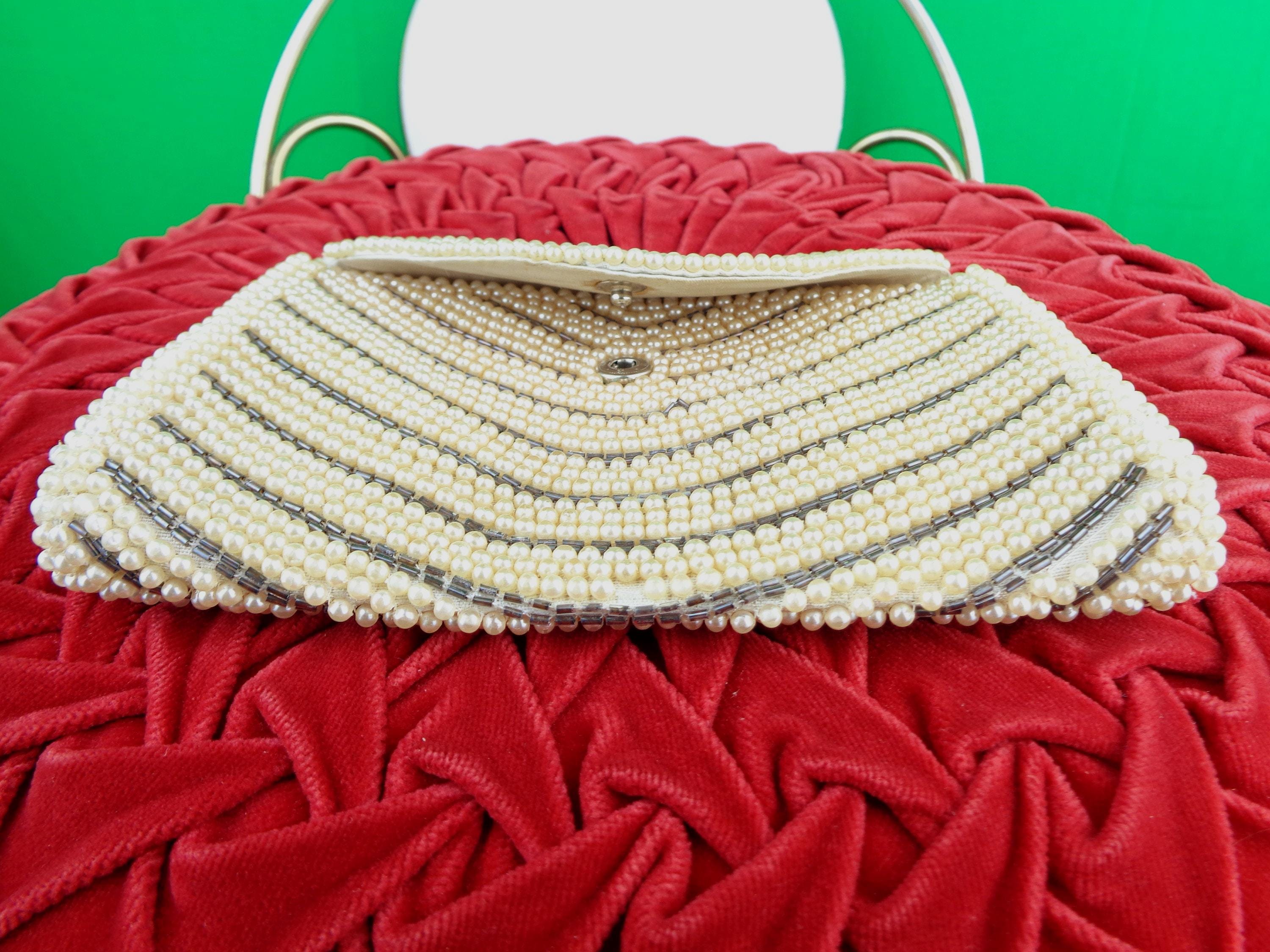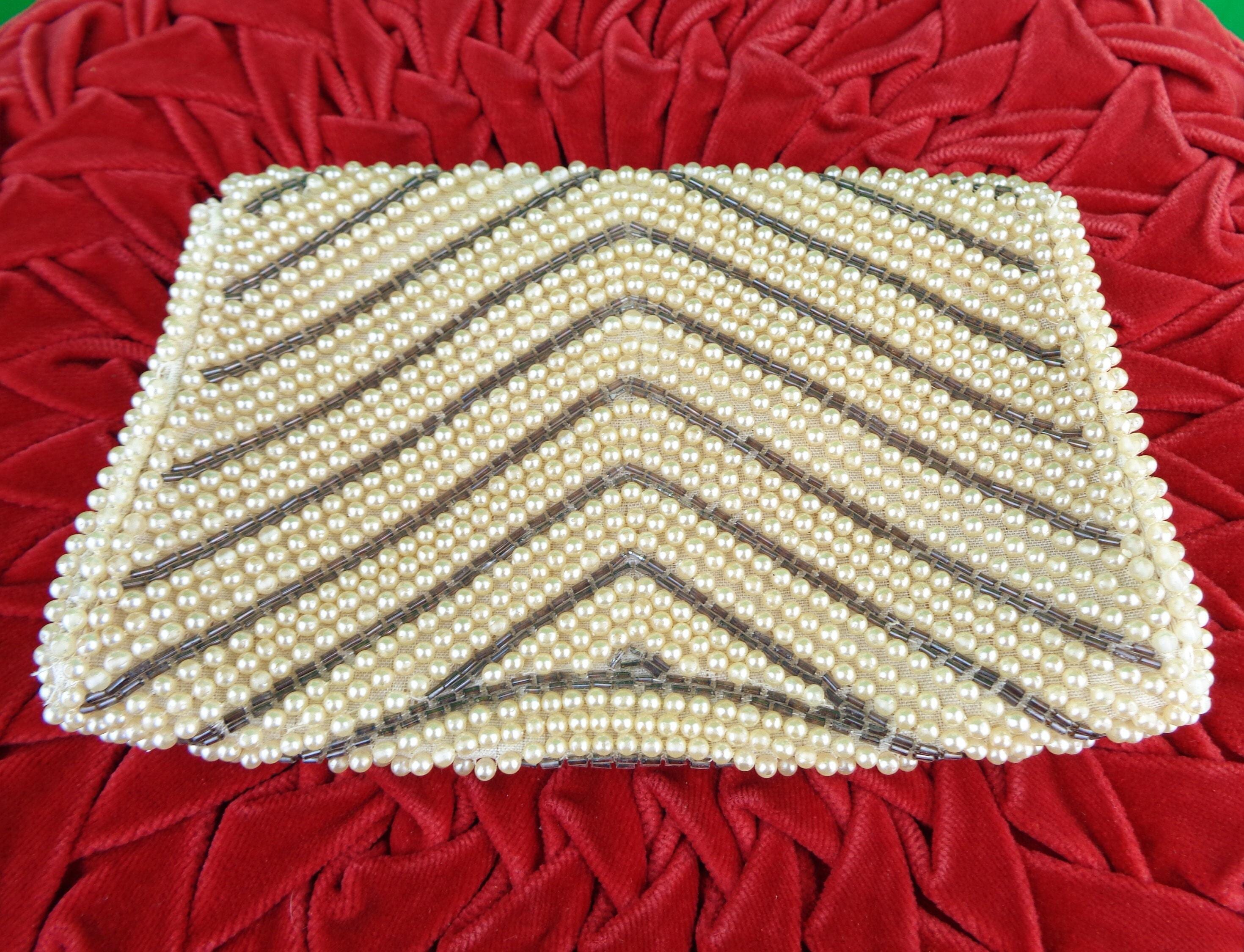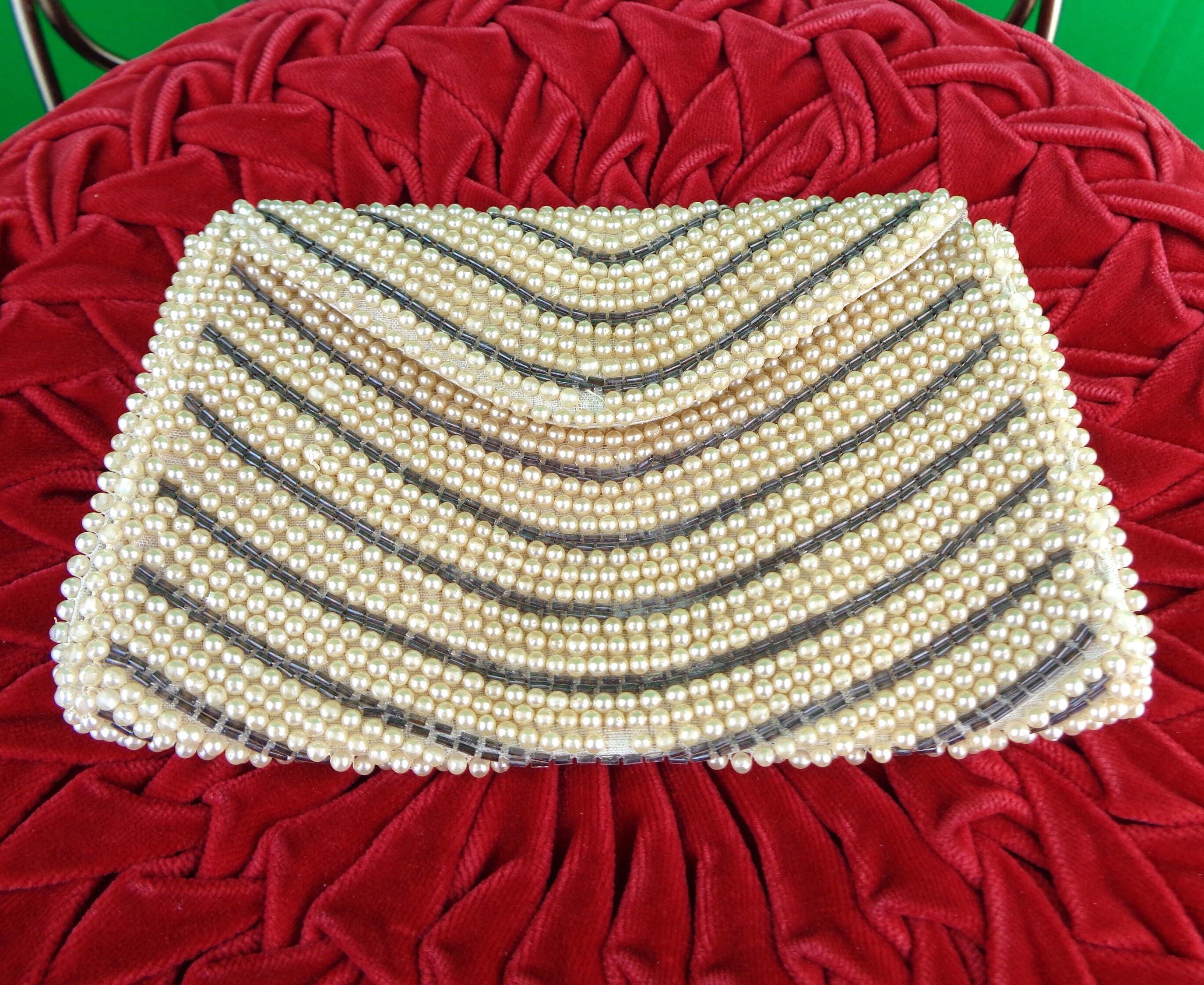 Features a combination of covered beads and faux pearls, with a liquid silky satin interior and front snap secure closure, with side panels! Great compliment piece!