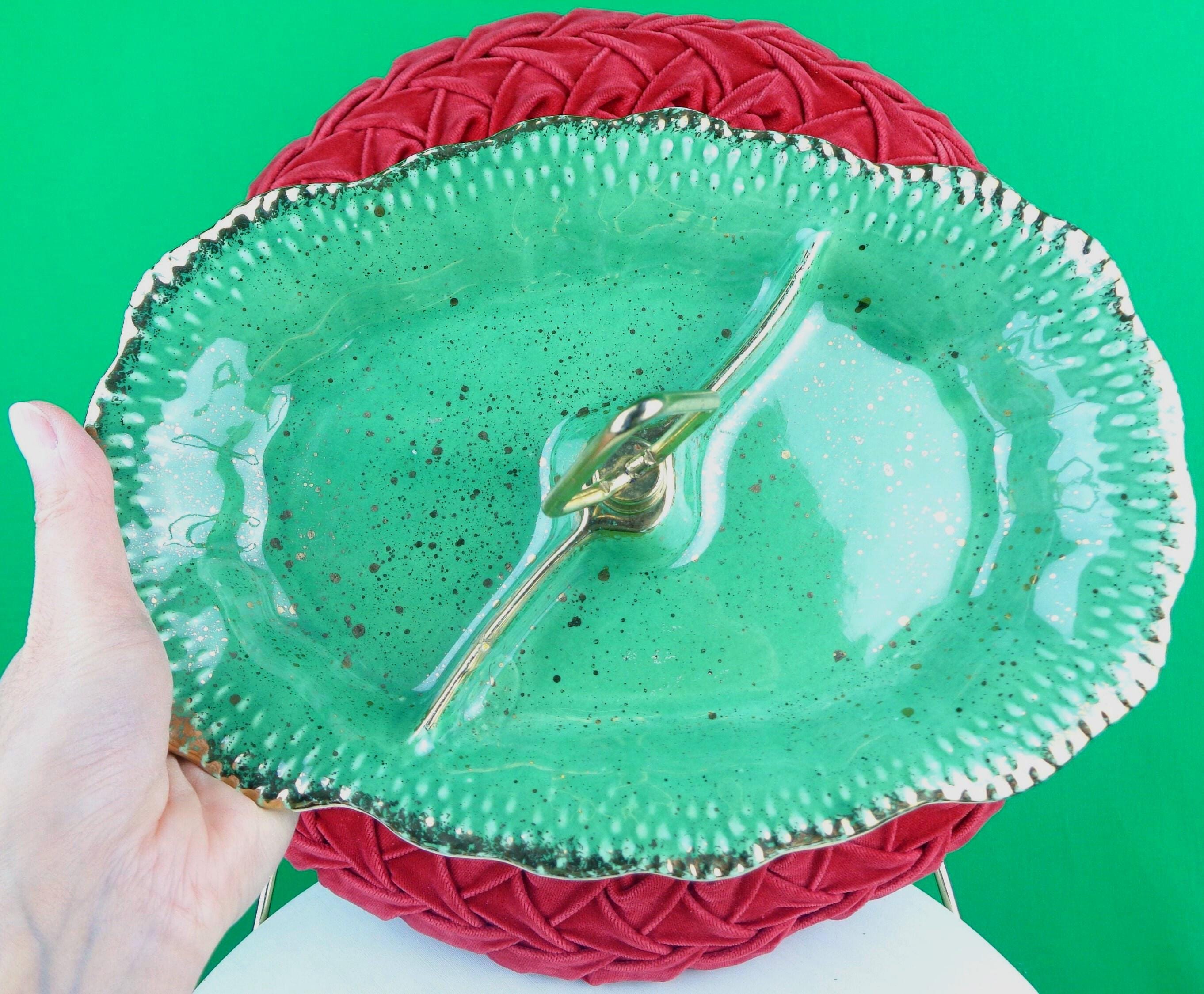 This lovely unique 1950s 60s retro MCM candy dish. Features scalloped edges, with a wave divided center, a diamond shape post handle, a gold flex painted throughout! Great piece!