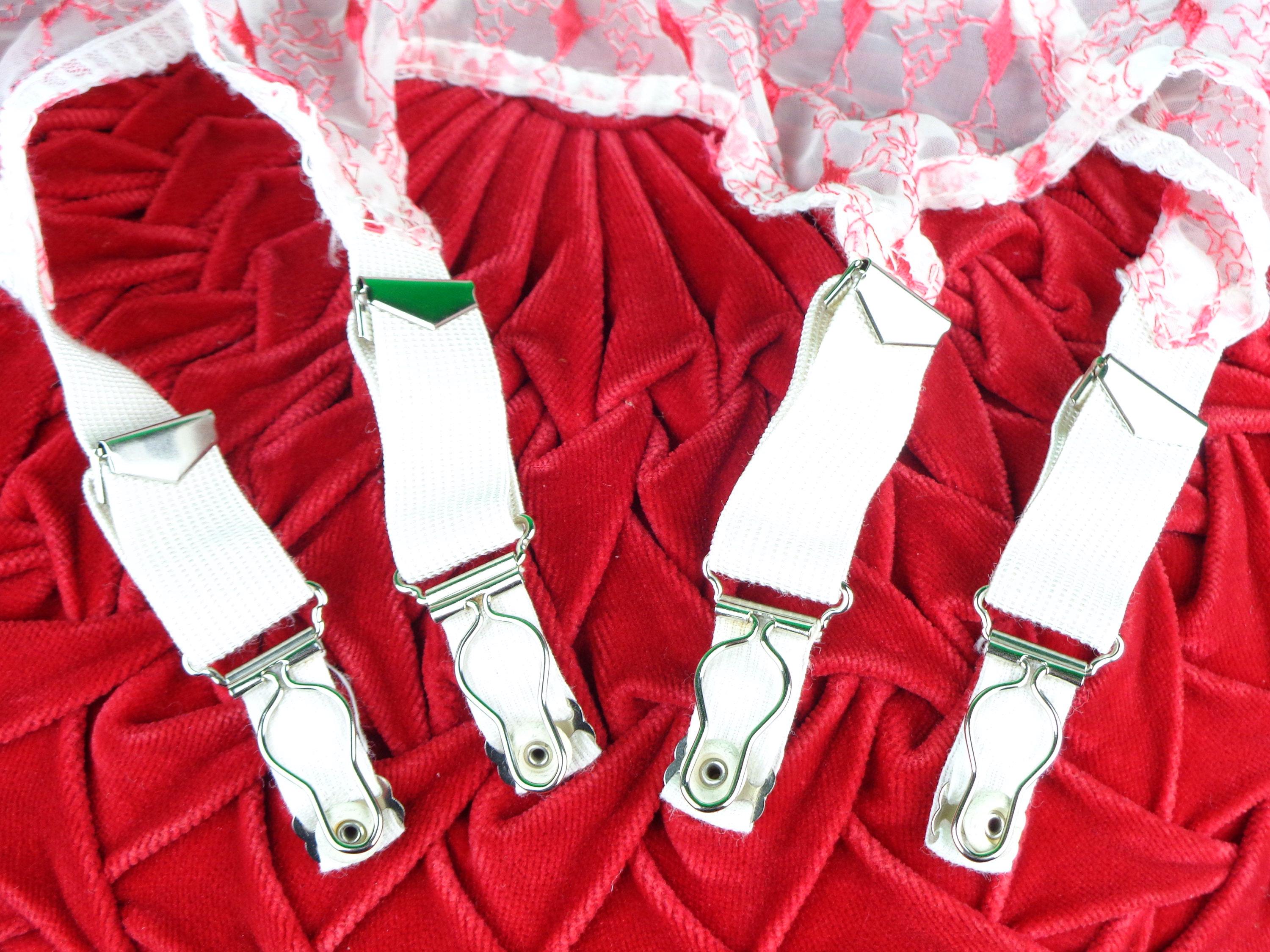Features 4 clips, front and back, with 4 adjustable hook closures, a stitched red and white geometric, zig zag diamond design pattern, light weight fabric, material throughout! Great piece!