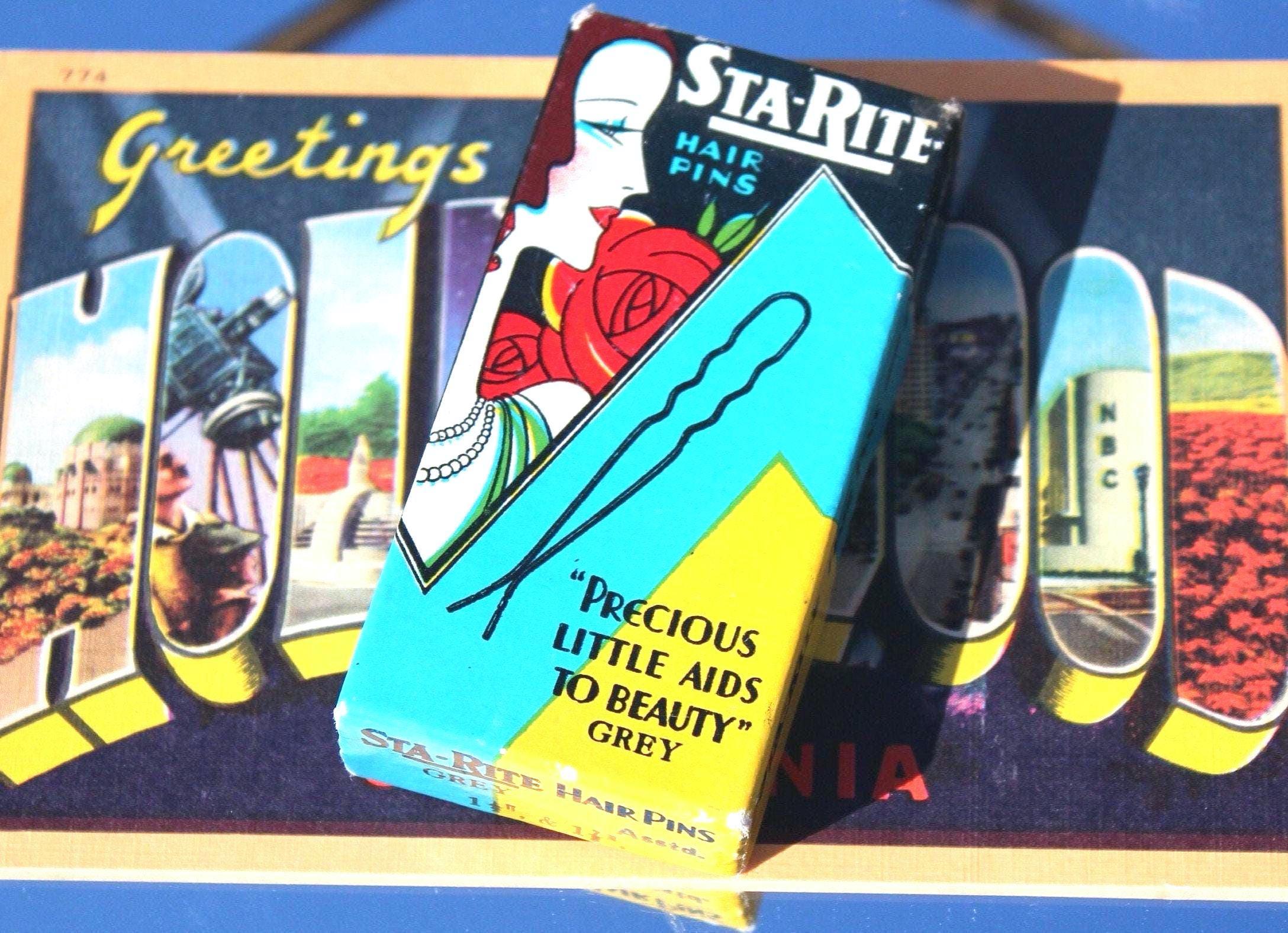 This lovely elegant, unique 1920s 30s bobby pins and box: Features a wonderfully decorative factory original box with a variety of multiple hair pins that can be used for curling and styling! Great piece!