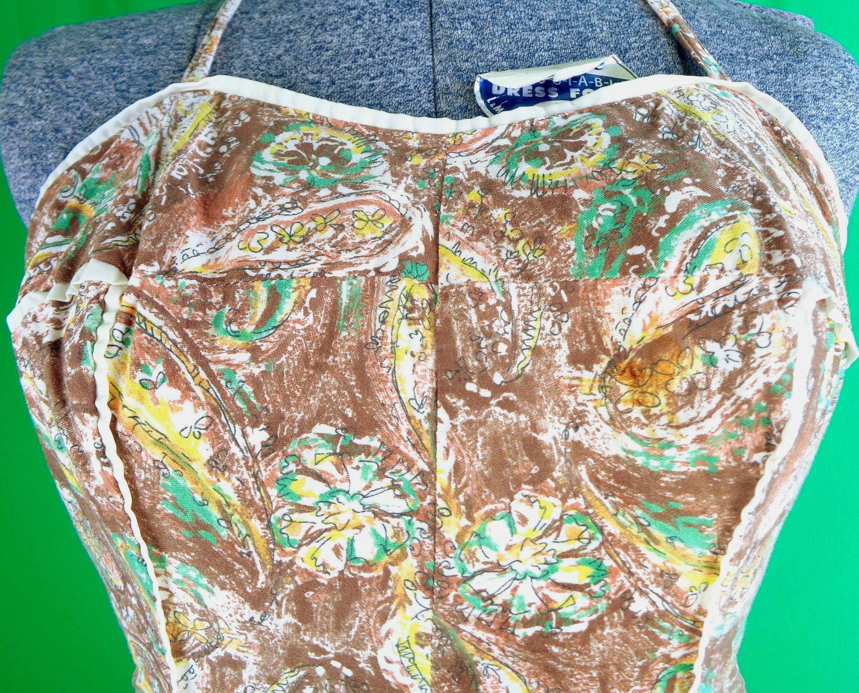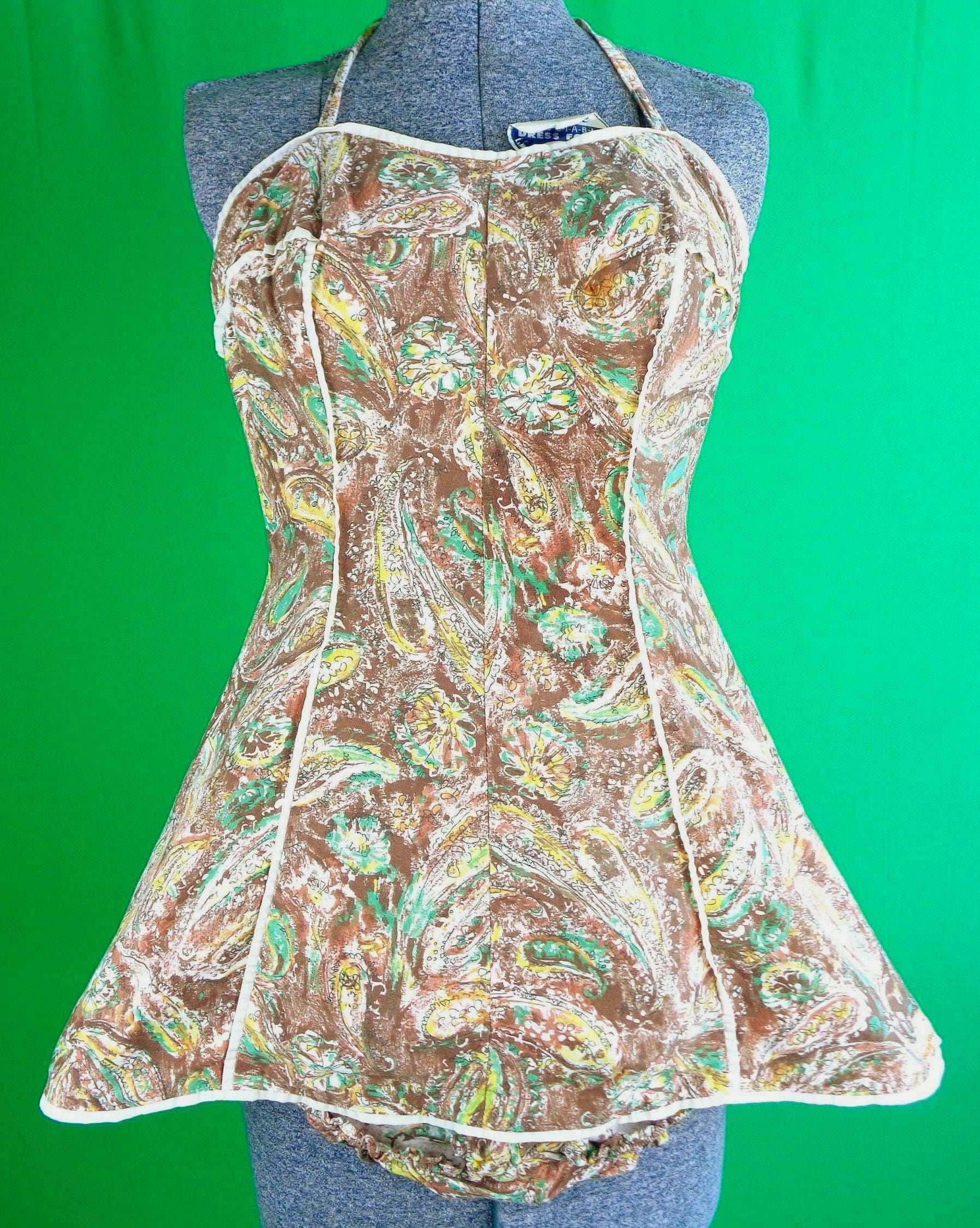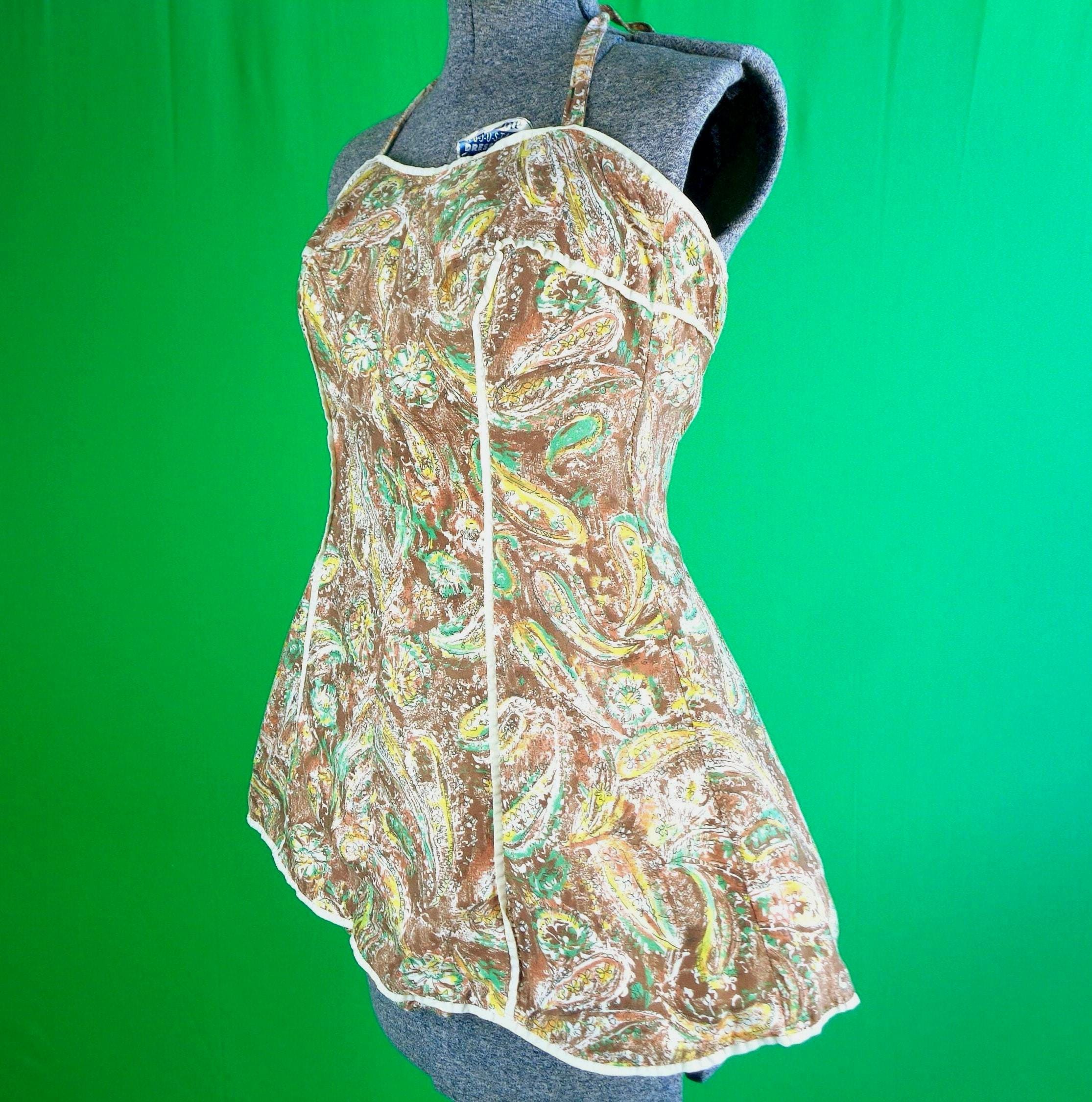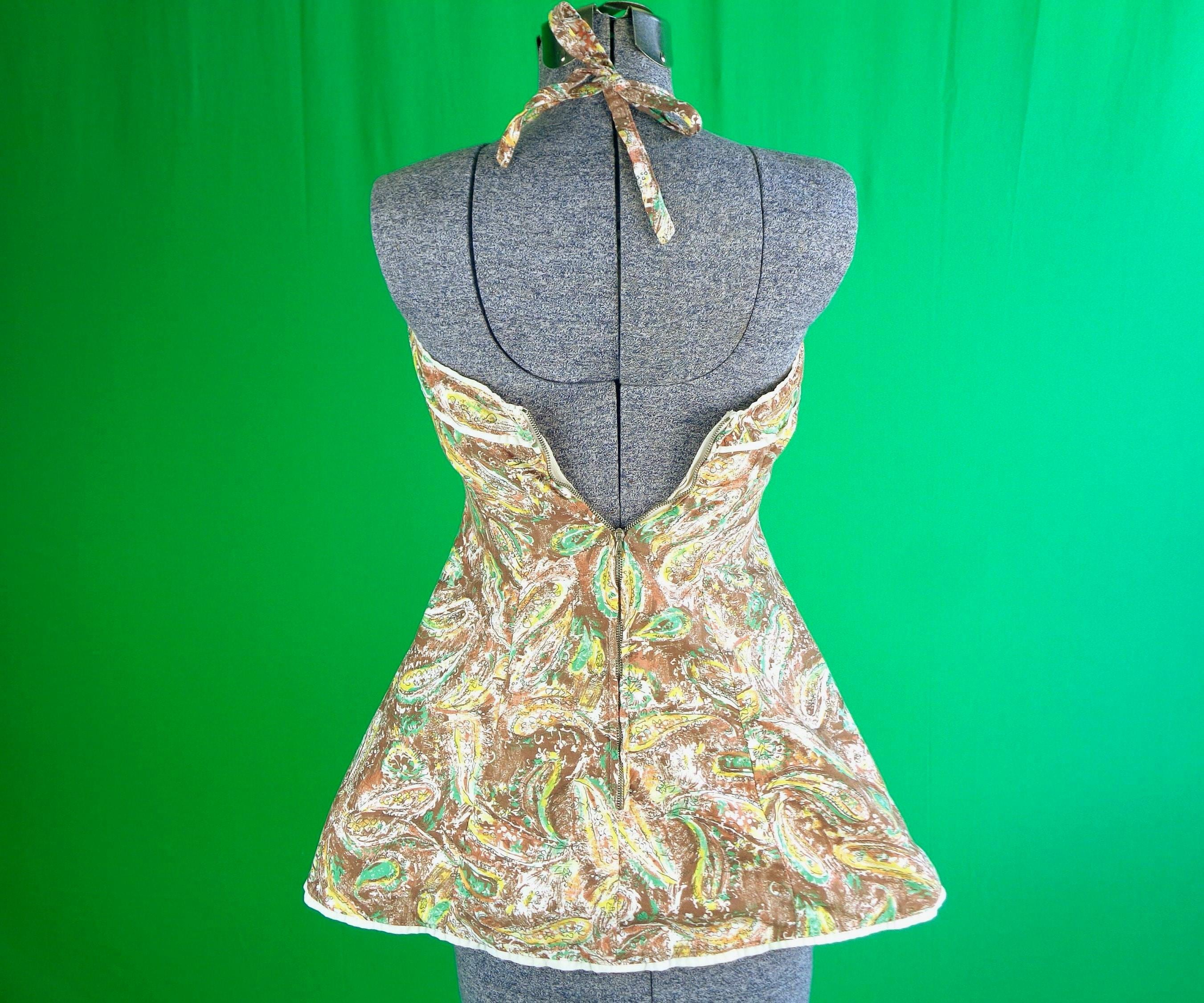 This lovely stylish, unique 1950s 60s romper, playsuit, bathing, swimwear, bloomer, short pant, skirt features top tie straps, front shelf bust, back metal zipper, matching bloomers, with an abstract pattern, design and ultra soft fabric, material throughout!