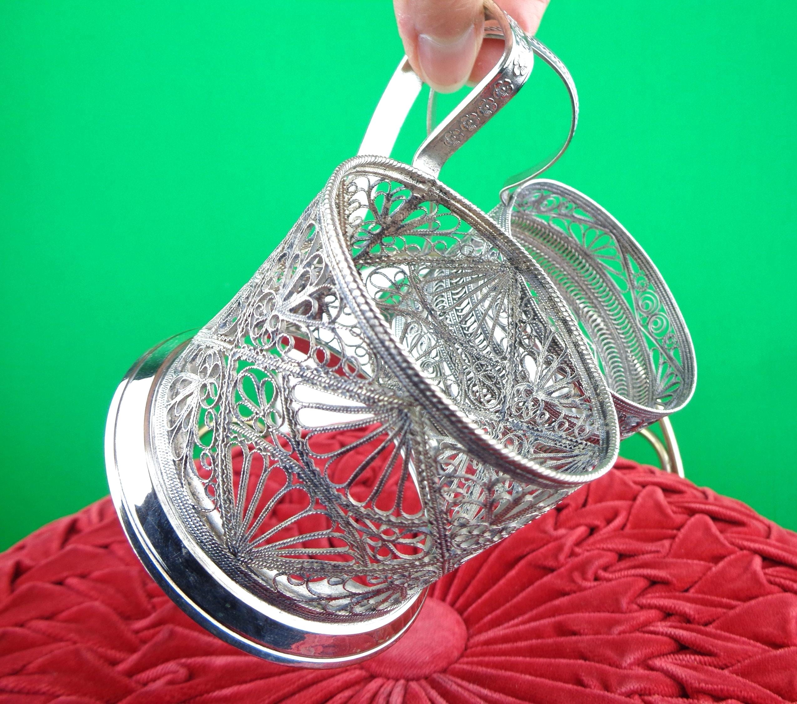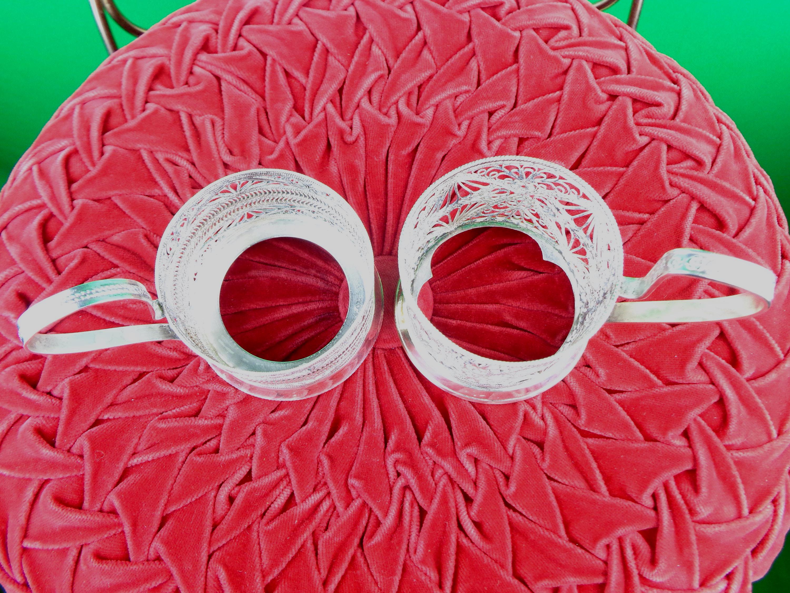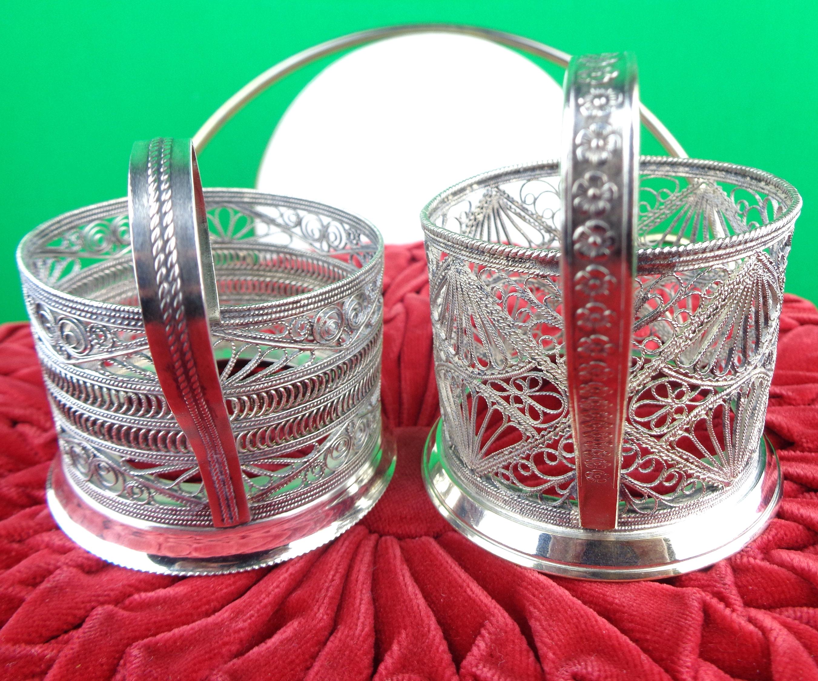 Features 2 different styles and sizes with an intricate swirl triangular and fan design detail throughout with a rope and floral etched handle! Great pieces!