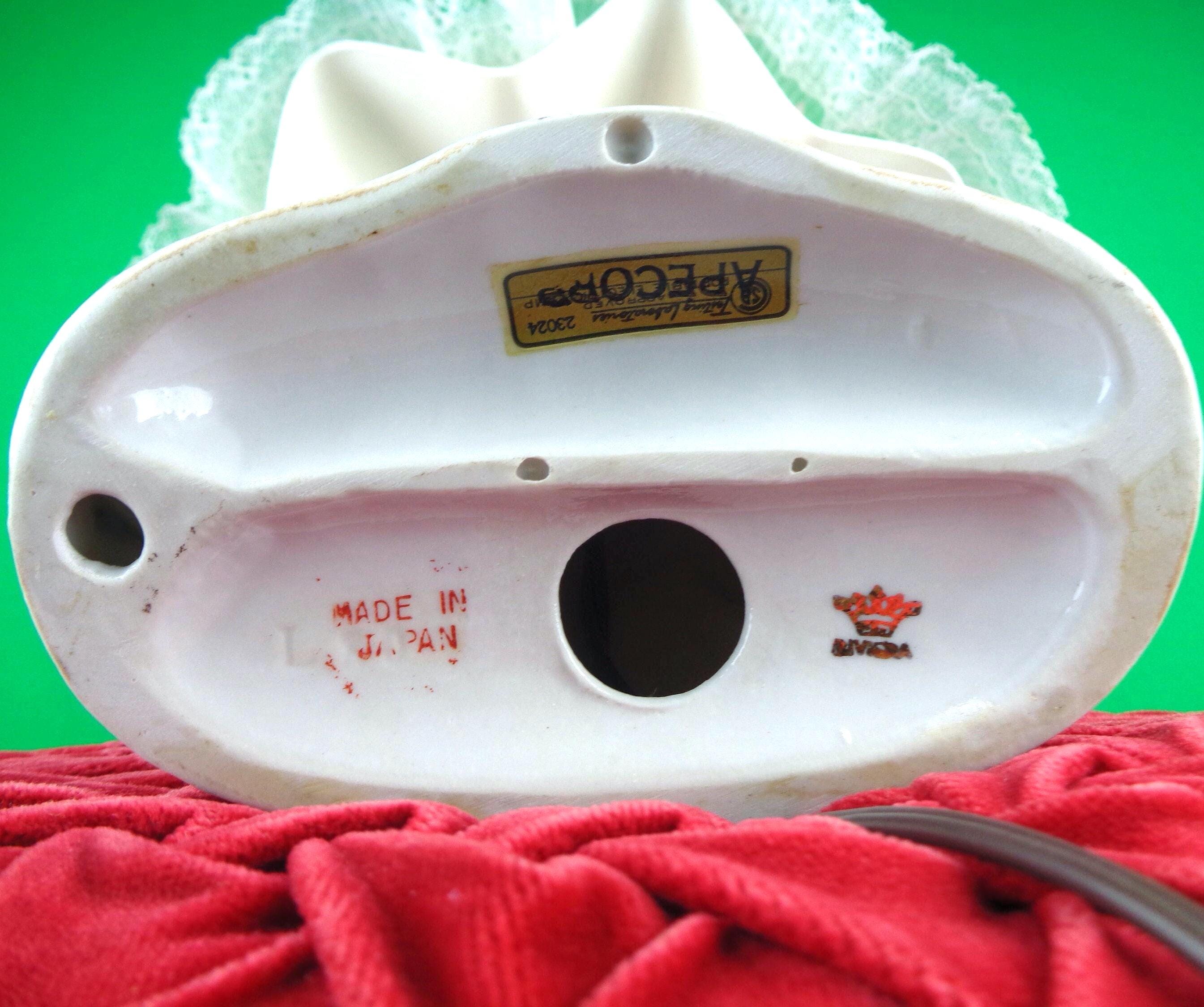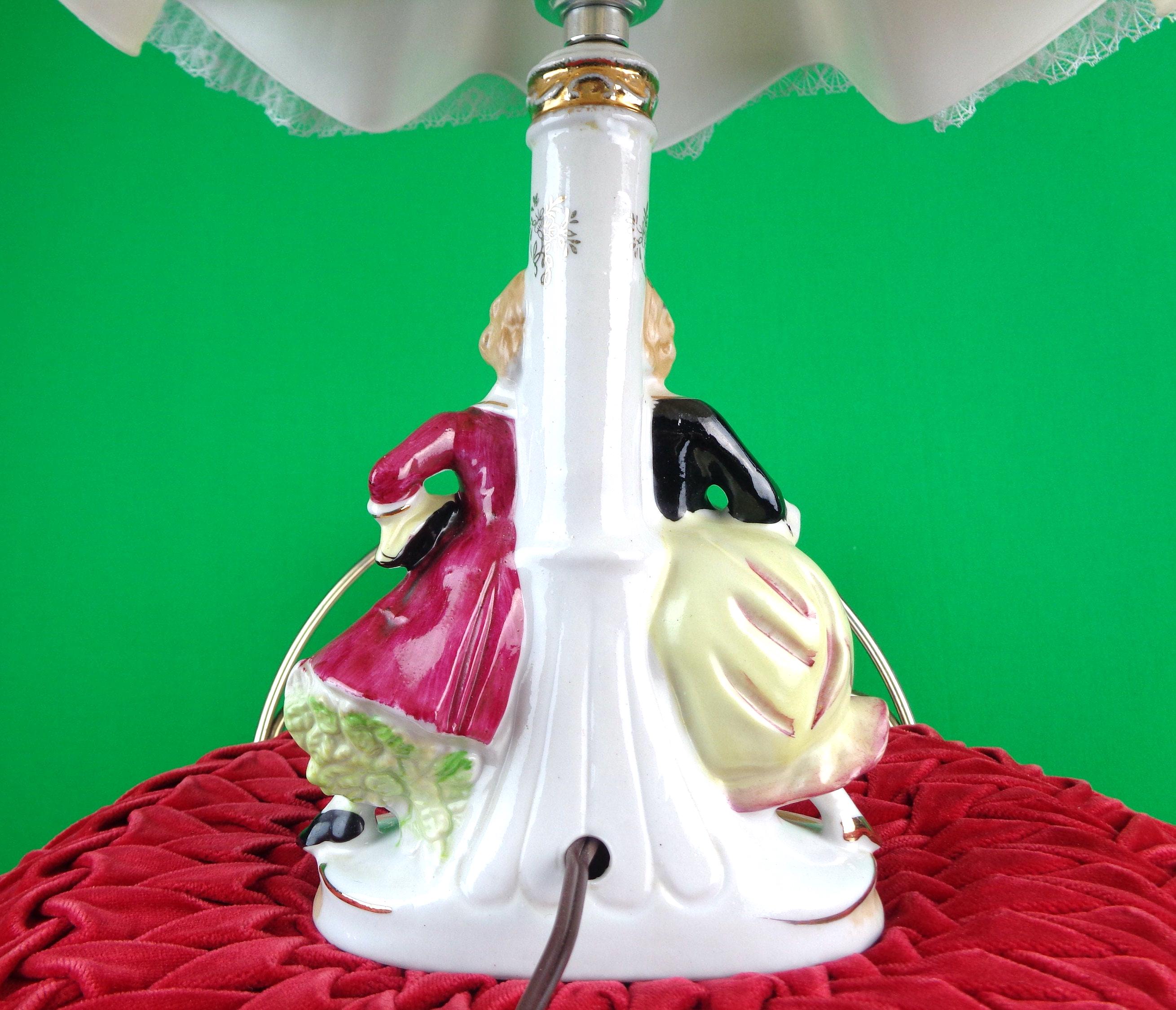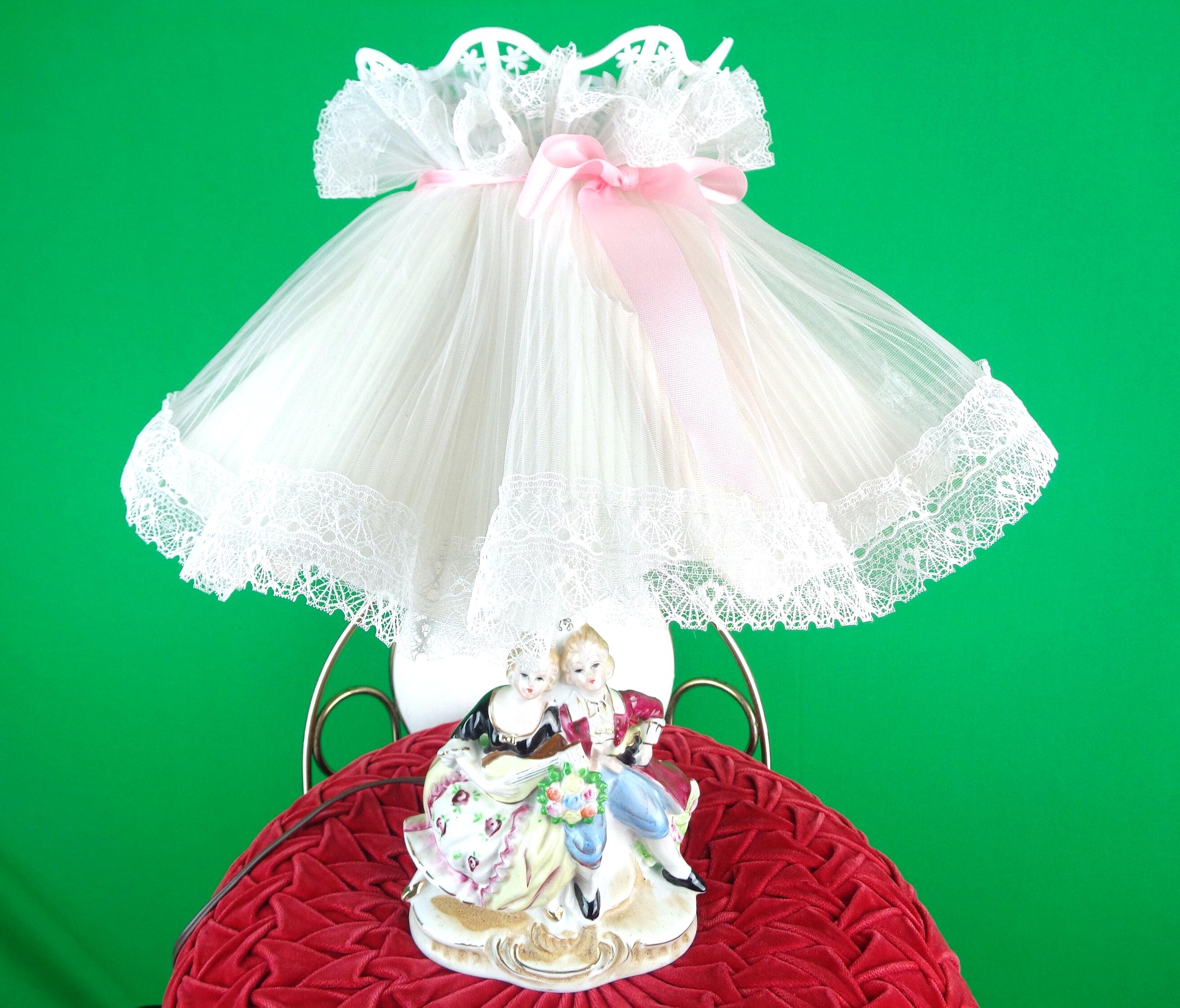 This lovely unique 1940s table lamp, night light with lace shade Works! features a loving couple sitting playing a guitar, nicely painted with a cupcake sheer wave shape shade! Great piece!