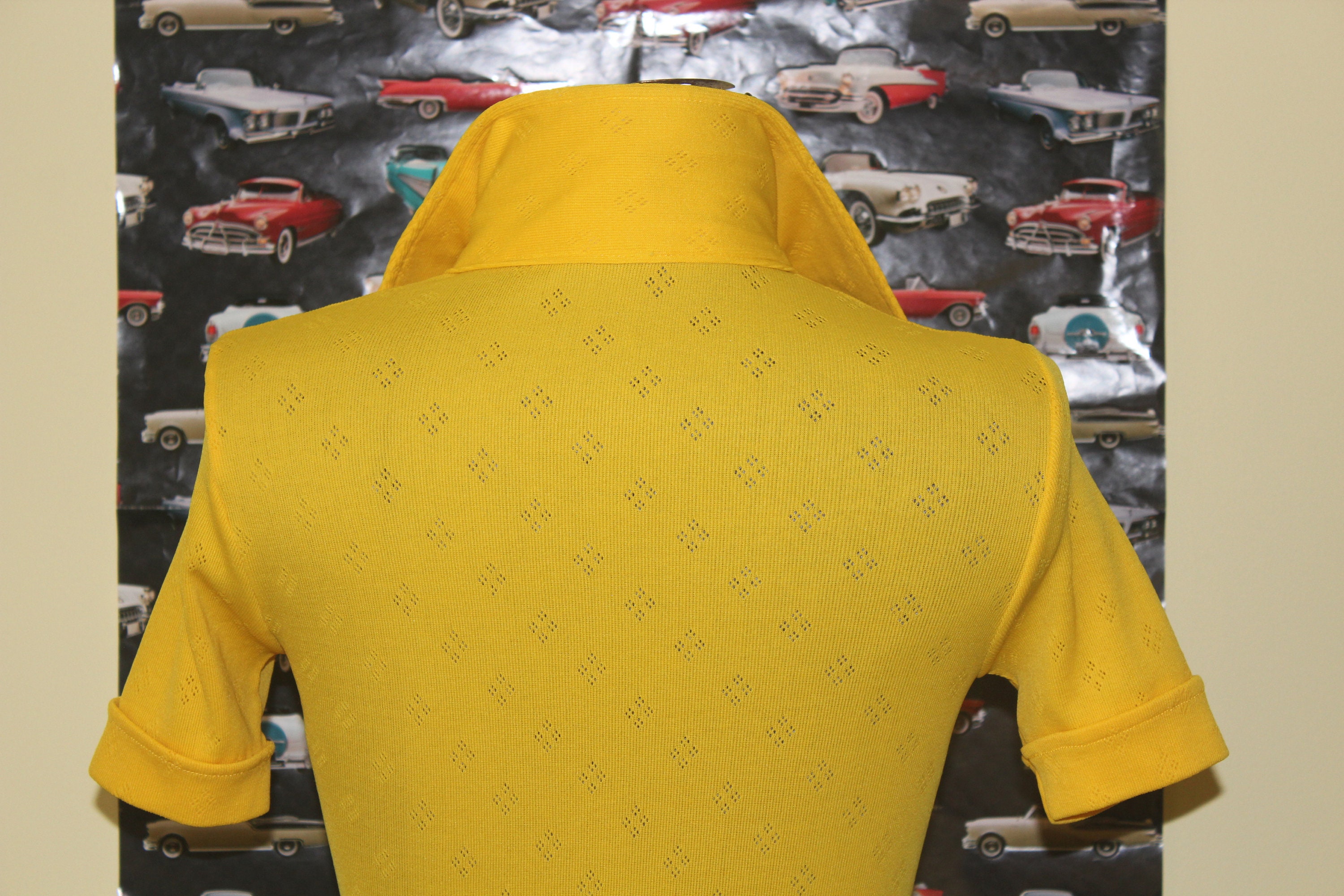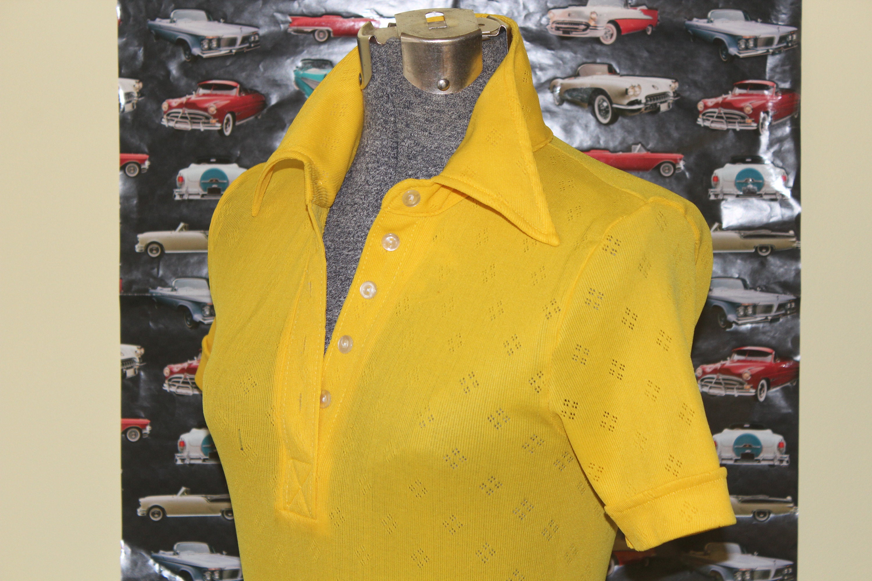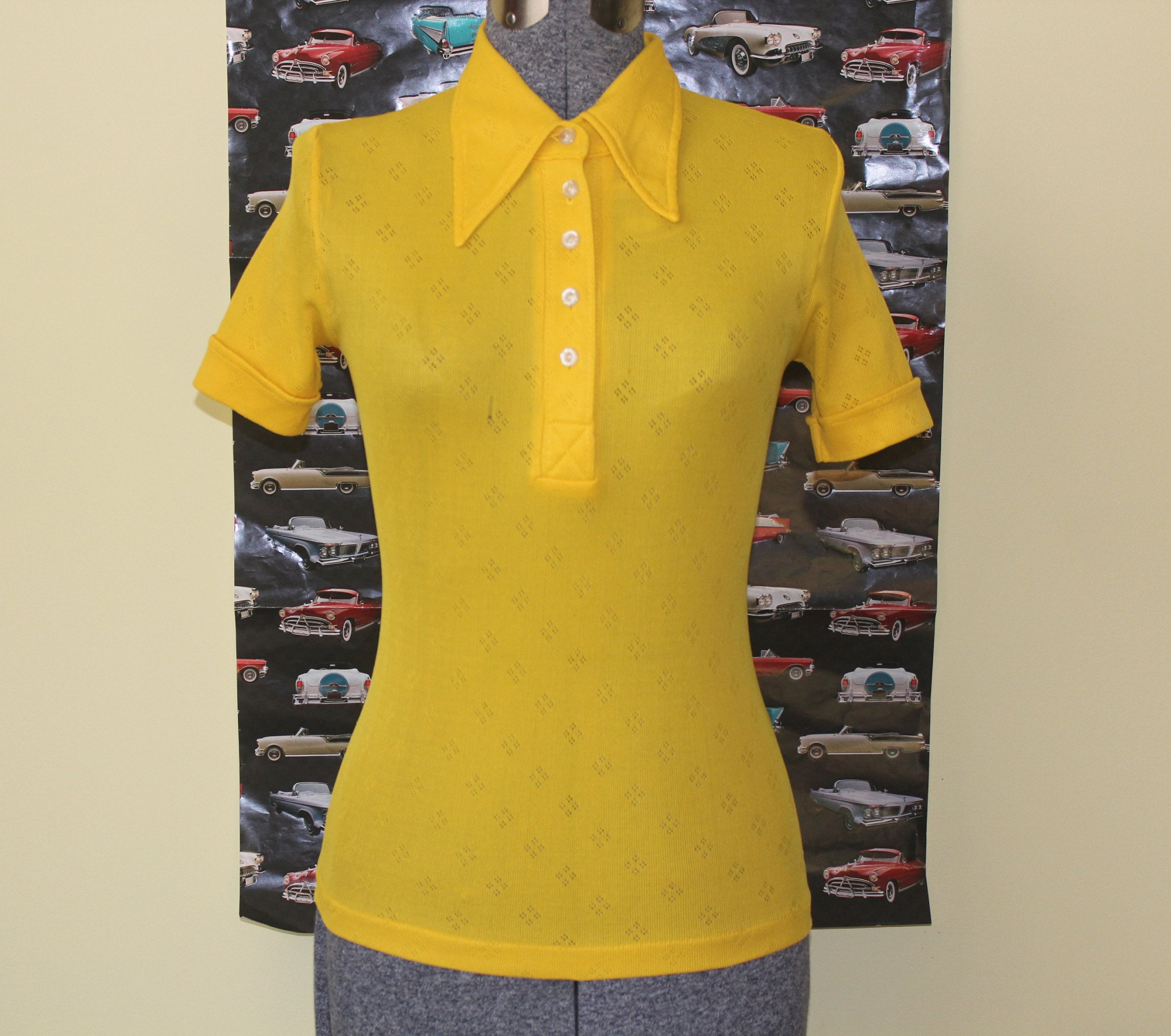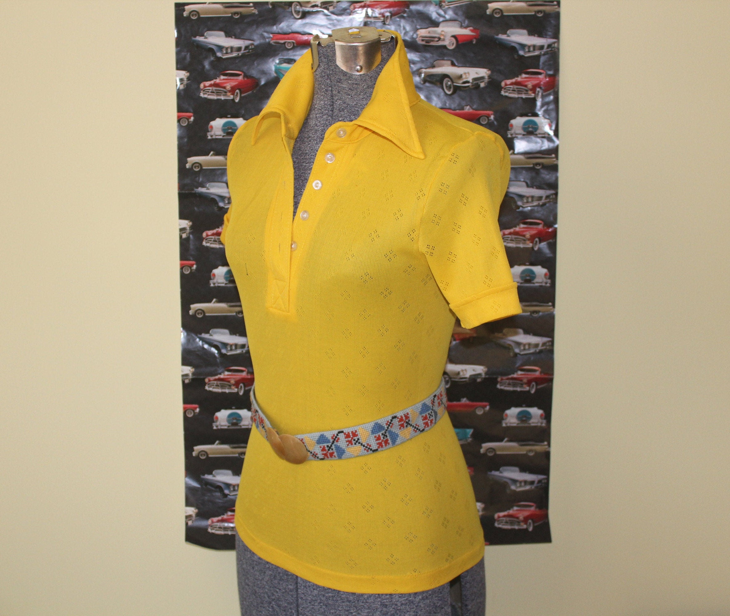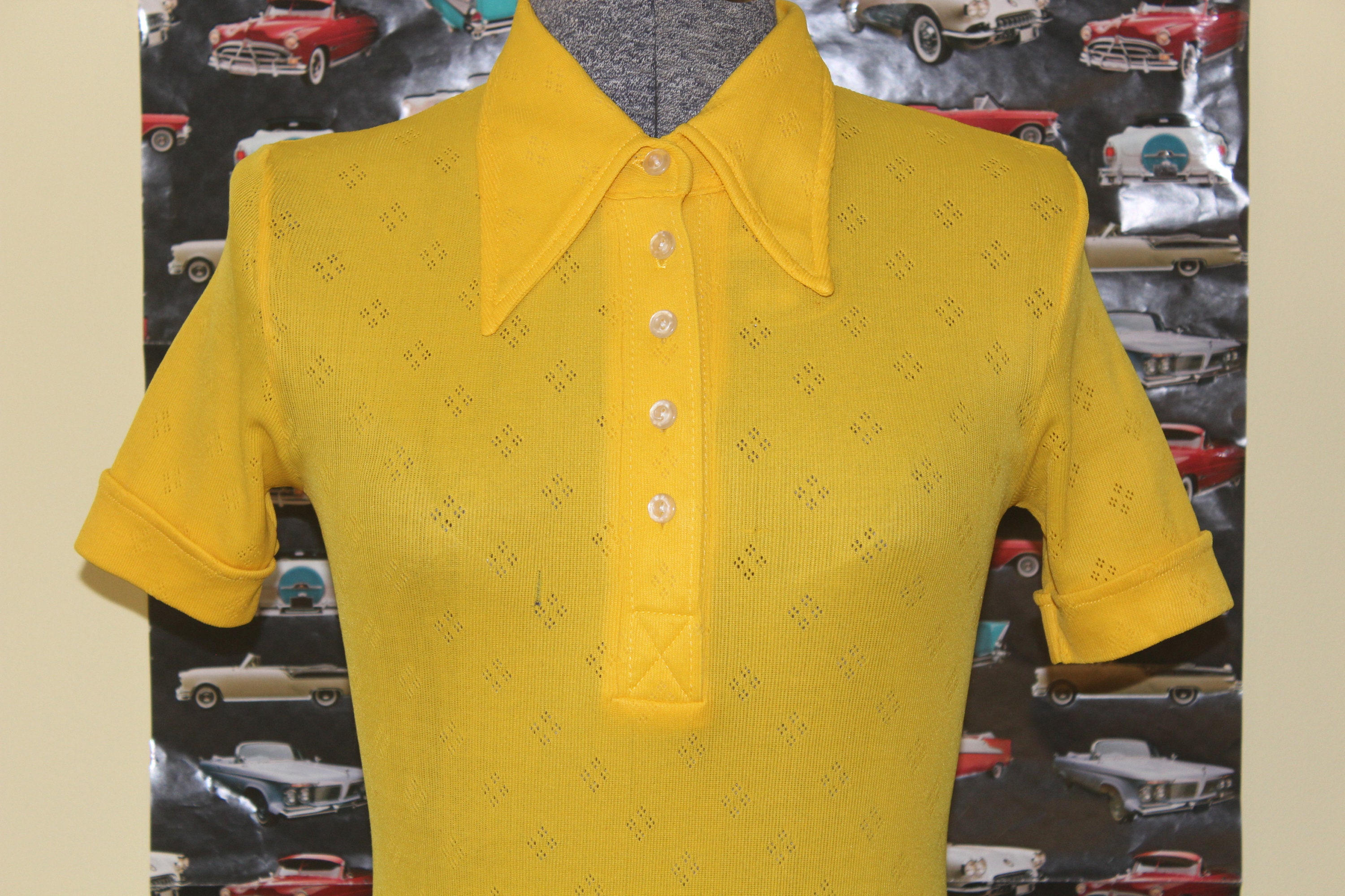 This stylish vibrant 1960s 70s top features a pointed collar, button front and diamond pattern throughout!