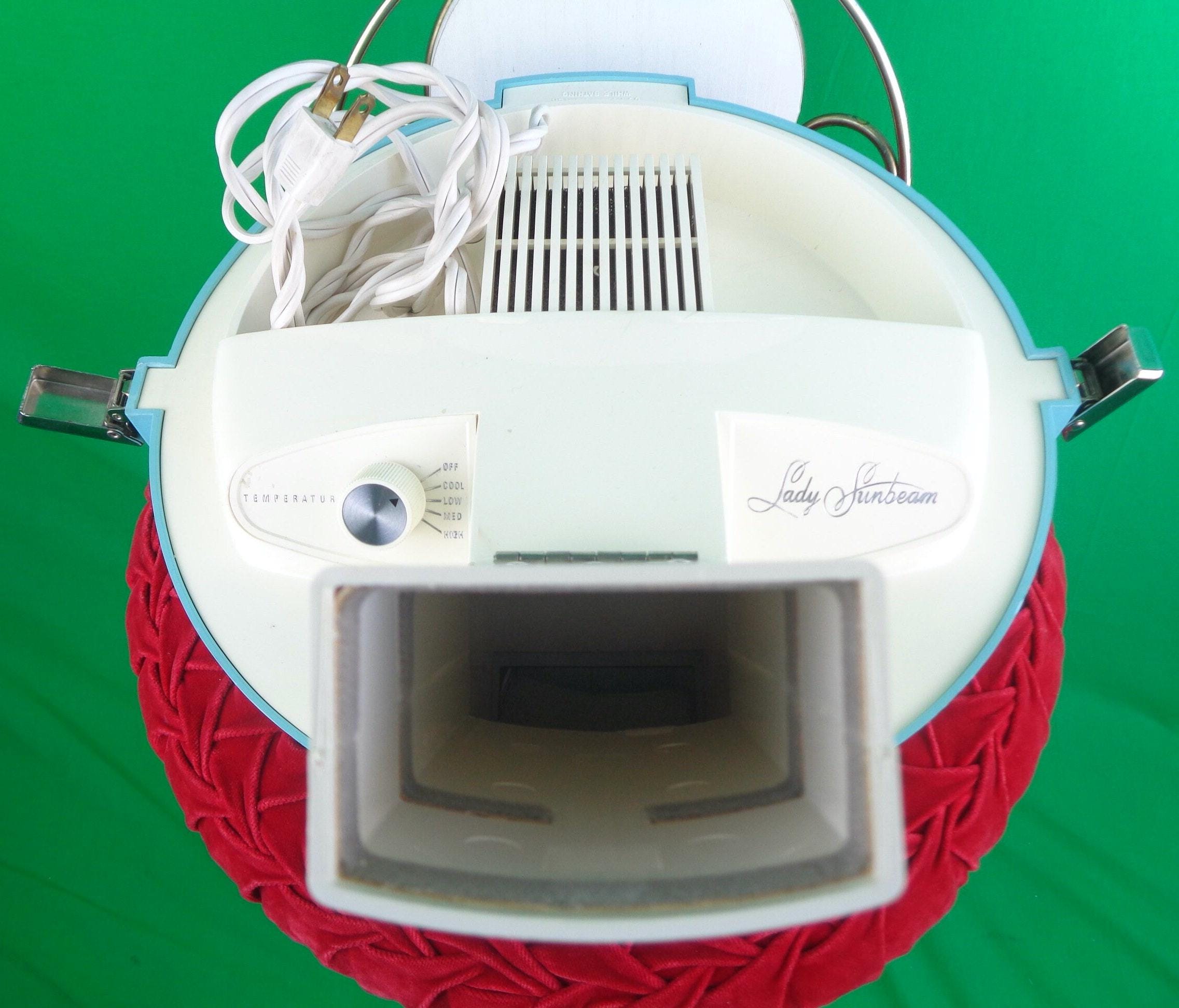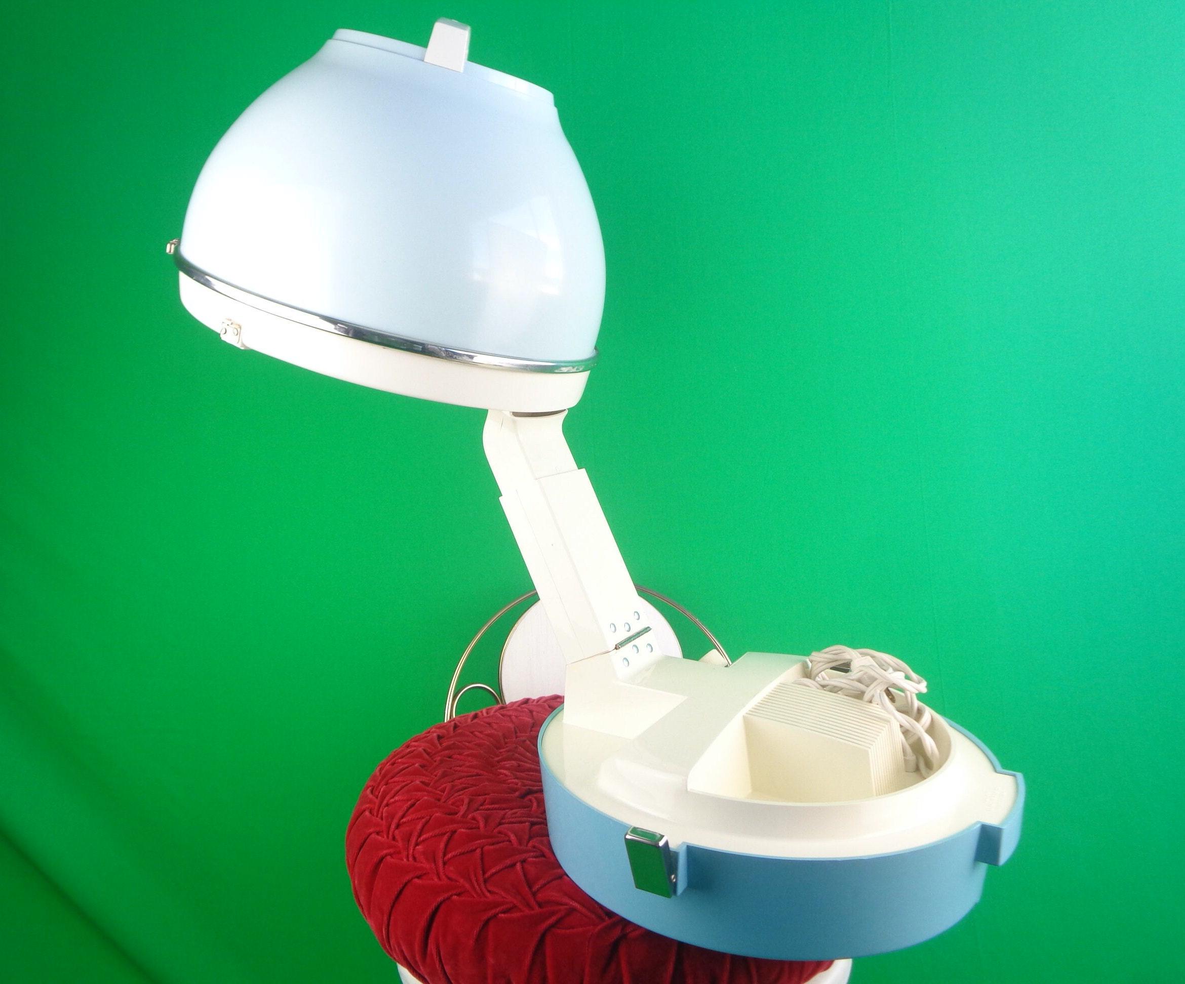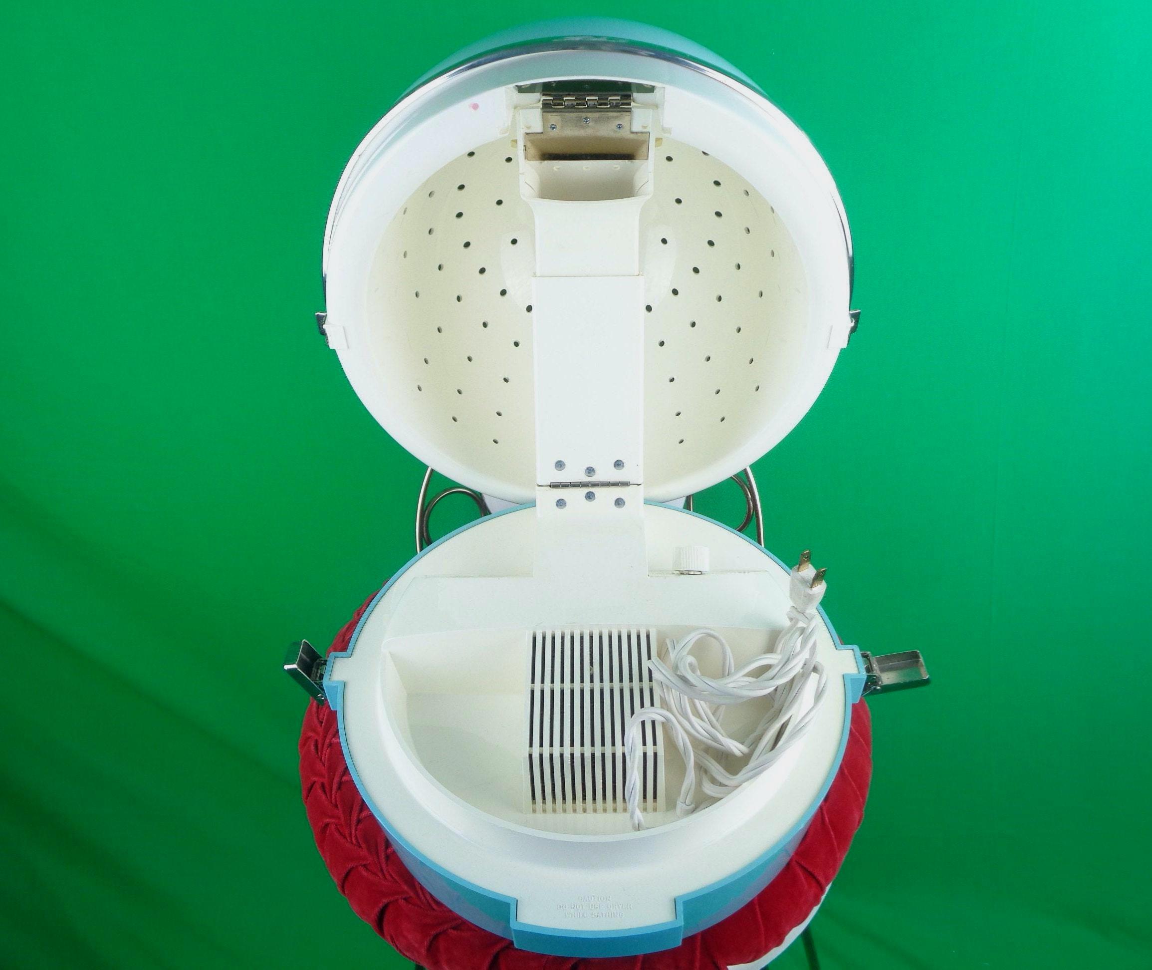 This lovely unique 1960s 70s hair dryer WORKS! features an adjustable neck, that can swivel from front to back a cone cover for the head, a ring that secures the cone together with the base 2 side clamp closures an electrical cord and a adjustable knob for speed, a case cover for storage!