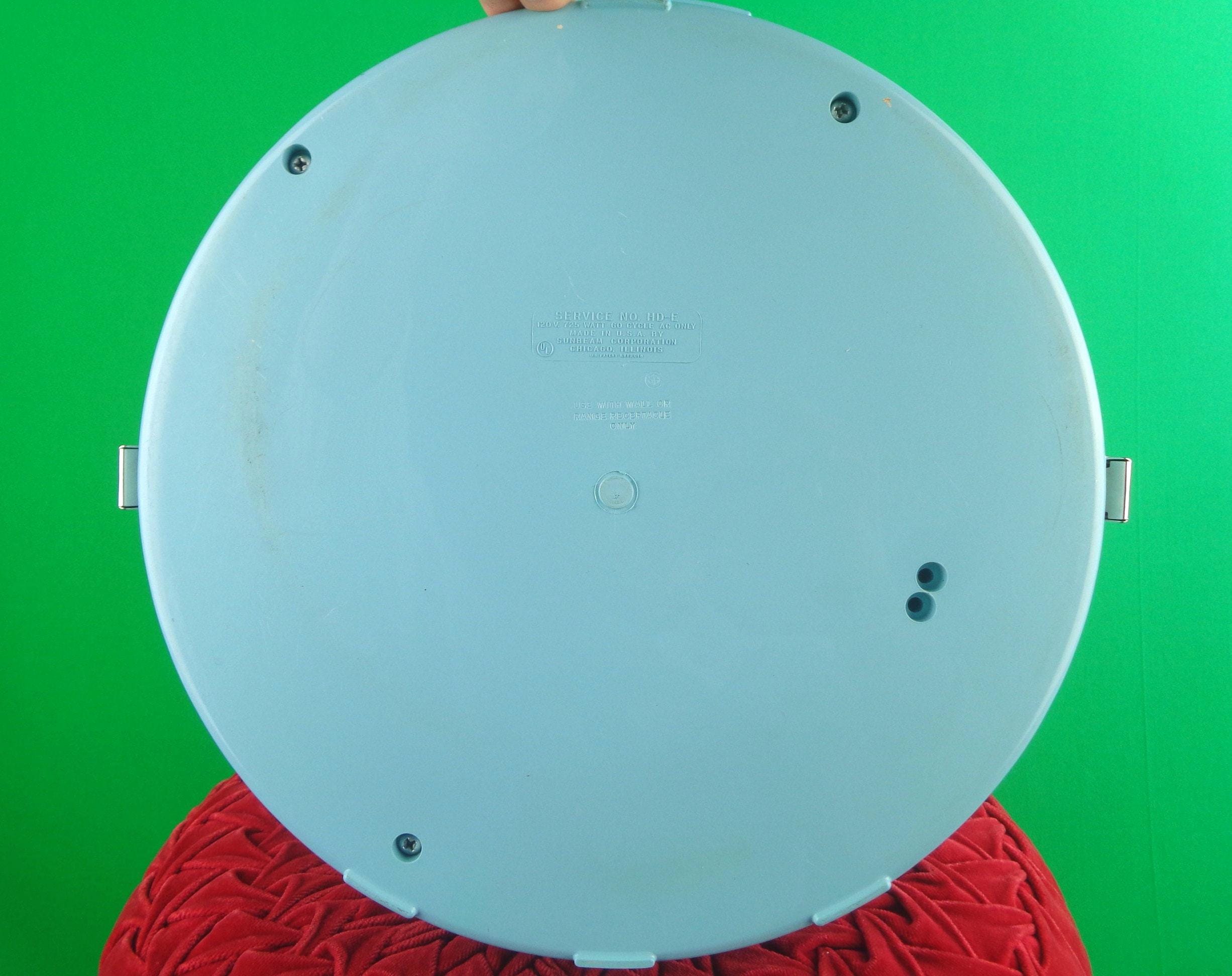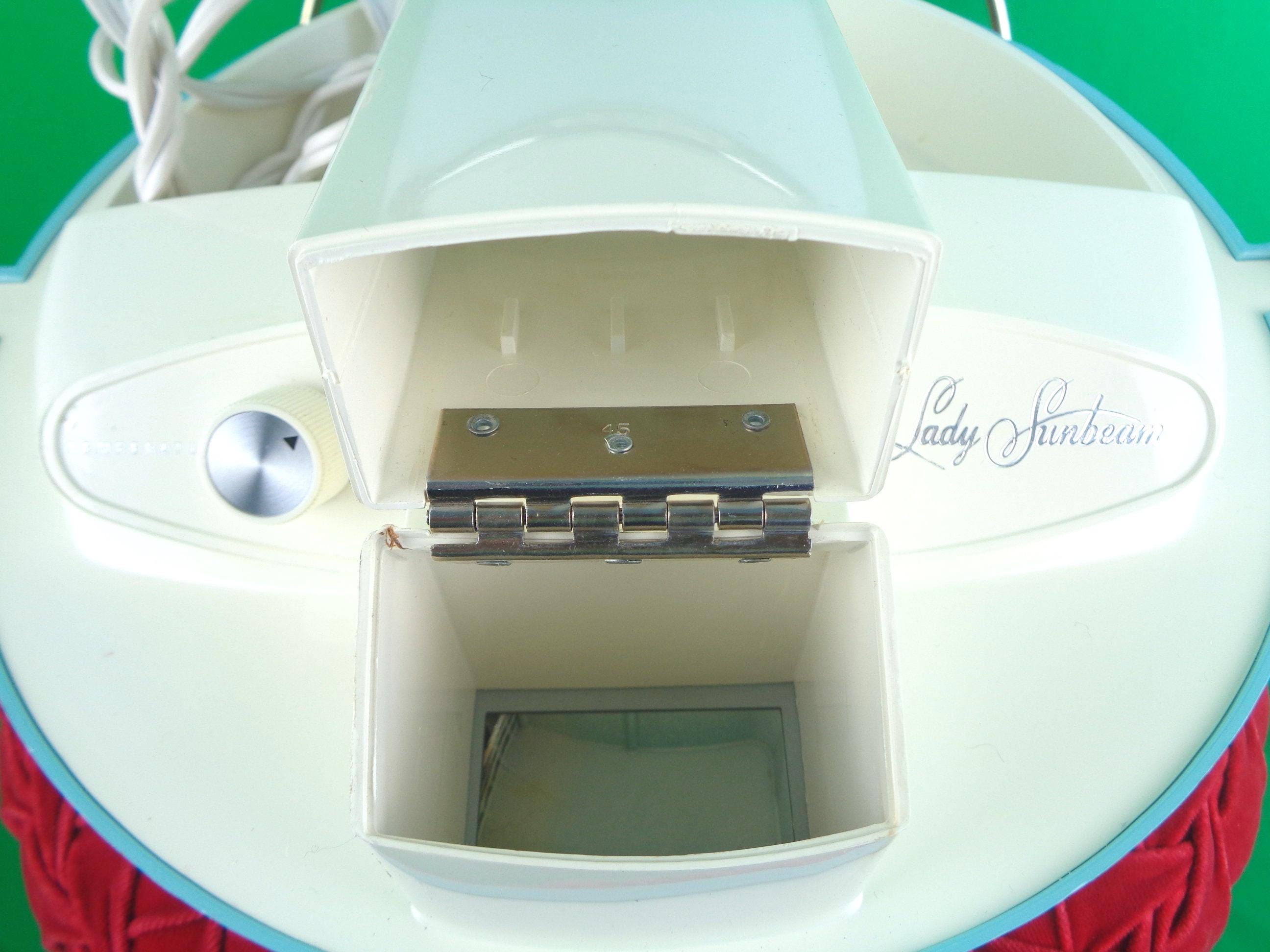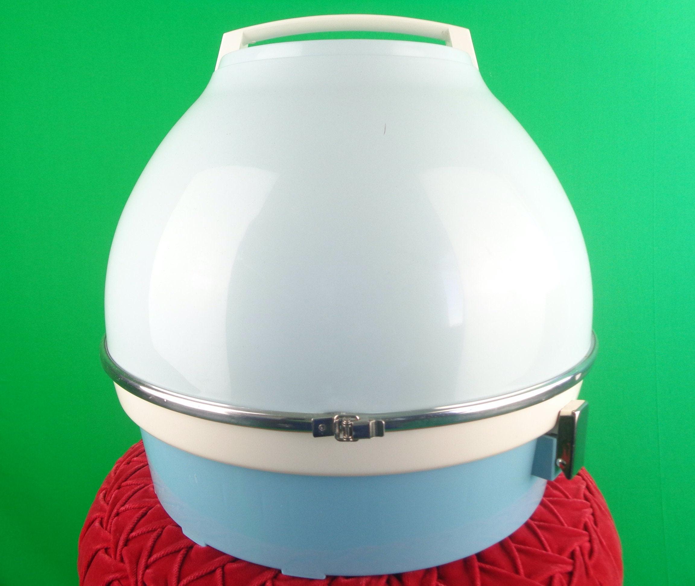 This lovely unique 1960s 70s hair dryer WORKS! features an adjustable neck, that can swivel from front to back a cone cover for the head, a ring that secures the cone together with the base 2 side clamp closures an electrical cord and a adjustable knob for speed, a case cover for storage!