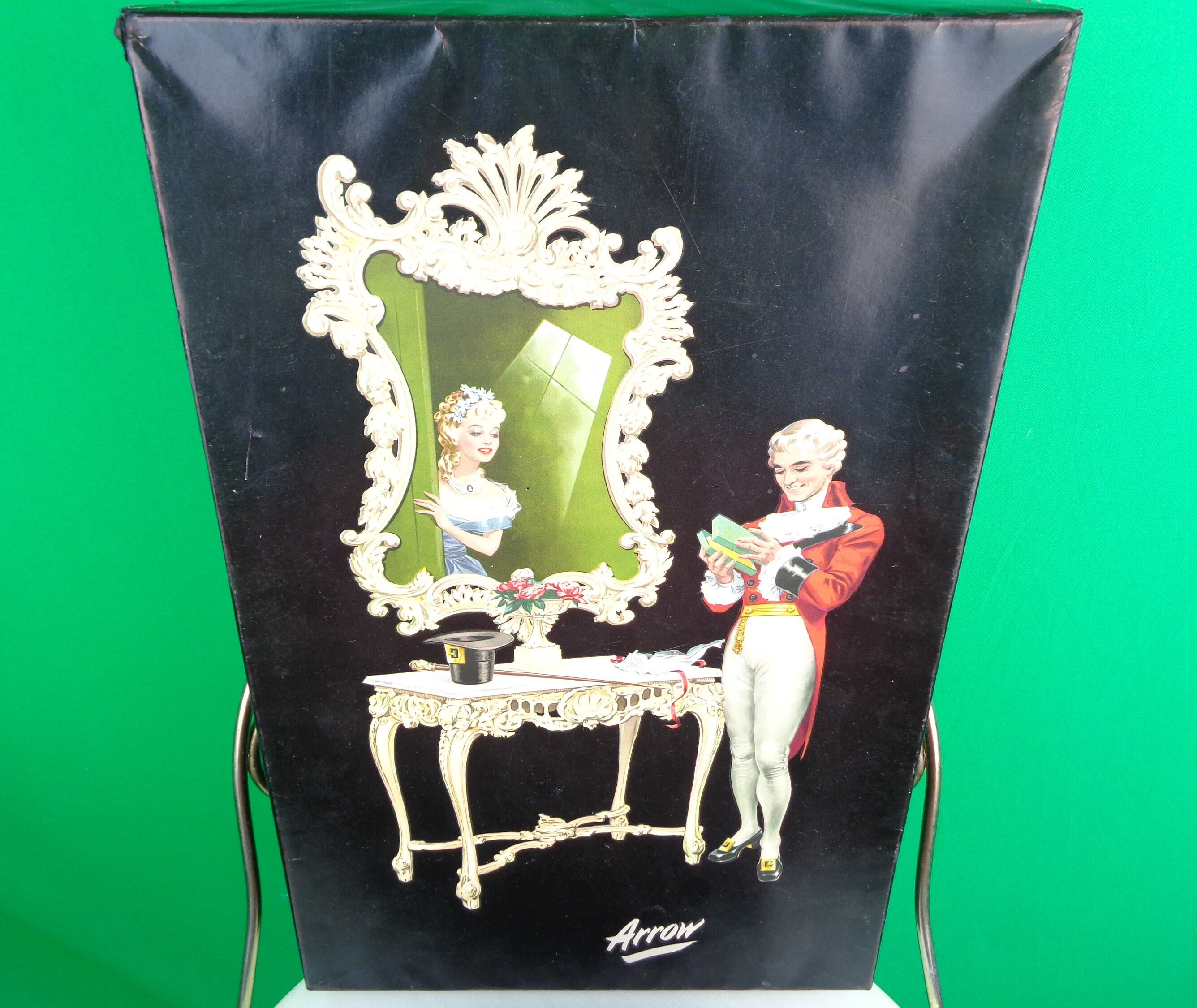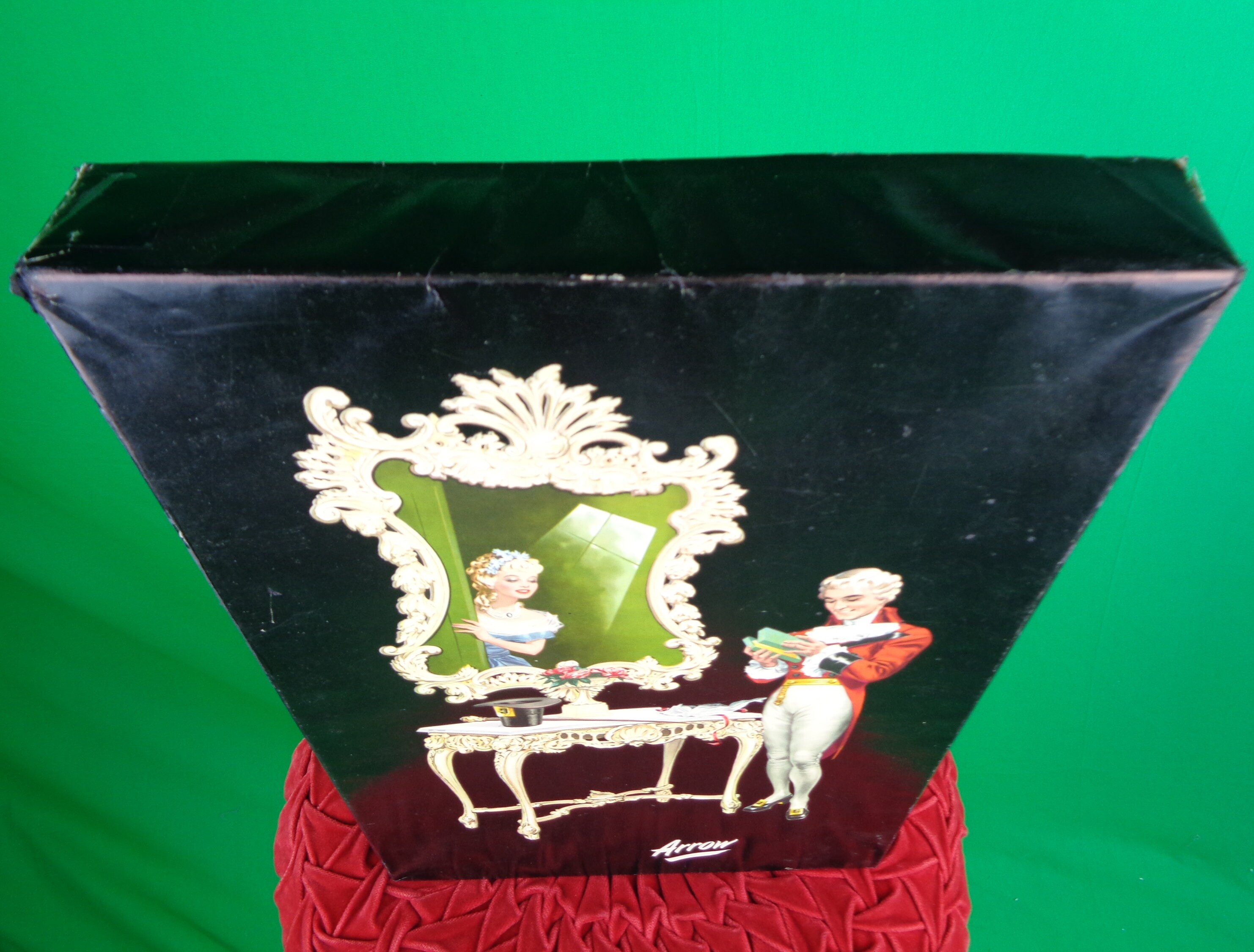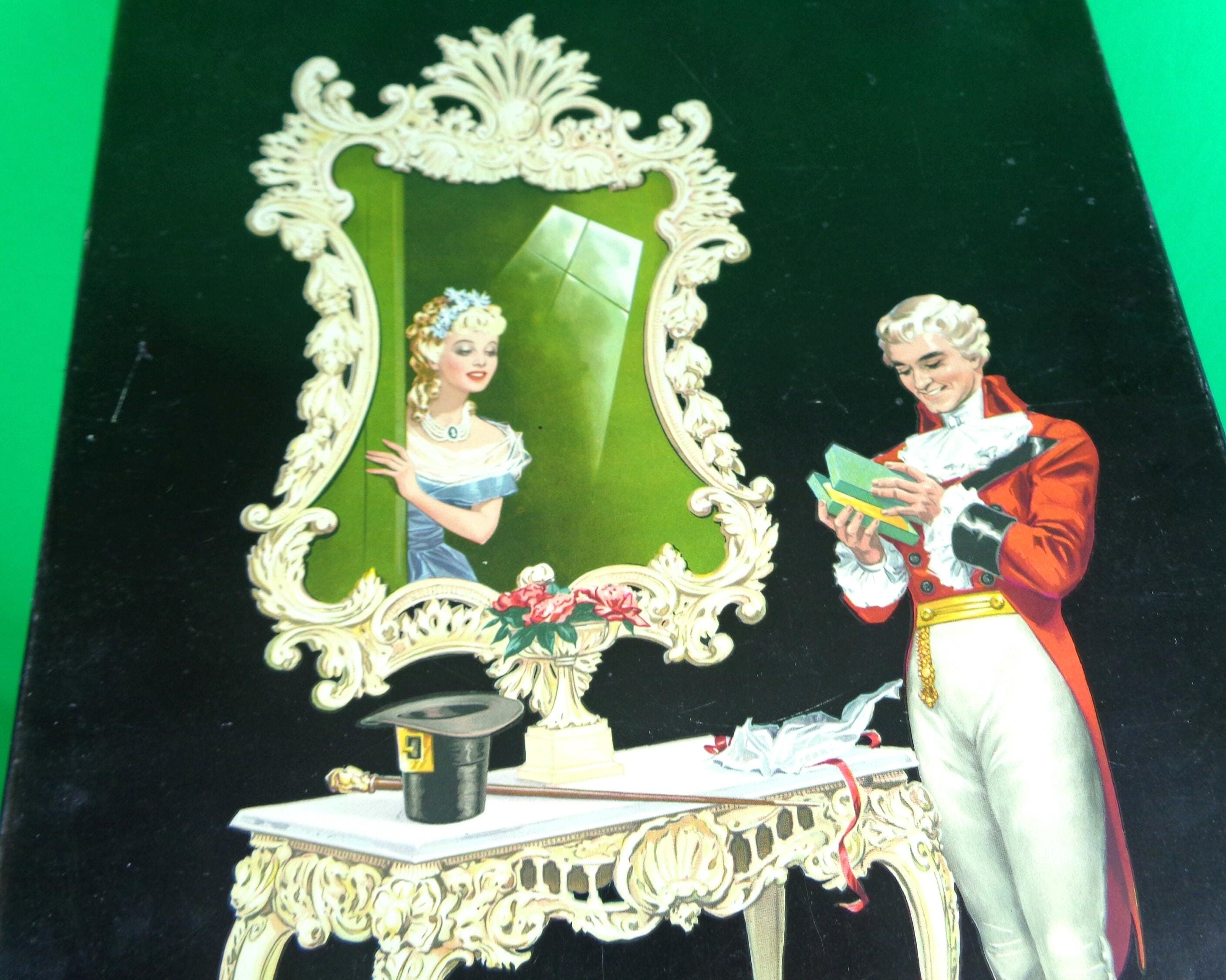 This lovely vibrant unique 1940s 50s storage box. Features a top lid with an illustrated of renascence mirror greeting couple! Great piece!