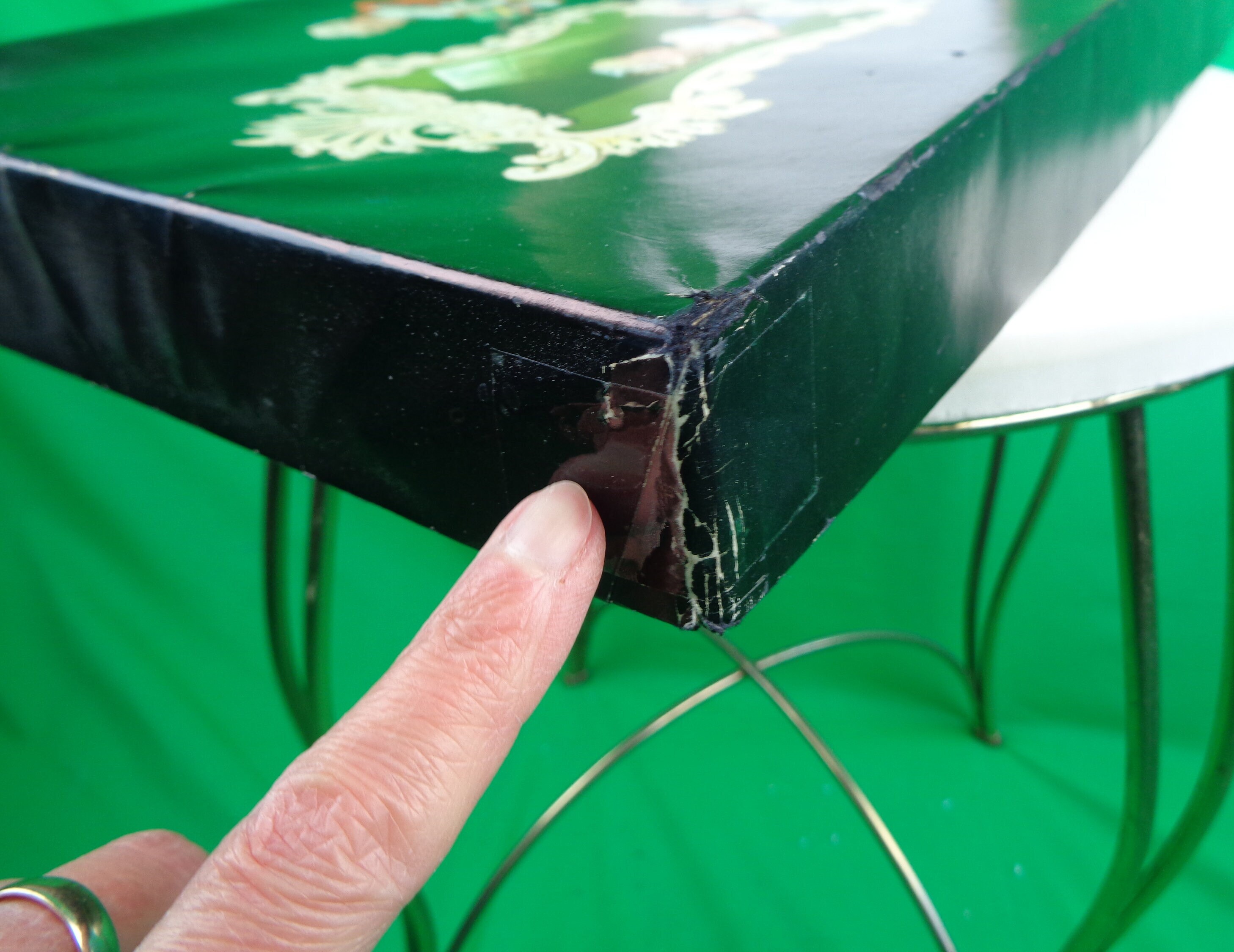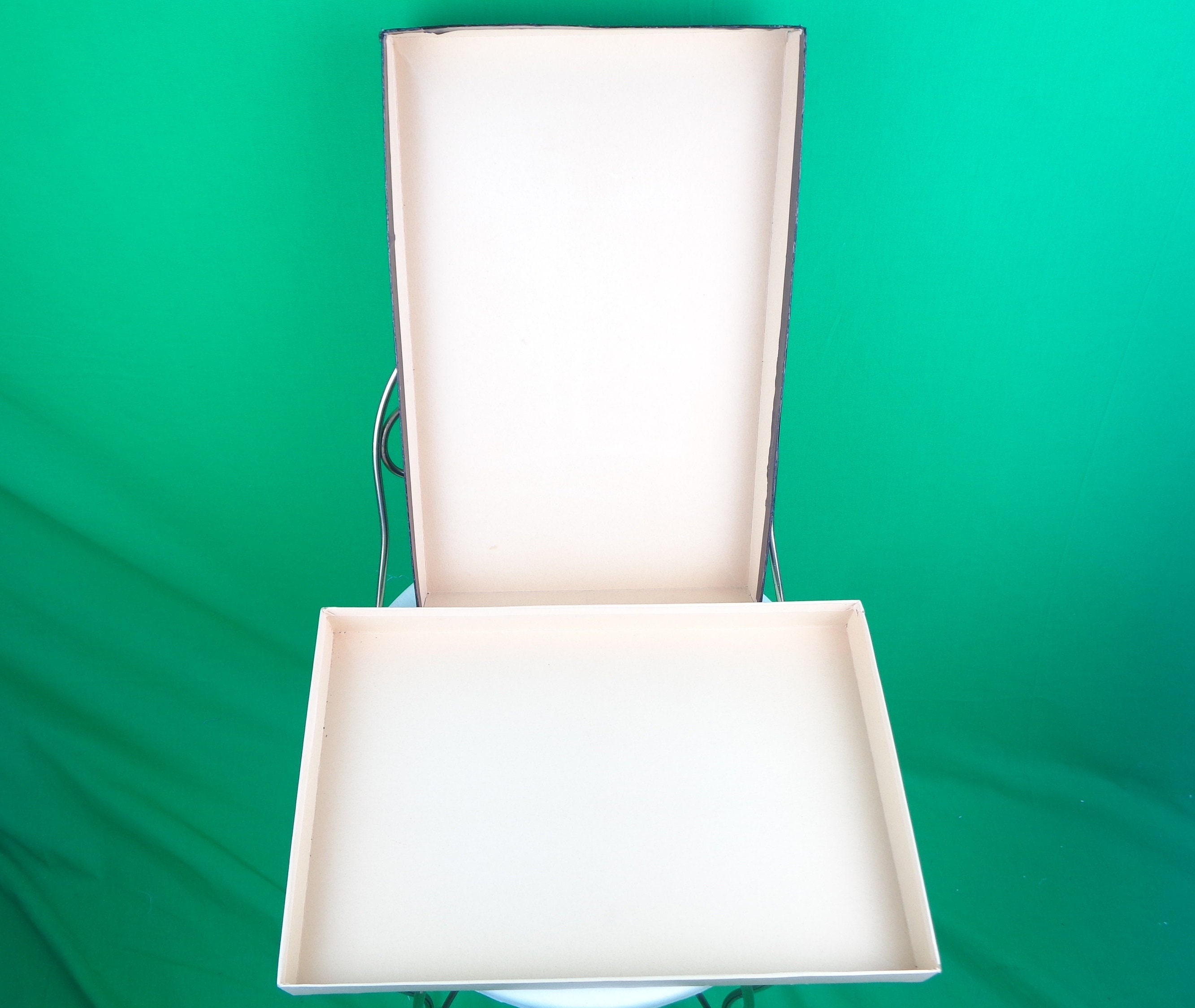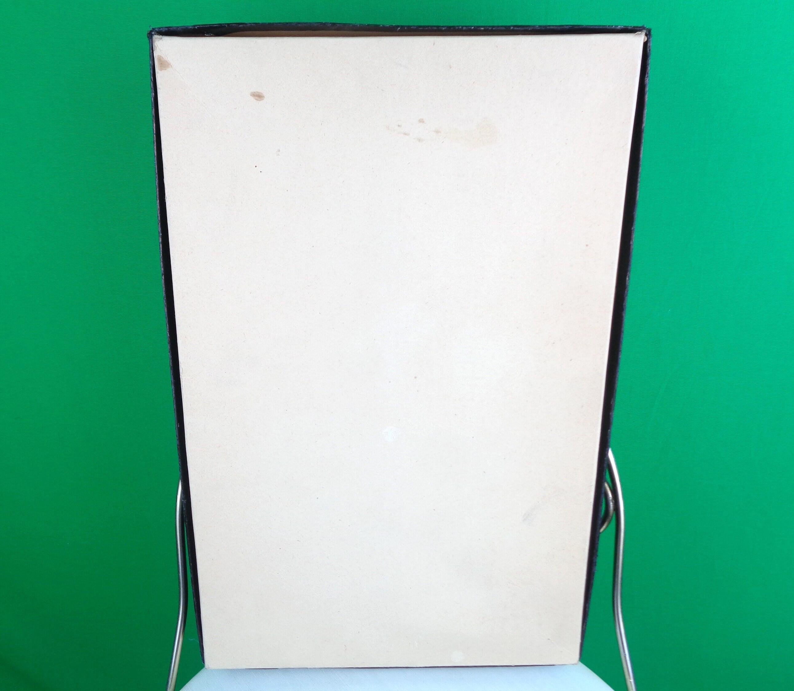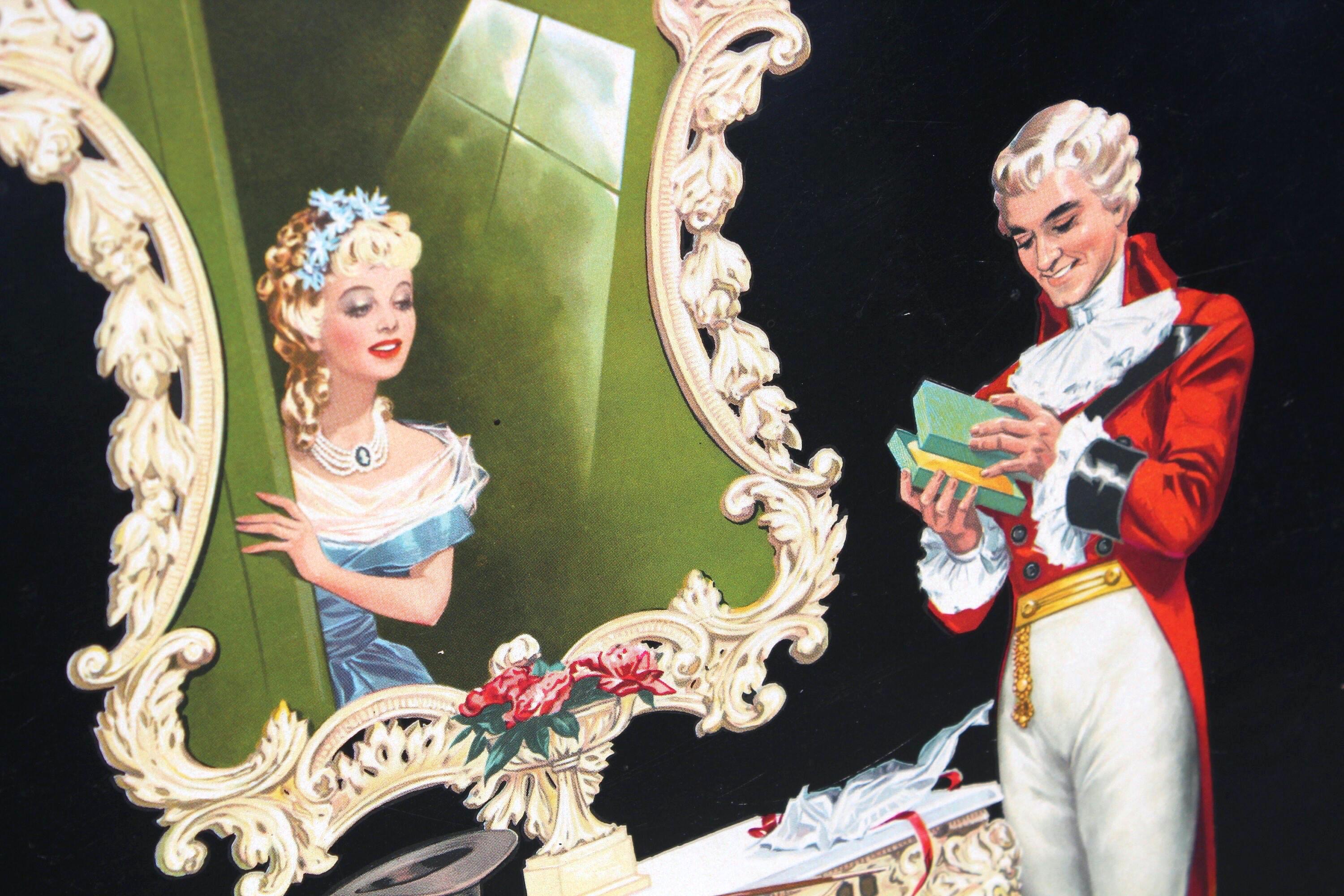 This lovely vibrant unique 1940s 50s storage box. Features a top lid with an illustrated of renascence mirror greeting couple! Great piece!