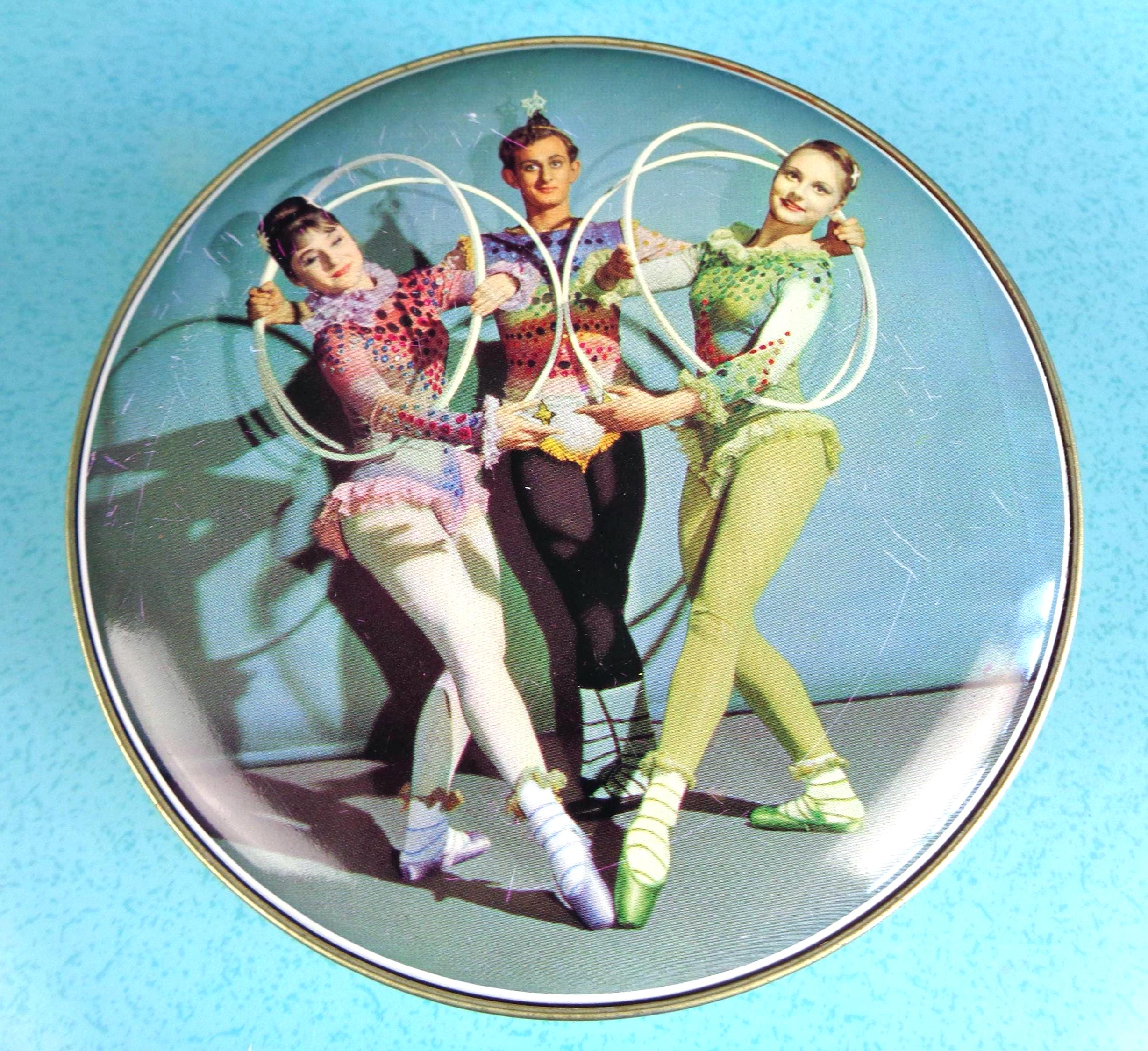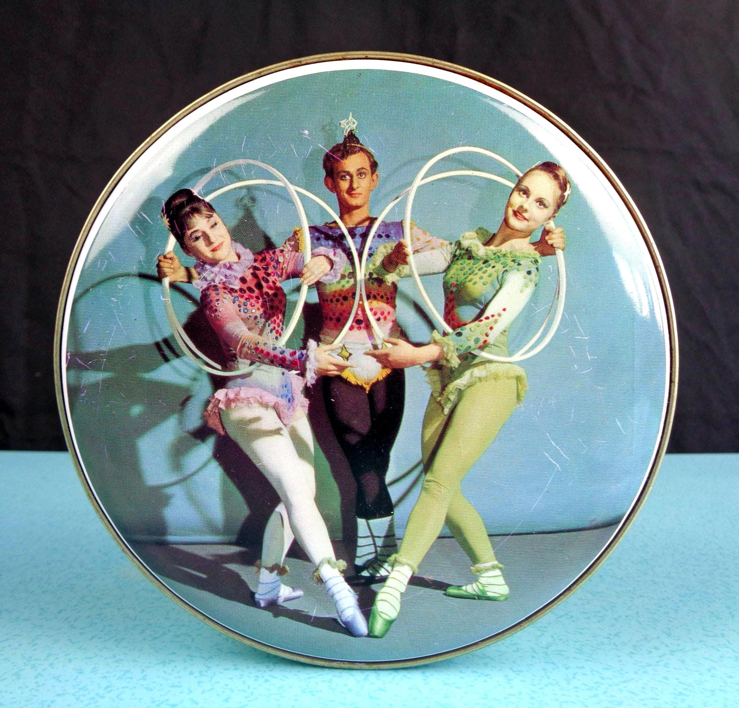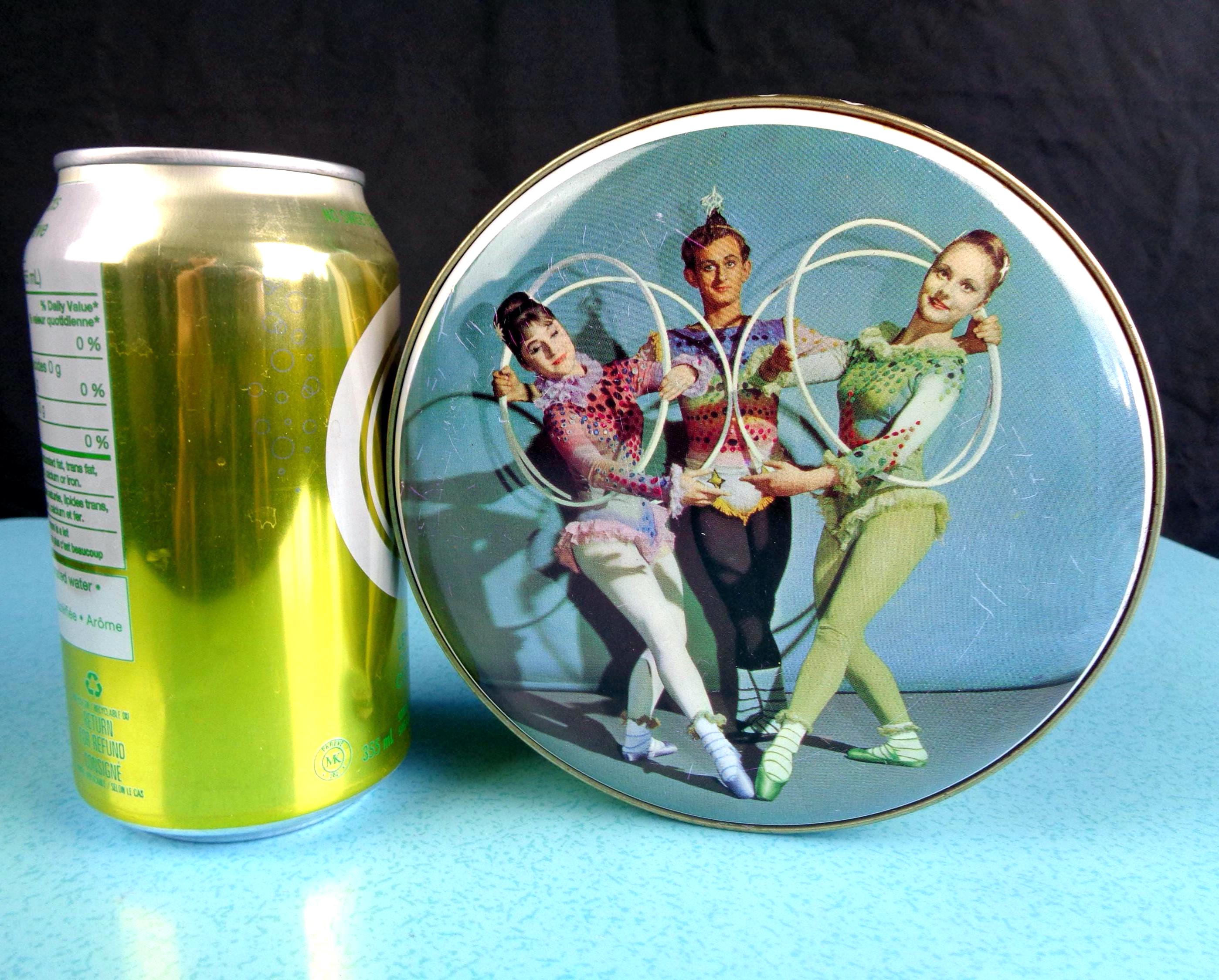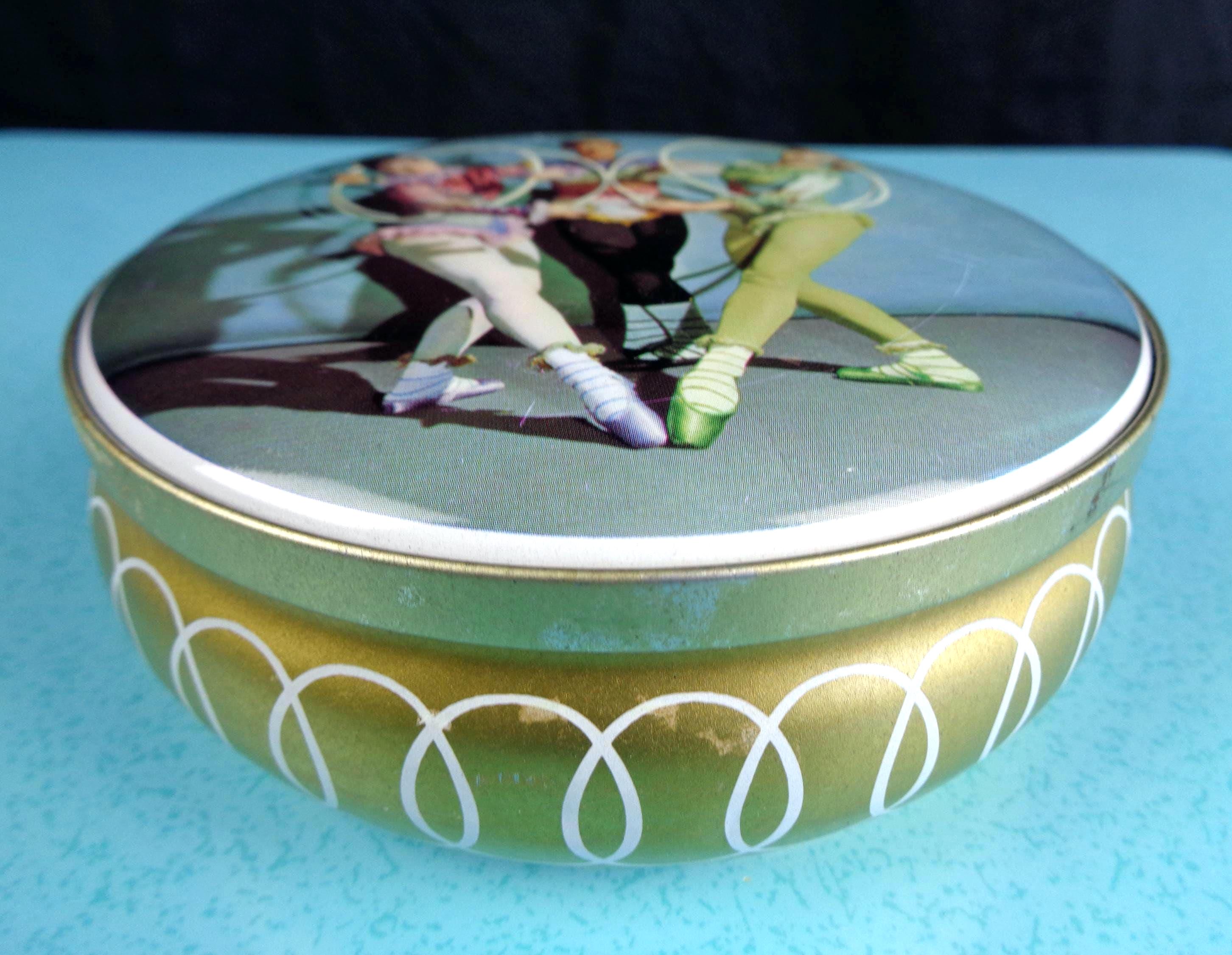 Features an enamel paint picture of 3 ballerina's and their costumes holding hula hoops posed on the front lid, with decorative rings that emulate the hula hoops thew ballerina are holding that are design along the edge! Great piece!