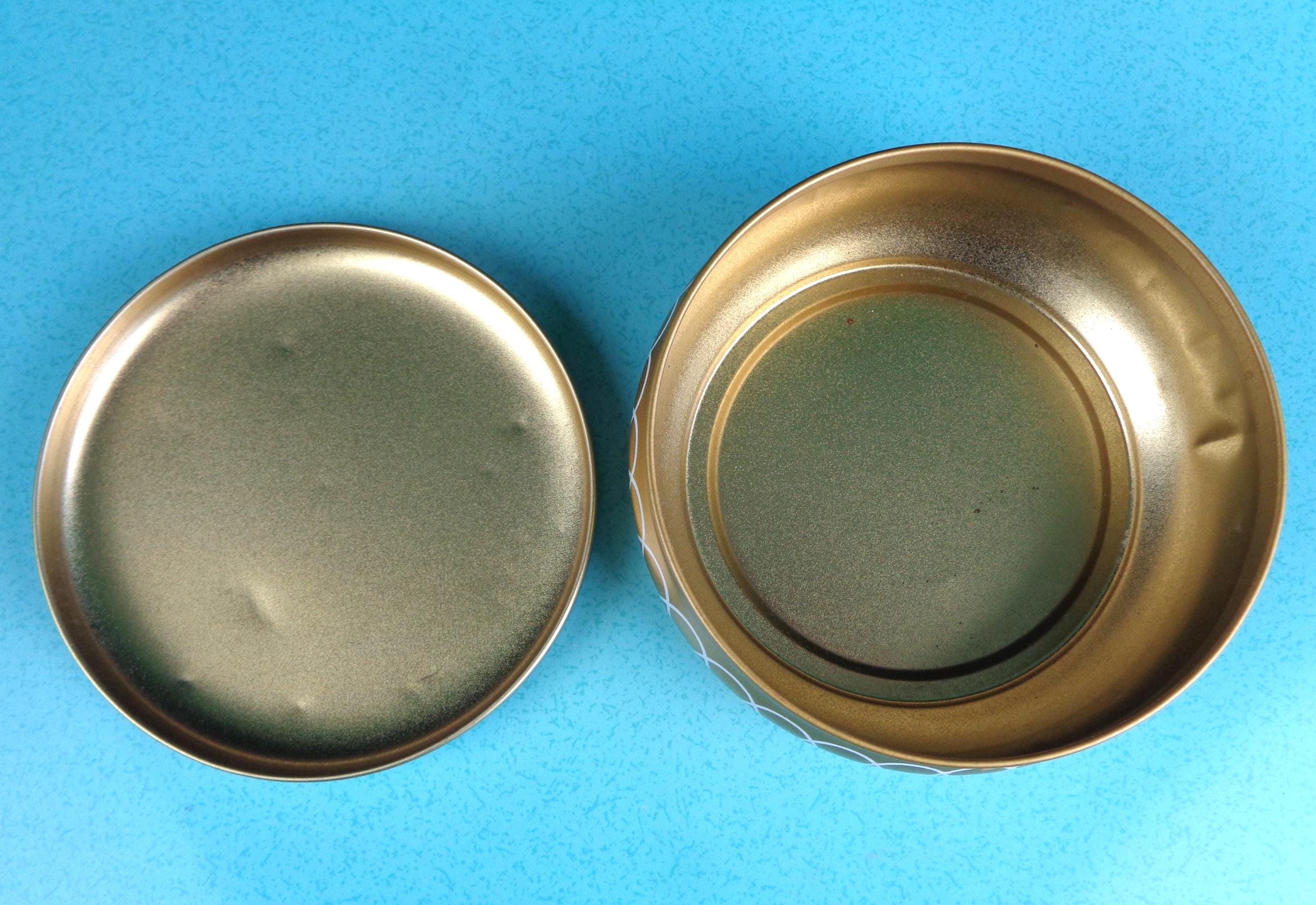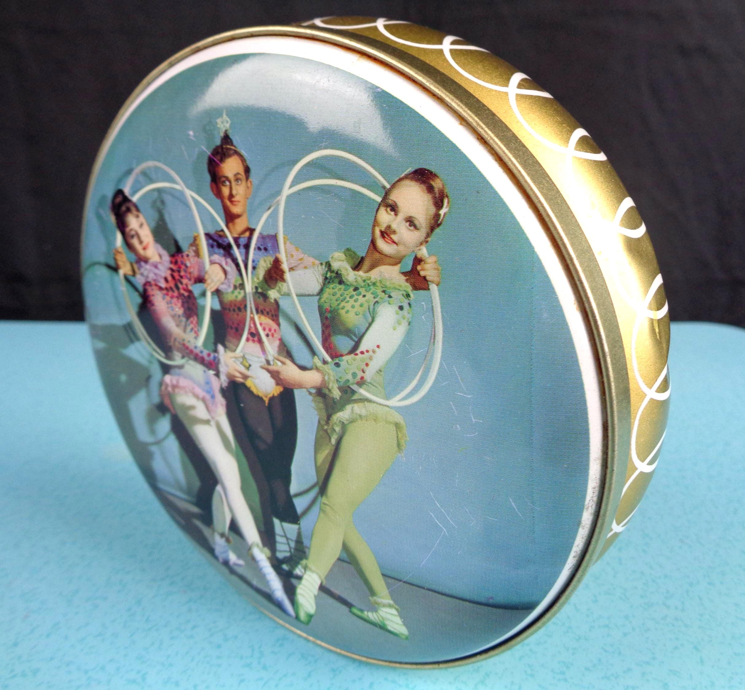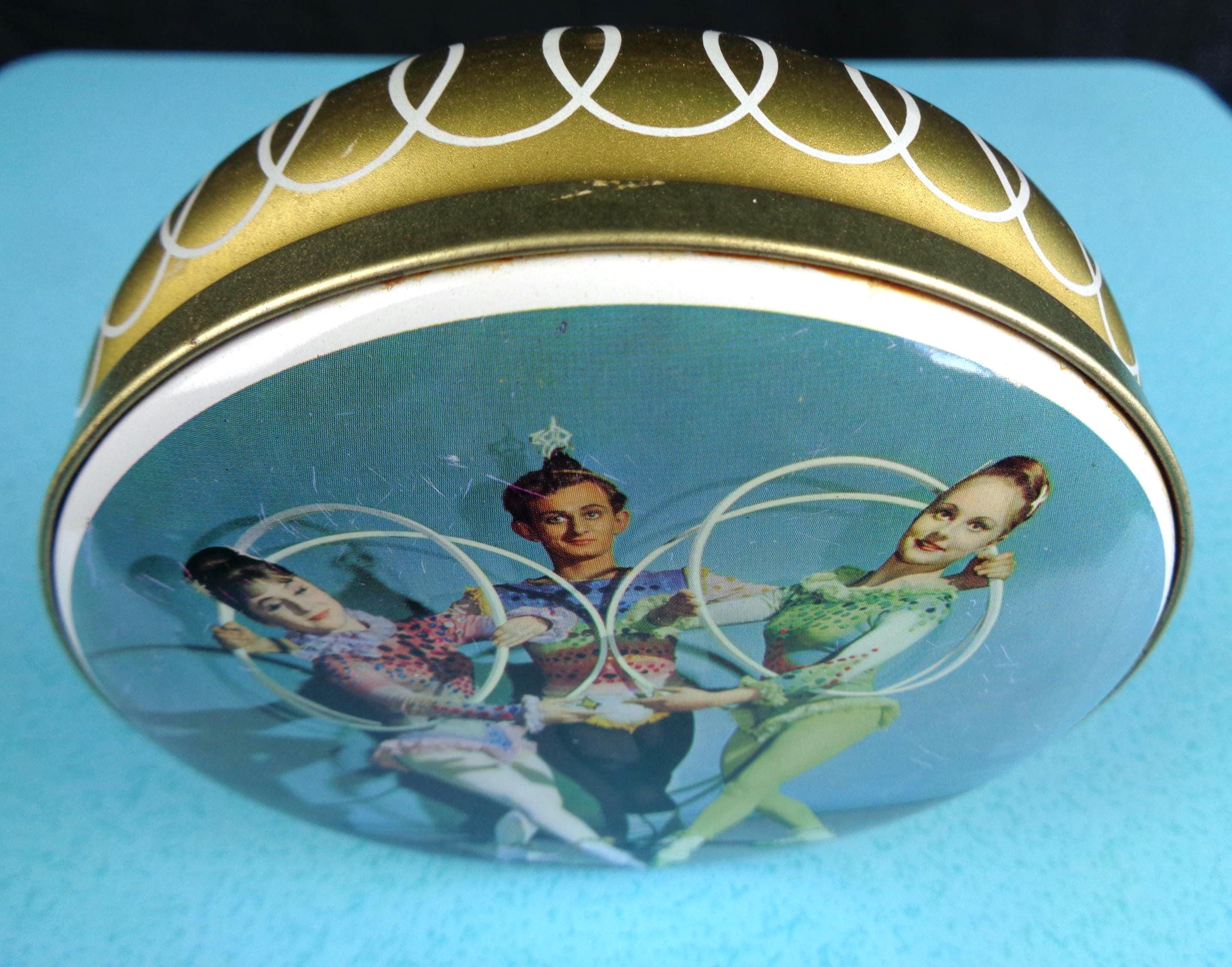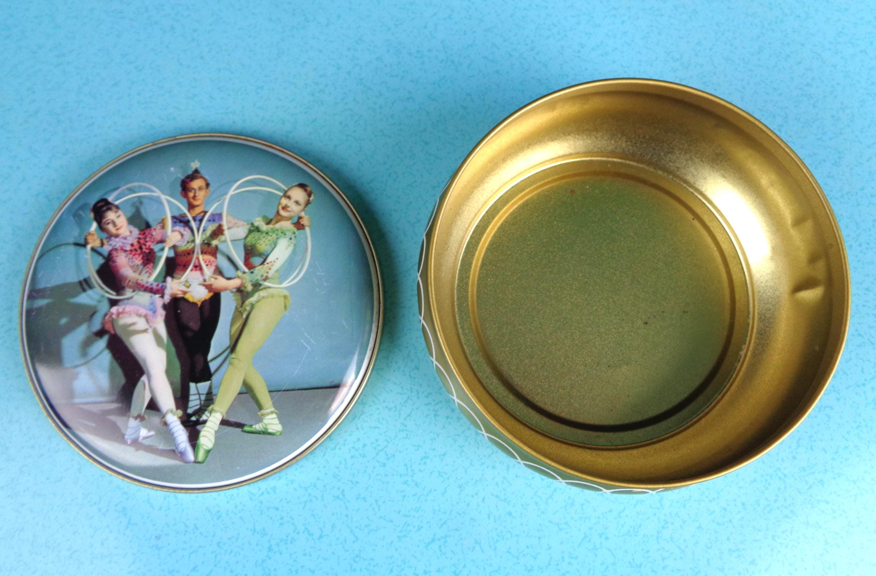 Features an enamel paint picture of 3 ballerina's and their costumes holding hula hoops posed on the front lid, with decorative rings that emulate the hula hoops thew ballerina are holding that are design along the edge! Great piece!