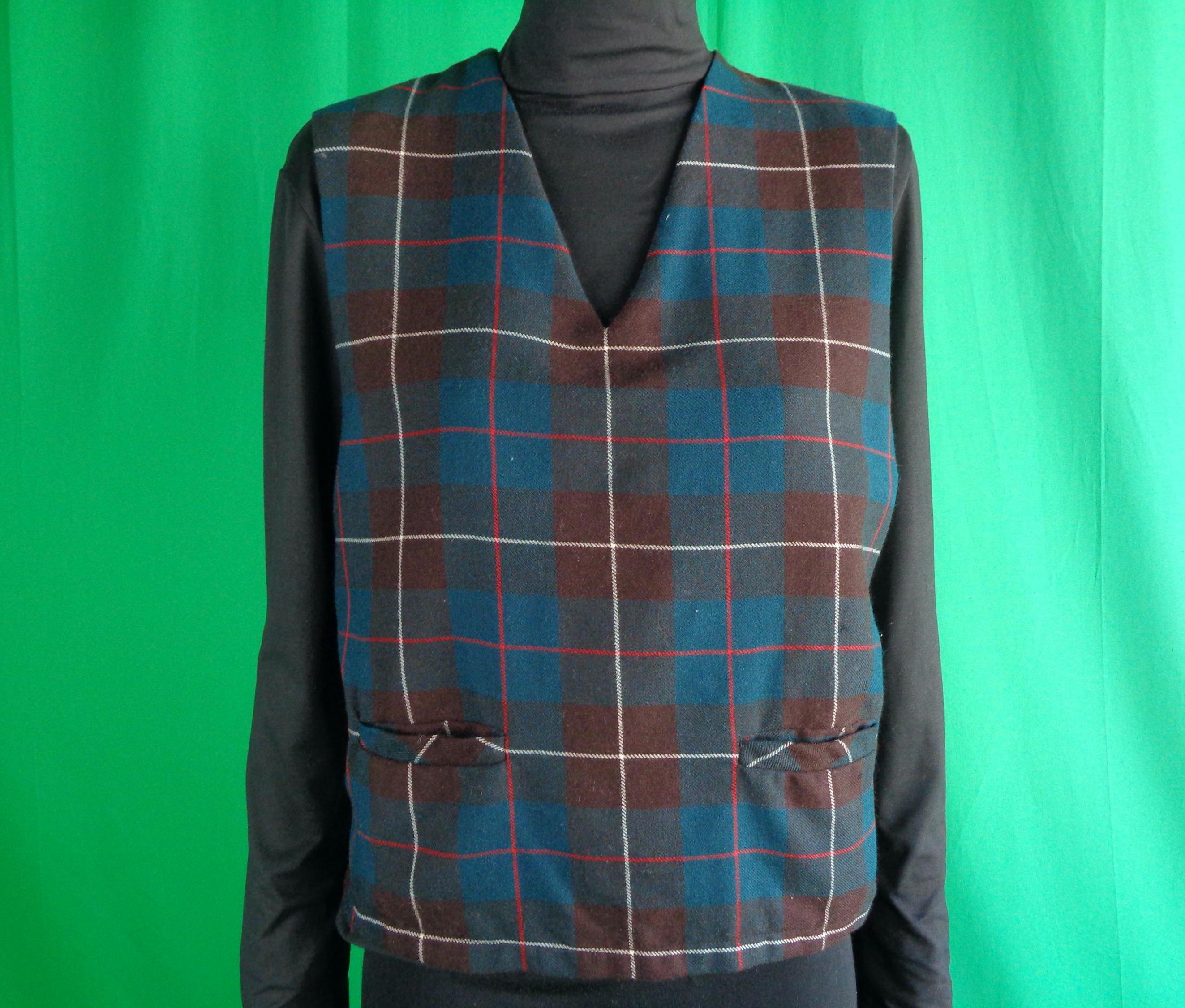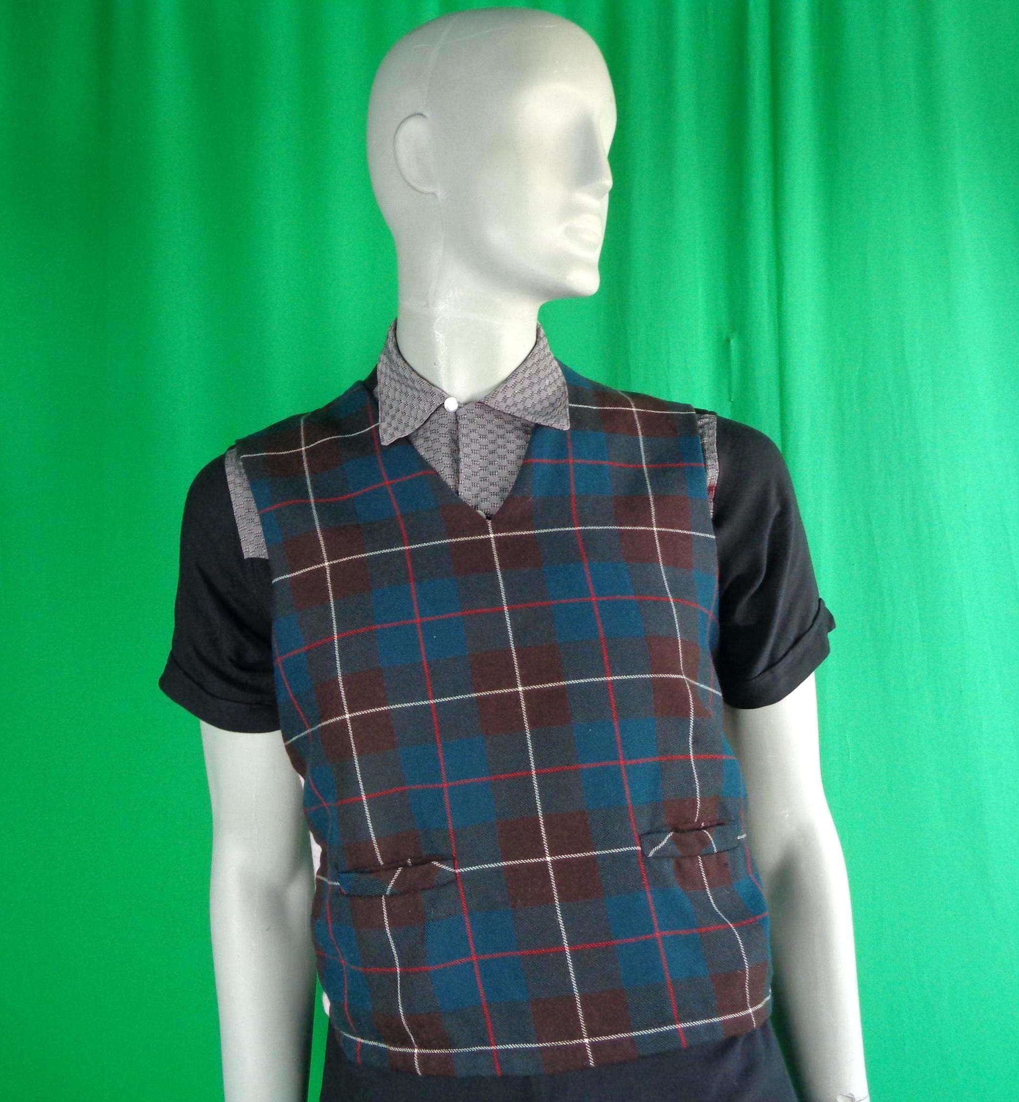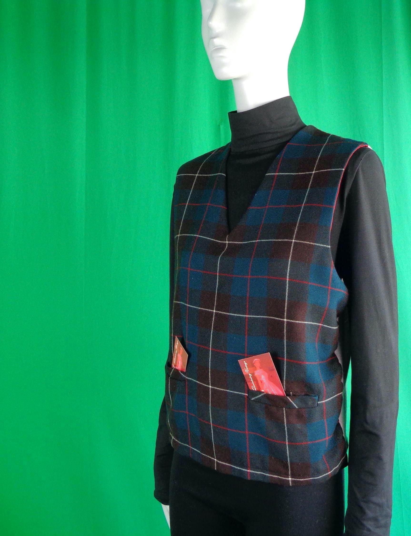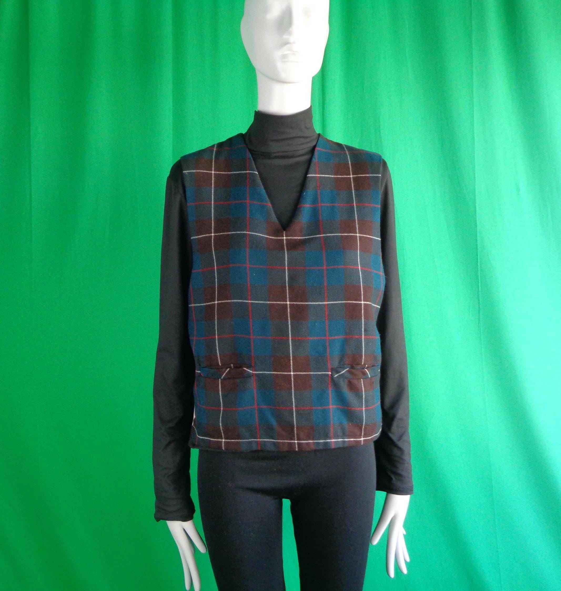 Features a deep V neckline, two-tone with a knitwear back with satin interior, plaid, tartan chest with soft material. fabric throughout! Great compliment piece!