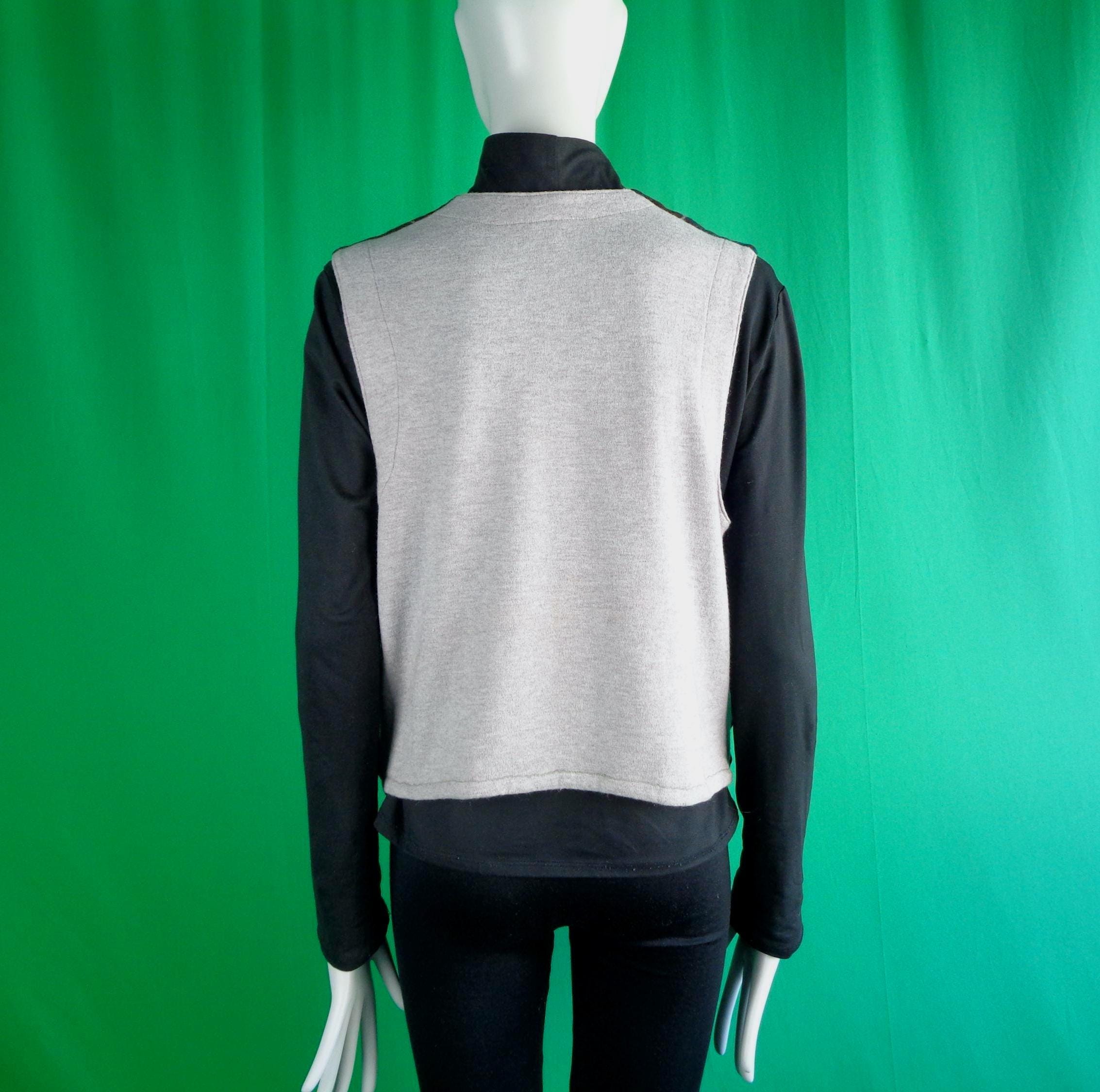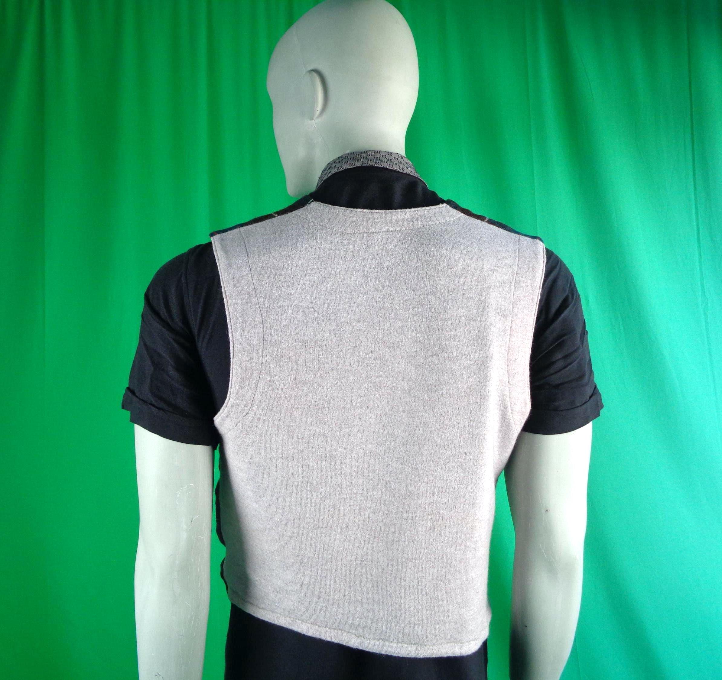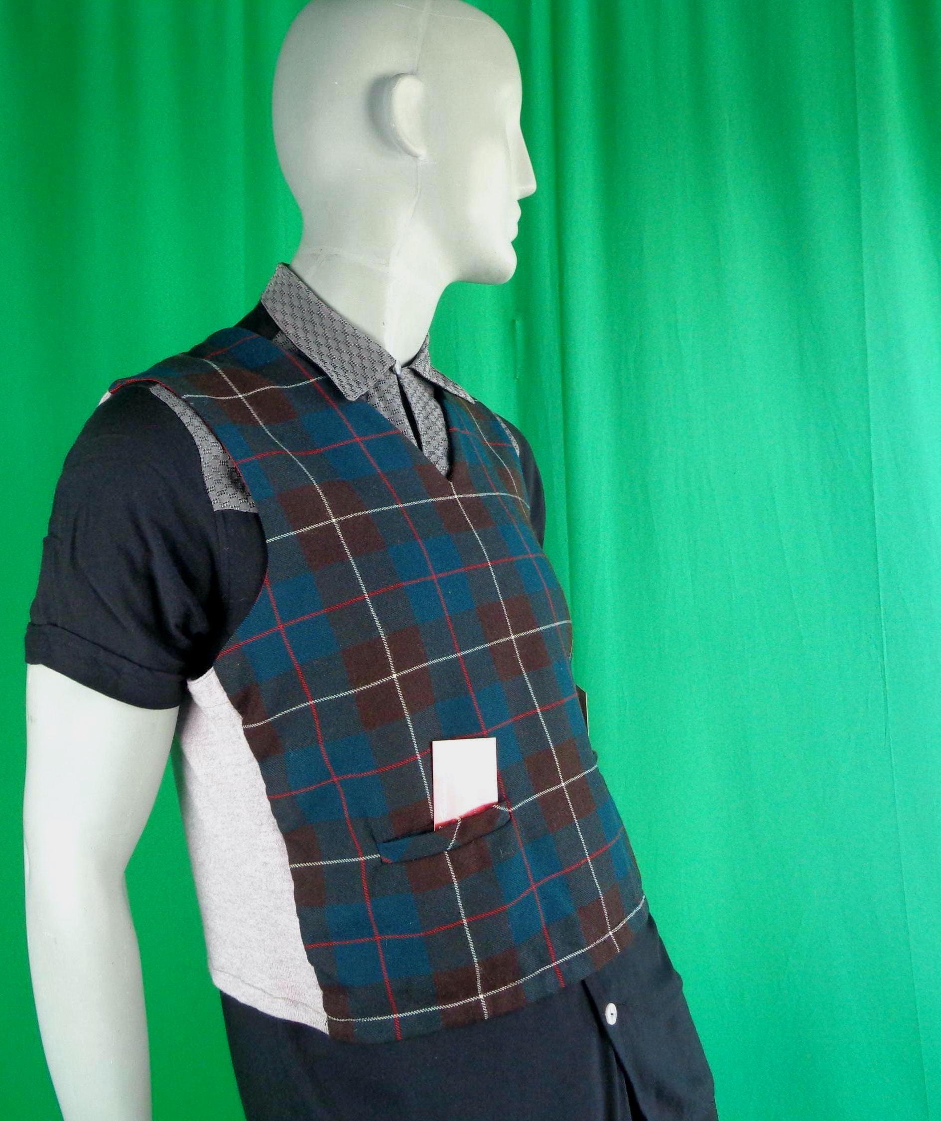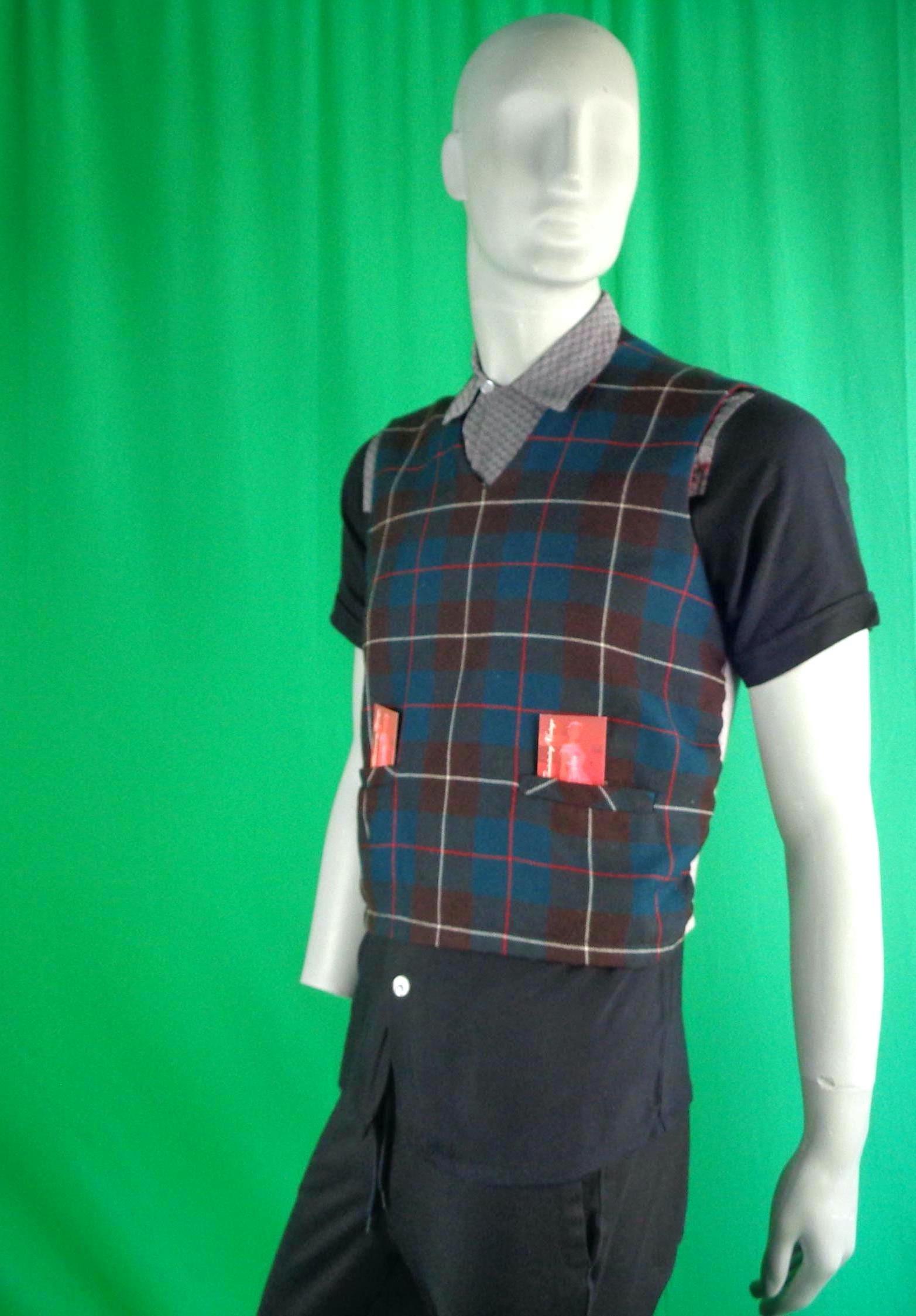 Features a deep V neckline, two-tone with a knitwear back with satin interior, plaid, tartan chest with soft material. fabric throughout! Great compliment piece!