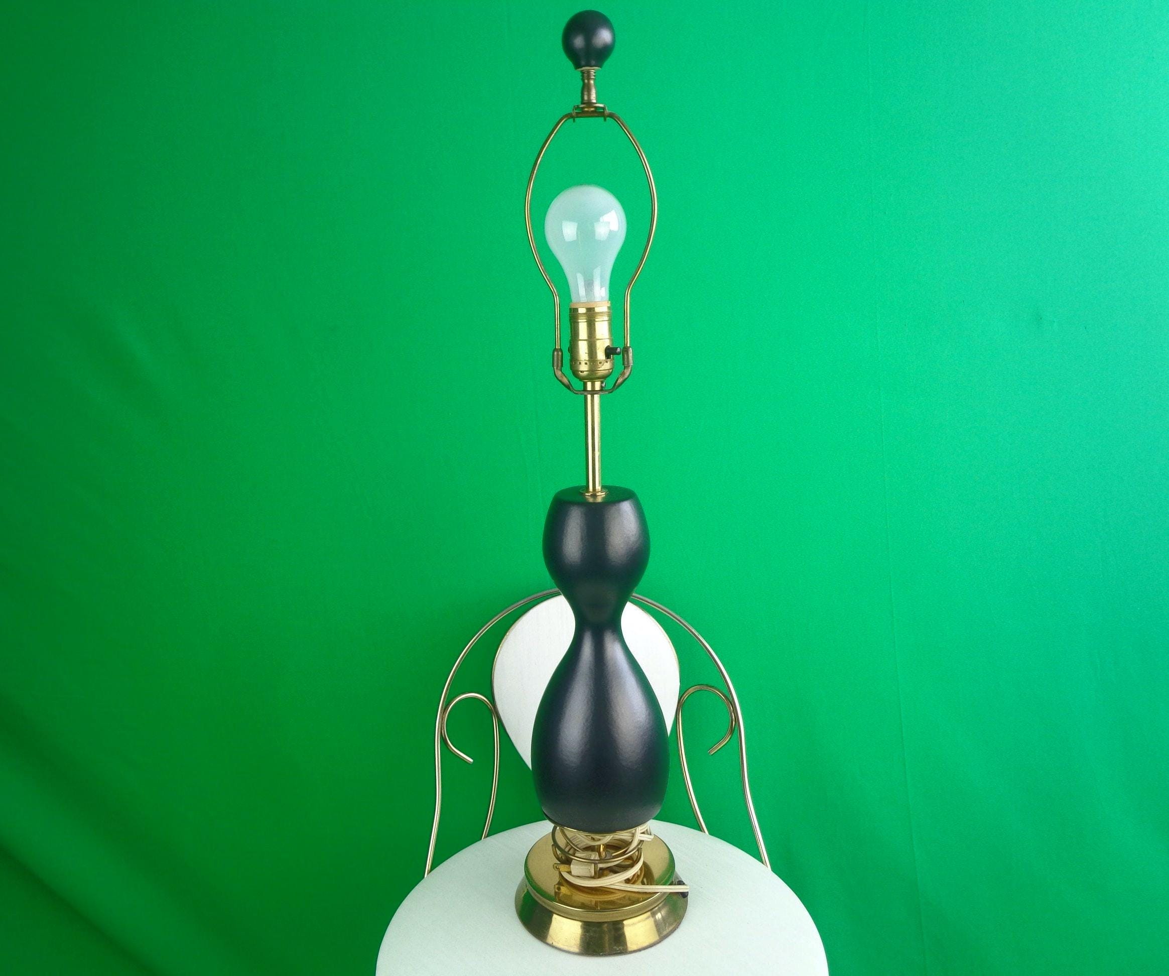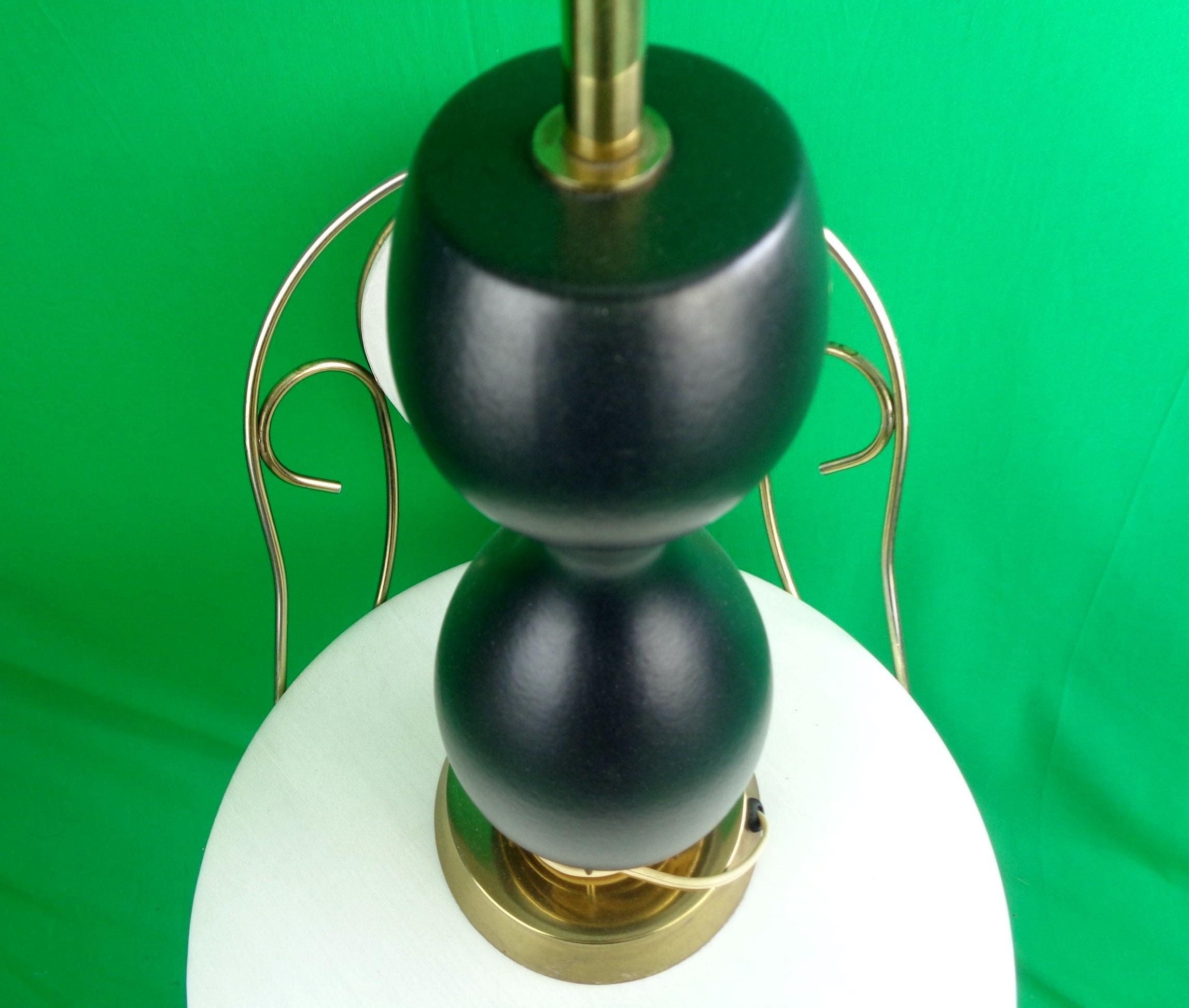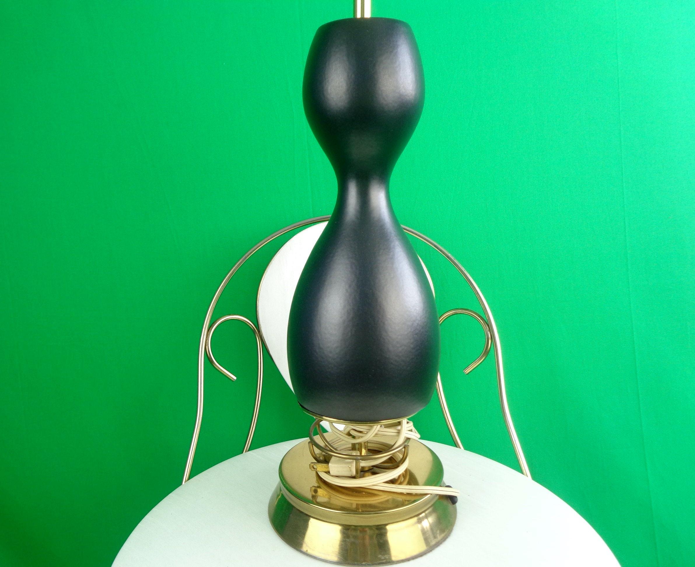 This lovely unique 1950s 60s retro table lamp tested Works! Features an hour glass, bowling pin base shape, with 3 decorative decal on one side, a brass ornate base! Canadian American voltage! Greta piece!