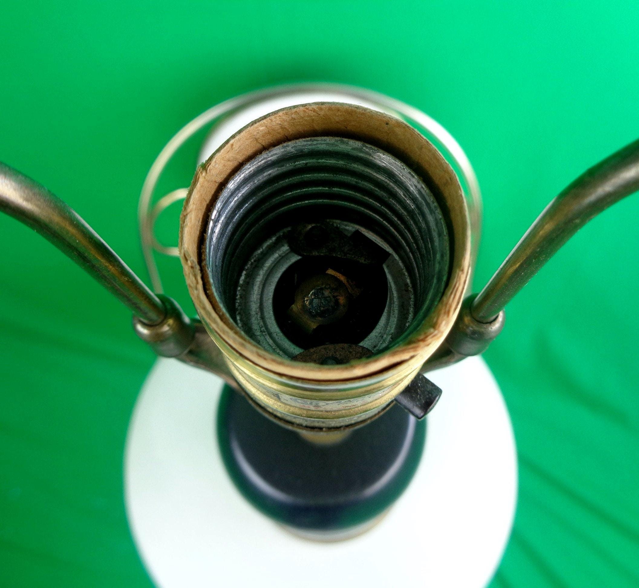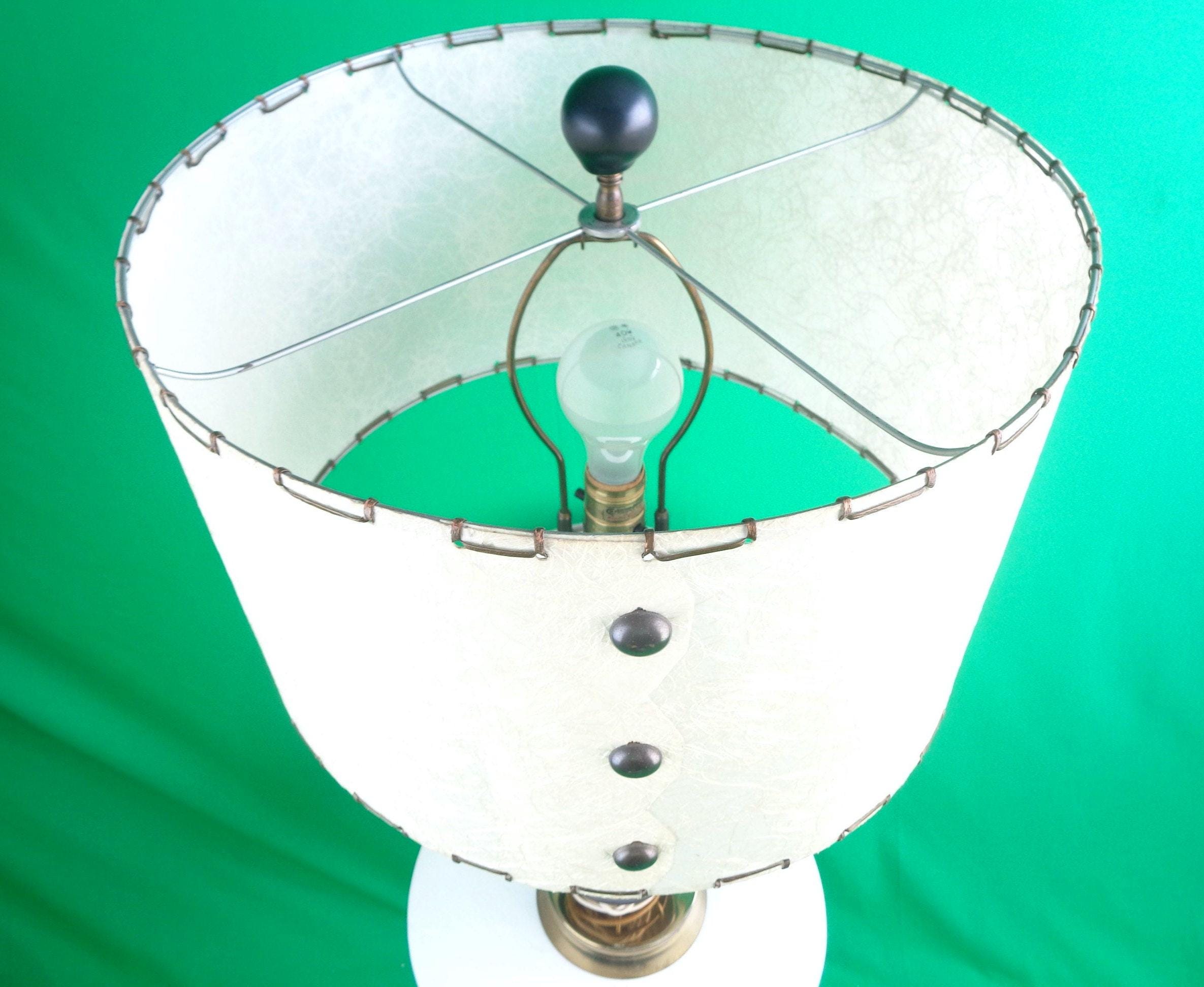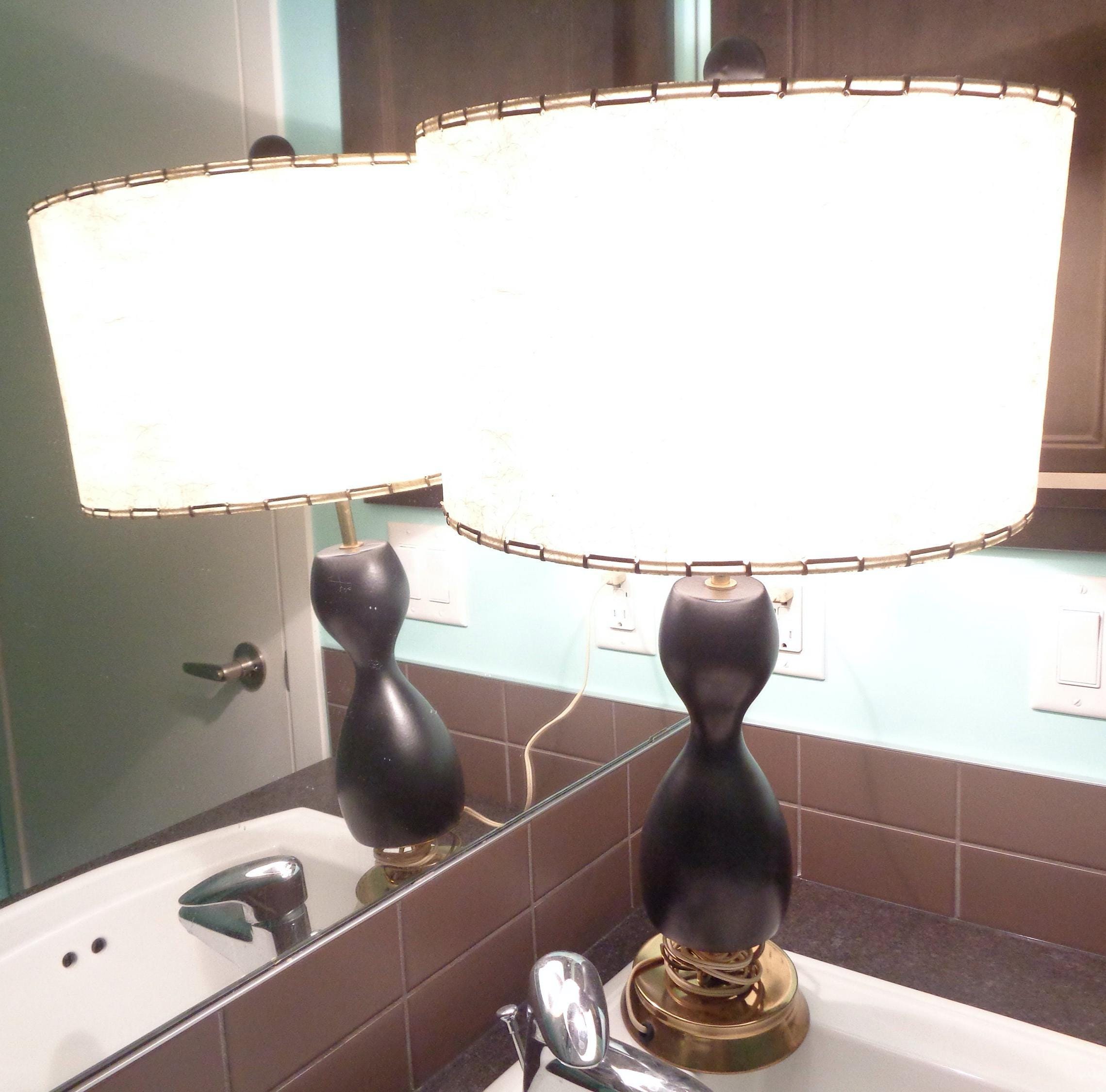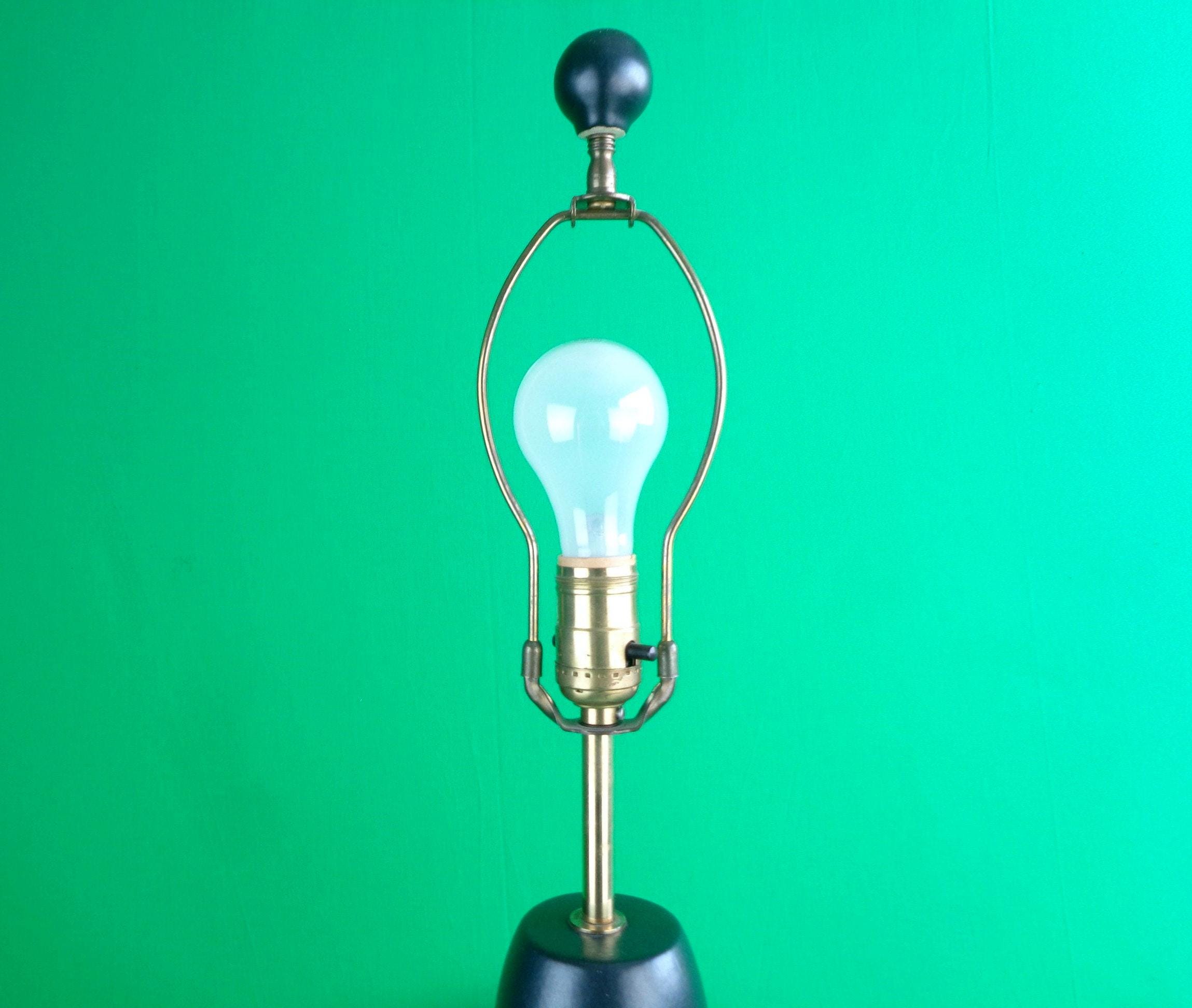 This lovely unique 1950s 60s retro table lamp tested Works! Features an hour glass, bowling pin base shape, with 3 decorative decal on one side, a brass ornate base! Canadian American voltage! Greta piece!