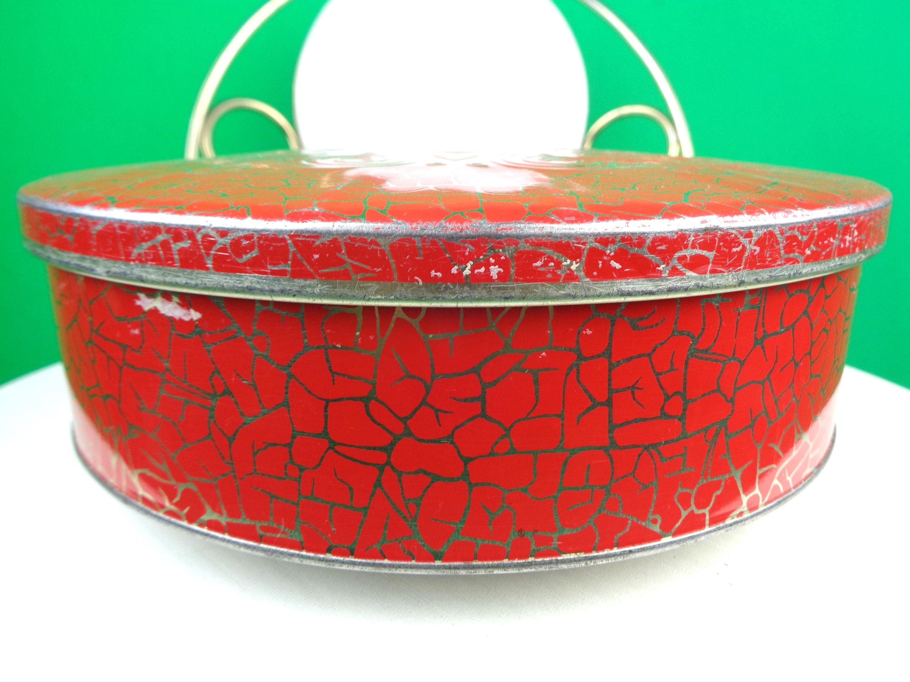 This lovely unique 1940s 50s red abstract tin. Features a top lid with an abstract heart crown design and layered bottom throughout! Great piece!