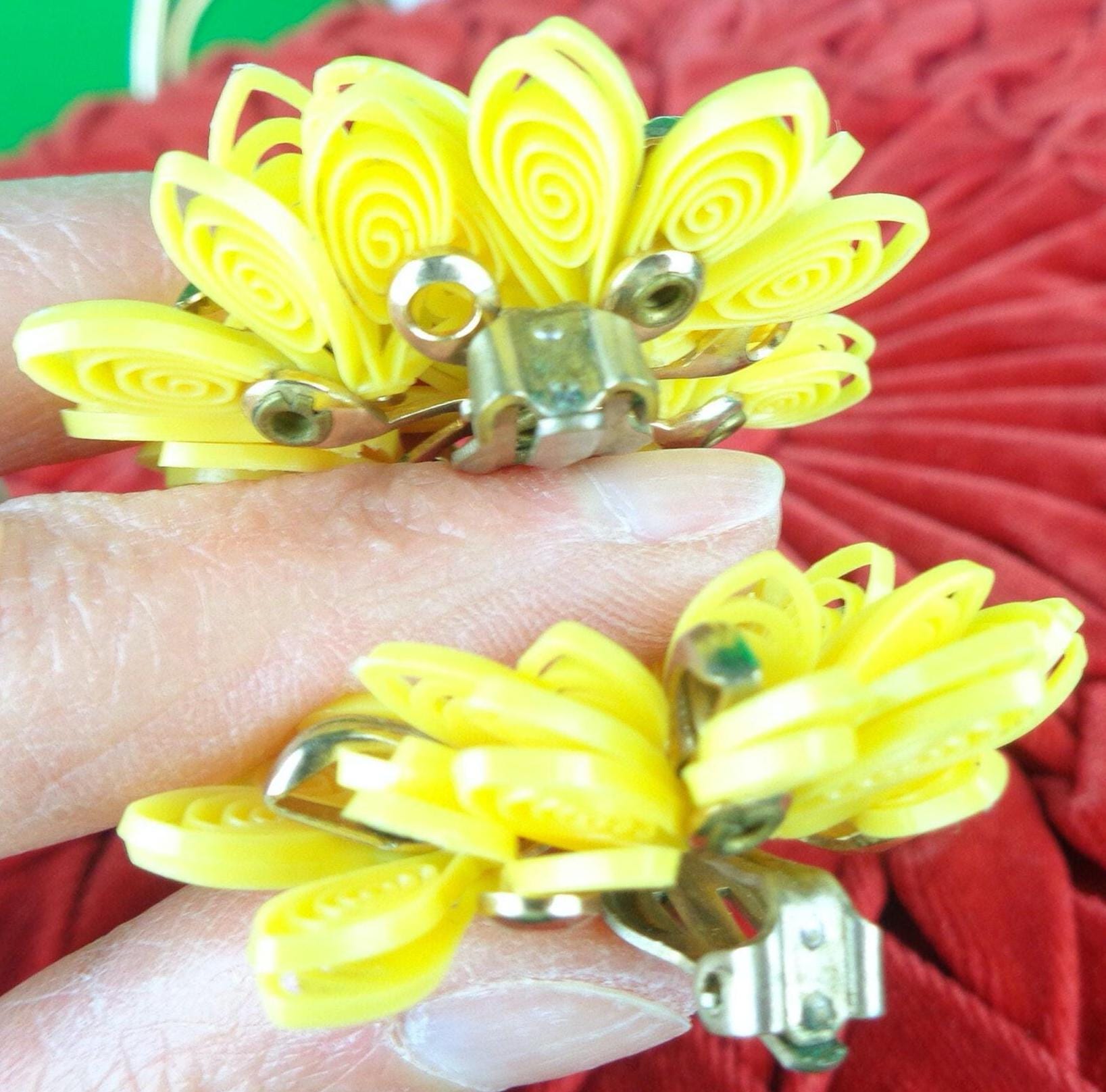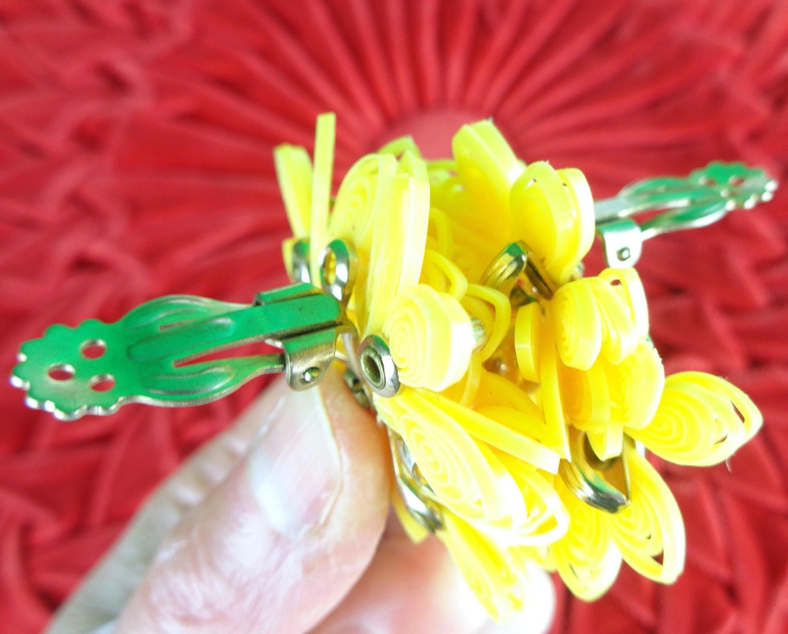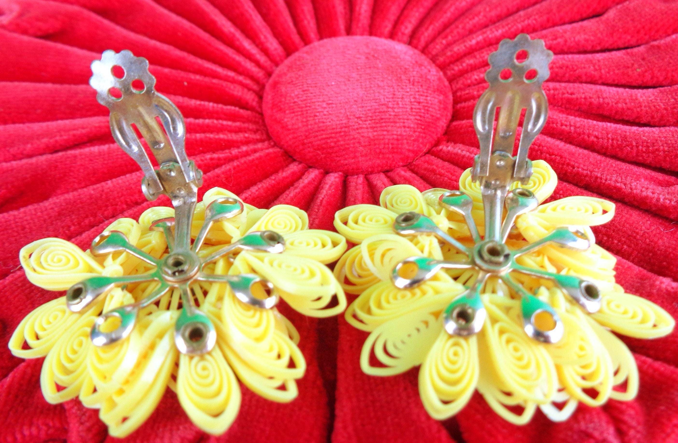 These lovely stylish vibrant 1950s 60s handcrafted retro clip on earrings. Features 4 decorative decals with a cluster of beading and layered with intricate looped detailing, soft material throughout! Greta piece!