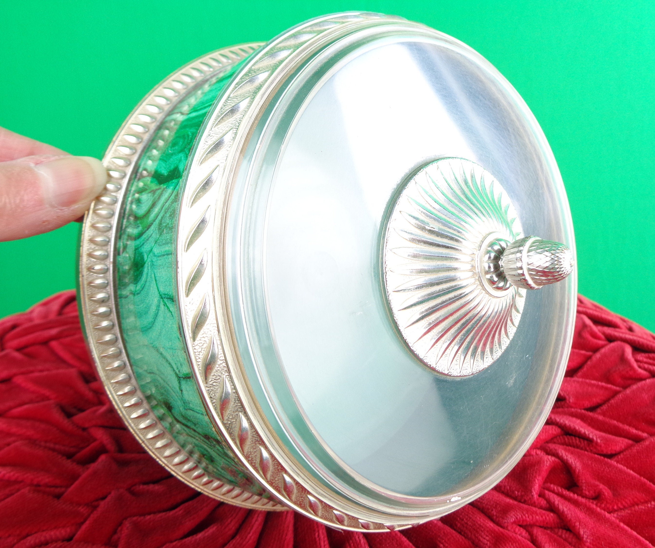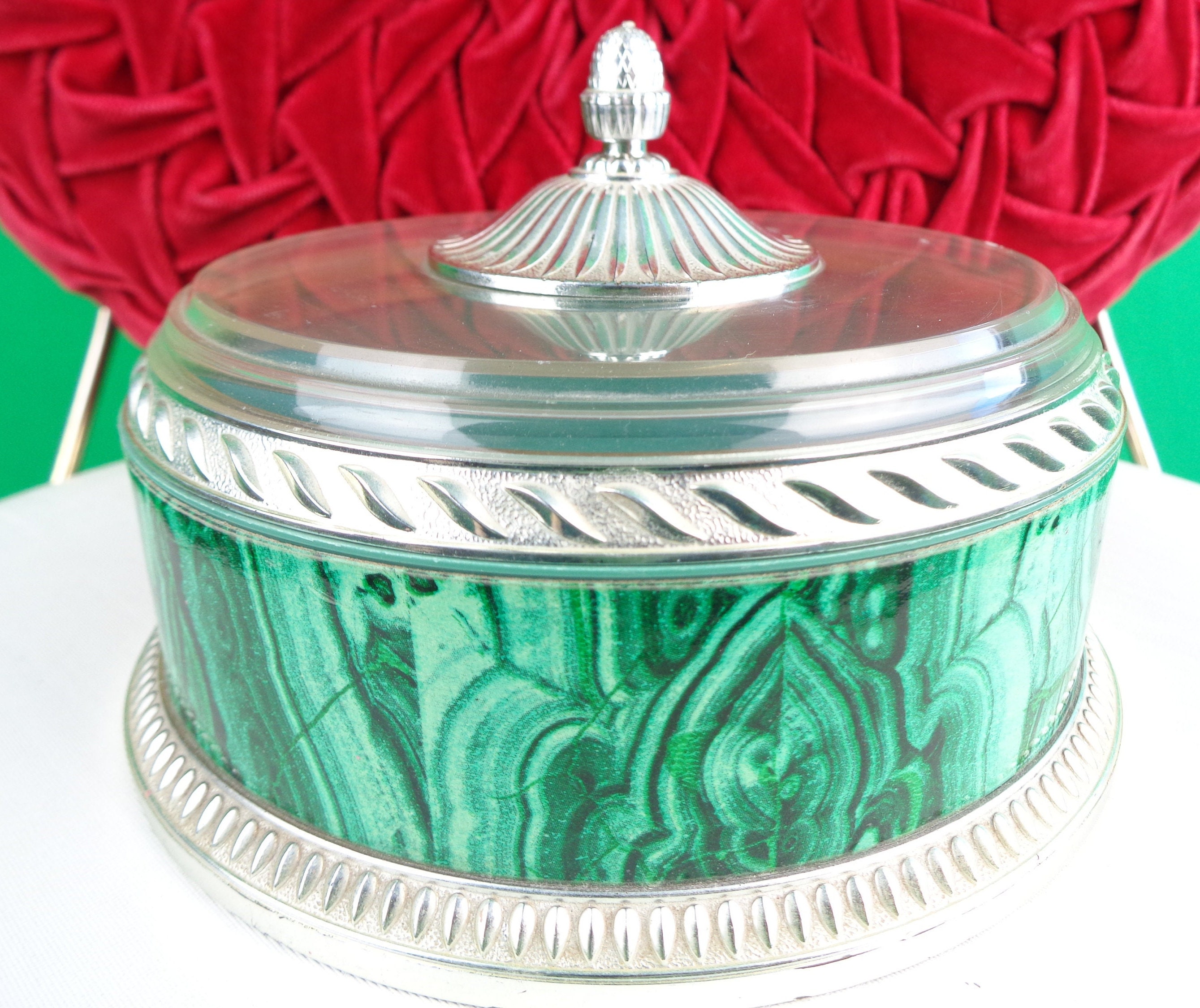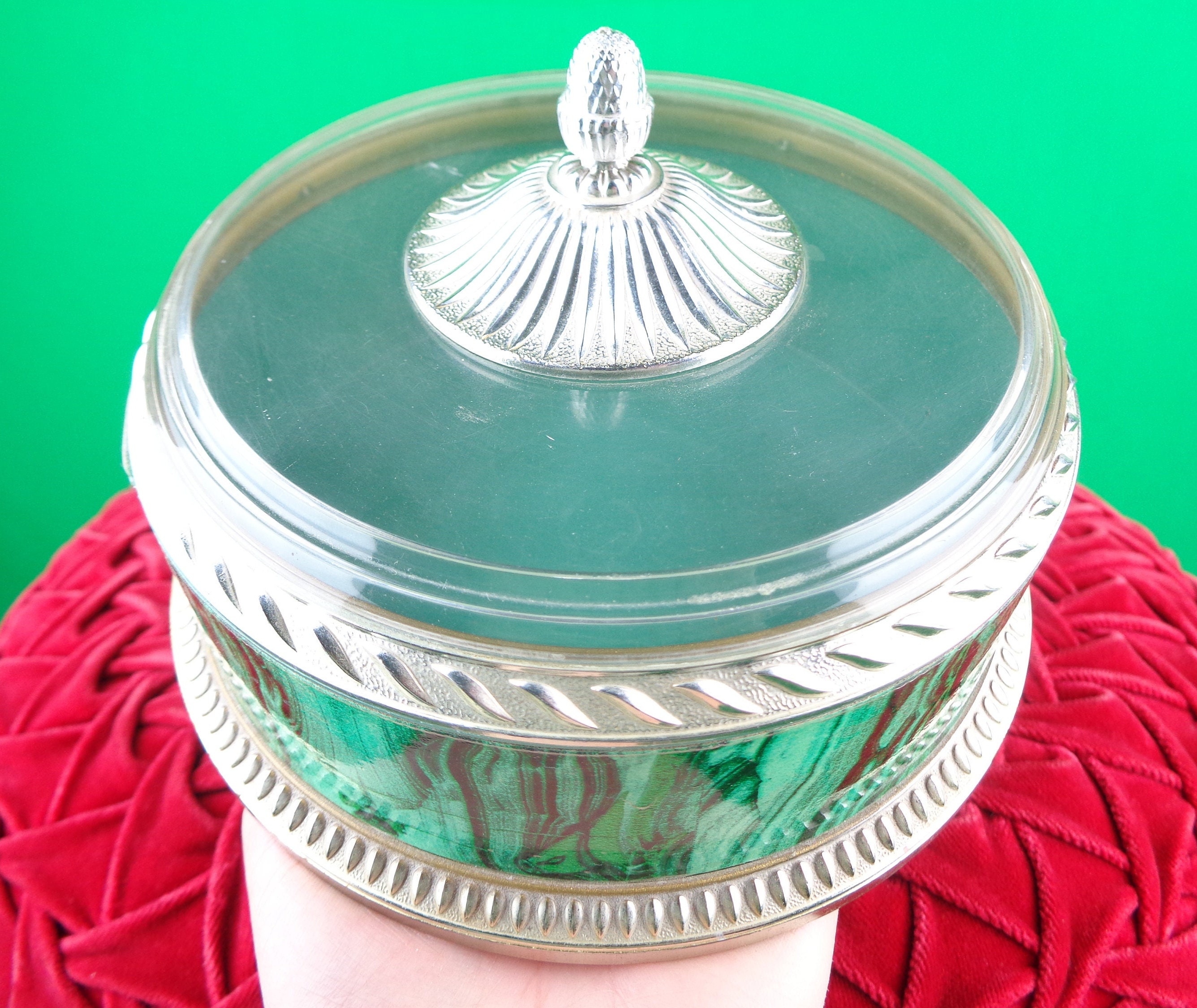 This lovely unique 1960s 70s retro storage lid container, trinket, jewelry powder box. Features a decorative pine cone top lid with a clear dome, top bottom decorative pattern, design edges and marble stripe, swirl panel! Great piece!