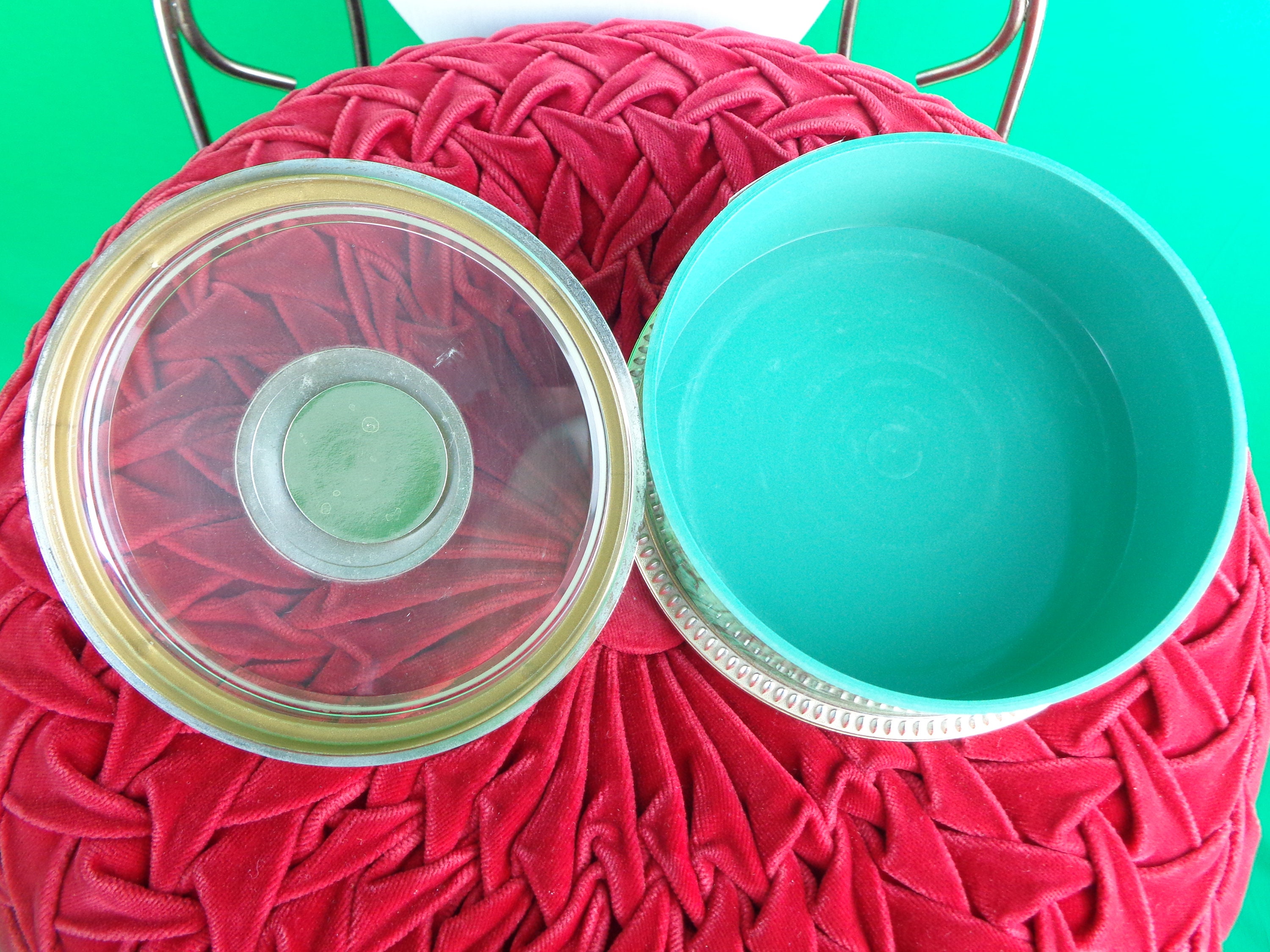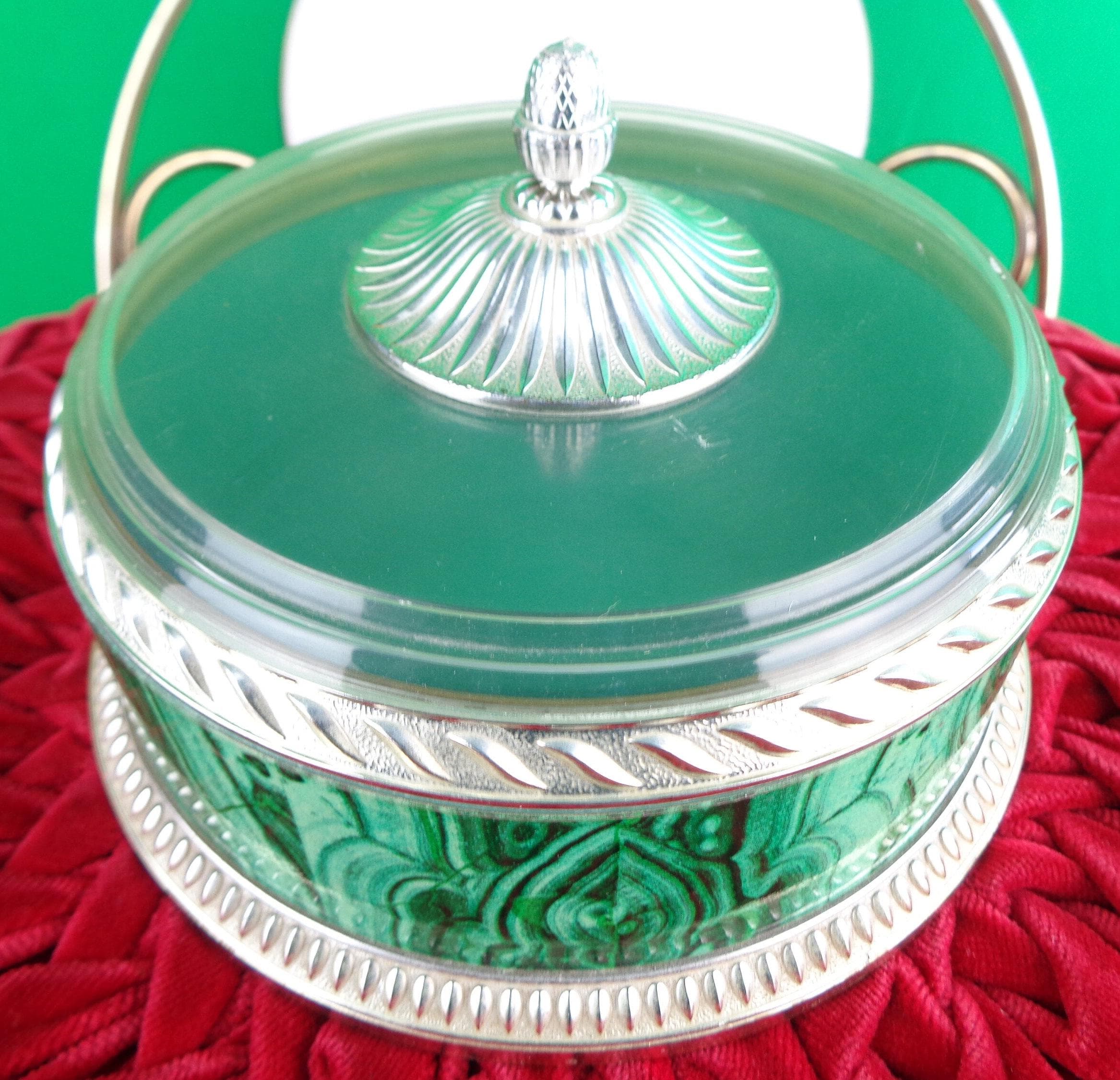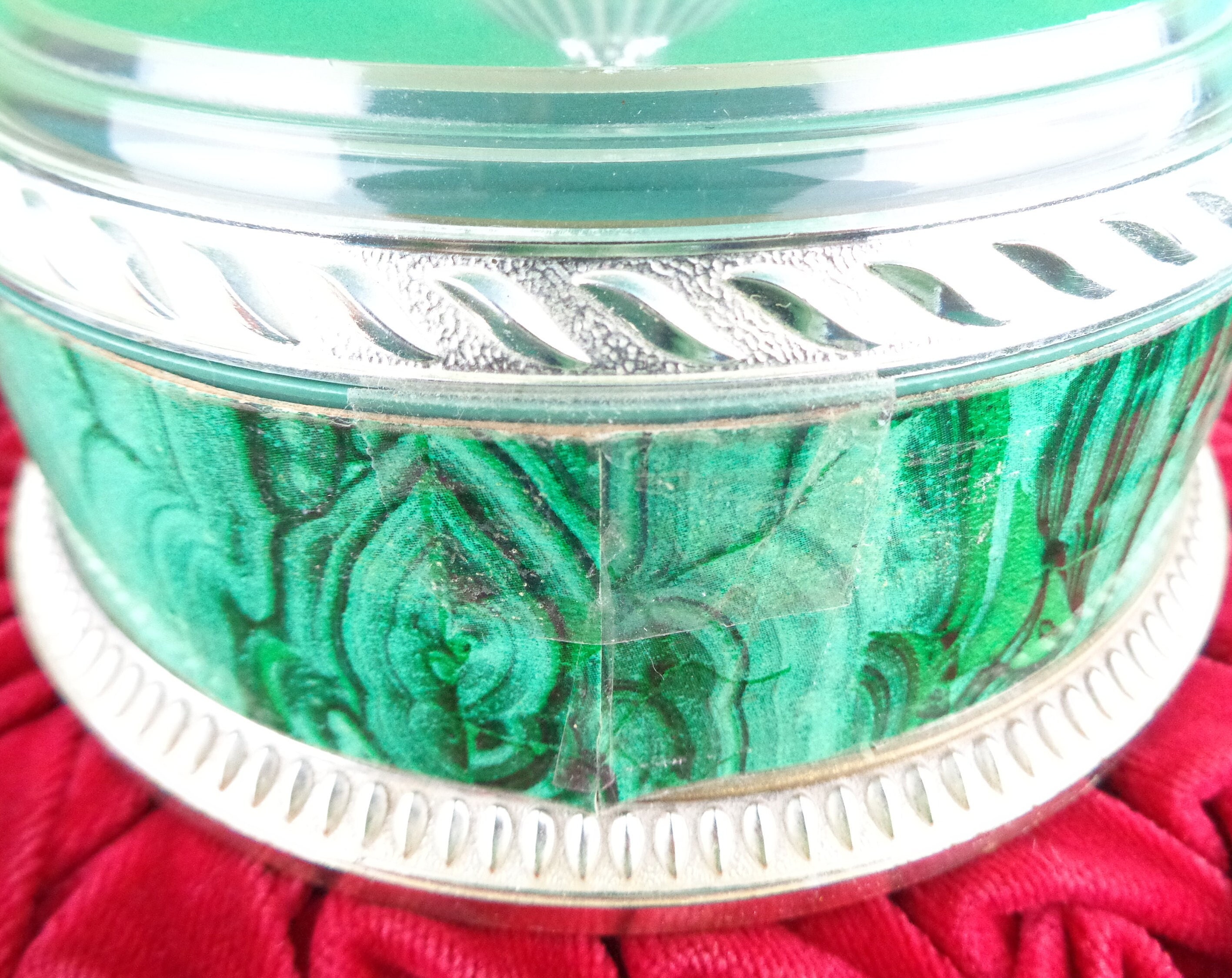 This lovely unique 1960s 70s retro storage lid container, trinket, jewelry powder box. Features a decorative pine cone top lid with a clear dome, top bottom decorative pattern, design edges and marble stripe, swirl panel! Great piece!