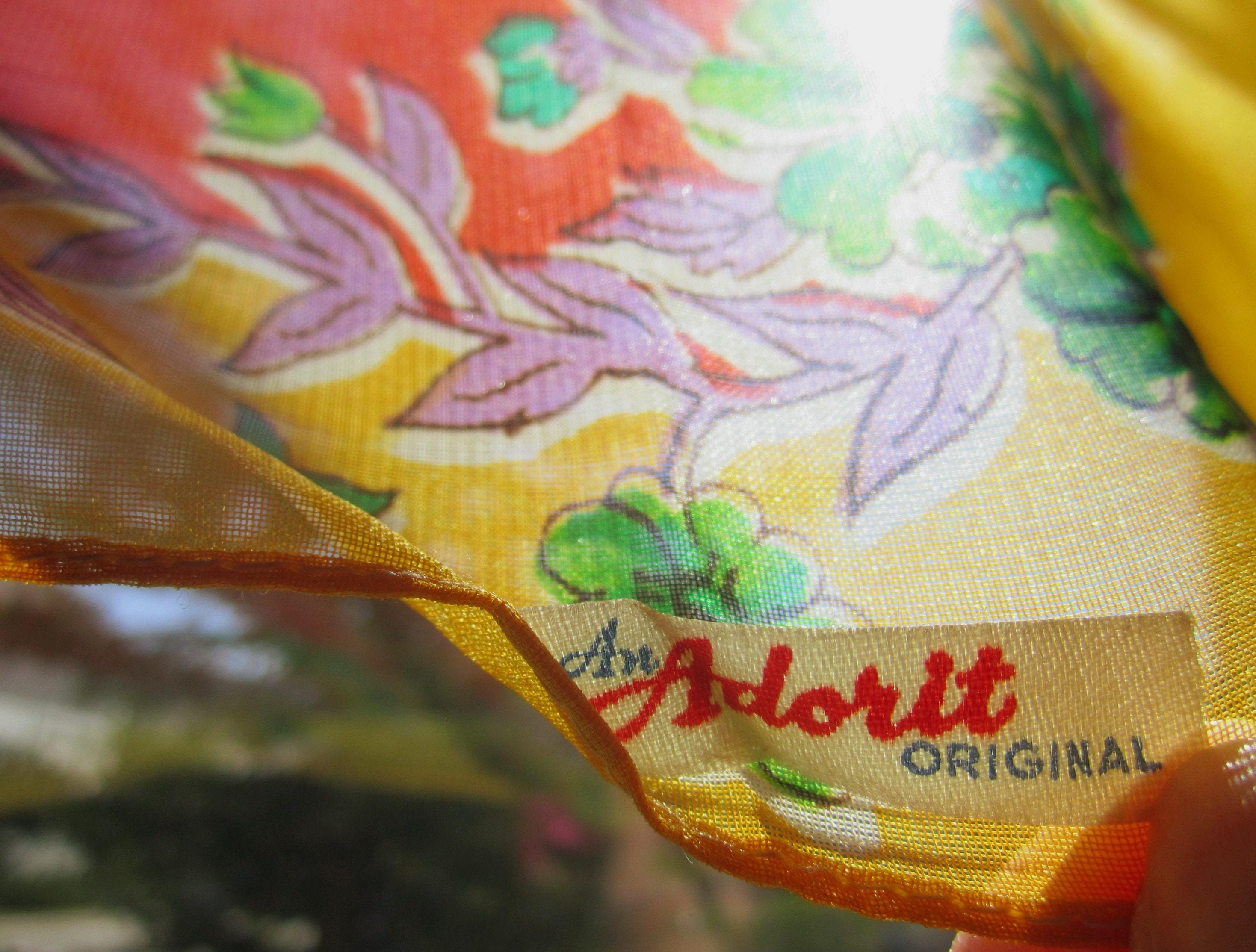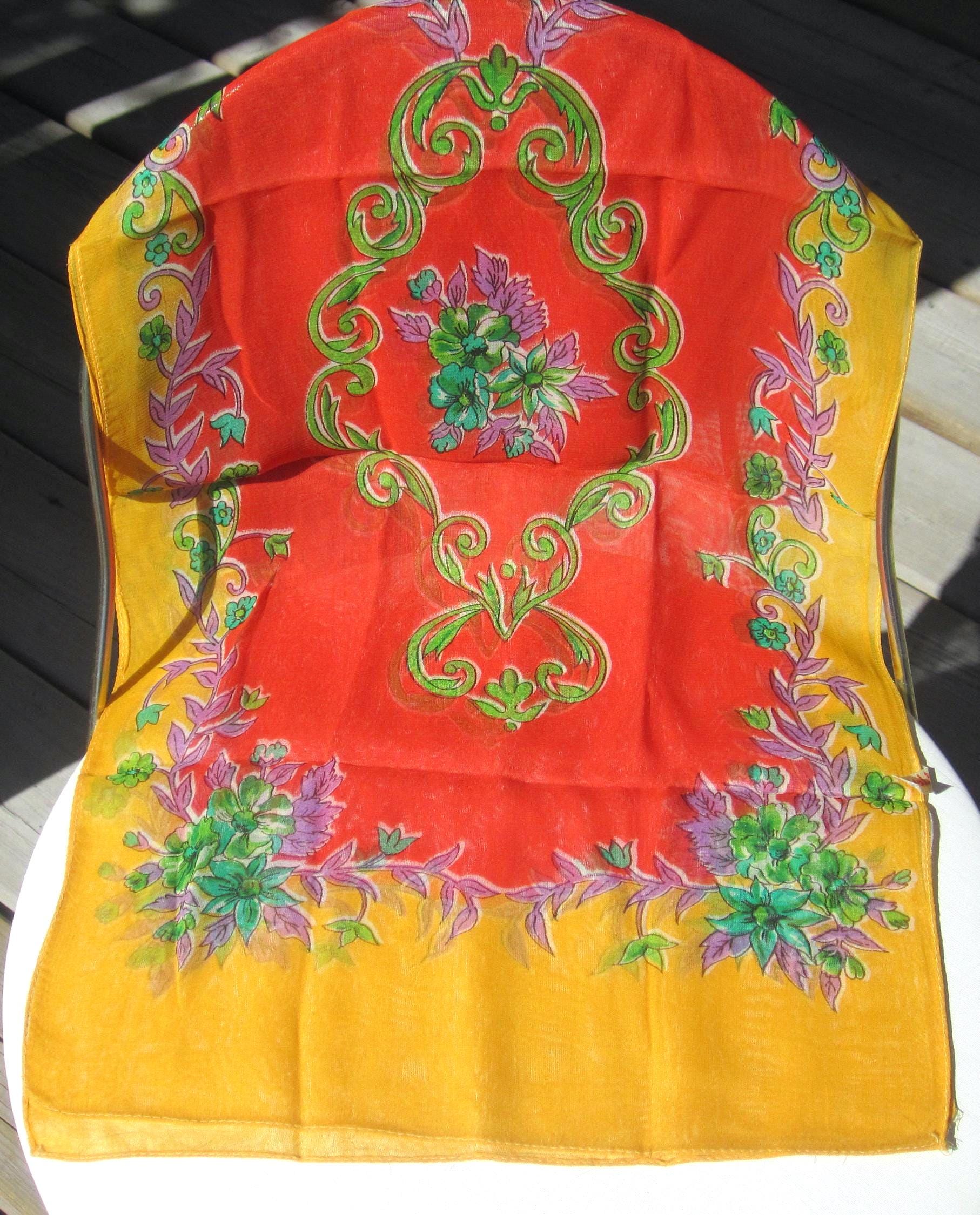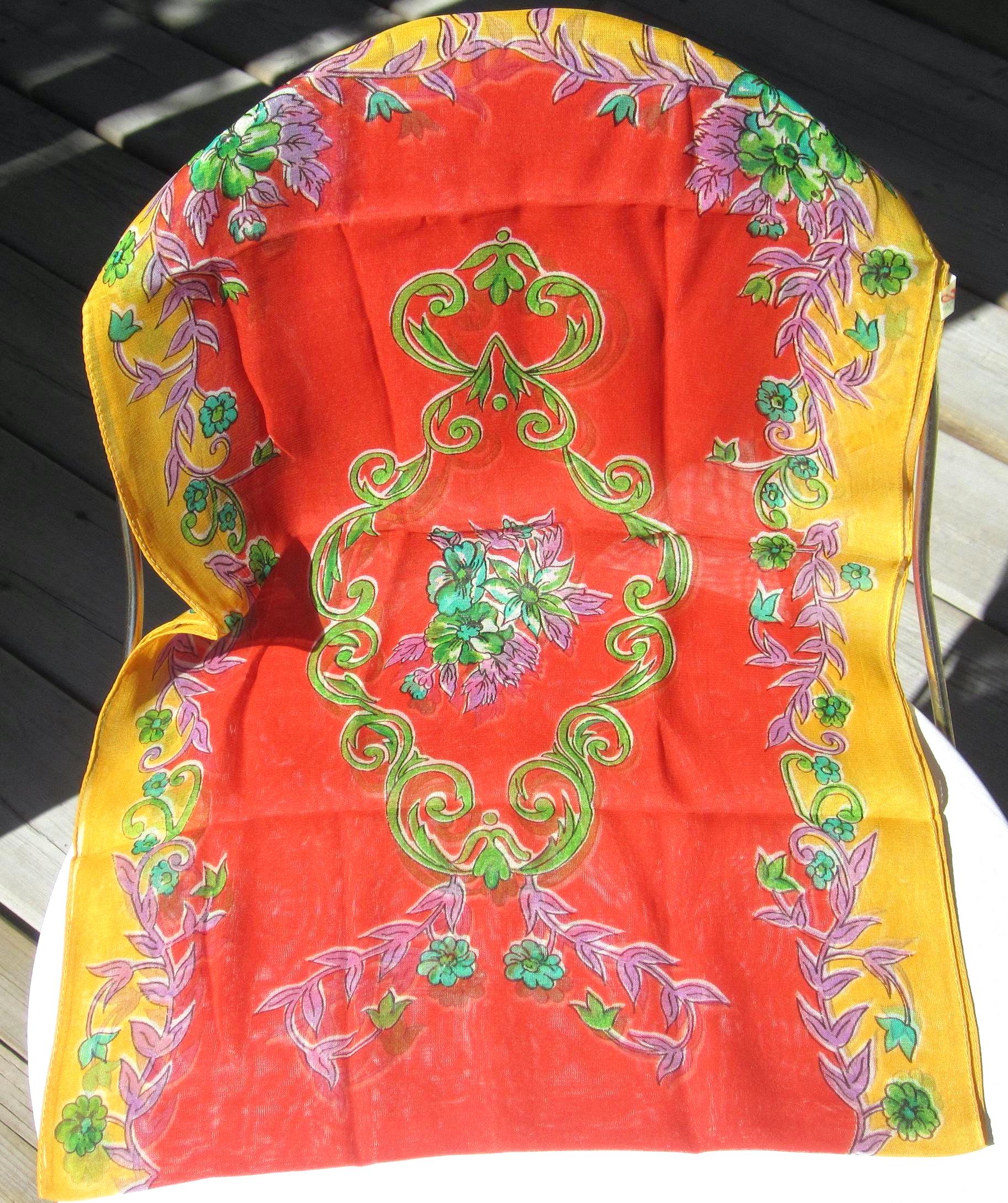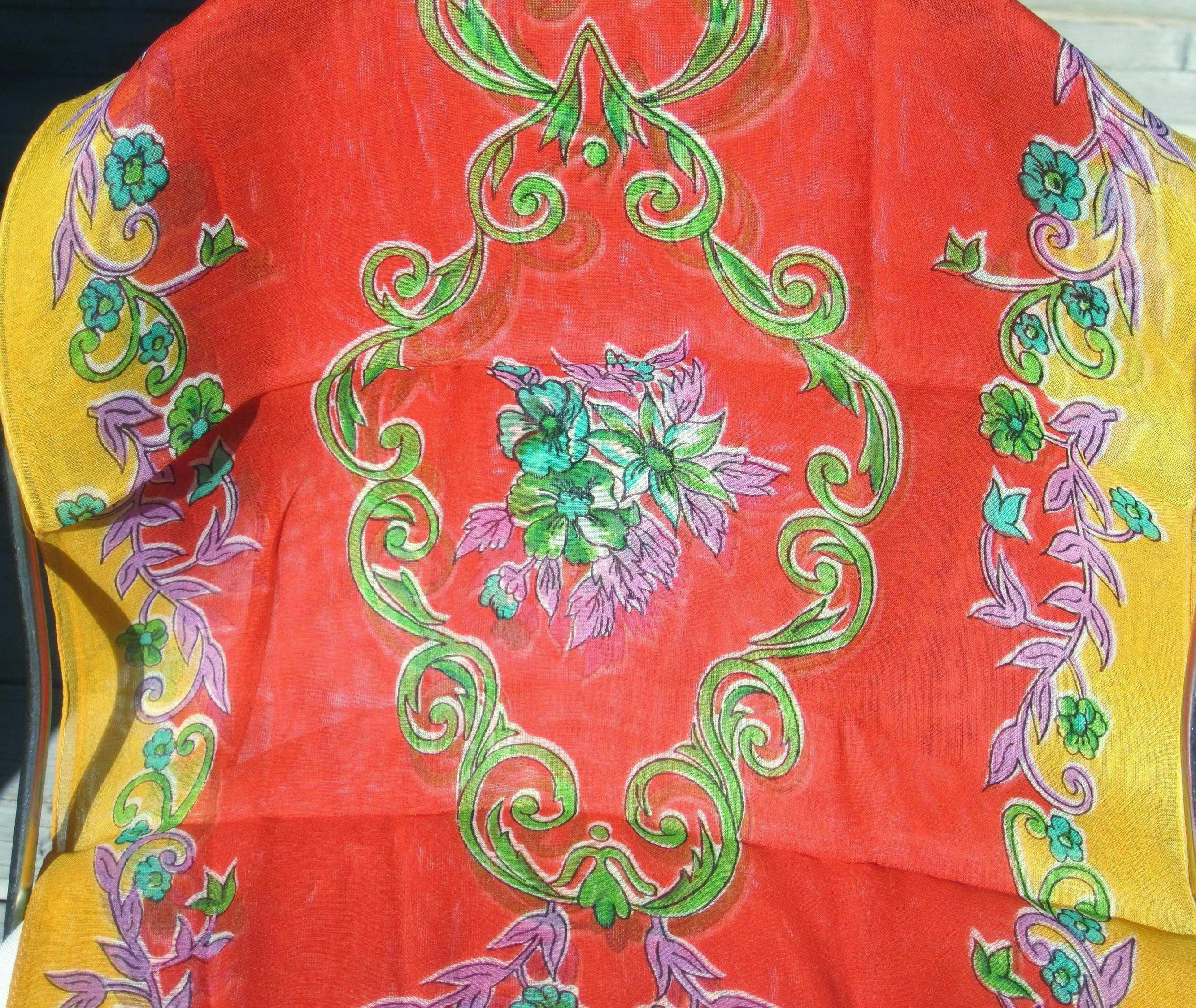 This lovely vibrant stylish 1950s 60s scarf, wrap, shawl features a floral vine design combination with a decorative boarder and soft material throughout!
