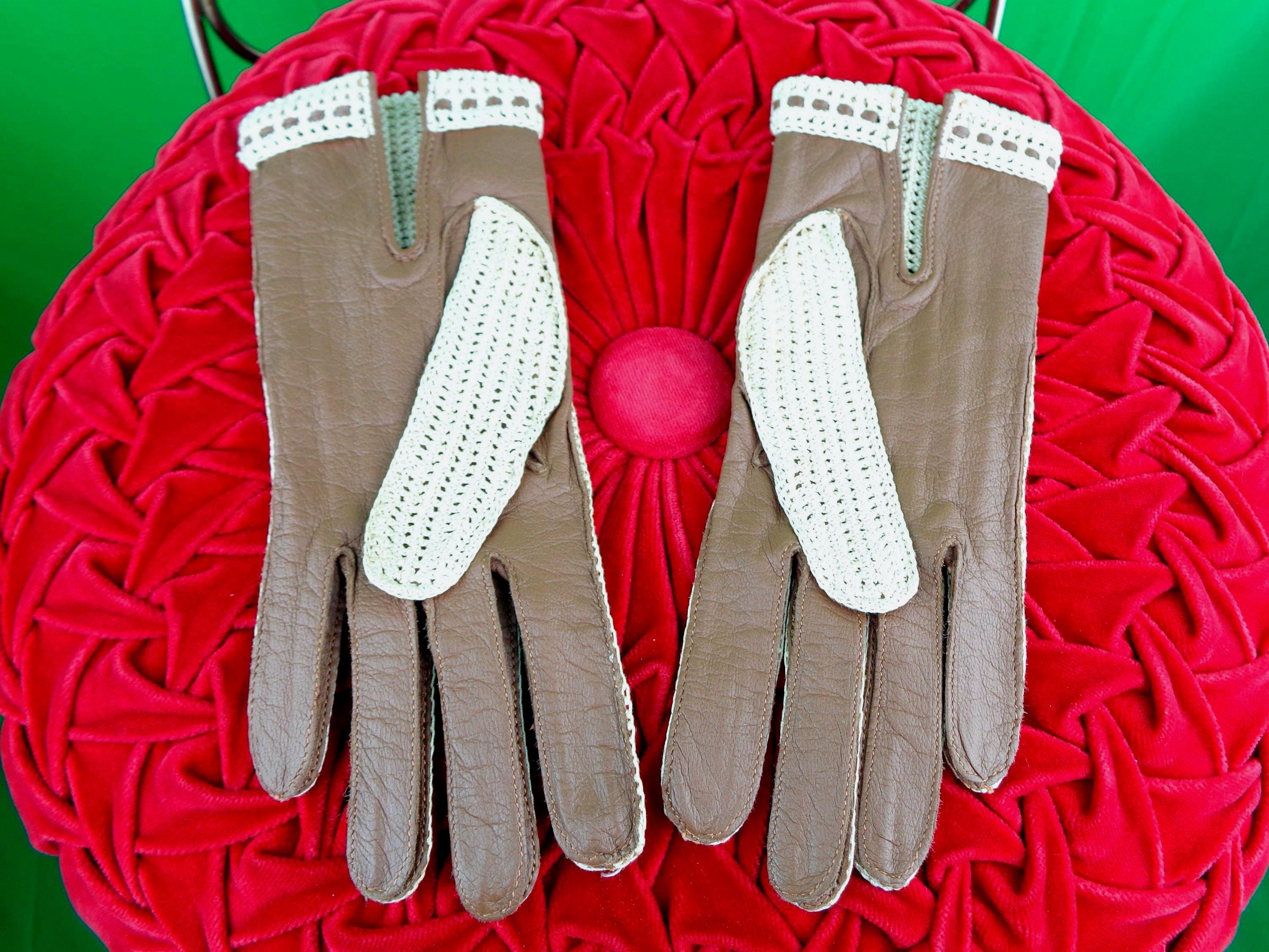 These lovely stylish 1950s 60s gloves features a two tone of leather and knit crochet pattern, design front and sides, with soft fabric, material throughout! Great compliment piece!