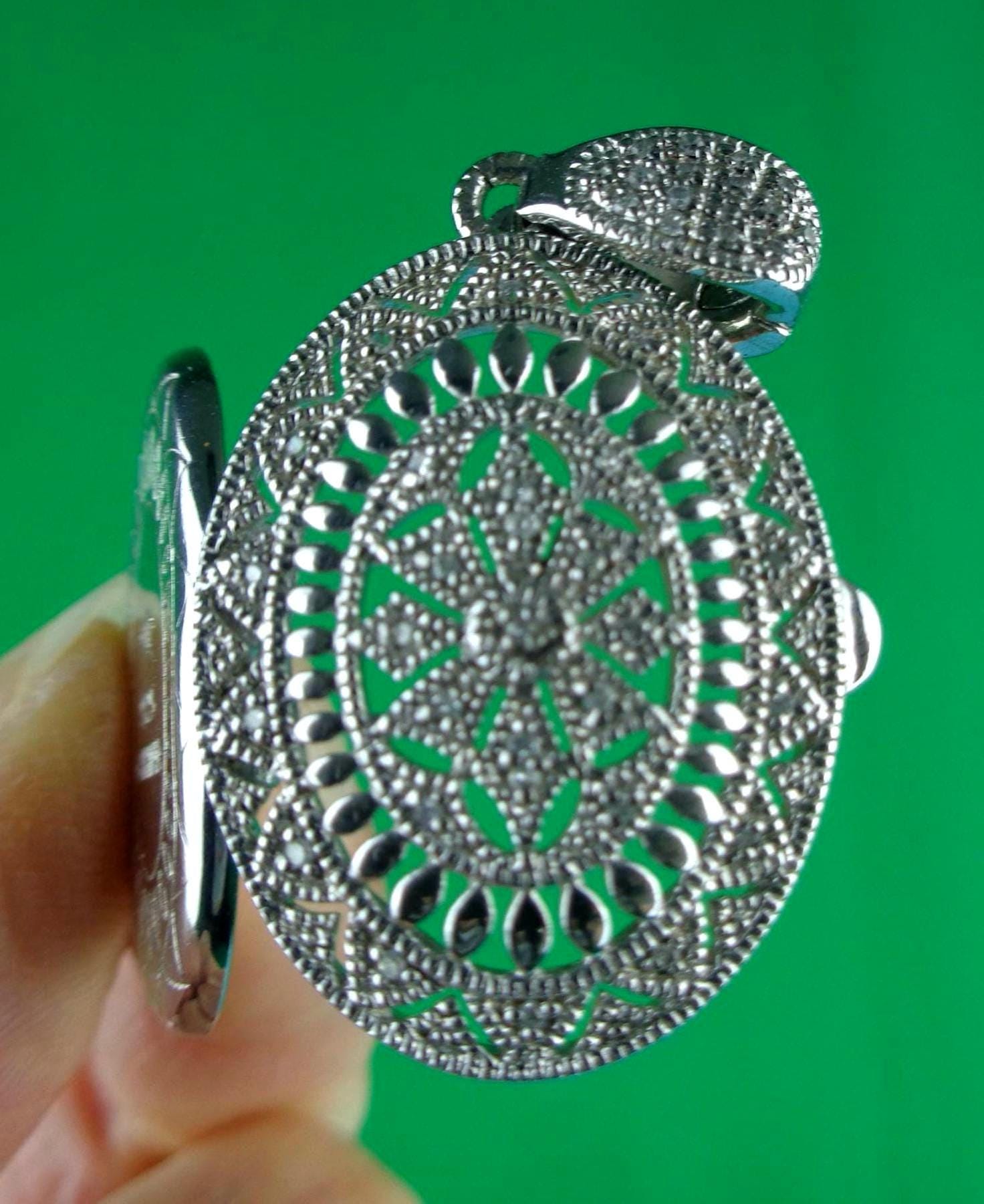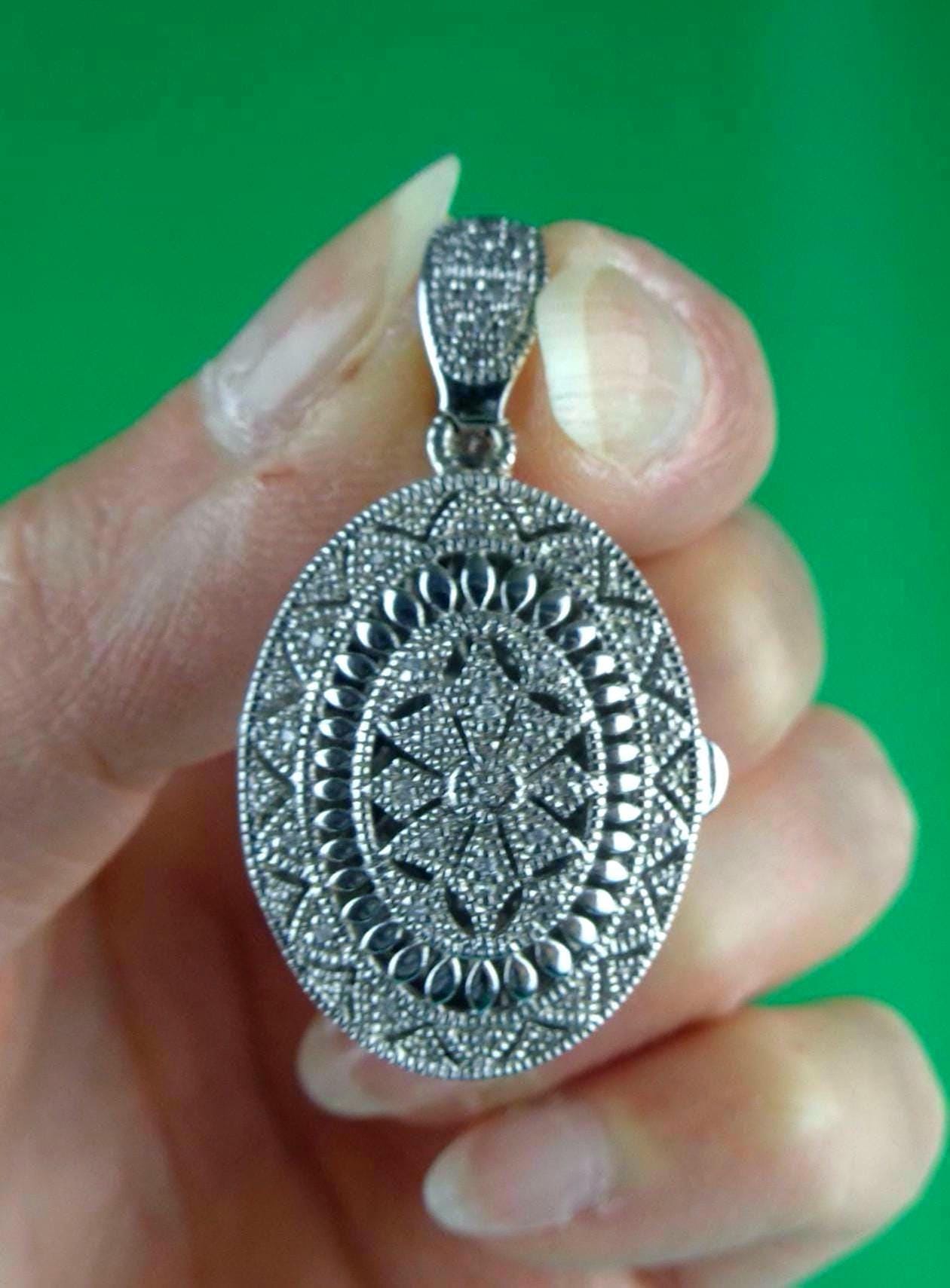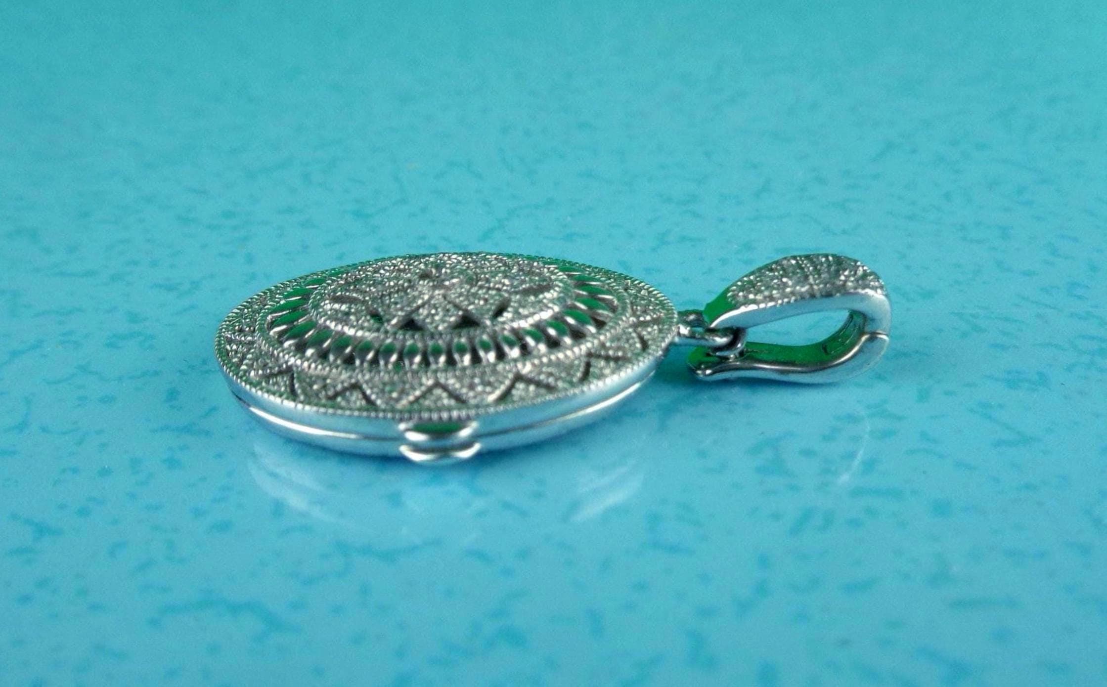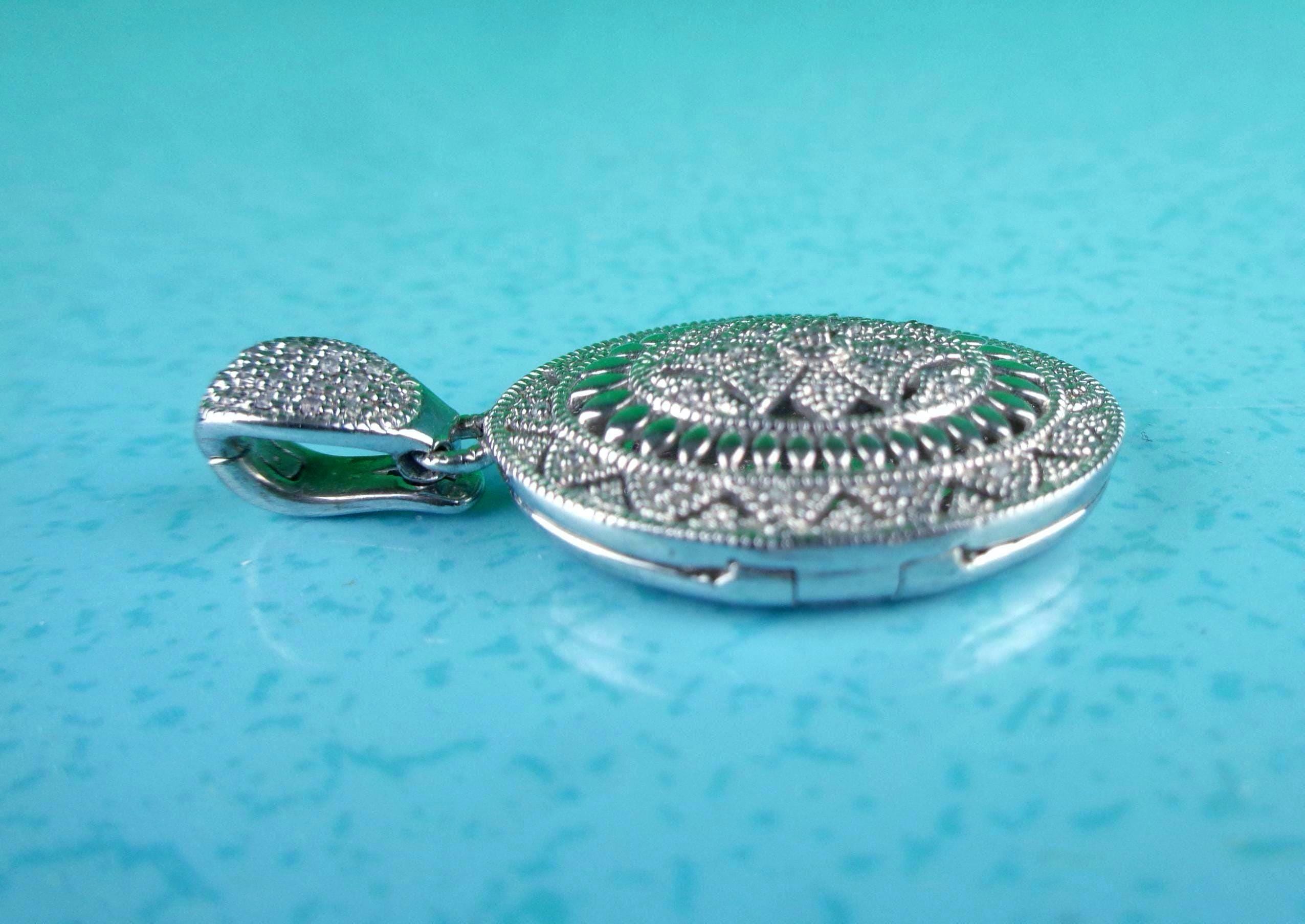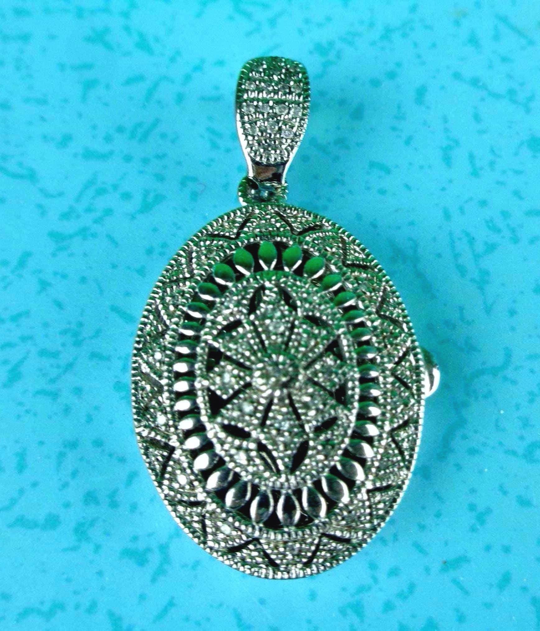 Features a swing clip top too easily inserts your necklace, a side snap closure, with a decorative design, pattern throughout! Great compliment piece!